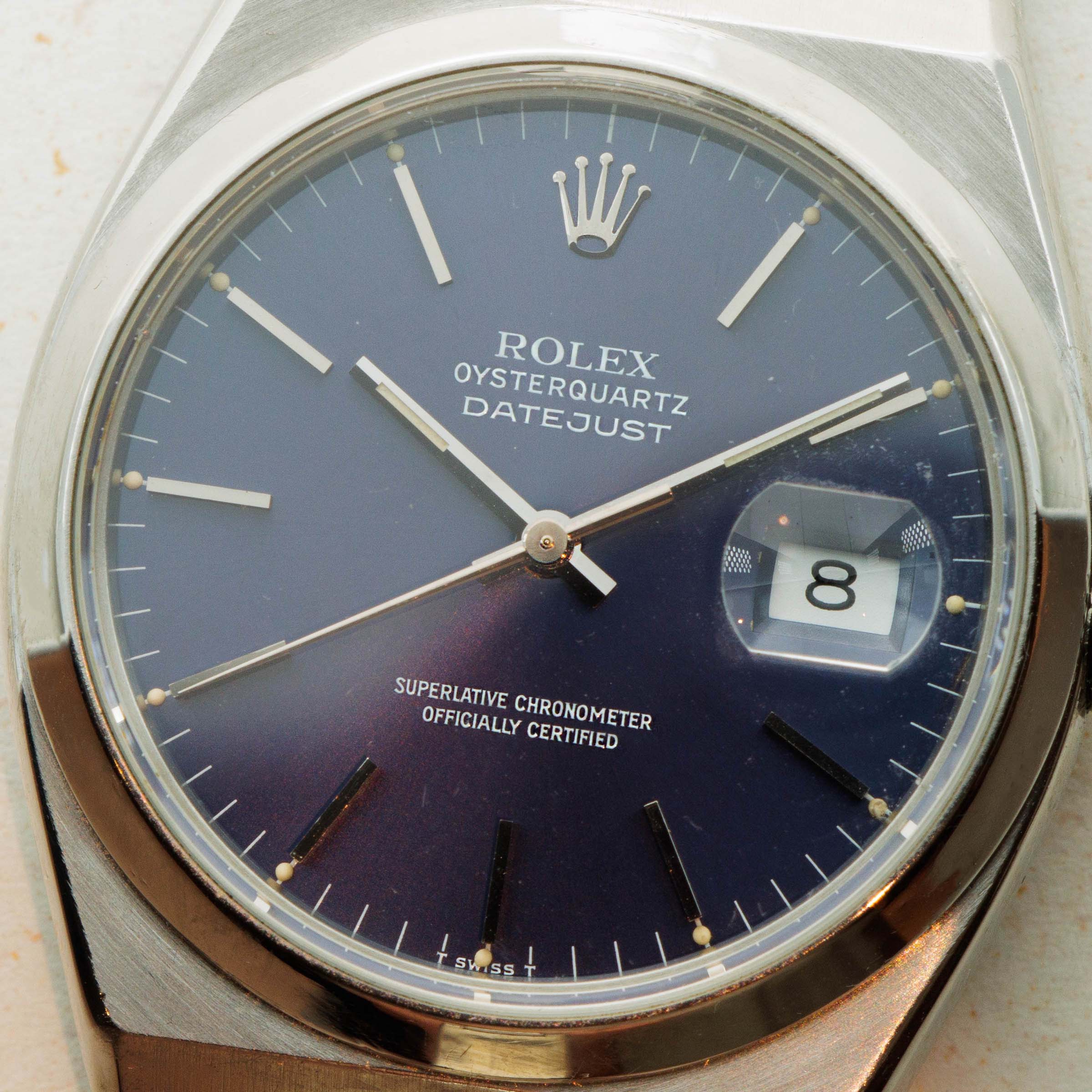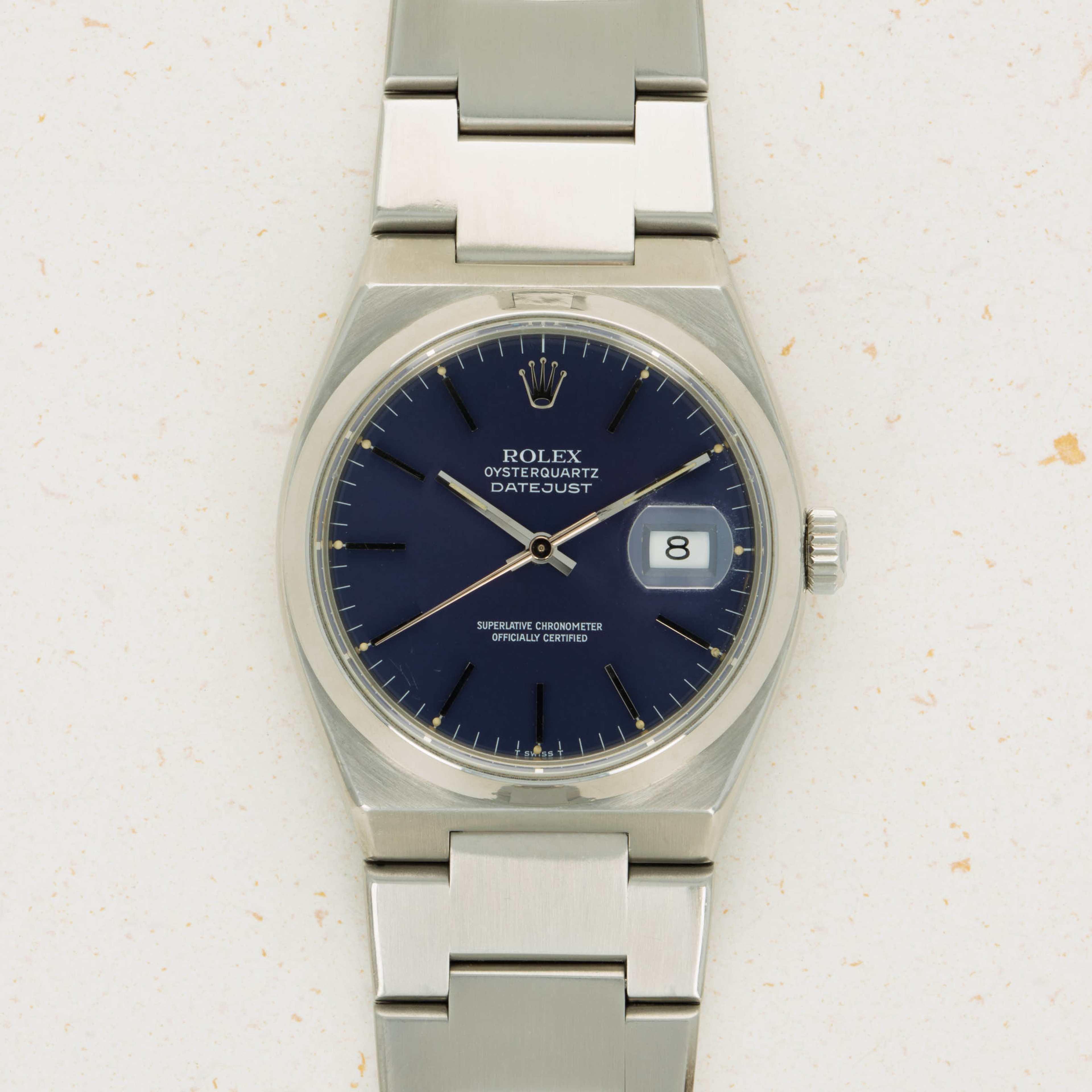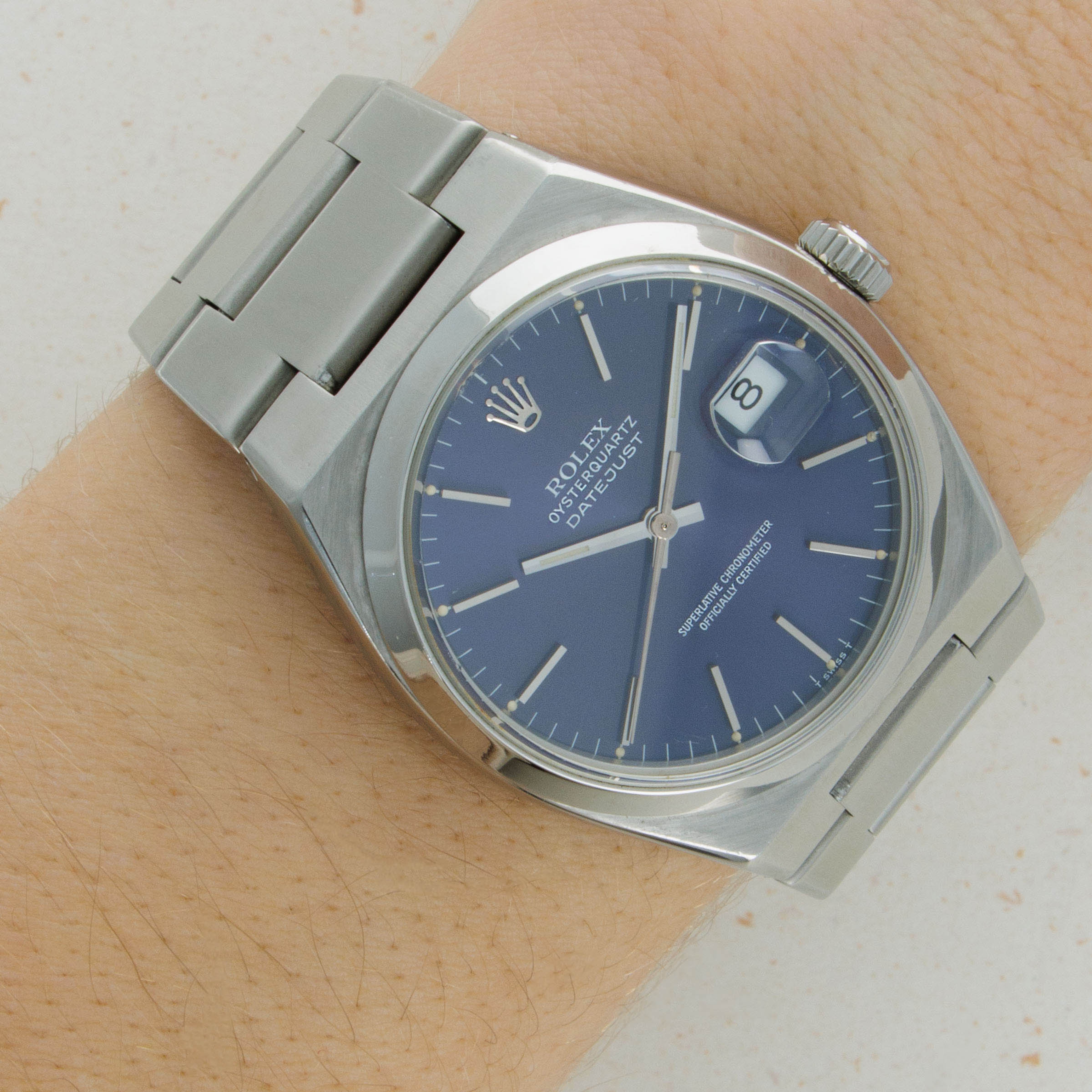 With its rich blue dial giving away none of the ref. 17000's quartz-powered secrets, it is only those in the know that can recognize this as being a very rare quartz-powered Rolex.