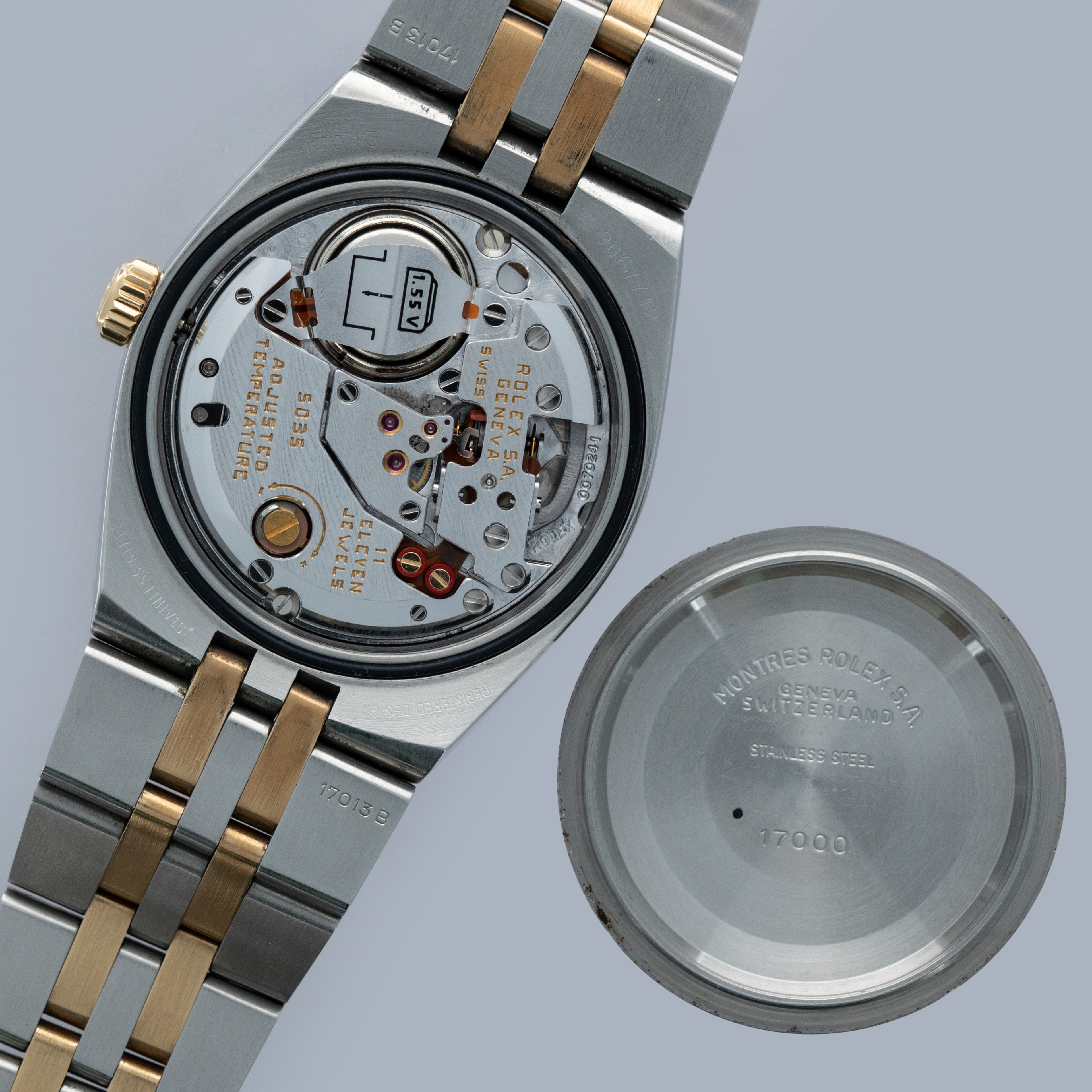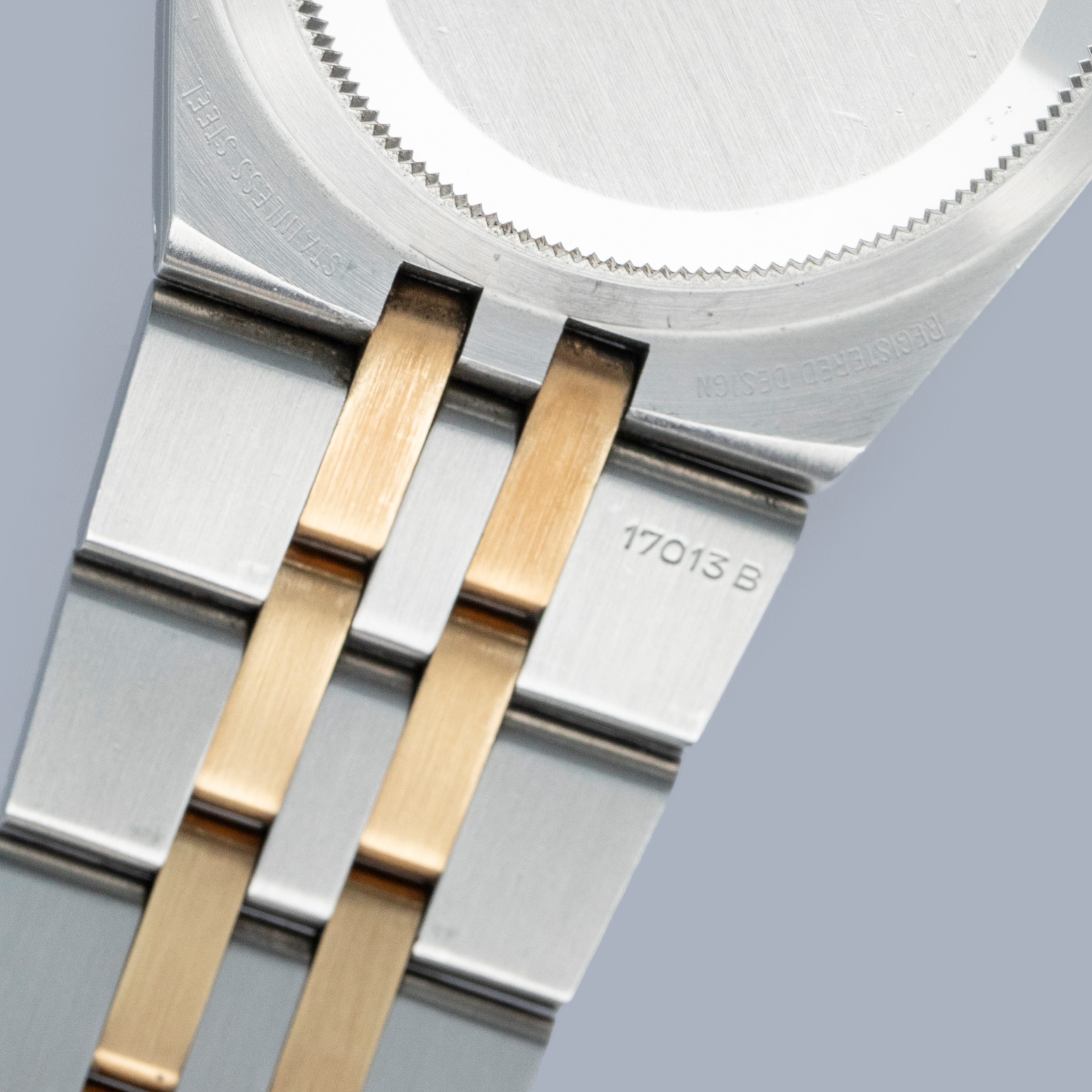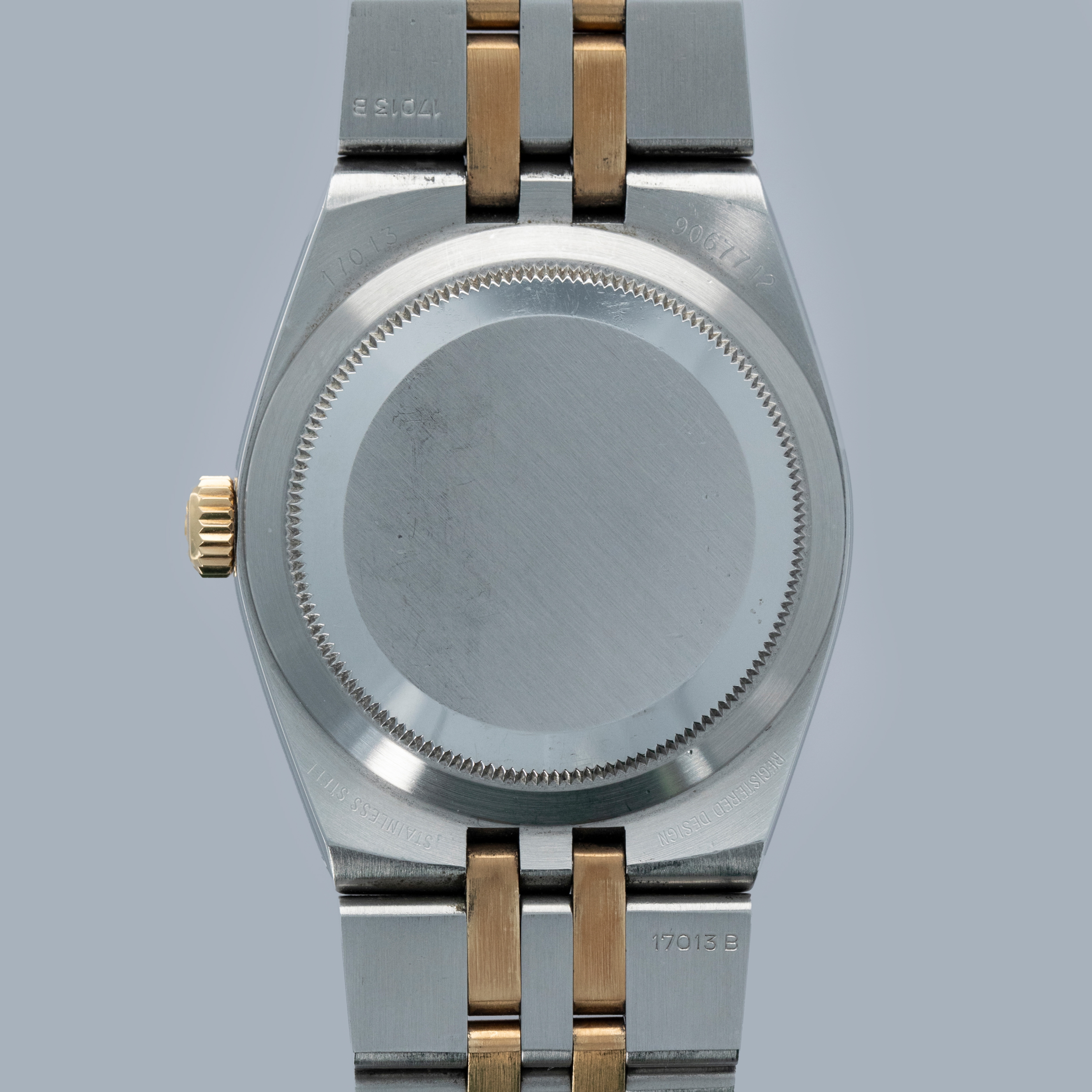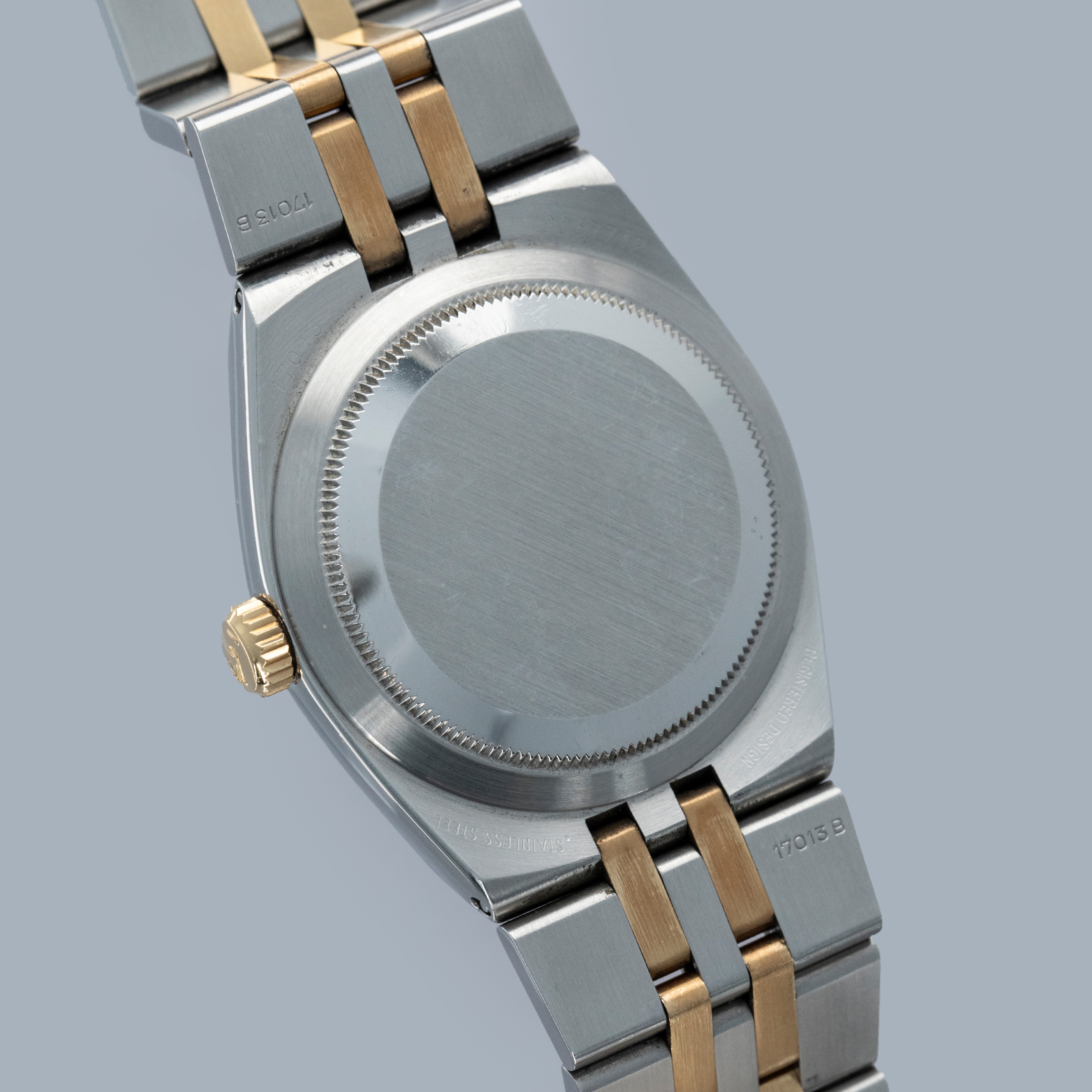 Bearing a construction style that is quite uncommon for Rolex, the ref. 17013 features a two-tone integrated bracelet and tonneau-shaped case that wears larger than its 36mm measurements suggest.