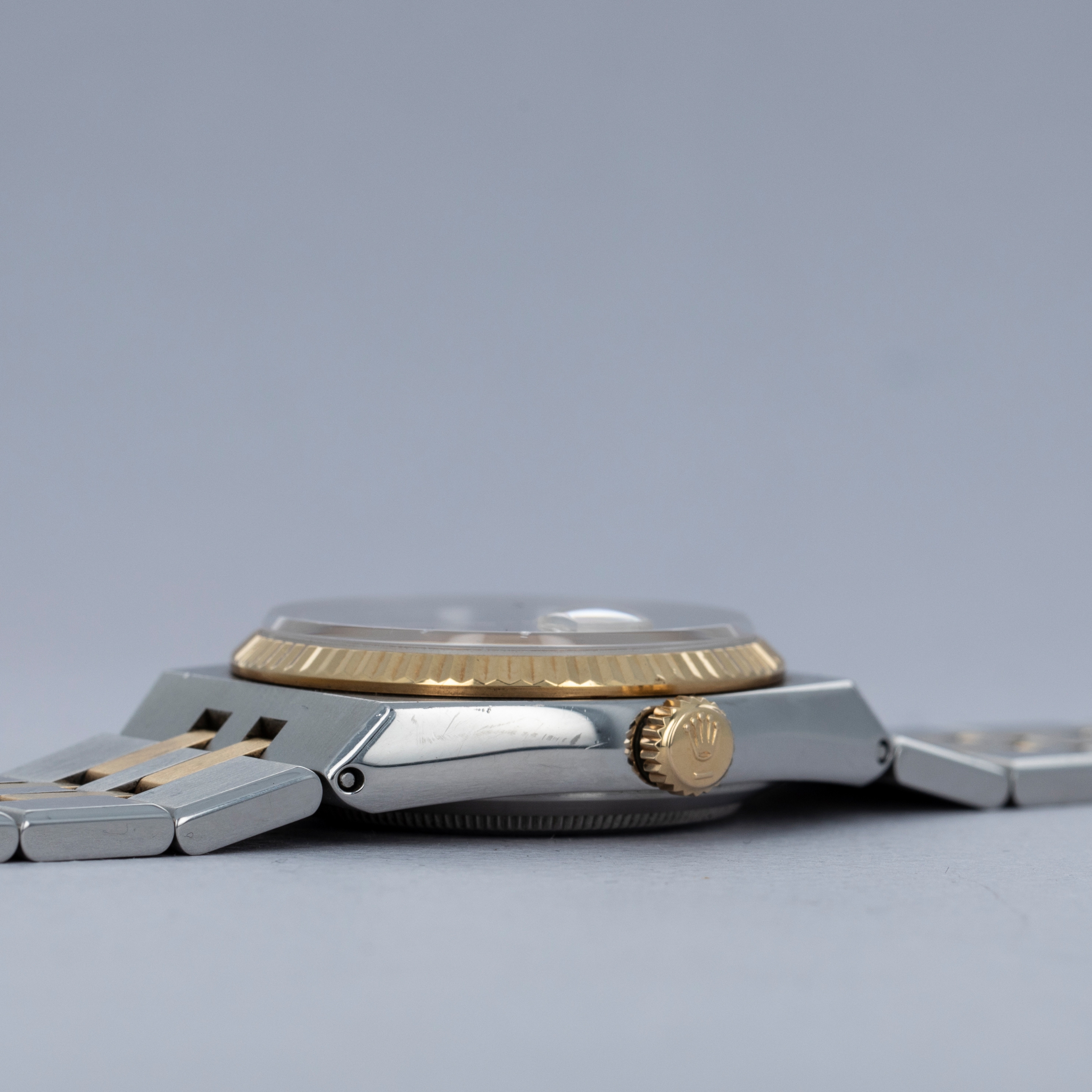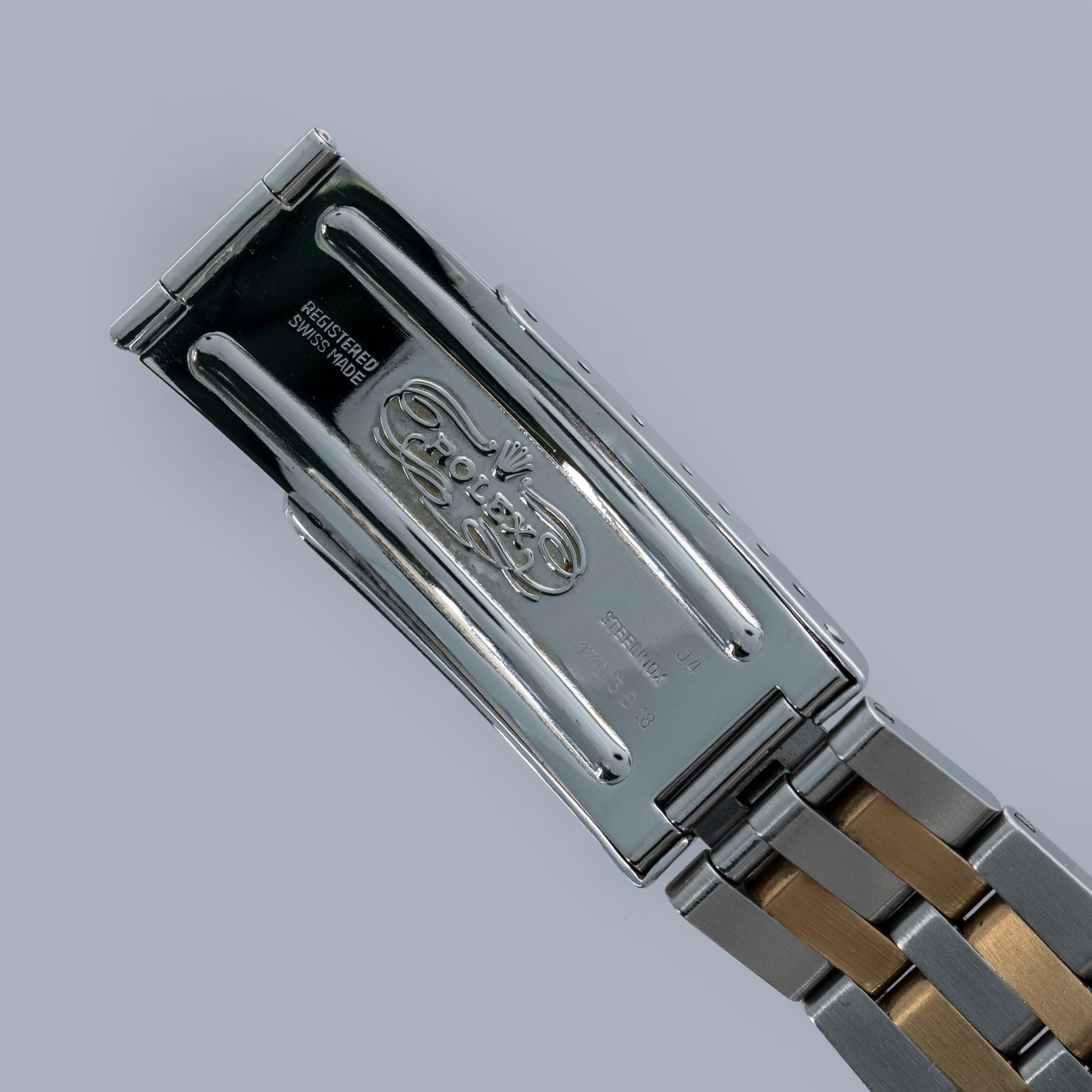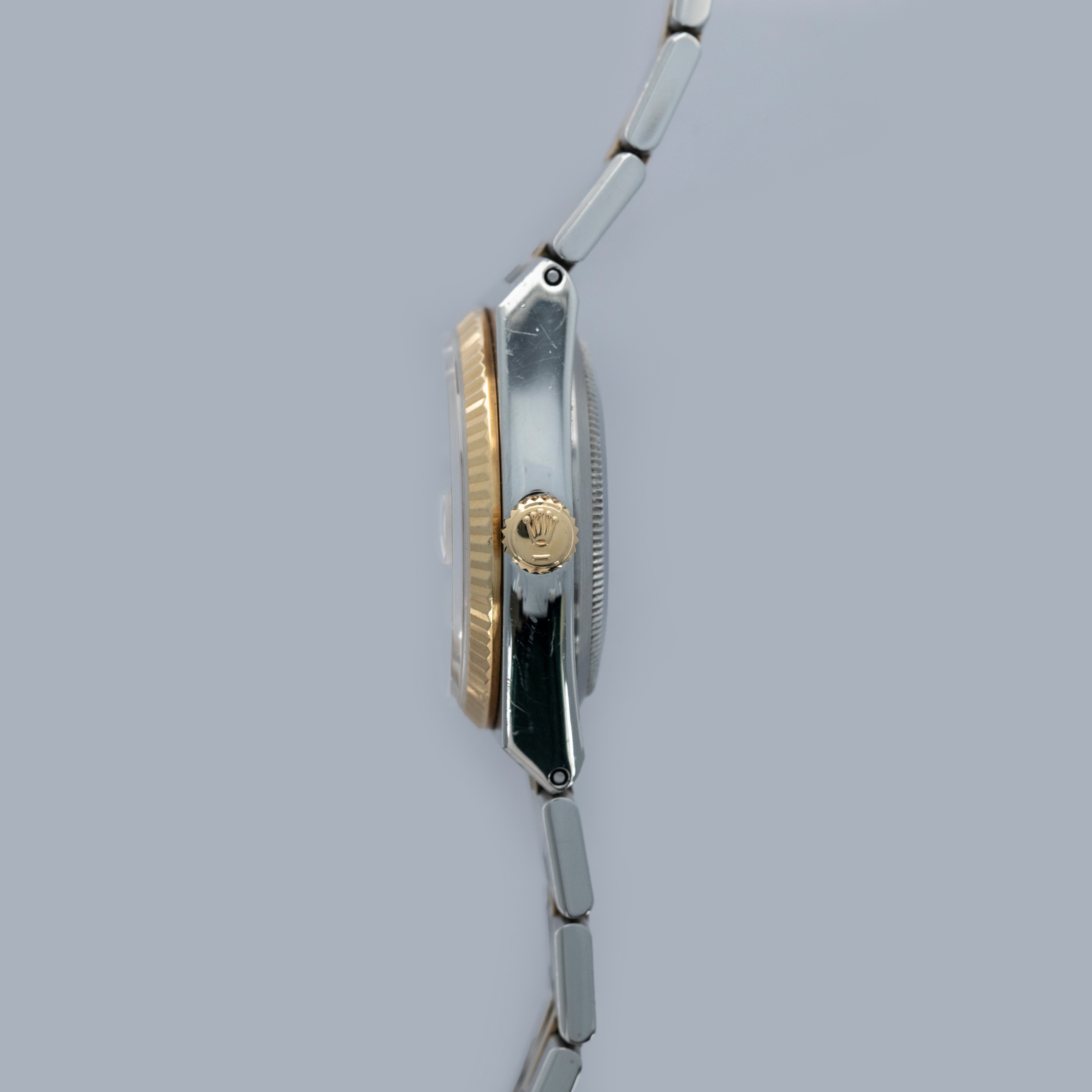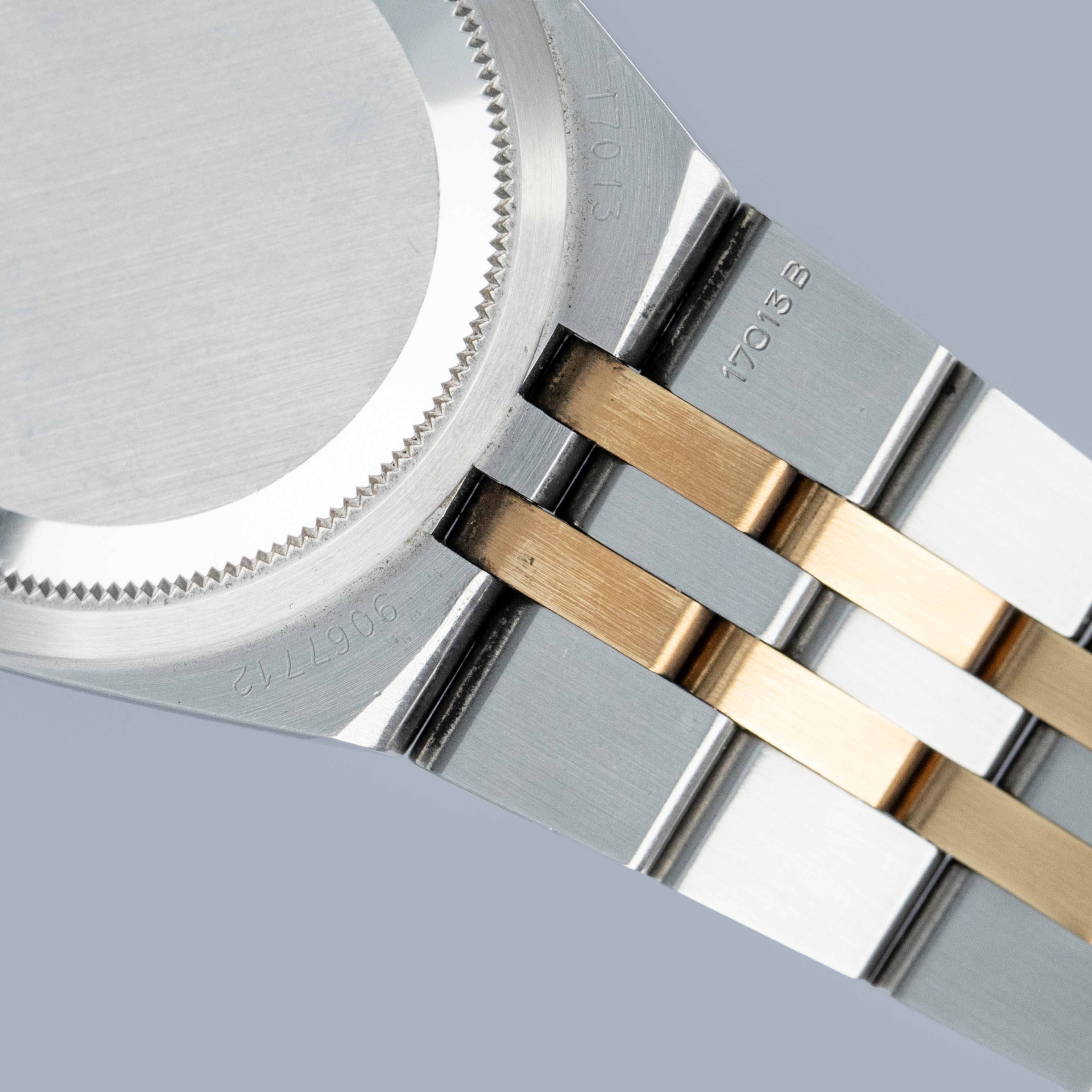 Bearing a construction style that is quite uncommon for Rolex, the ref. 17013 features a two-tone integrated bracelet and tonneau-shaped case that wears larger than its 36mm measurements suggest.