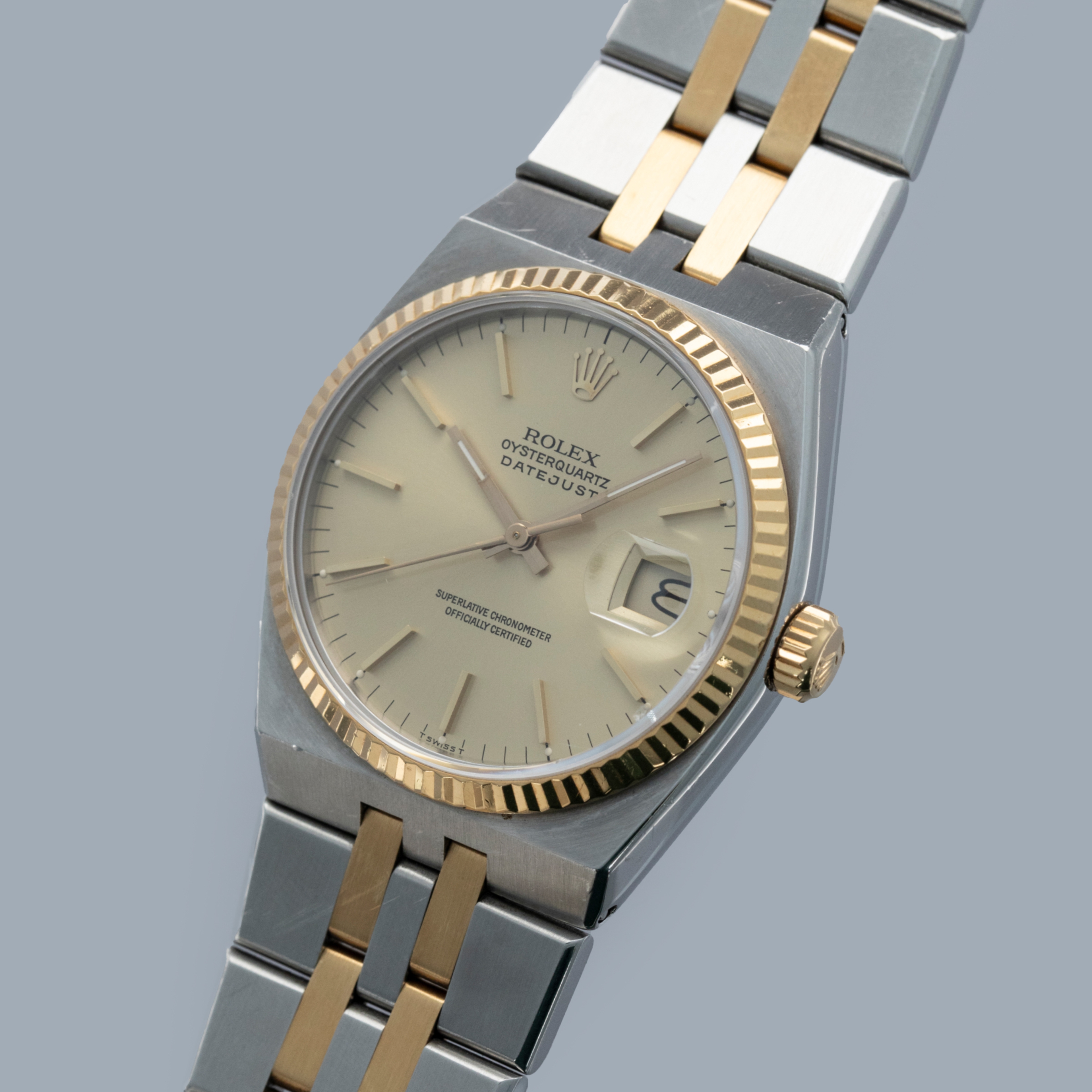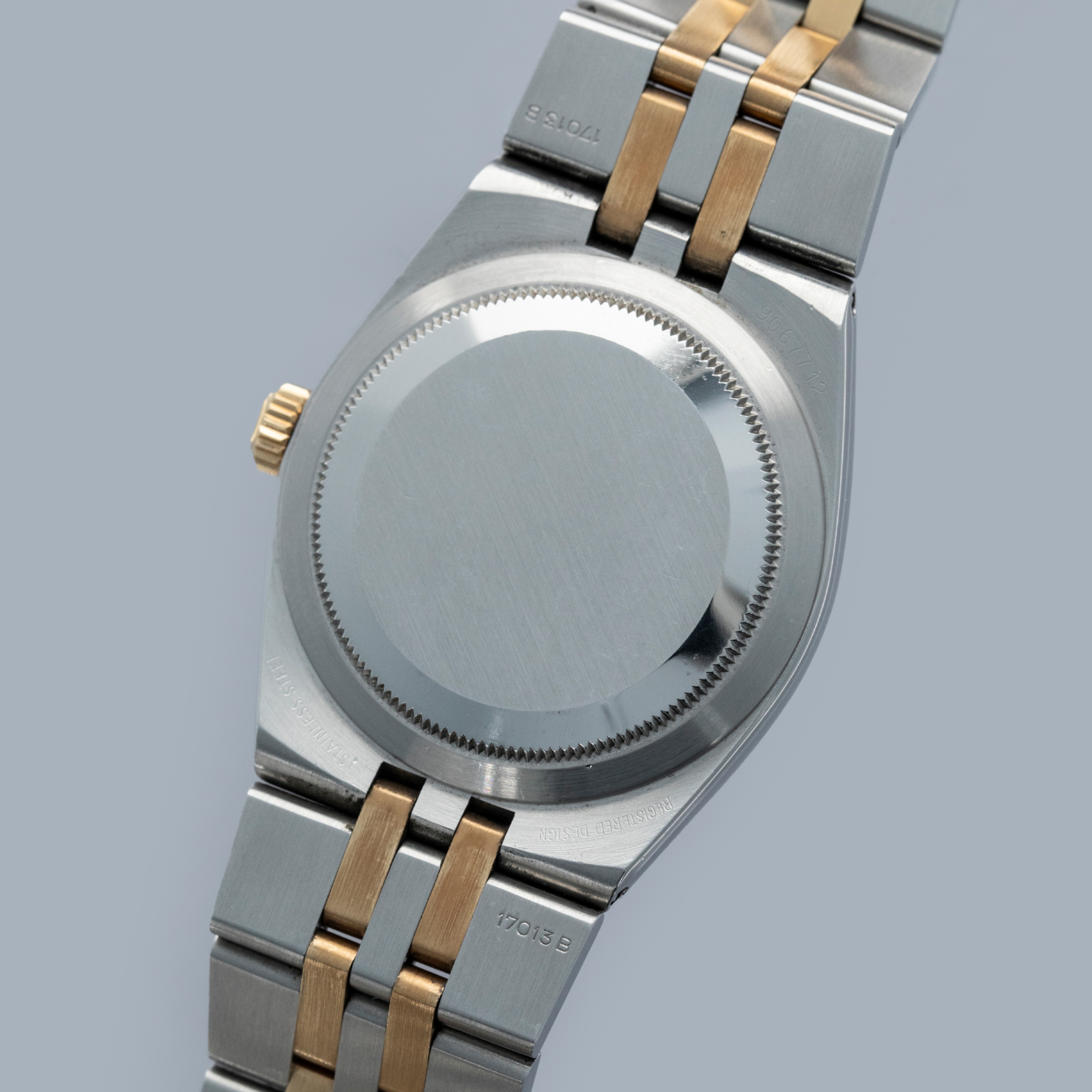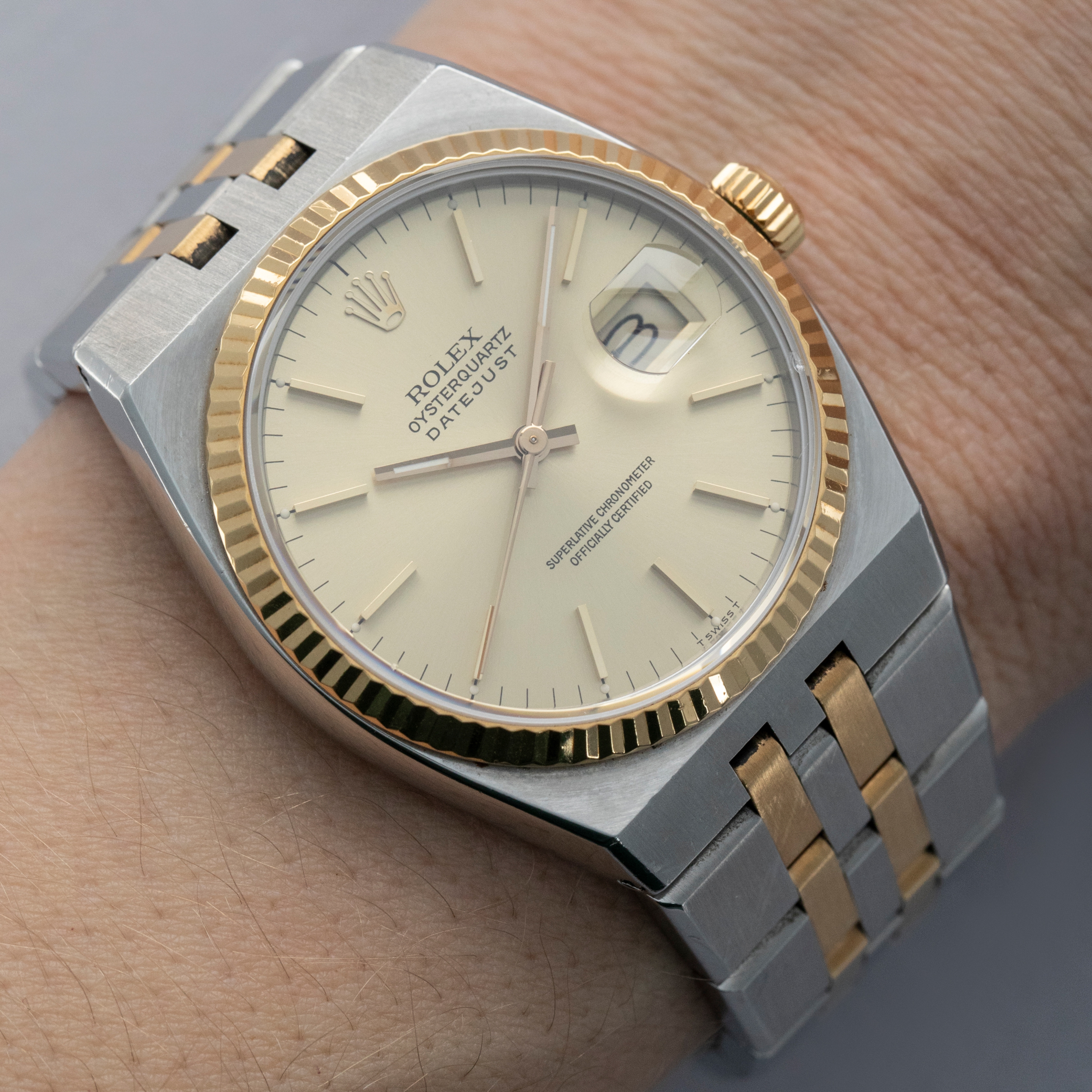 During the onslaught of the Japanese-led Quartz Crisis of the 70s and 80’s, Swiss watchmakers for forced to adapt to remain competitive in the market, or let themselves be swallowed up by their competition. As a way to deal with the Quartz Crisis, Rolex decided to release their own quartz timepiece in 1977, the Oysterquartz. In 1970, Rolex had released the precursor to the Oysterquartz, the Quartz Date 5100, powered by the Beta 21 movement, the result of a large-scale Swiss collaboration. While the Oysterquartz was loosely based on the ref. 5100, the Oysterquartz’ movement was in a league of its own. With 11 jewels, the latest CMOS circuitry, a 32000-hertz oscillator, and analog thermocompensation to regulate the quartz crystal, the Oysterquartz’s movement was held to just as high a standard as Rolex’s more typical mechanical movements. Besides its unusual movement, the Oysterquartz also features a unique construction in terms of its case shape and bracelet design, with an integrated bracelet attaching to a tonneau-shaped case. Offered as an Oysterquartz version of the Datejust, the ref. 17013 that we have here features a two-tone five-link Jubilee-style bracelet and a fluted 18kt yellow gold bezel alongside its golden dial with applied yellow gold indices and matching hands. With Rolex’s signature cyclops lens over its 3 o’clock date window and its unique design, the ref. 17013 is a rich piece of Rolex’s history that has finally garnered the plaudits from collectors that it deserves.
