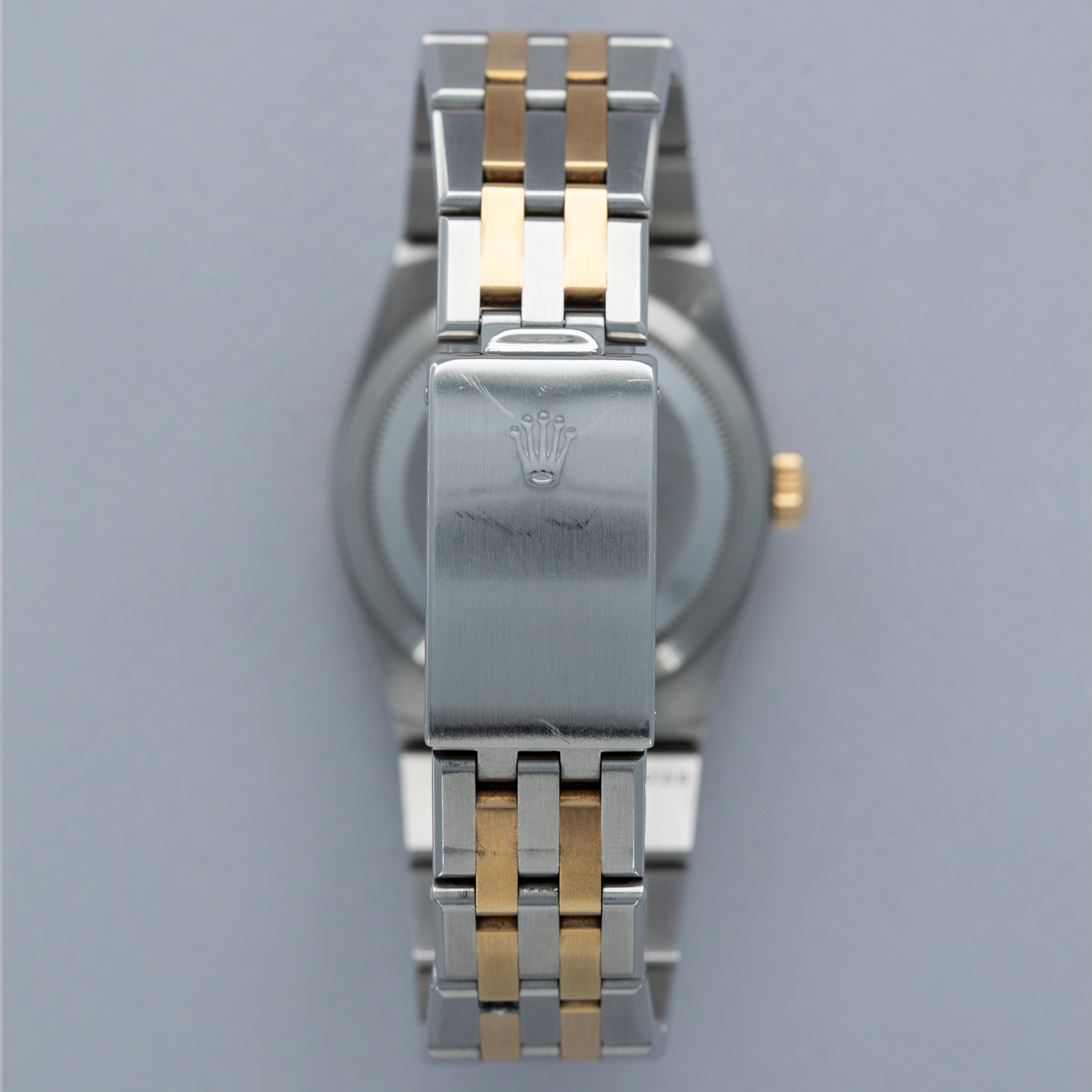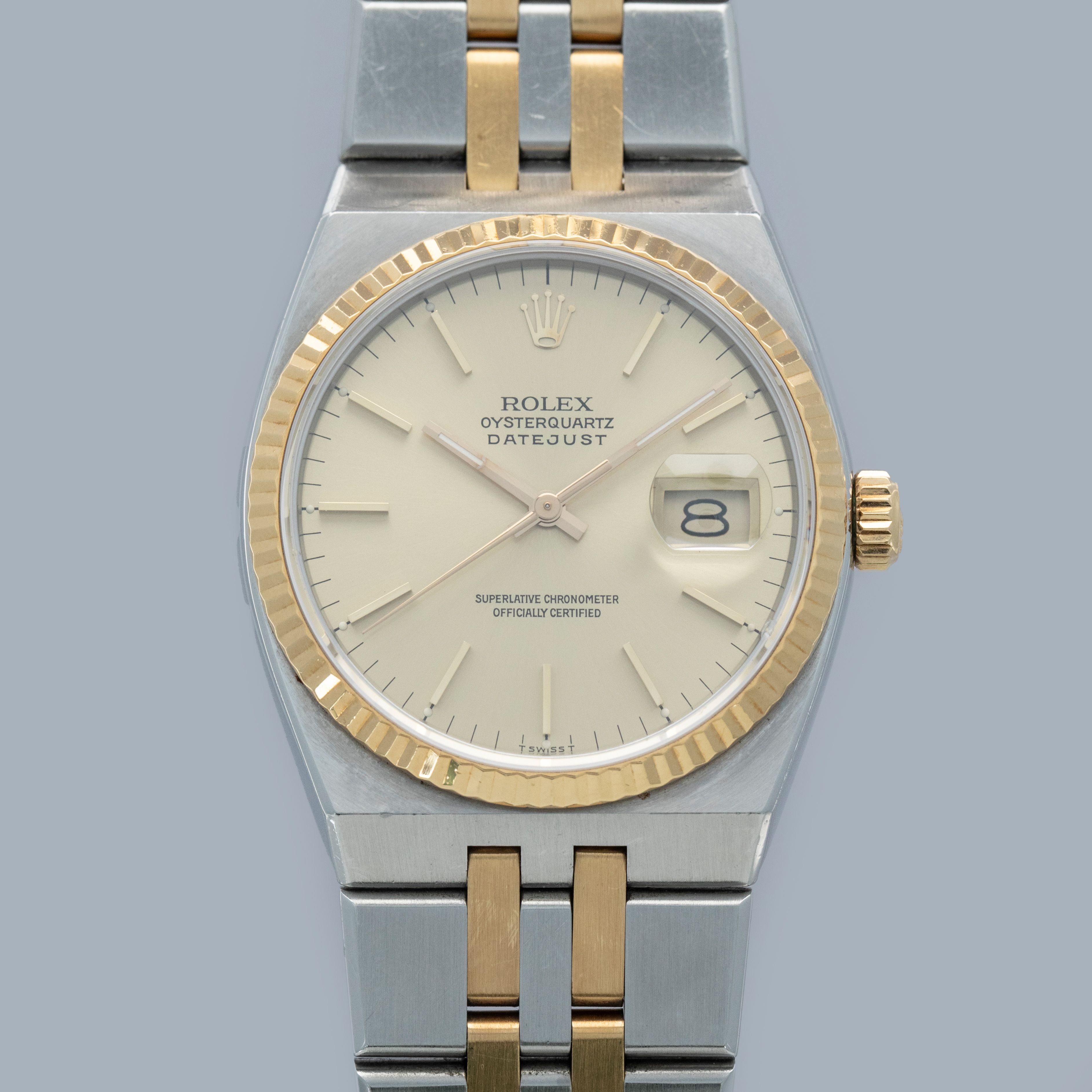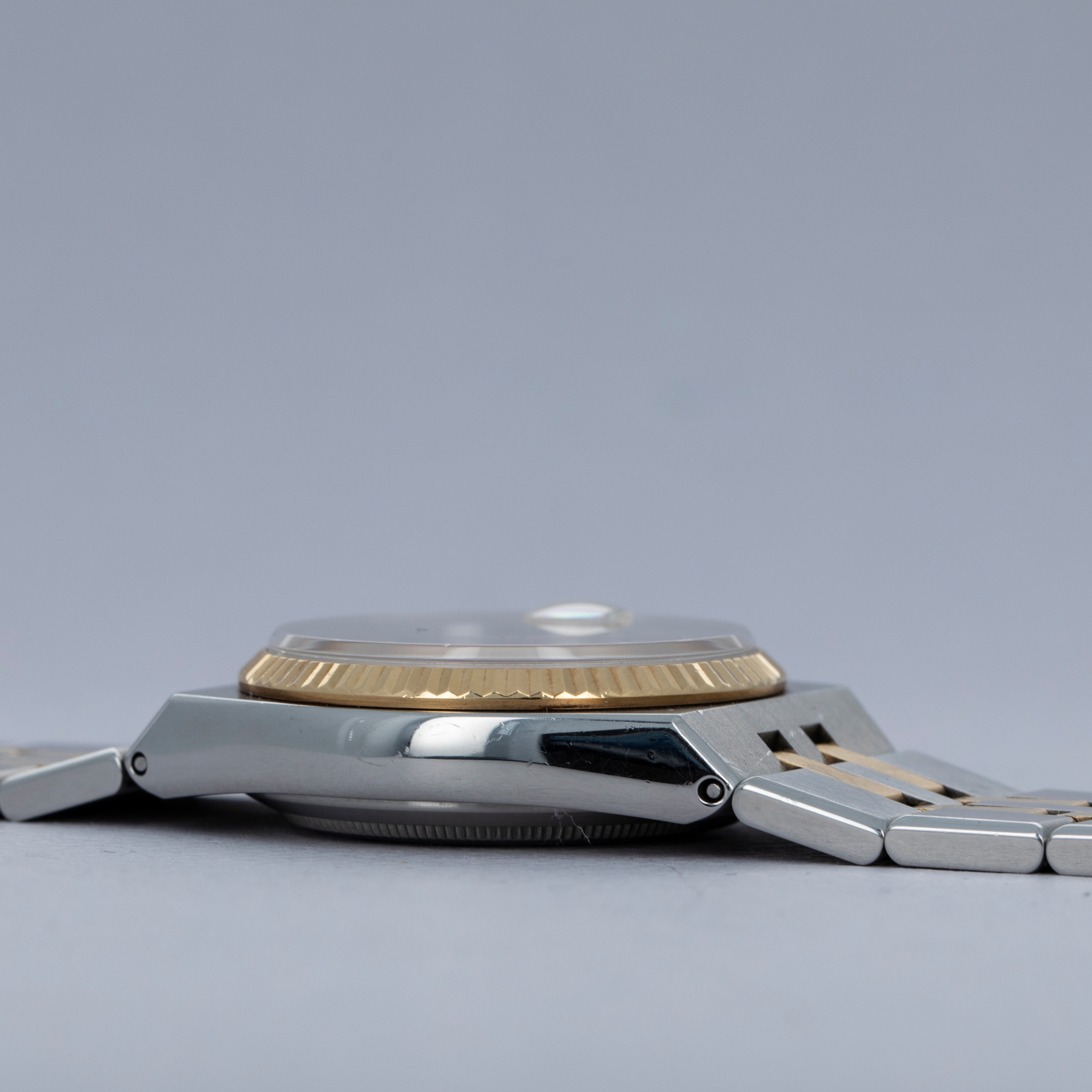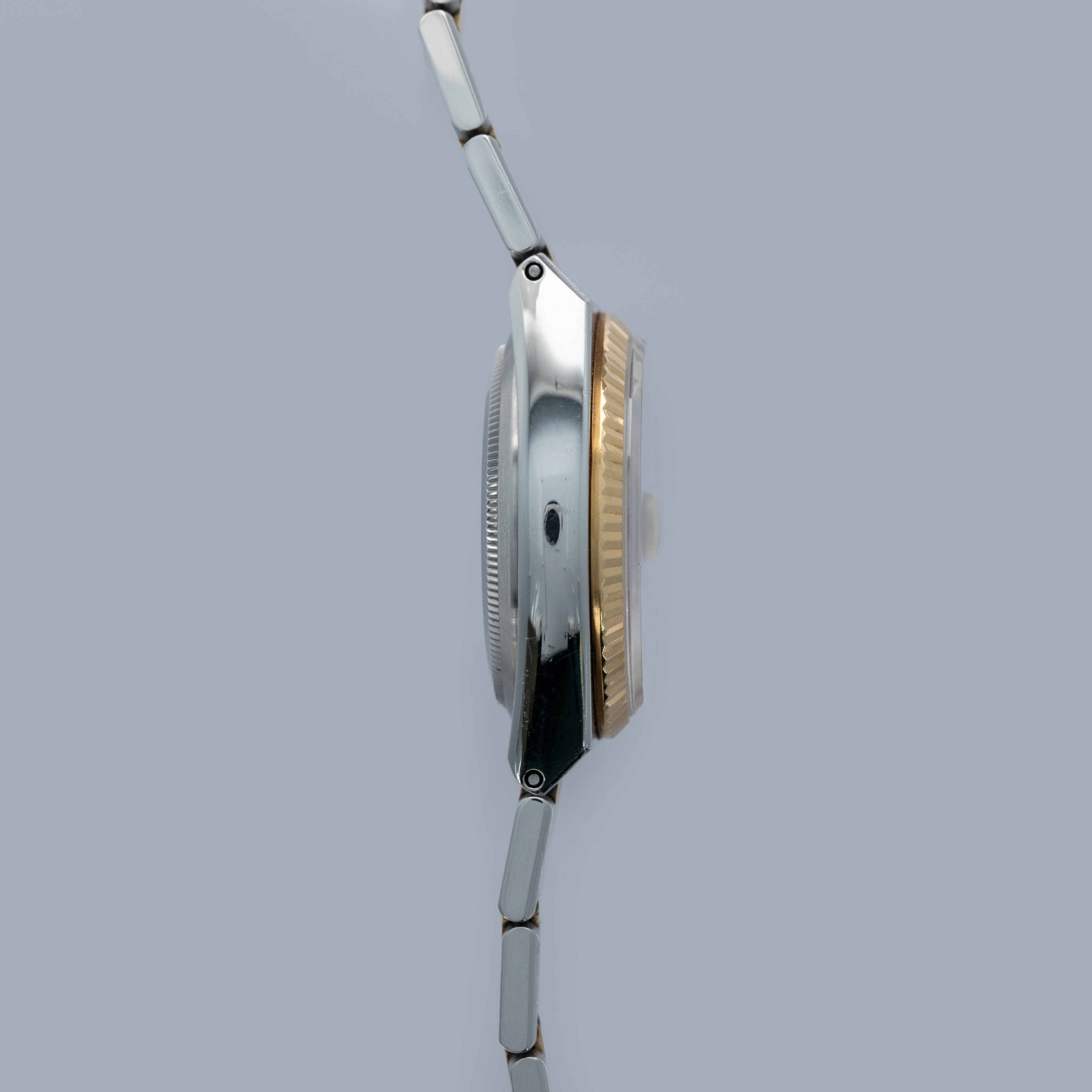 During the onslaught of the Japanese-led Quartz Crisis of the 70s and 80’s, Swiss watchmakers for forced to adapt to remain competitive in the market, or let themselves be swallowed up by their competition. As a way to deal with the Quartz Crisis, Rolex decided to release their own quartz timepiece in 1977, the Oysterquartz. In 1970, Rolex had released the precursor to the Oysterquartz, the Quartz Date 5100, powered by the Beta 21 movement, the result of a large-scale Swiss collaboration. While the Oysterquartz was loosely based on the ref. 5100, the Oysterquartz’ movement was in a league of its own. With 11 jewels, the latest CMOS circuitry, a 32000-hertz oscillator, and analog thermocompensation to regulate the quartz crystal, the Oysterquartz’s movement was held to just as high a standard as Rolex’s more typical mechanical movements. Besides its unusual movement, the Oysterquartz also features a unique construction in terms of its case shape and bracelet design, with an integrated bracelet attaching to a tonneau-shaped case. Offered as an Oysterquartz version of the Datejust, the ref. 17013 that we have here features a two-tone five-link Jubilee-style bracelet and a fluted 18kt yellow gold bezel alongside its golden dial with applied yellow gold indices and matching hands. With Rolex’s signature cyclops lens over its 3 o’clock date window and its unique design, the ref. 17013 is a rich piece of Rolex’s history that has finally garnered the plaudits from collectors that it deserves.