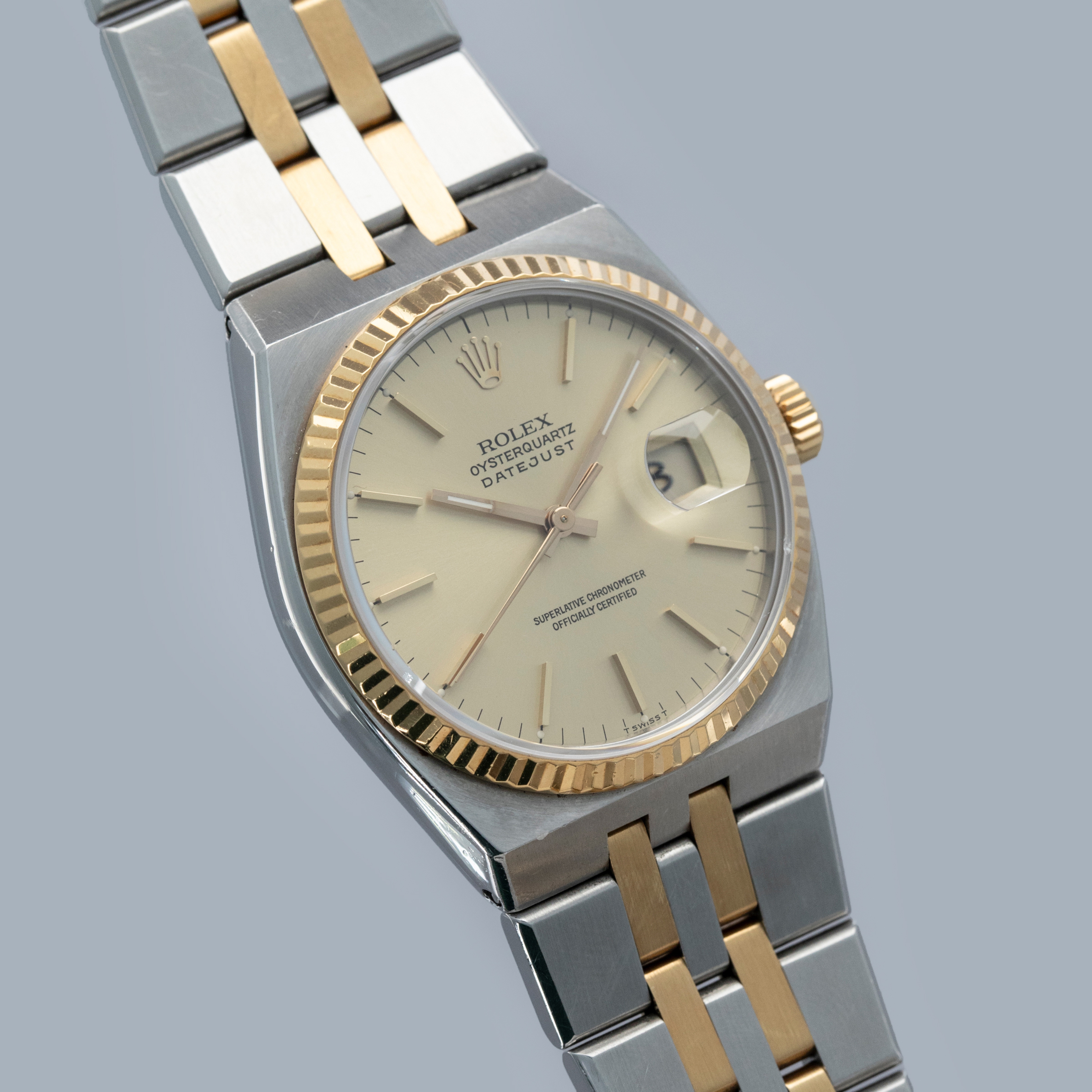Boasting a golden champagne dial with applied golden indices that serve to highlight the two-tone construction that surrounds it, this Oysterquartz' dial is wonderfully luxurious and refined.
