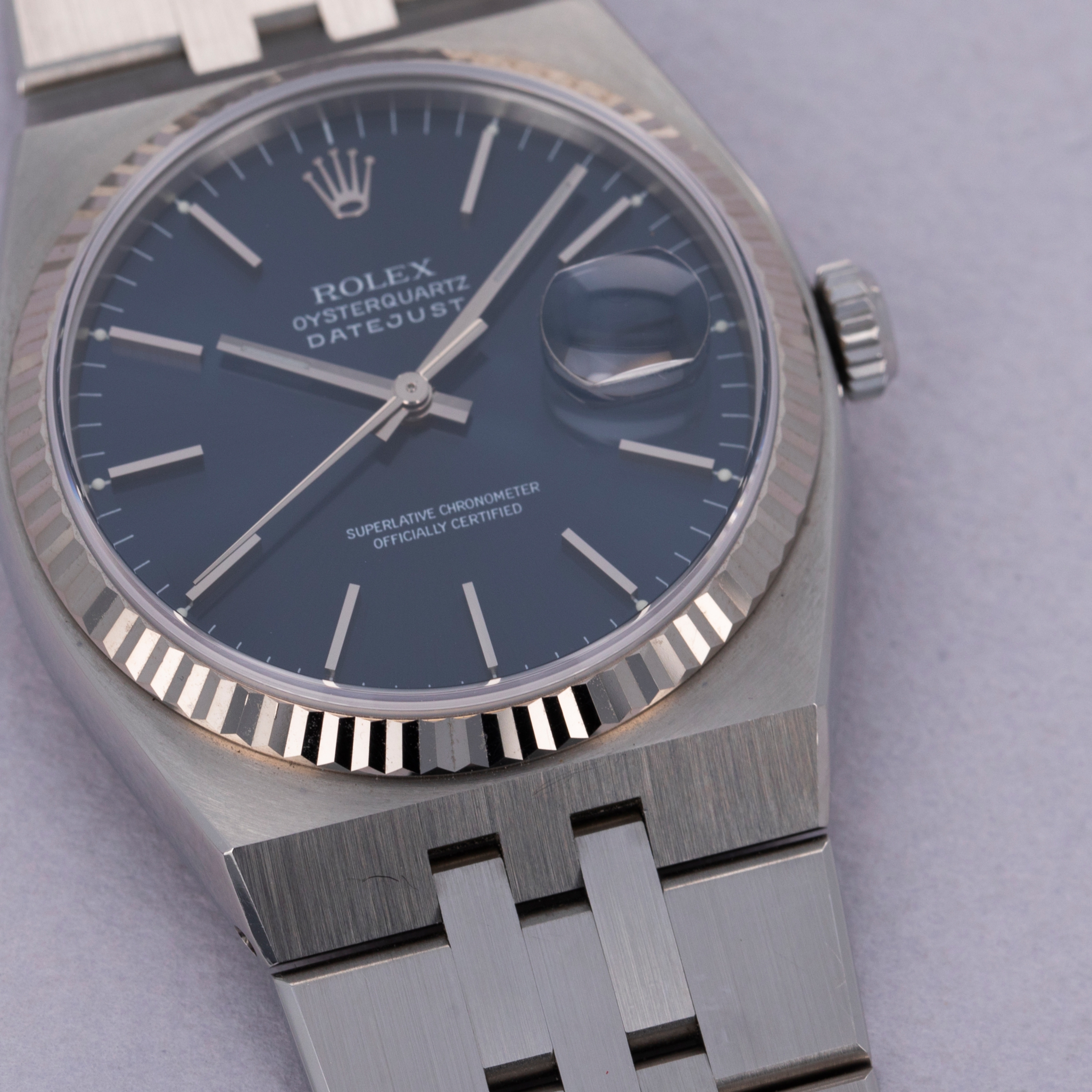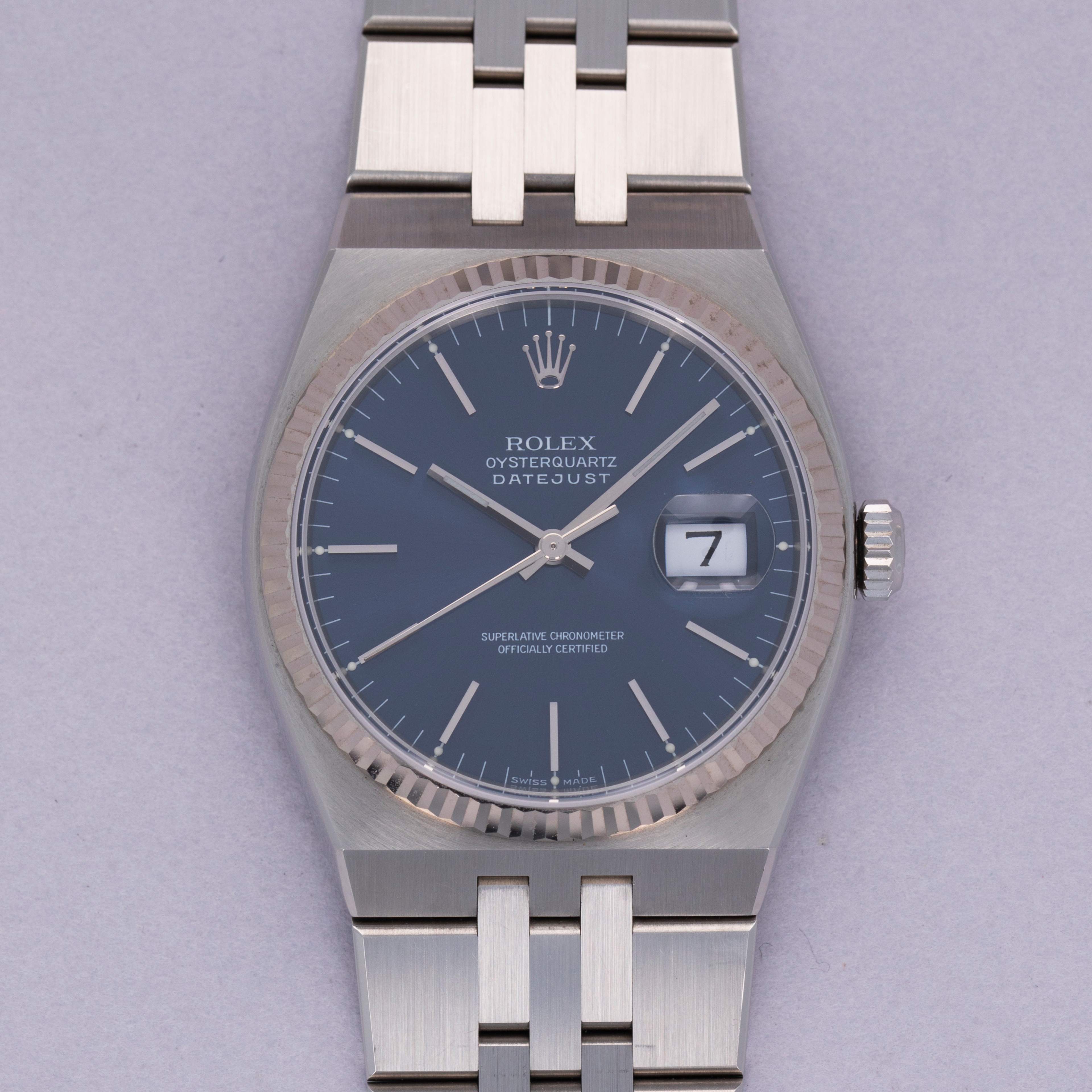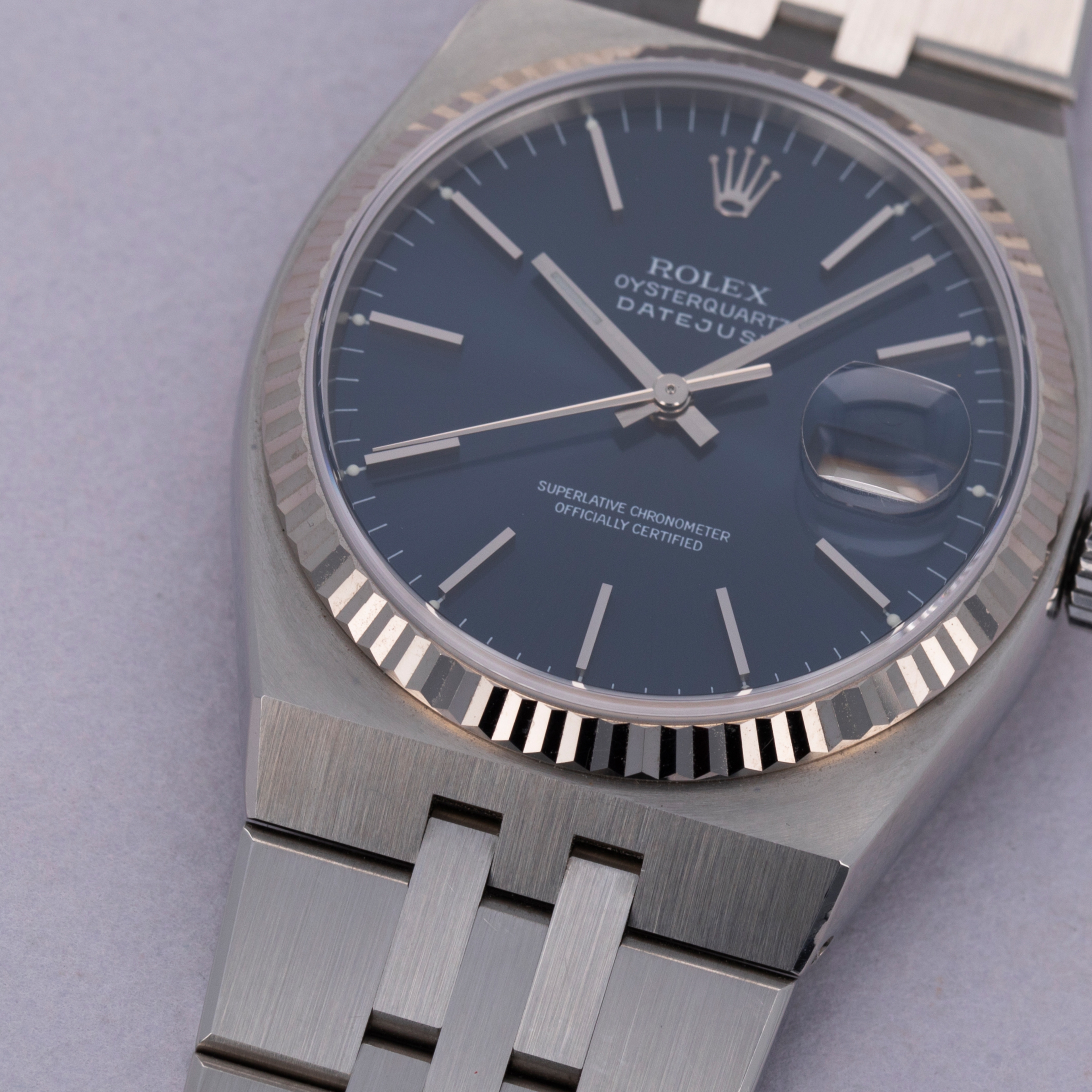 Featuring a blue dial that adds a subtle pop of color to the ref. 17104's 18kt white gold fluted bezel and stainless steel construction, this Oysterquartz is a wonderful balance of style, substance, and sophistication.