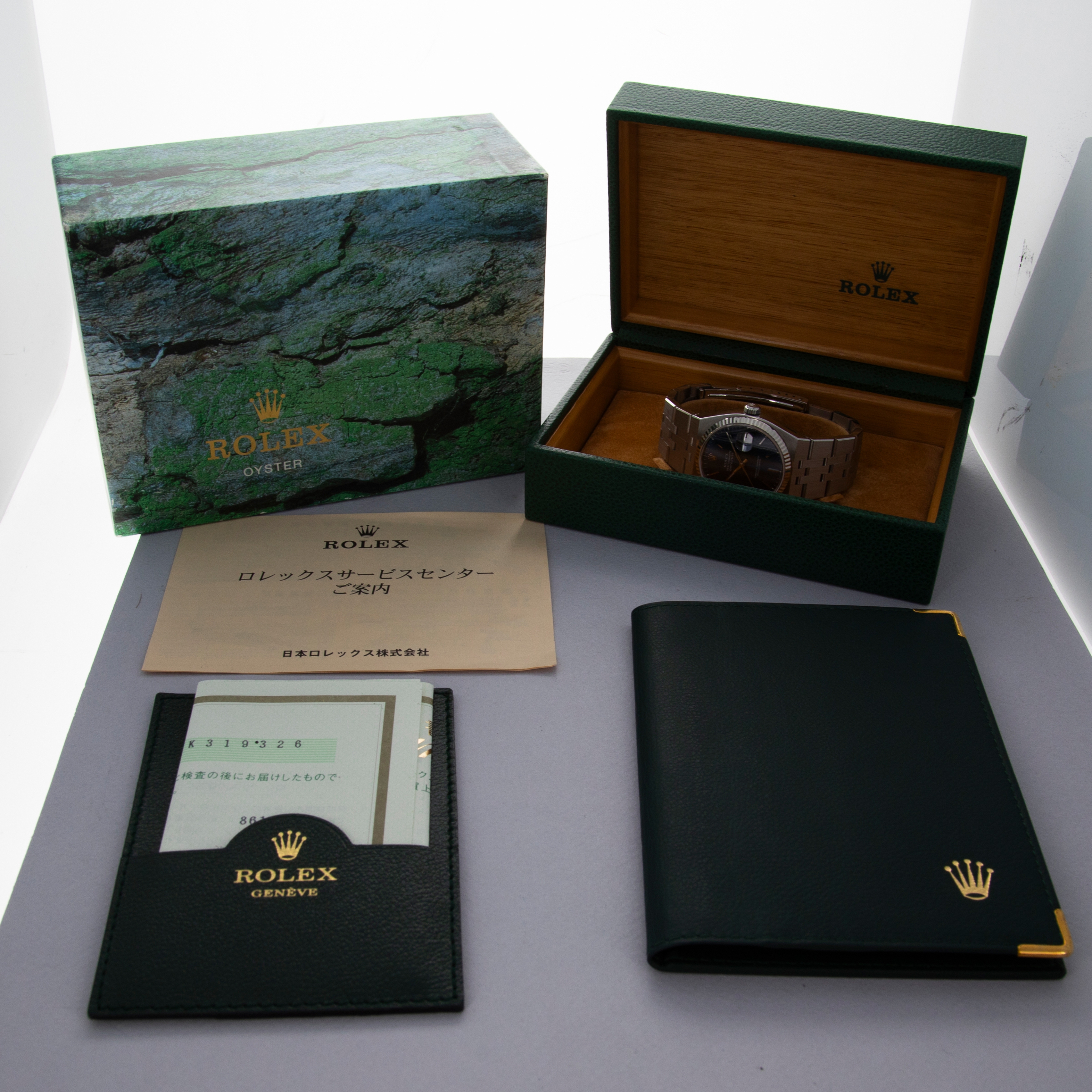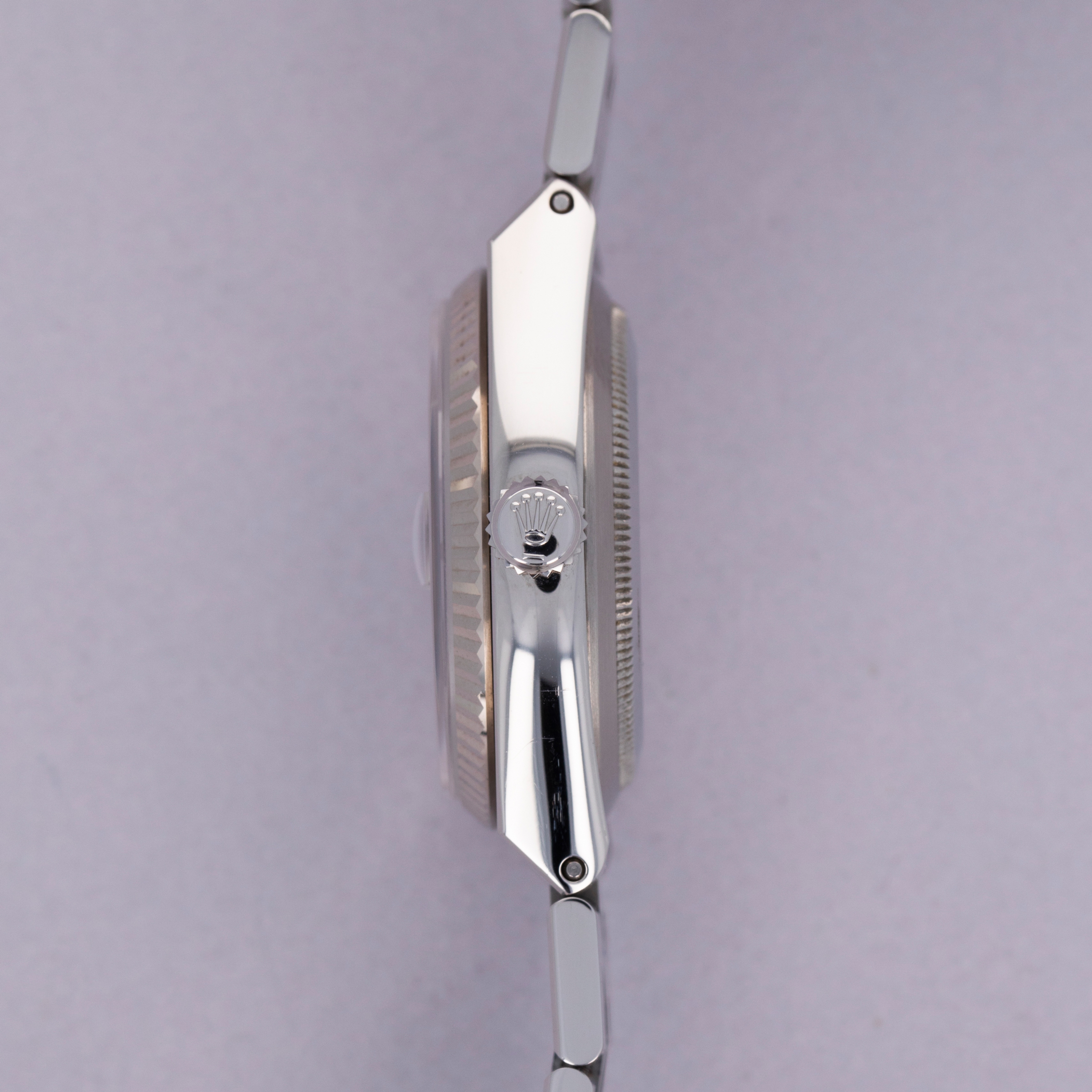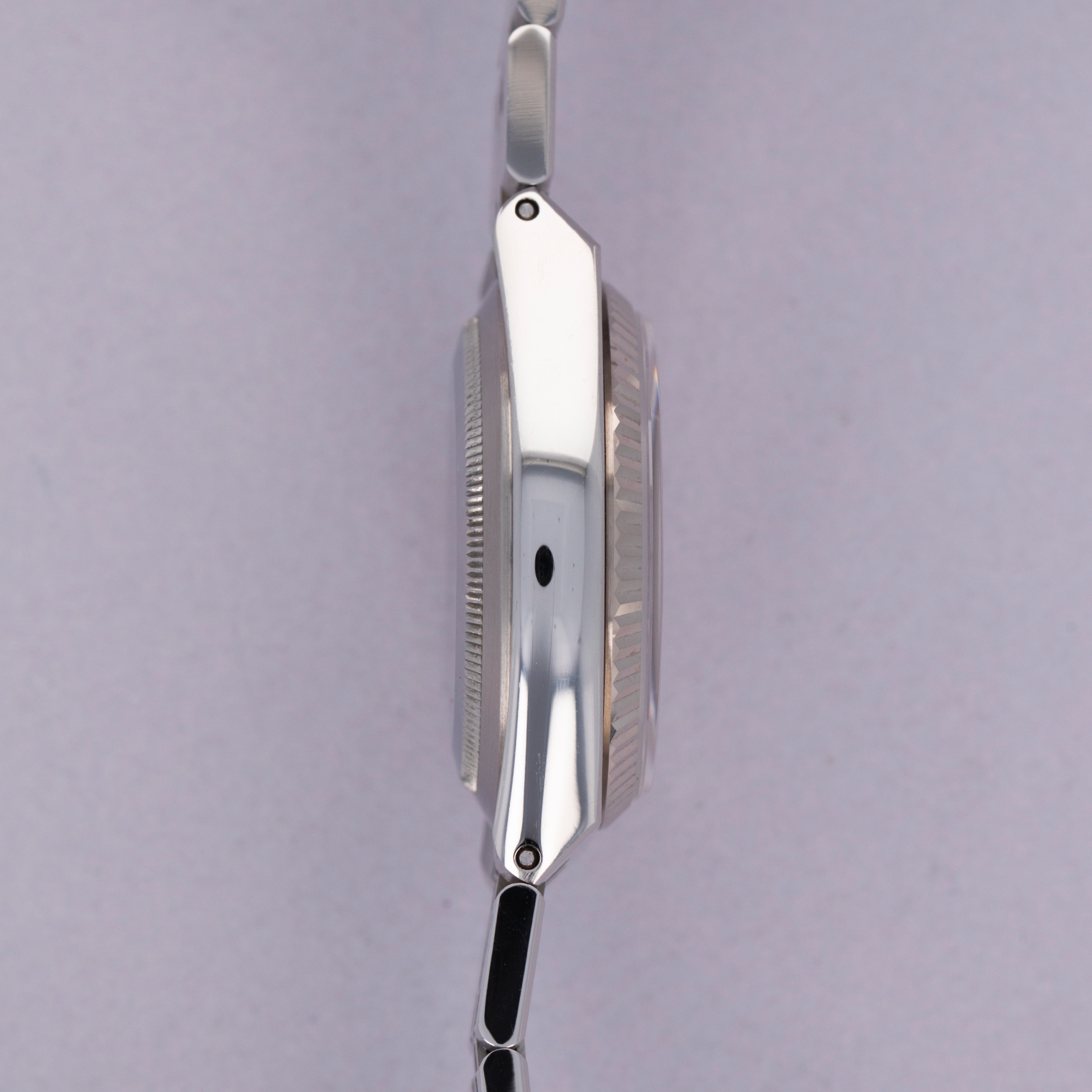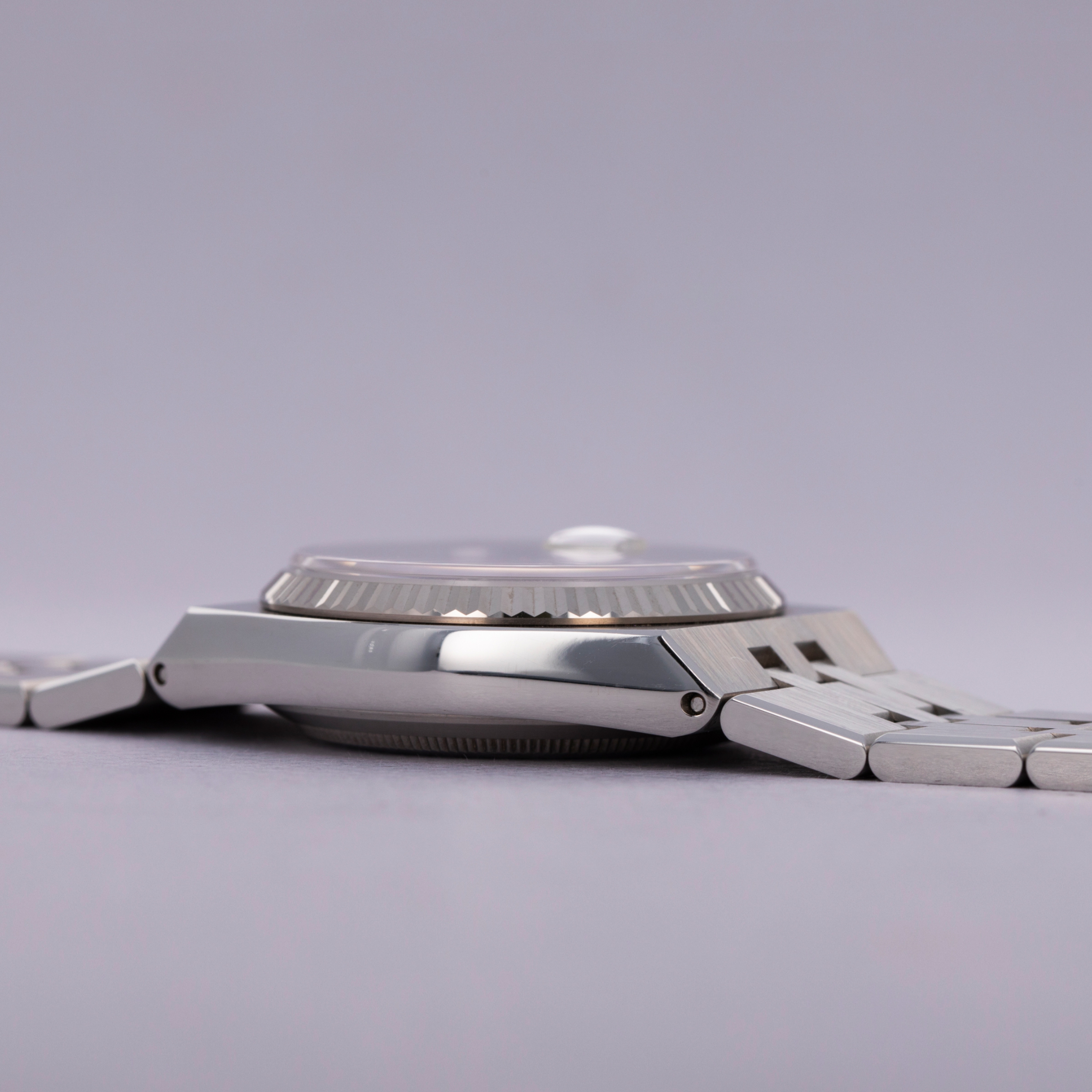 Featuring a blue dial that adds a subtle pop of color to the ref. 17104's 18kt white gold fluted bezel and stainless steel construction, this Oysterquartz is a wonderful balance of style, substance, and sophistication.