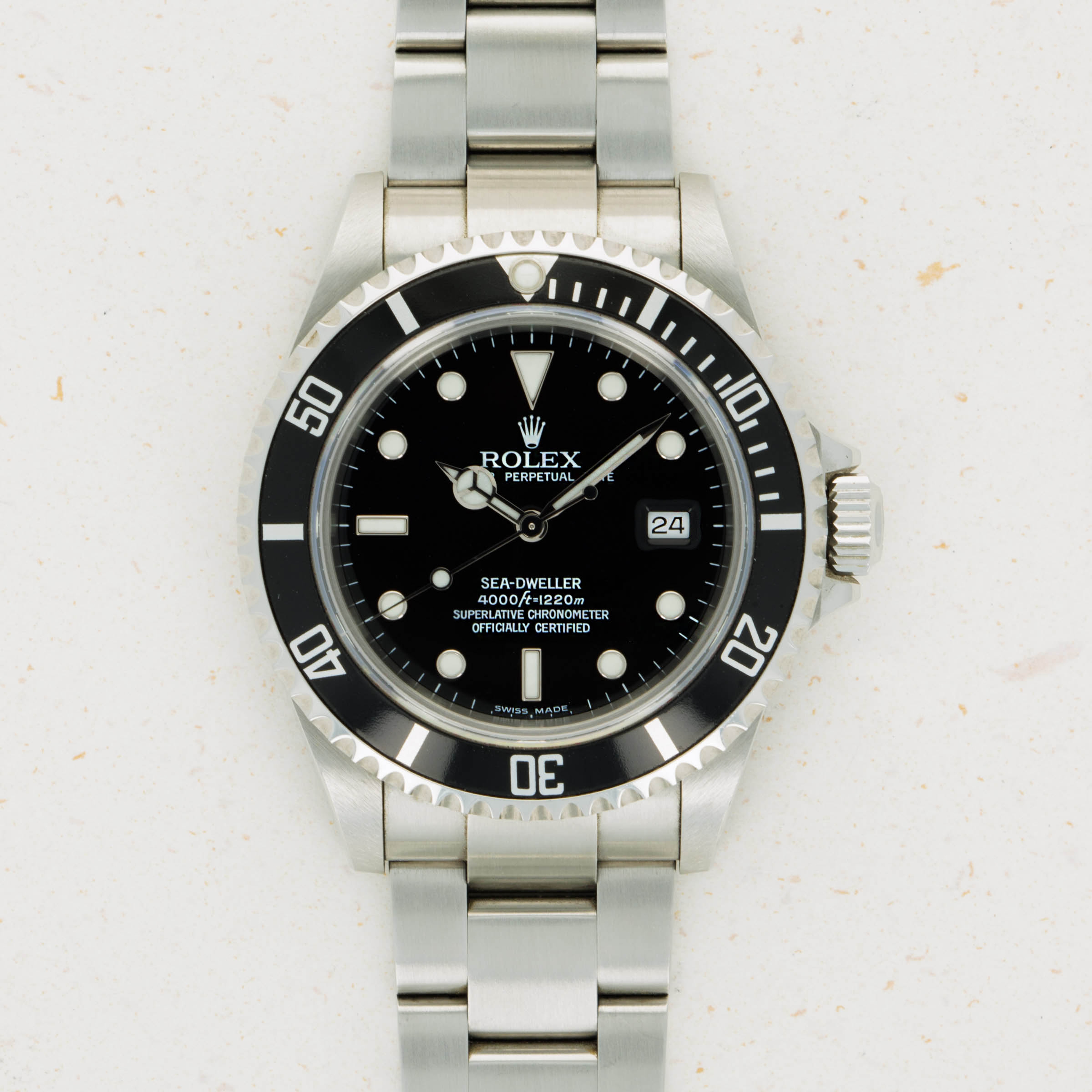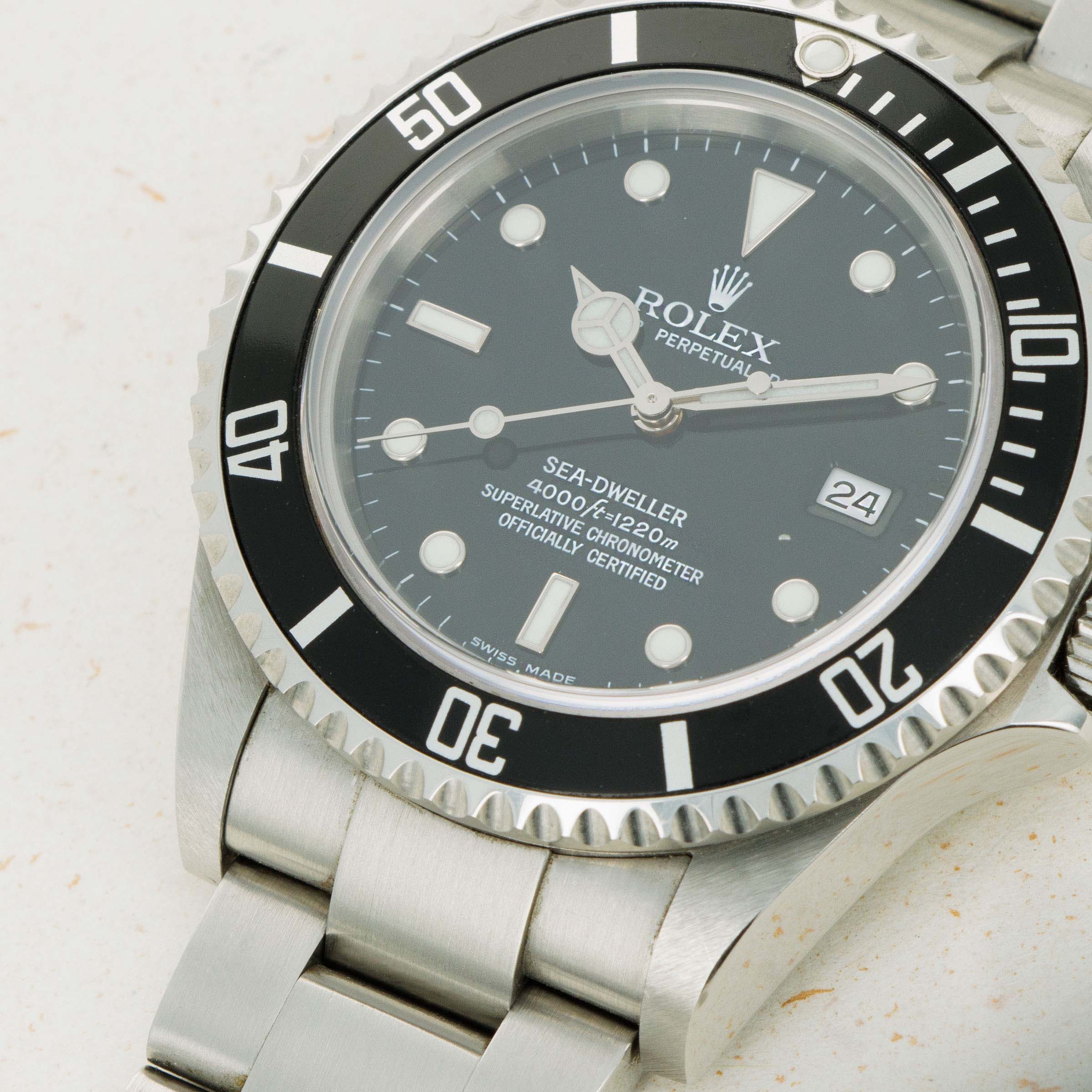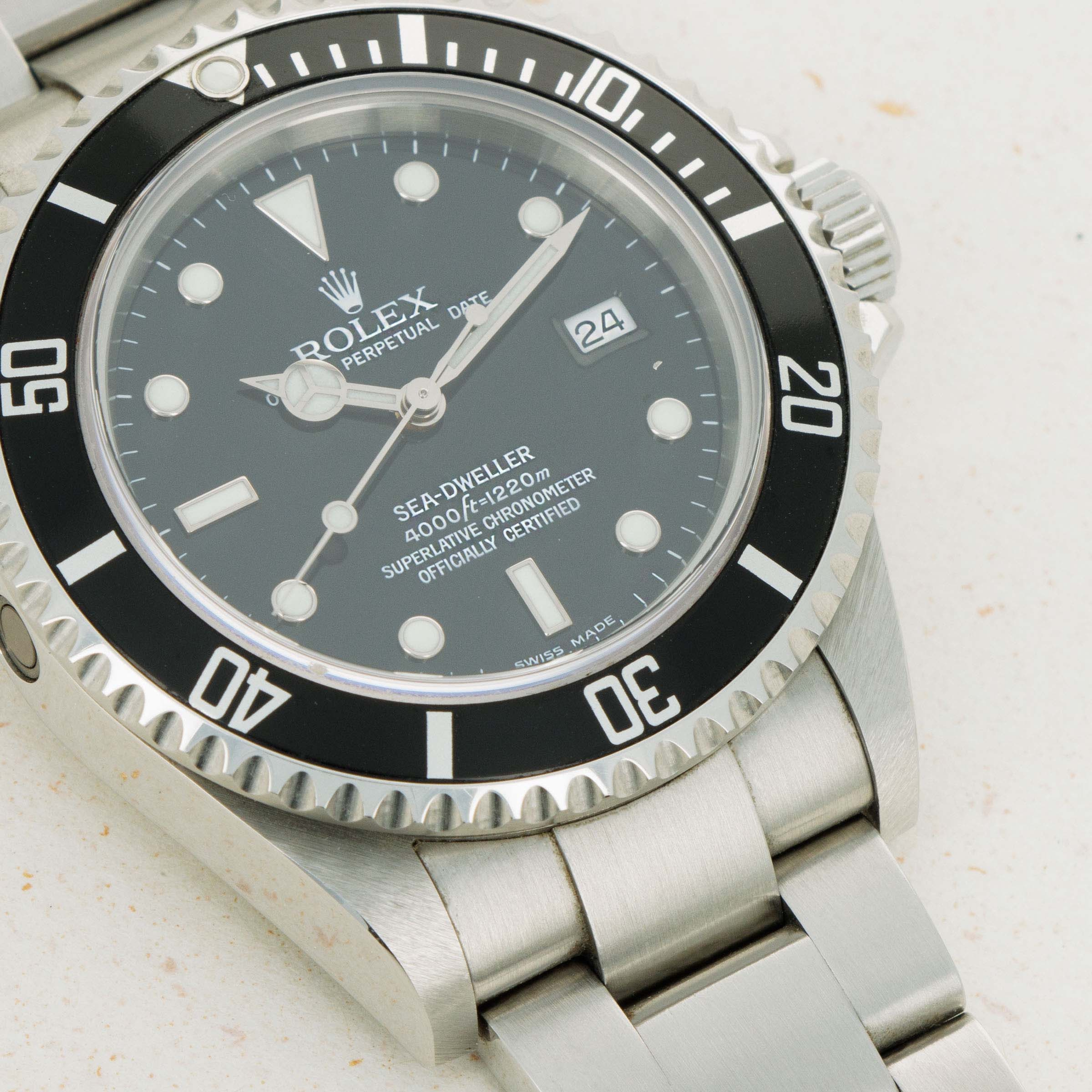 First released in 1967, the Rolex Sea-Dweller was launched as an upgraded version of Rolex’s ever-popular Submariner collection. With an increased water resistance of 610m versus the Submariner's 200m and a helium-escape valve to alleviate pressure within the case during its wearer's ascent back to the surface, the Sea-Dweller was a dive watch truly built for professionals. Amongst its many variants, the ref. 16600T that we have here debuted in 1988 and saw the longest production periods out of any Sea-Dweller – 20 years, with its discontinuation in 2008 leaving room for Rolex to introduce the Deepsea. With its black dial and aluminum bezel, lack of cyclops date magnifier, solid end links, and comfortable 40mm stainless steel case, the Sea-Dweller ref. 16600T blends some of watchmaking's creature comforts, in its robust construction, with some pieces of vintage detailing like its bezel and old-style Oysterlock clasp that have enabled it to remain a truly iconic piece of Rolex design and engineering.