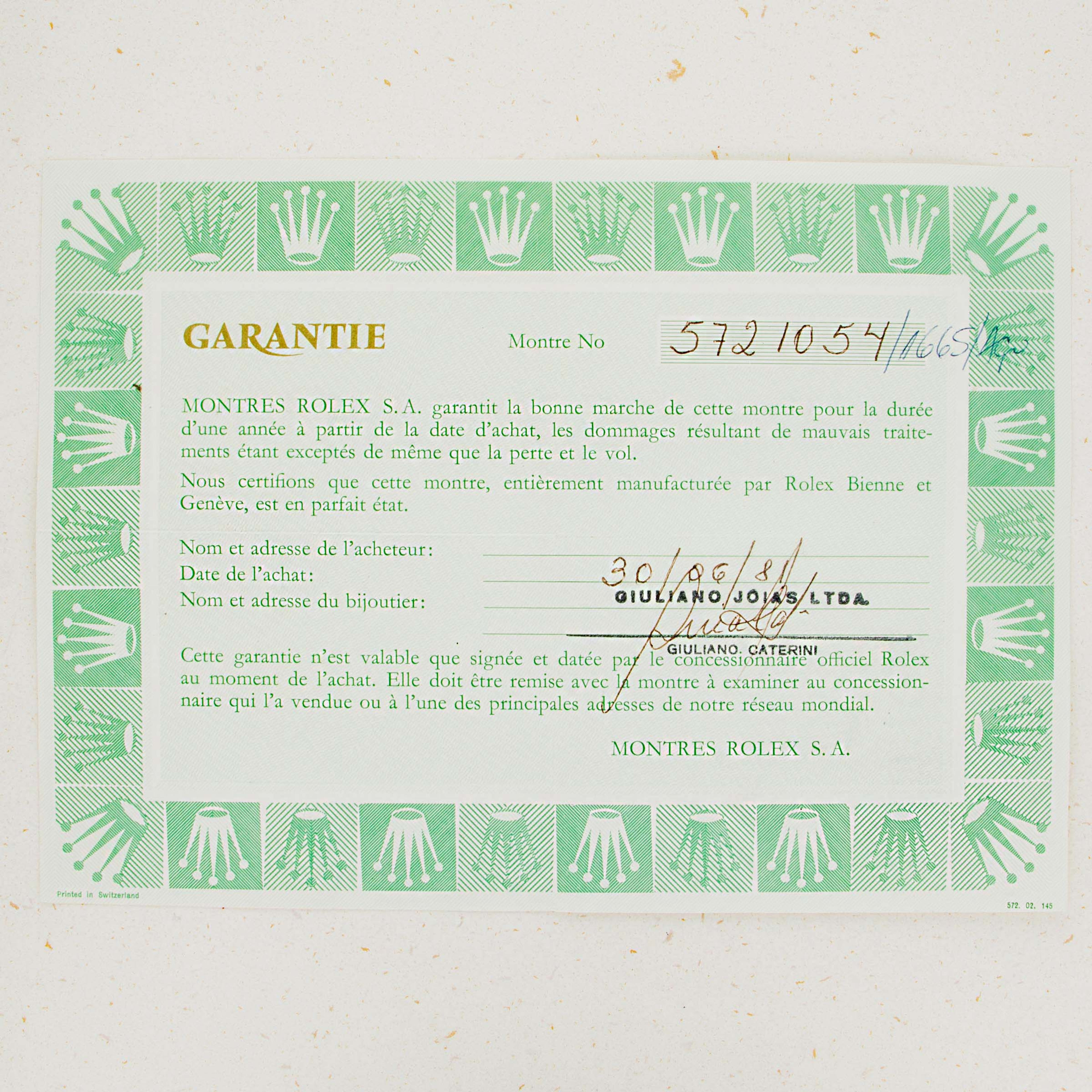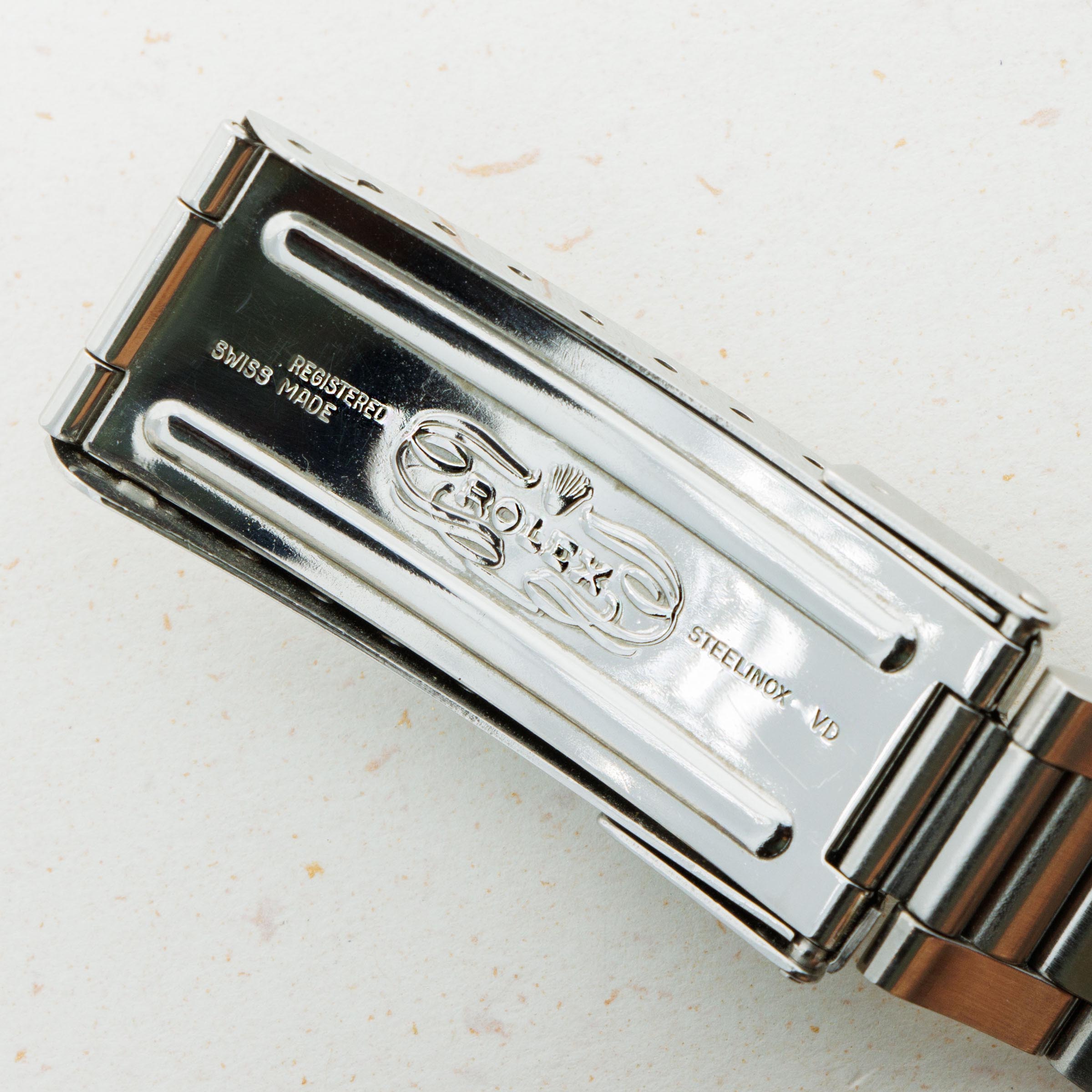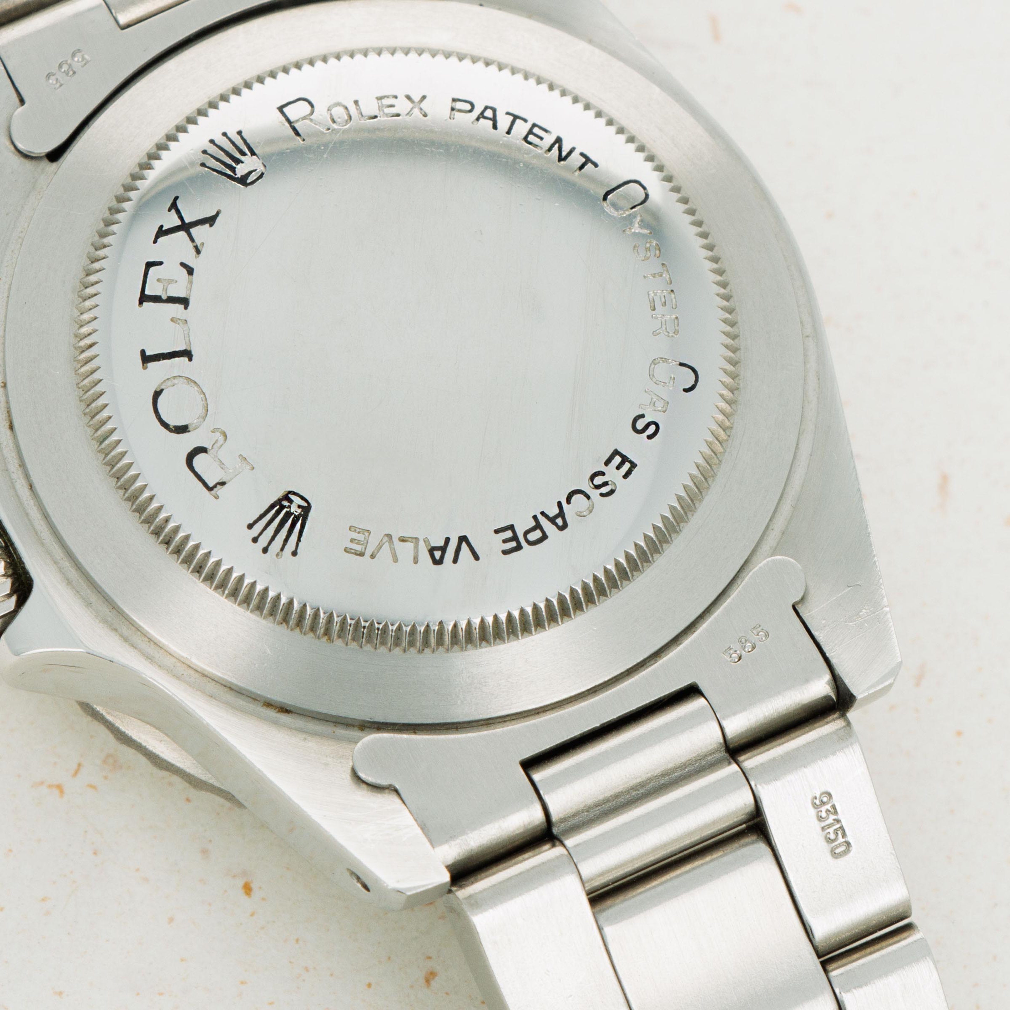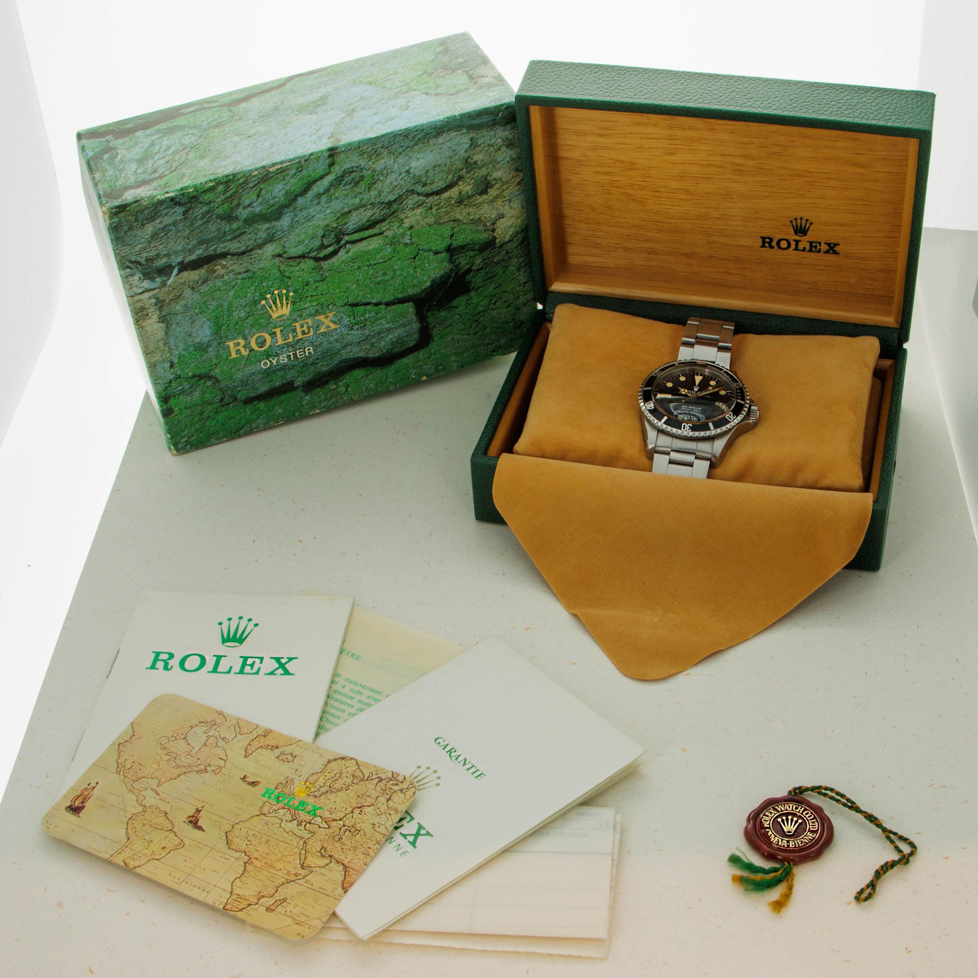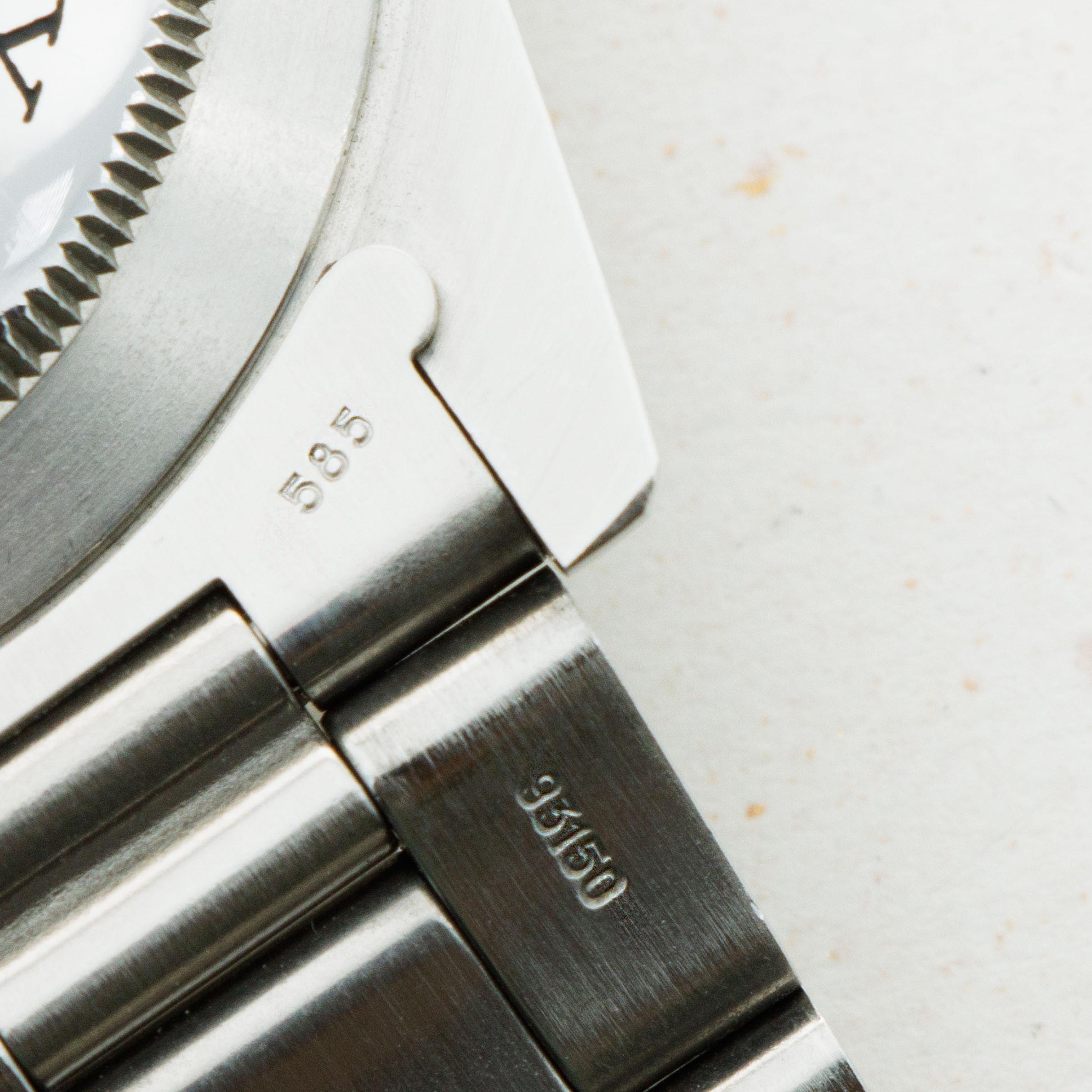 Watch is in near-mint condition. Case is thick and full, and caseback still retains some of the original black enamel. The dial has a beautiful yellow patina and matching hands that are frosted with some oxidation. The original 91350 oyster band has the correct 585 end pieces. The band shows little stretch and has 11 links total. (One removable link). The watch comes with an original sales invoice and hand written guarantee dated 1981, as well as a calendar from 1977 and various booklets. The box that comes with the watch is a later addition, and is from the late 1990s.