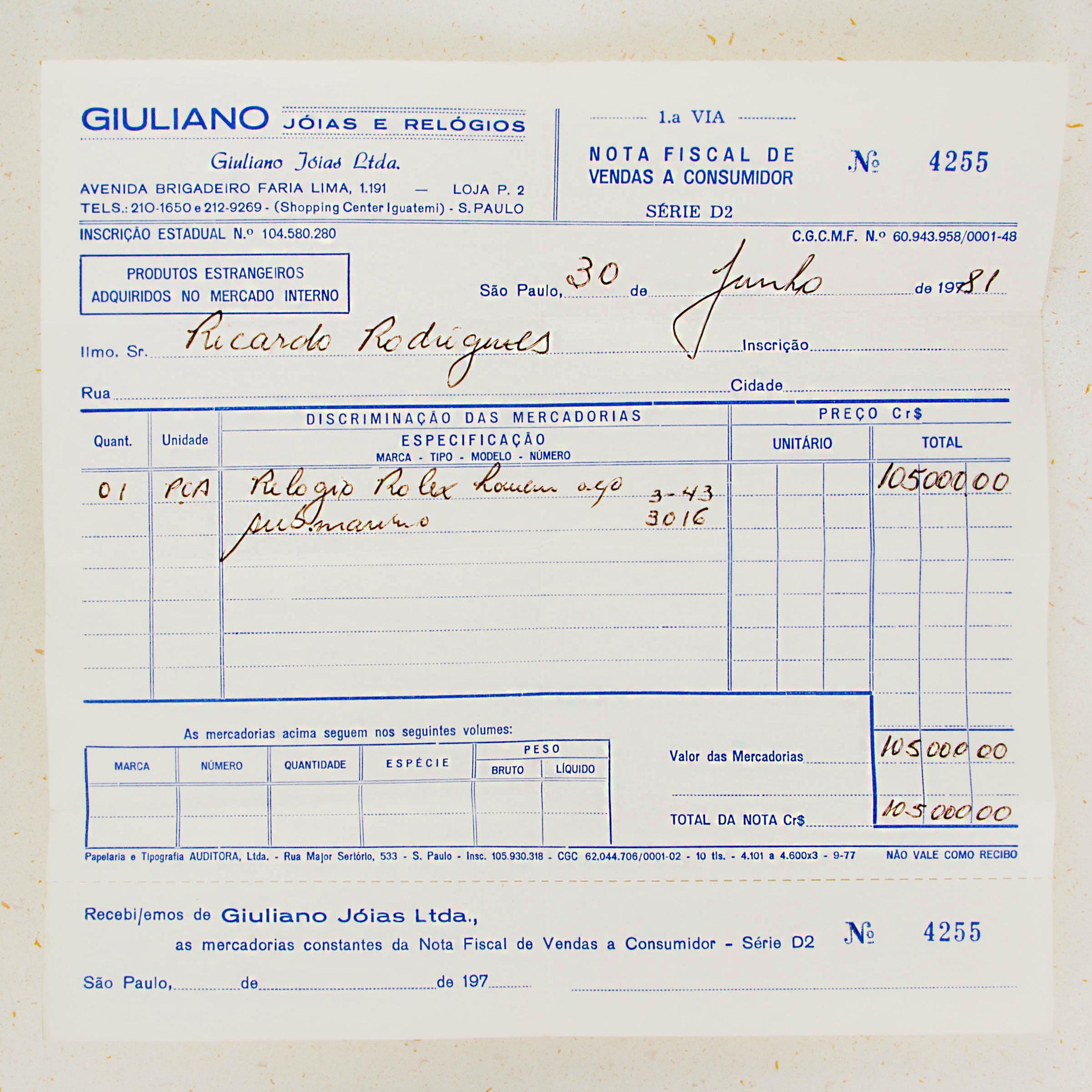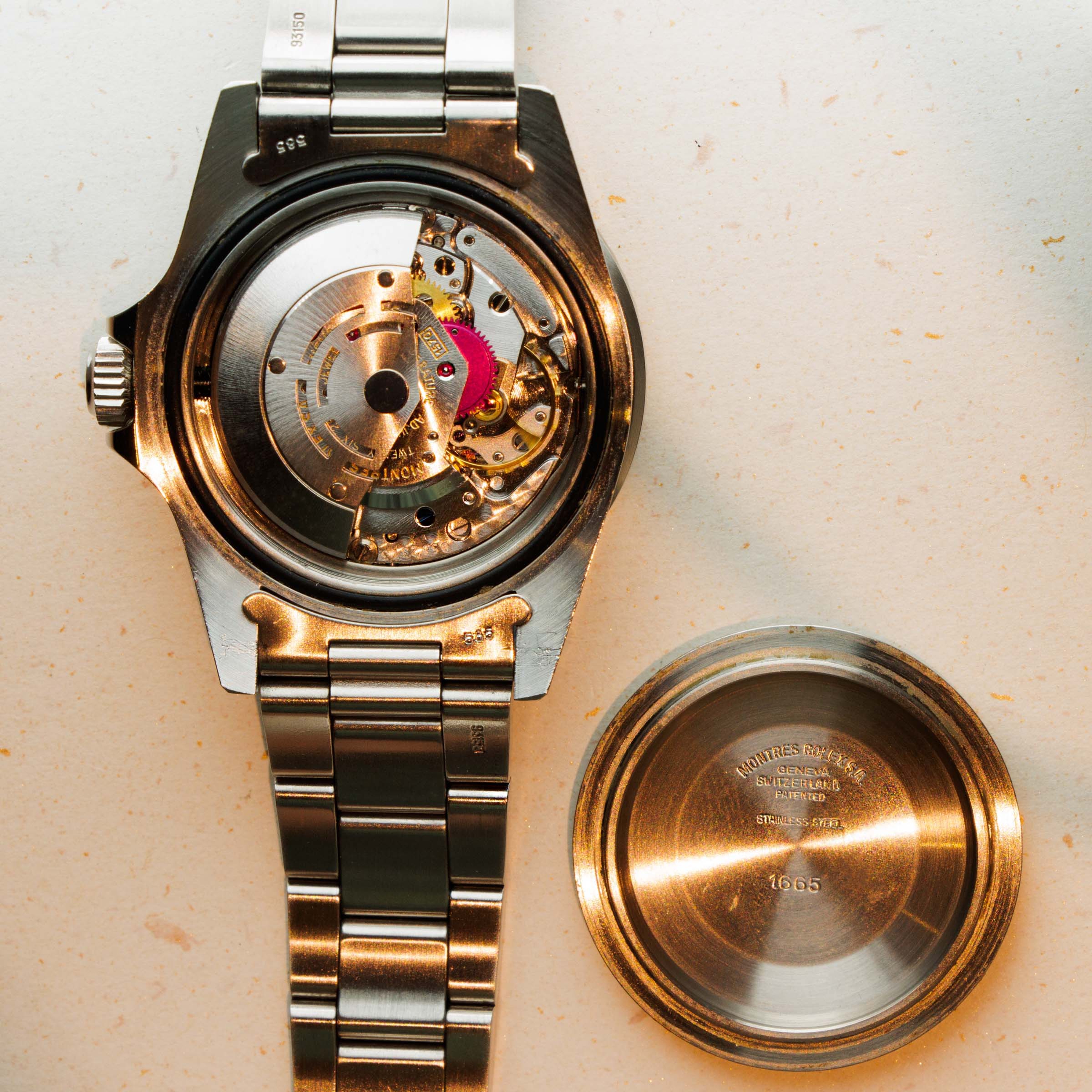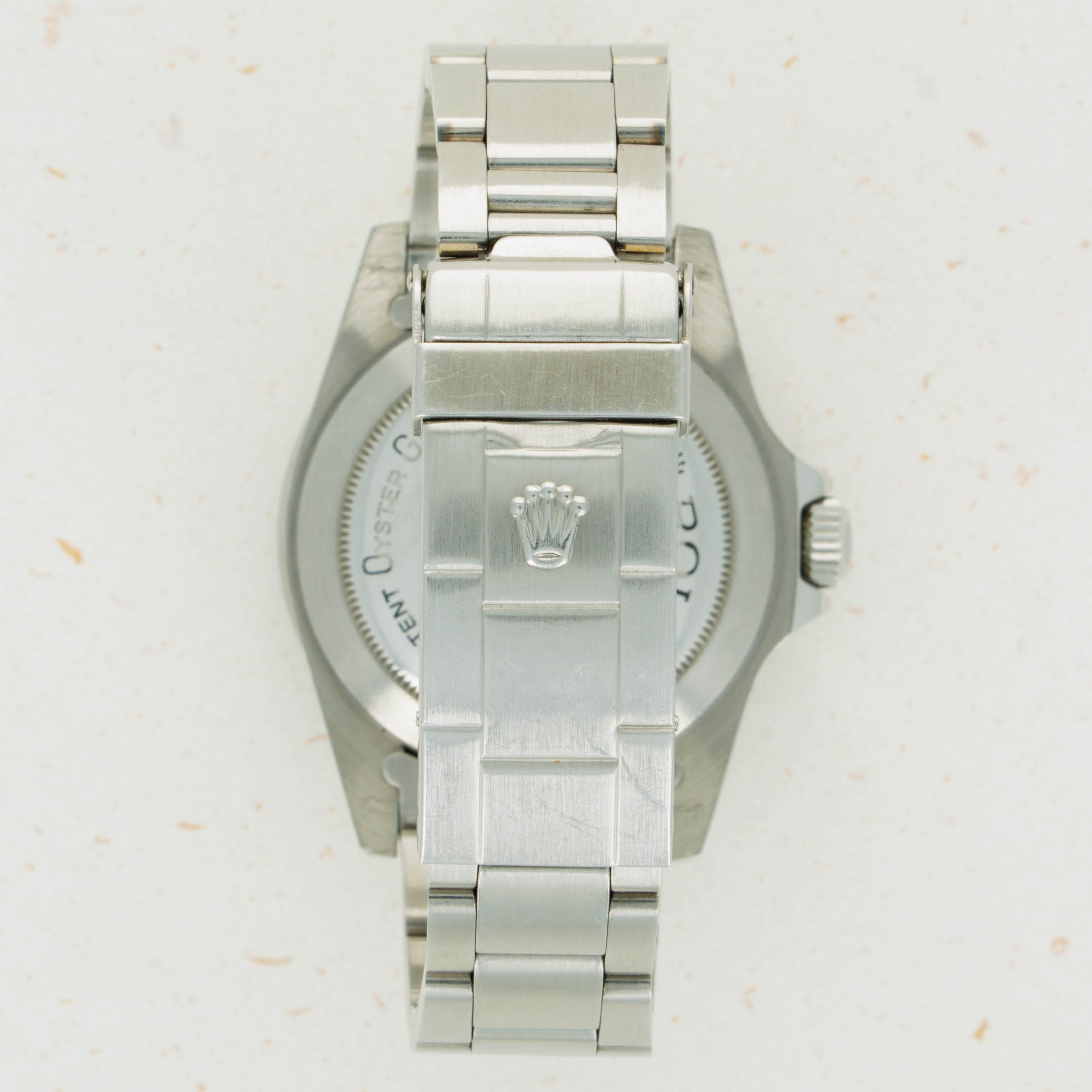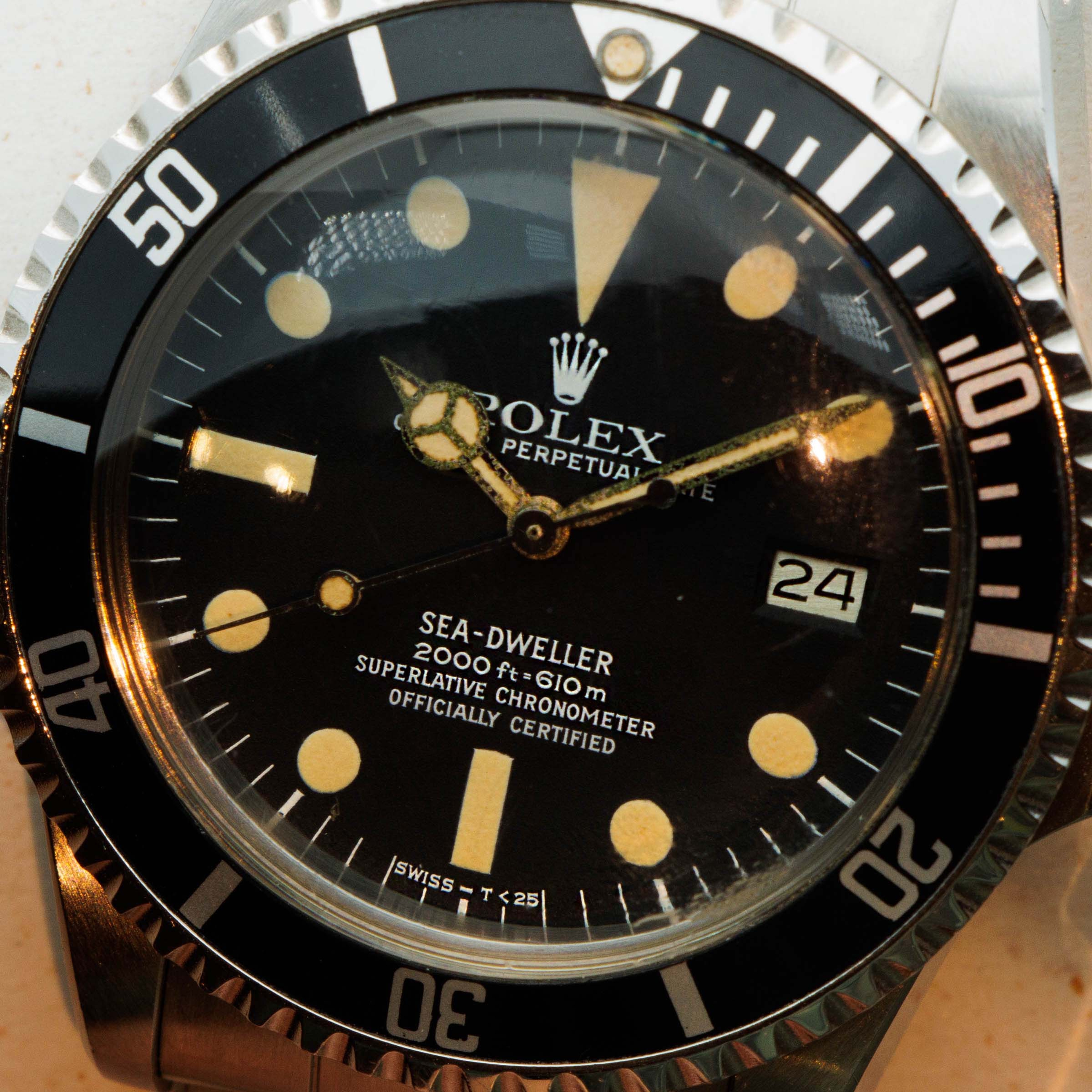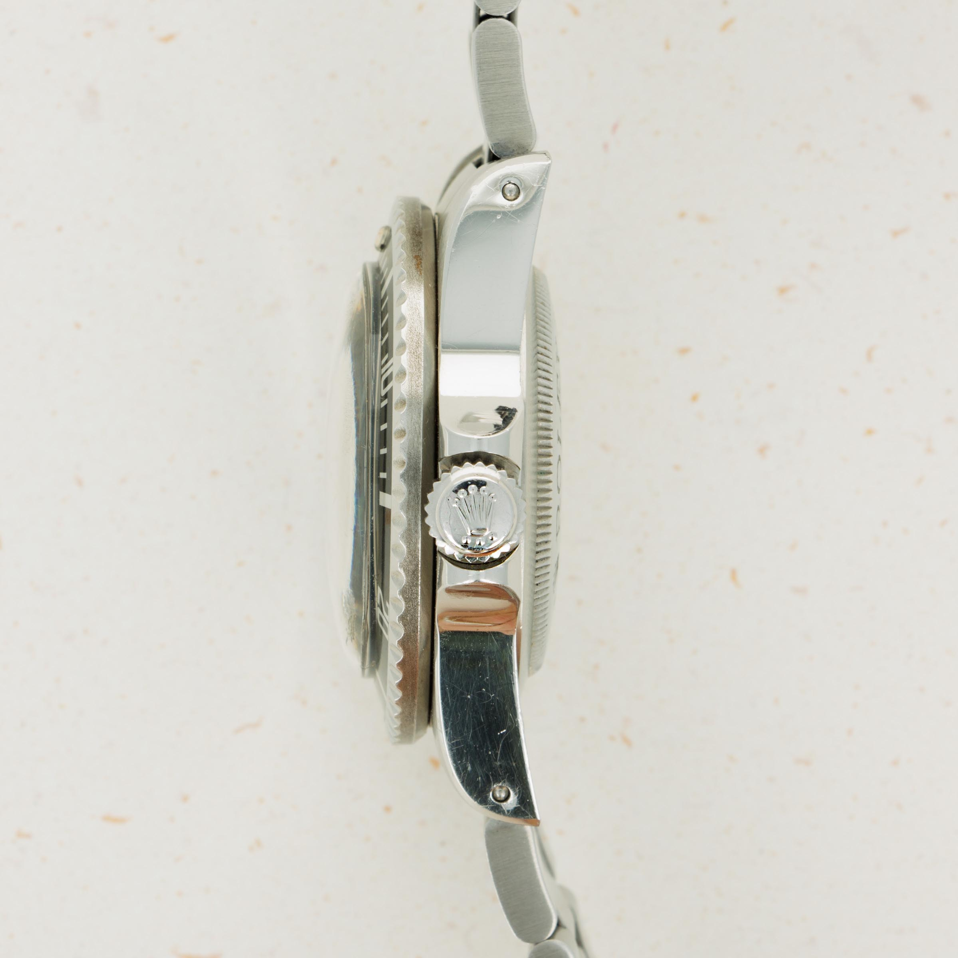 Watch is in near-mint condition. Case is thick and full, and caseback still retains some of the original black enamel. The dial has a beautiful yellow patina and matching hands that are frosted with some oxidation. The original 91350 oyster band has the correct 585 end pieces. The band shows little stretch and has 11 links total. (One removable link). The watch comes with an original sales invoice and hand written guarantee dated 1981, as well as a calendar from 1977 and various booklets. The box that comes with the watch is a later addition, and is from the late 1990s.