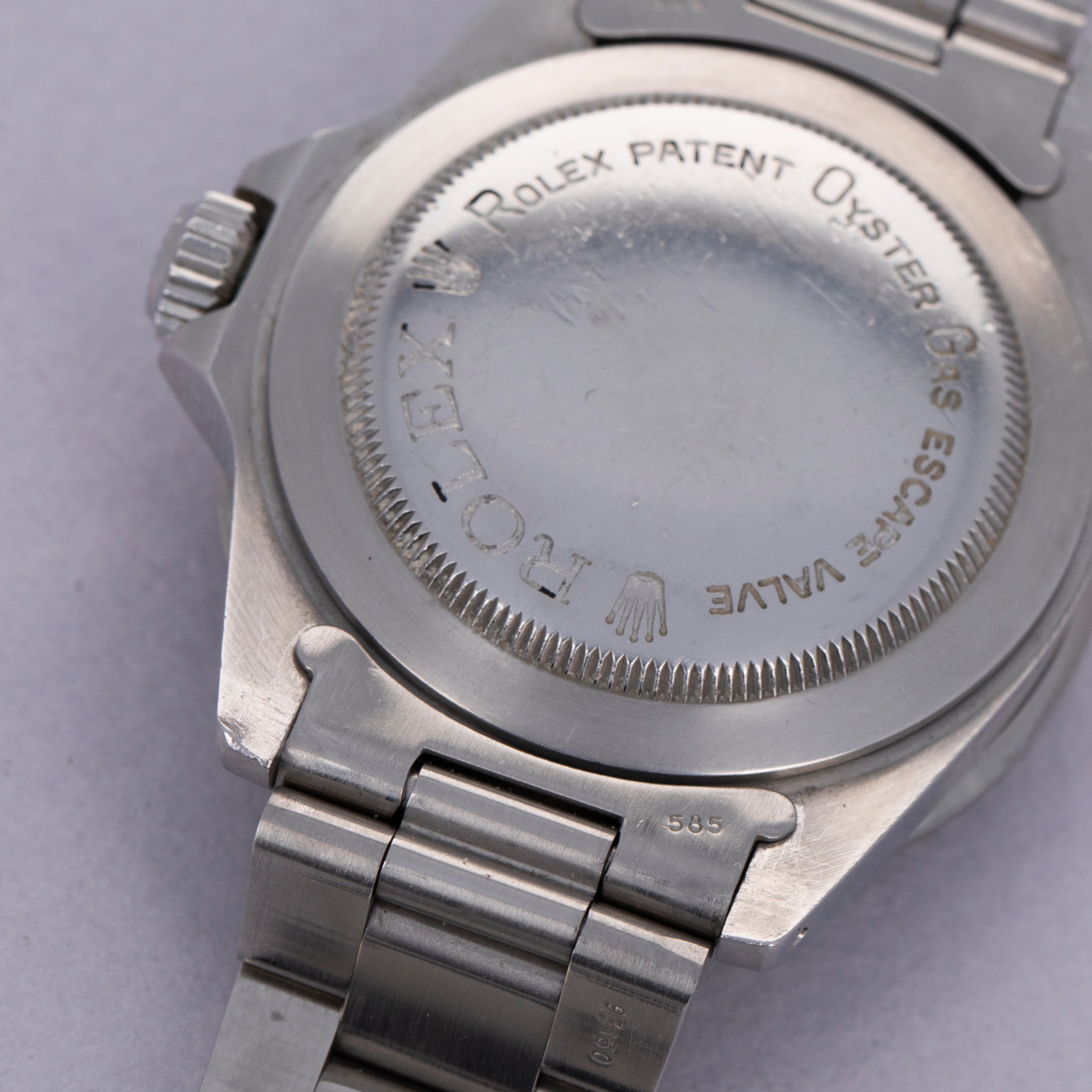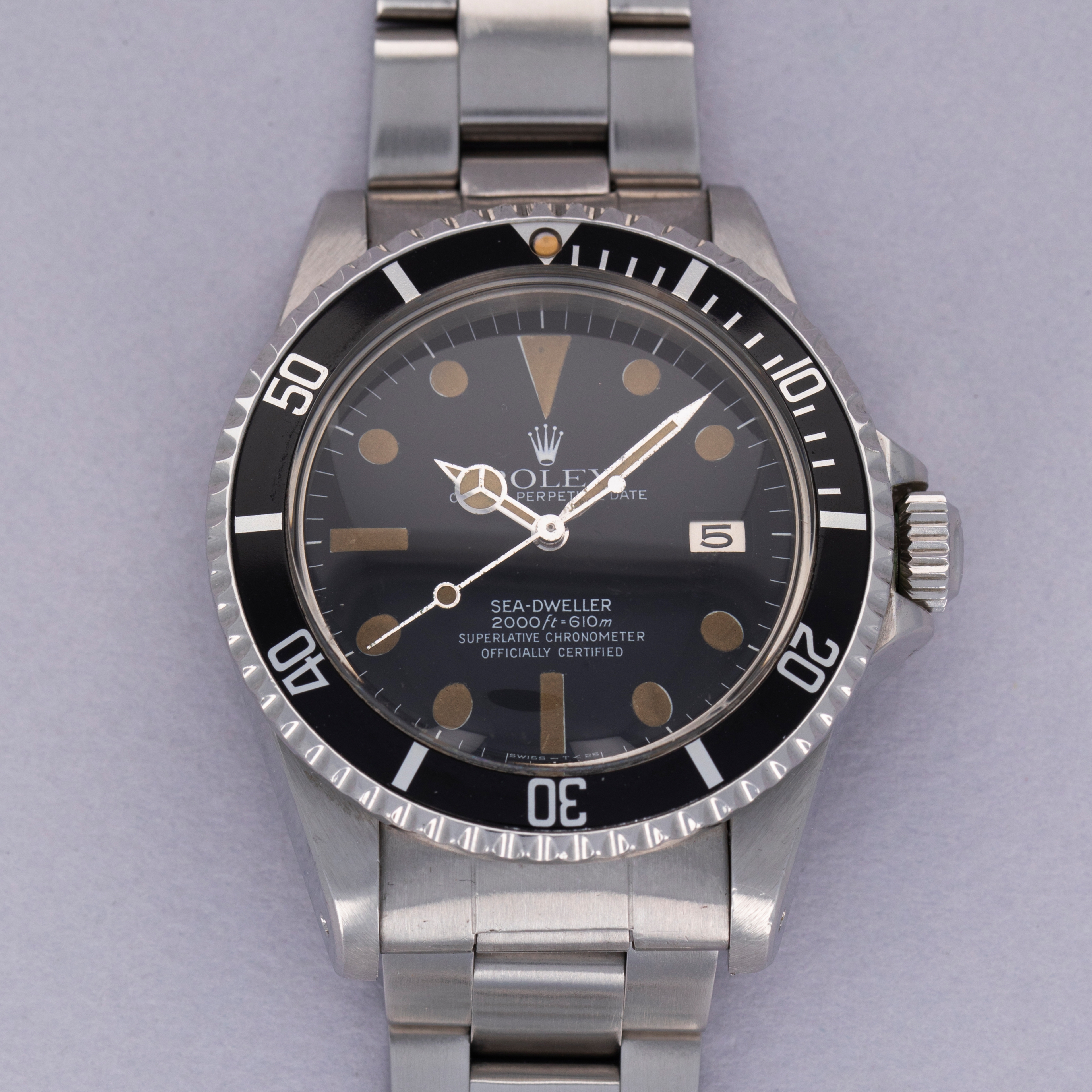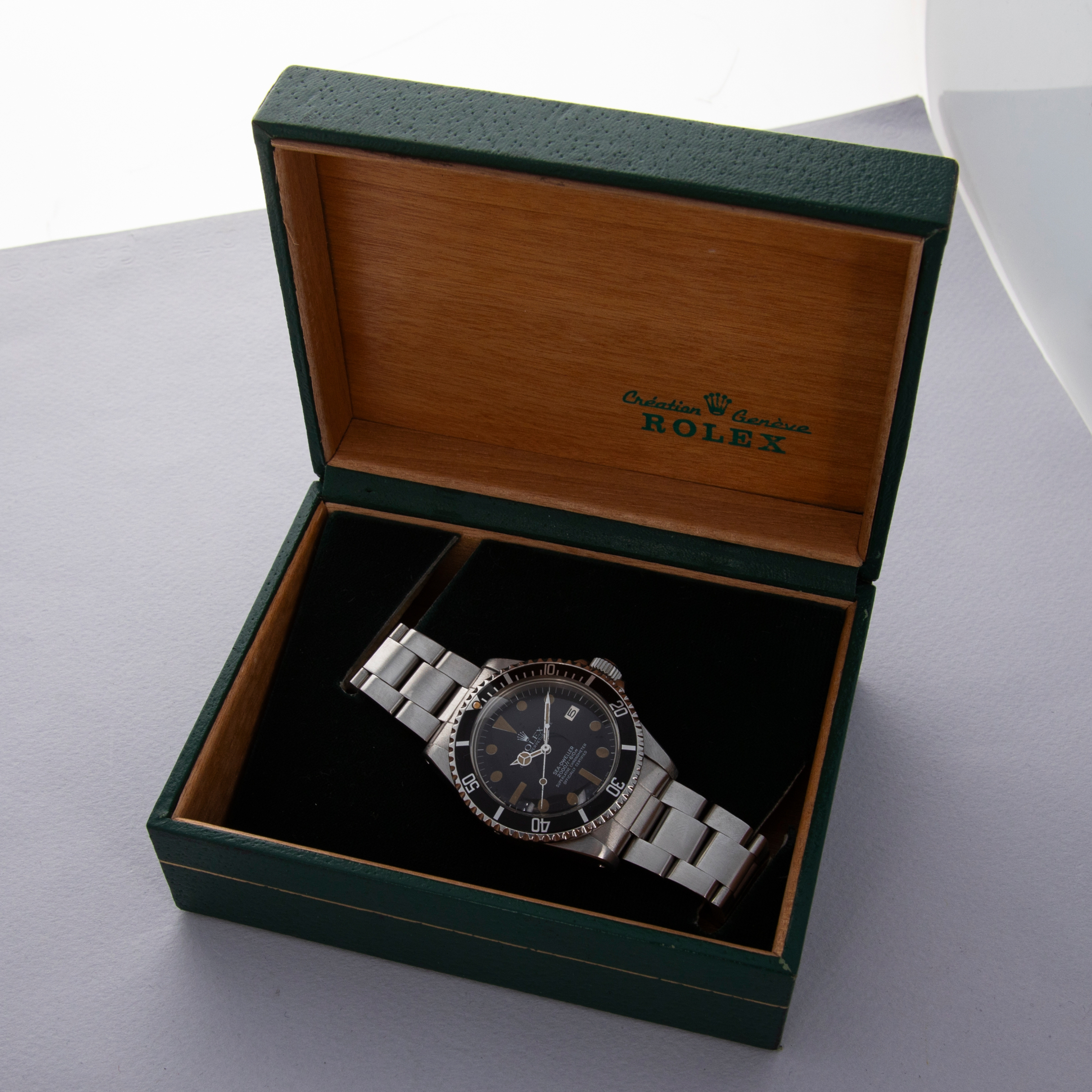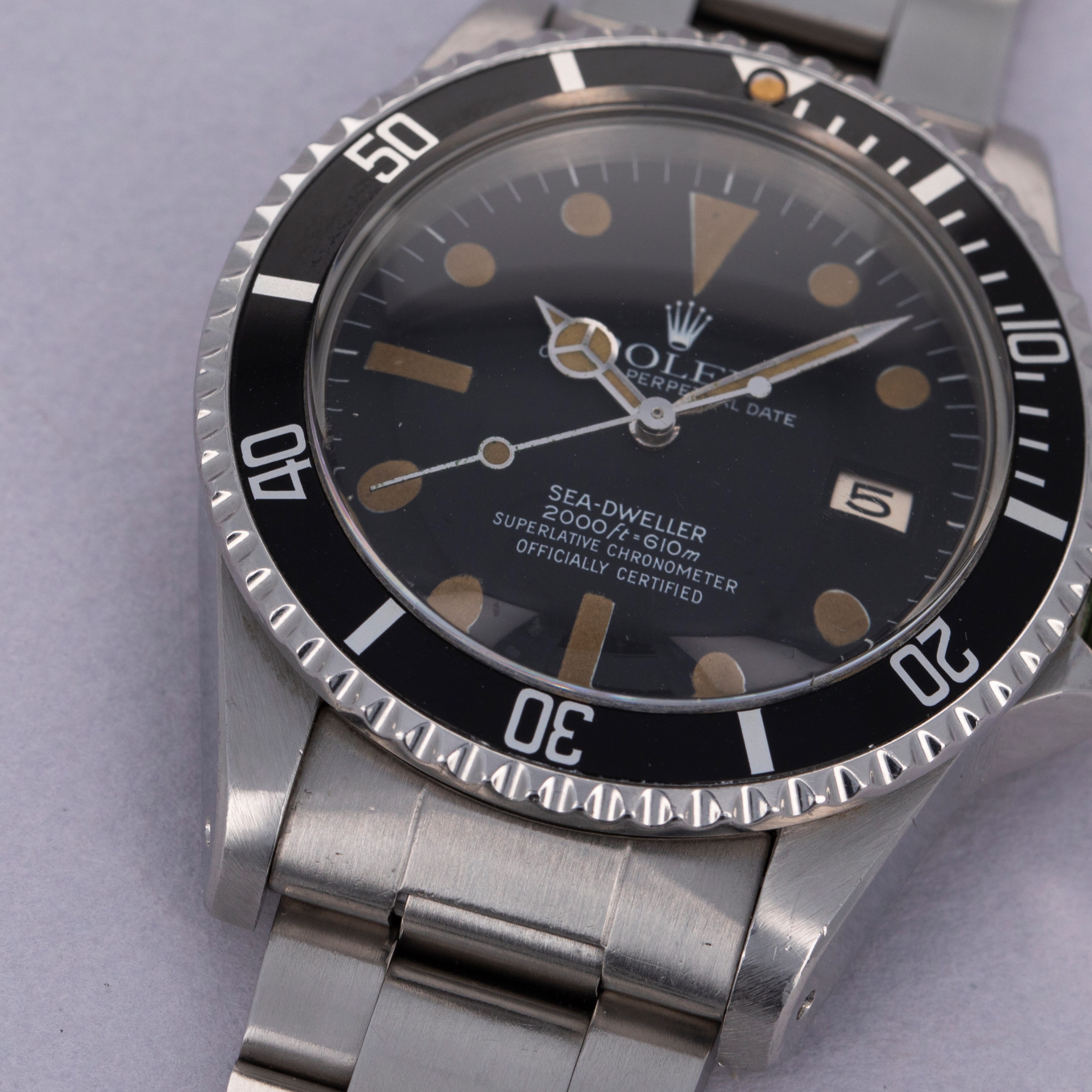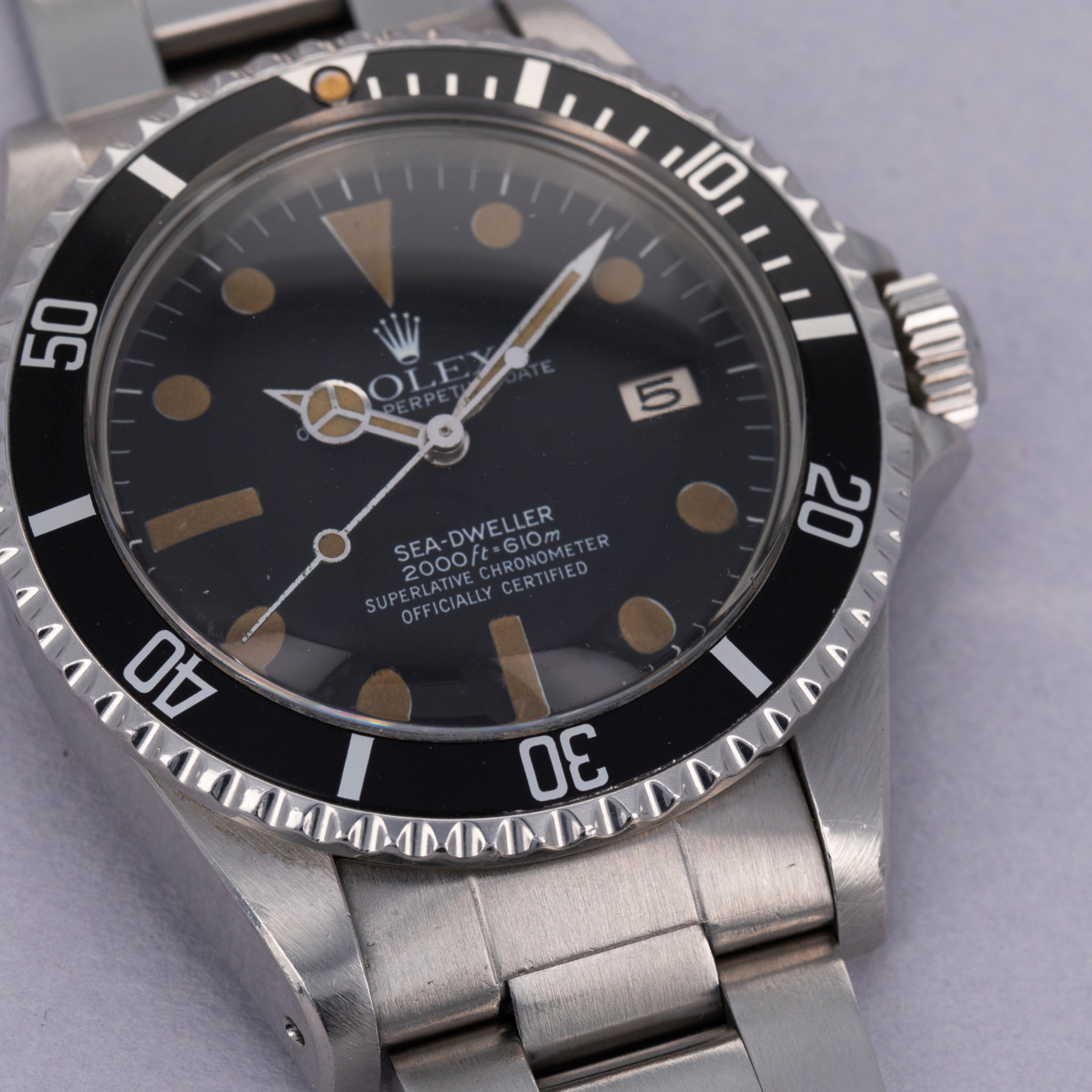Boasting a beautiful matte black 'Great White' dial (so-called due to its white 'Sea-Dweller' text), this example's original tritium hands have aged to include the same deep orange patina as on its tritium indexes.