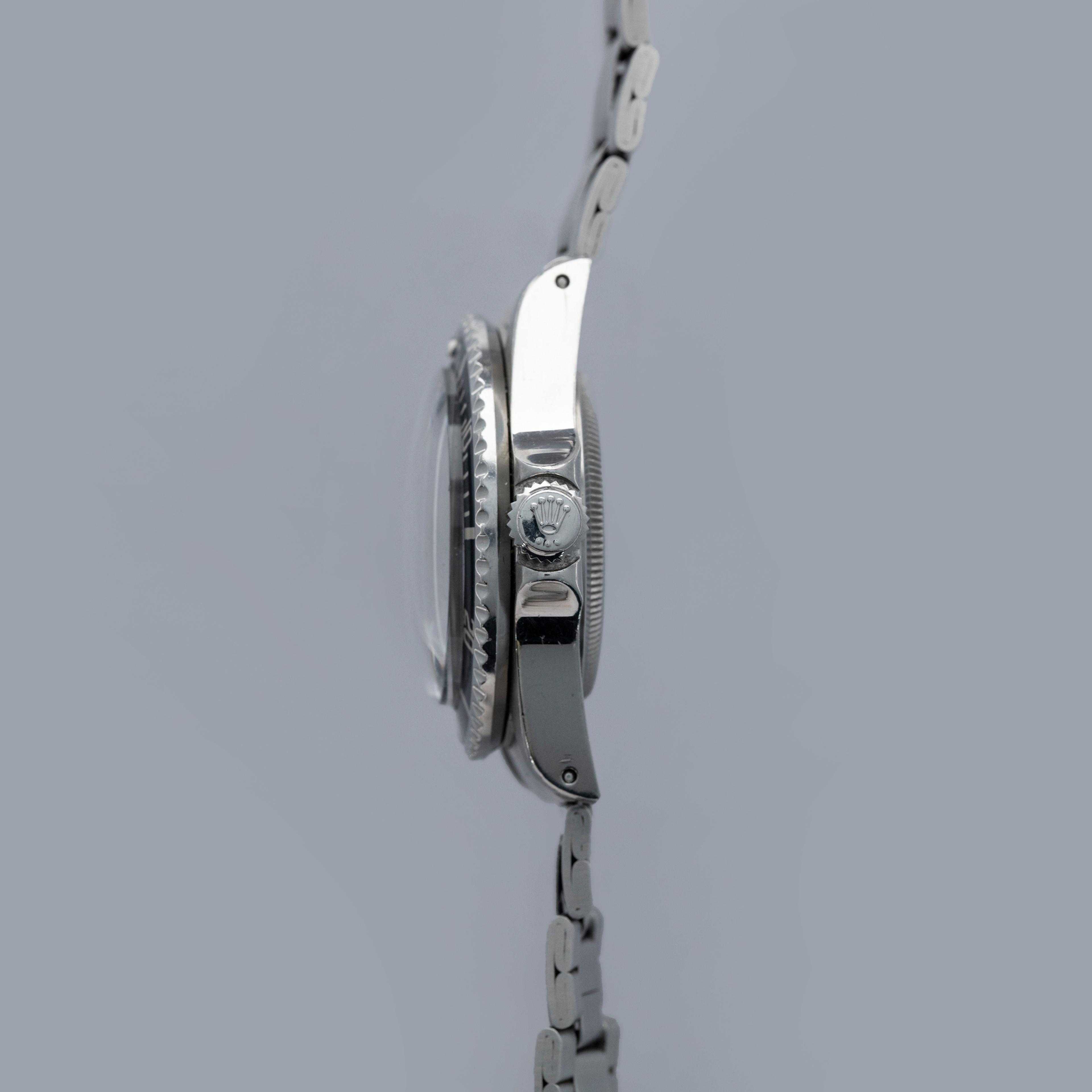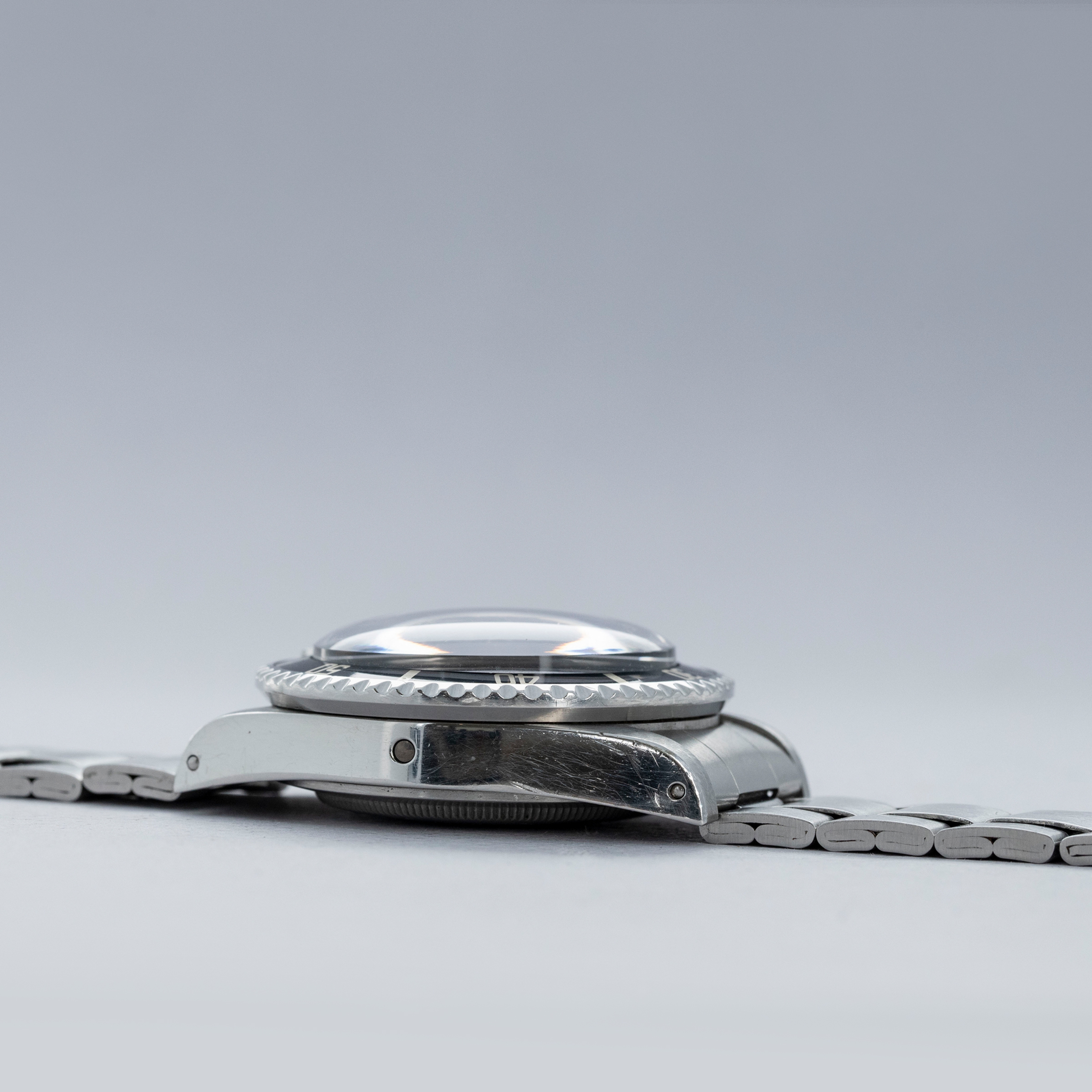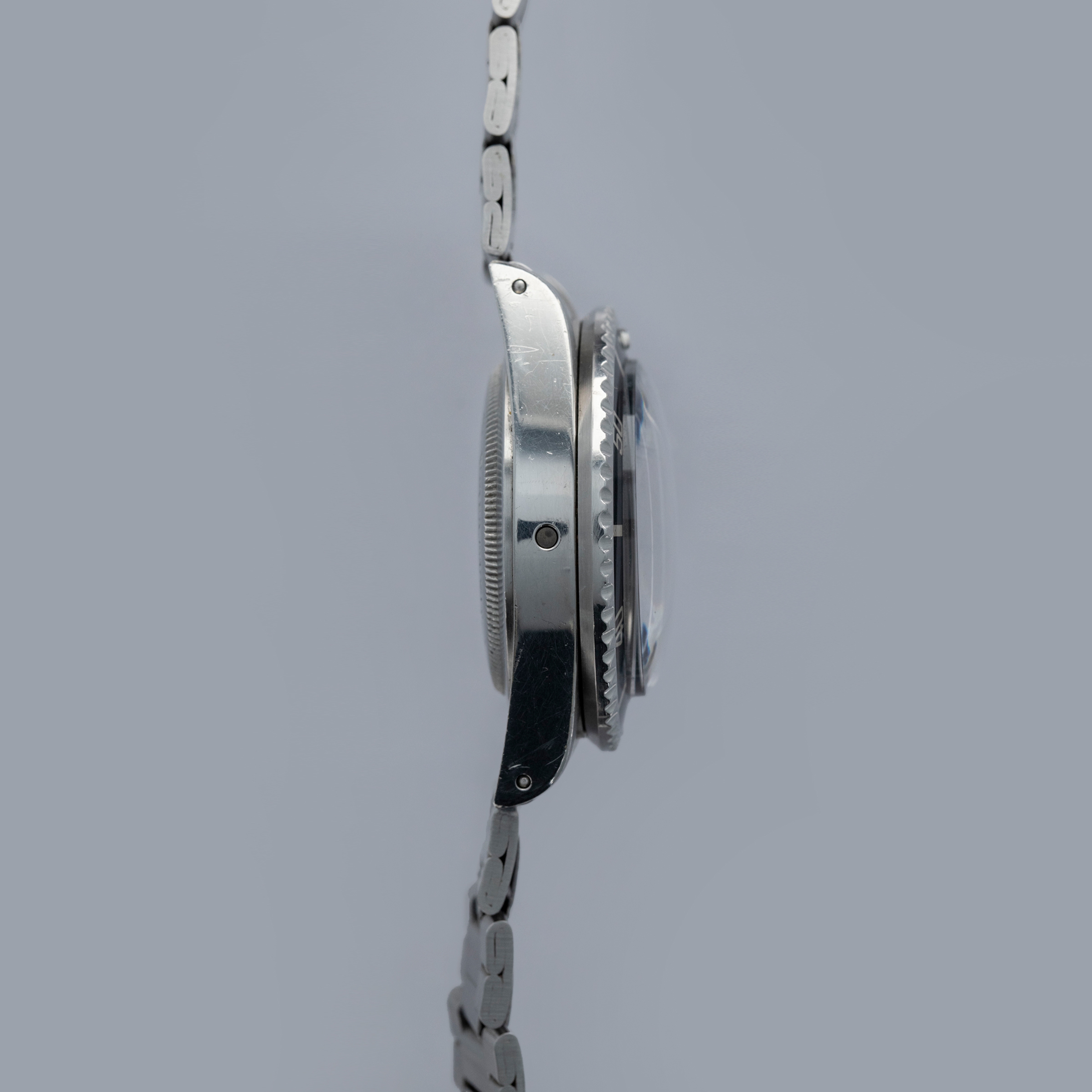 The watch is in overall excellent condition. The steel case is well defined with crisp chamfers shows some scratches and light marks as expected of a watch of this vintage. The case back has some scratches and marks. The bezel is excellent, with some light marks and scratches on the insert. The dial is excellent, with crisp text and minute markers, and the lume is very clean. The hands have lume that is of a similar tone. The folded link Oyster bracelet is in excellent condition with light play between the links. The bracelet currently fits a 7" wrist and has 10 links.