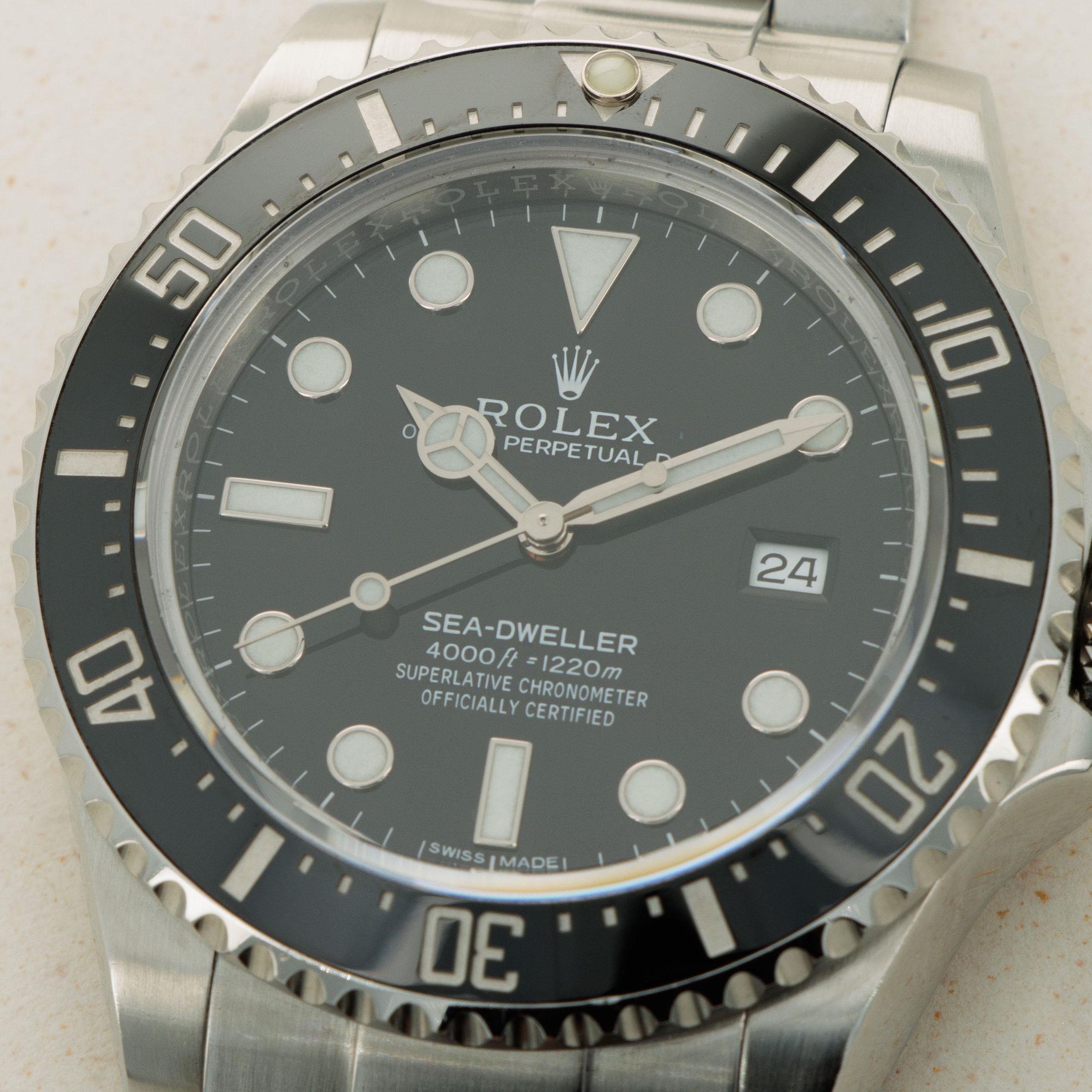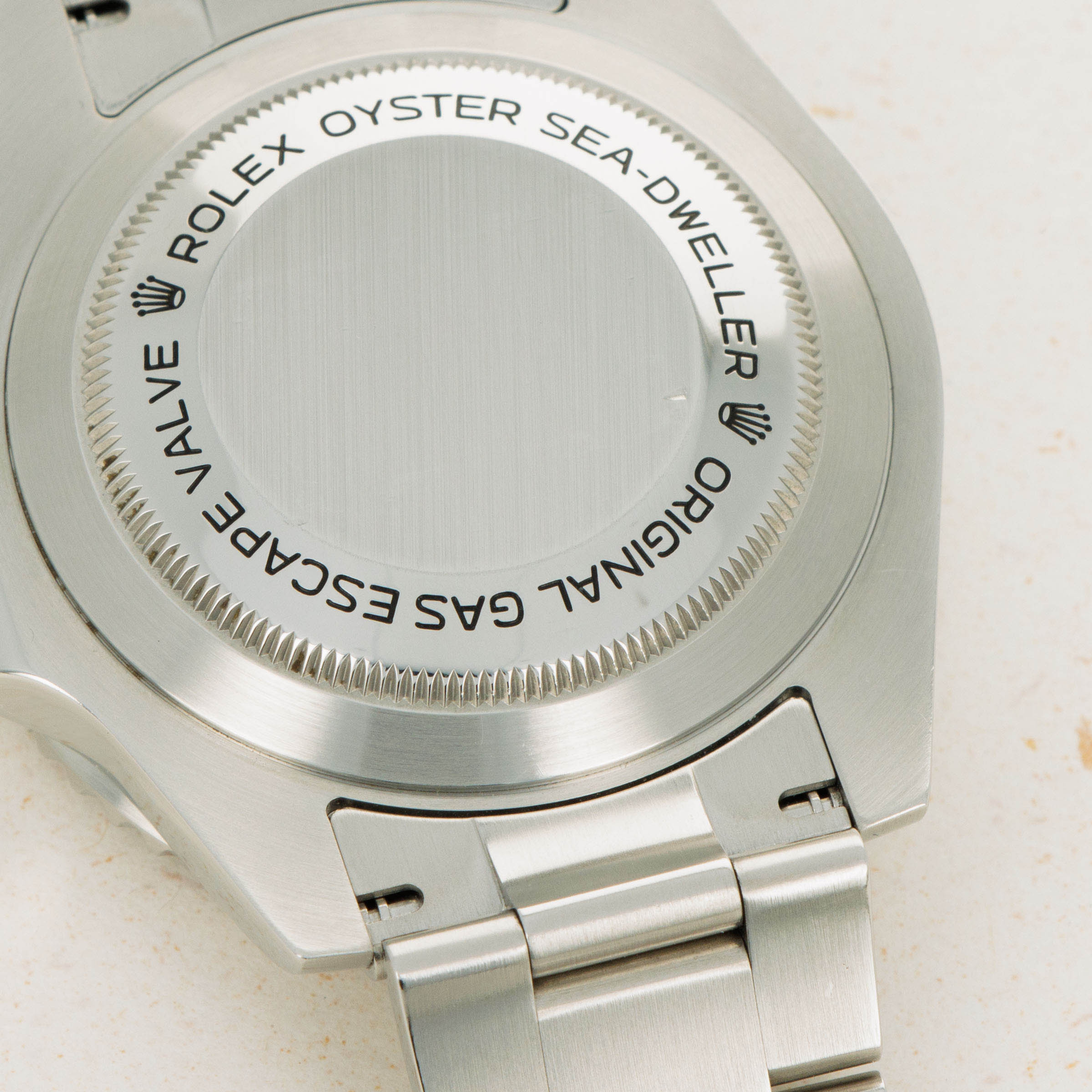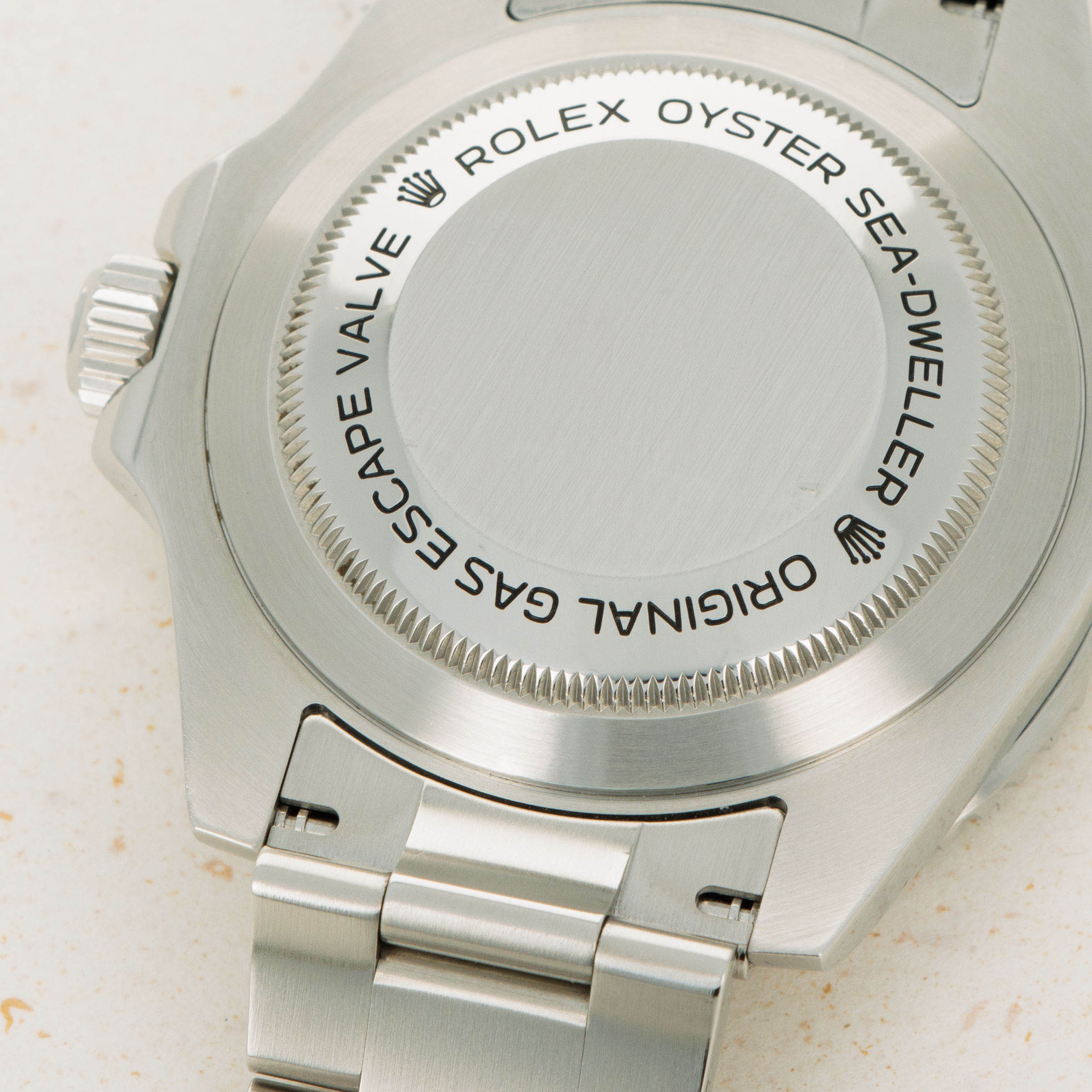 Featuring Rolex's traditional black dial and black Cerachrom bezel combo, the Sea-Dweller's most unique aspect is its lack of a cyclops lens.