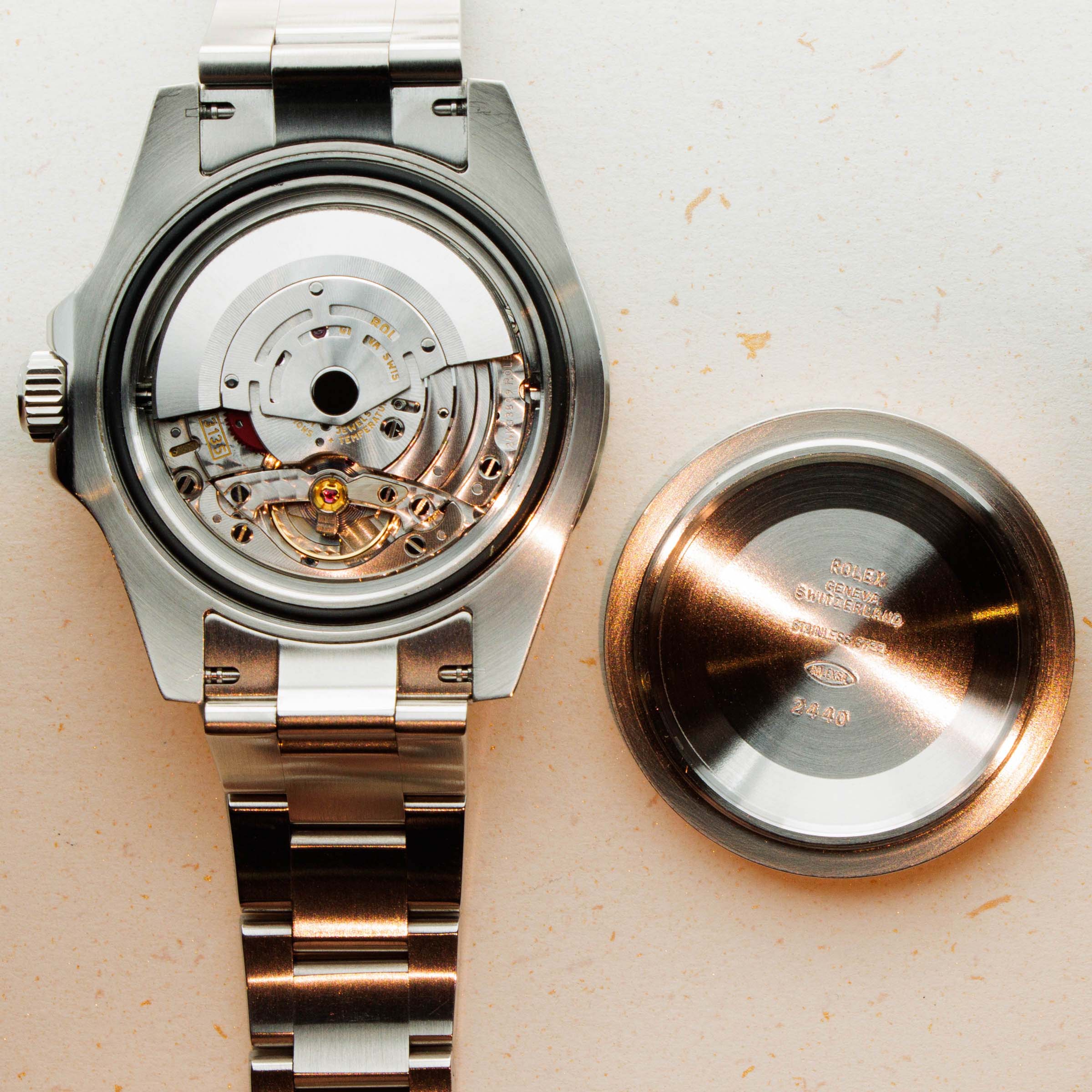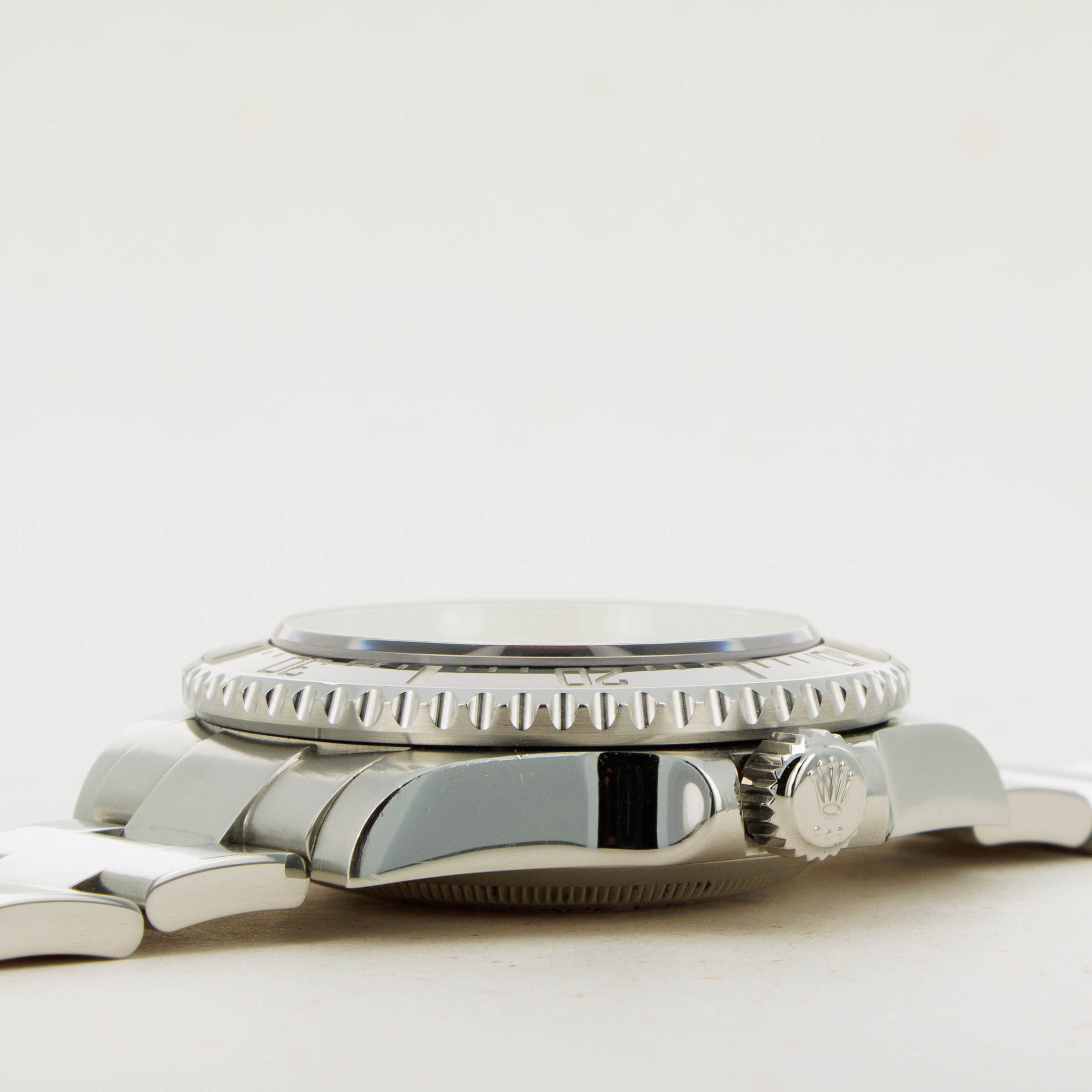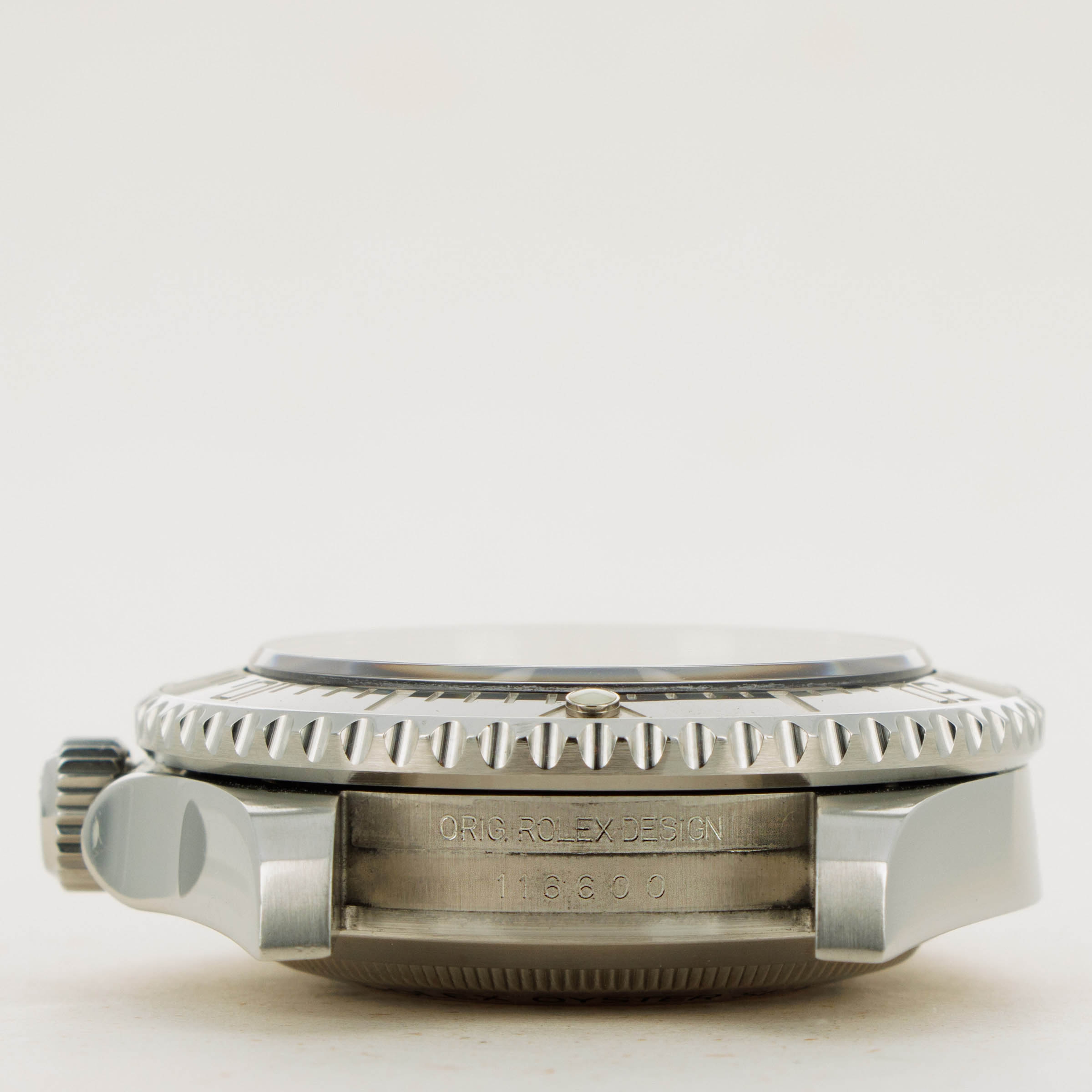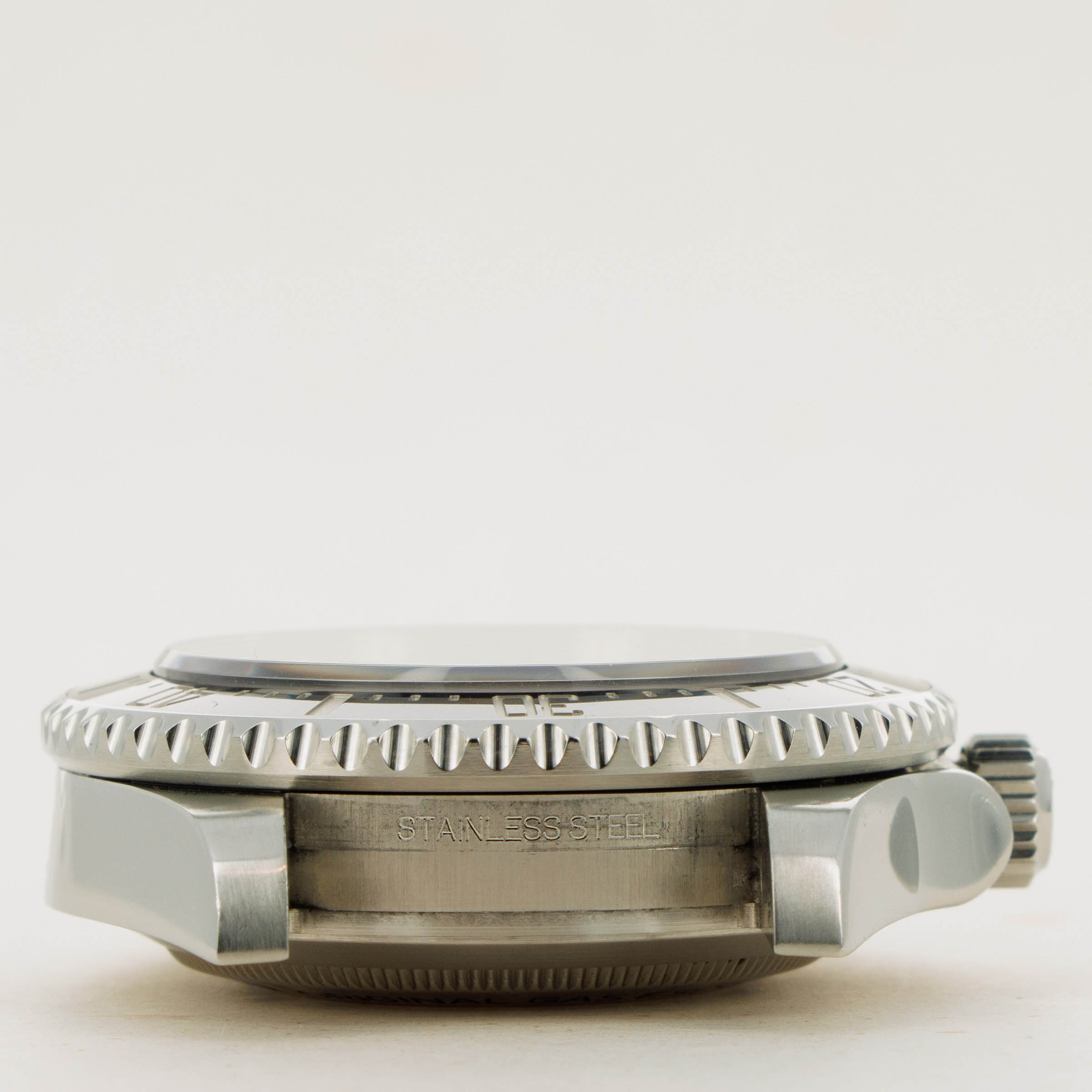 Featuring Rolex's traditional black dial and black Cerachrom bezel combo, the Sea-Dweller's most unique aspect is its lack of a cyclops lens.