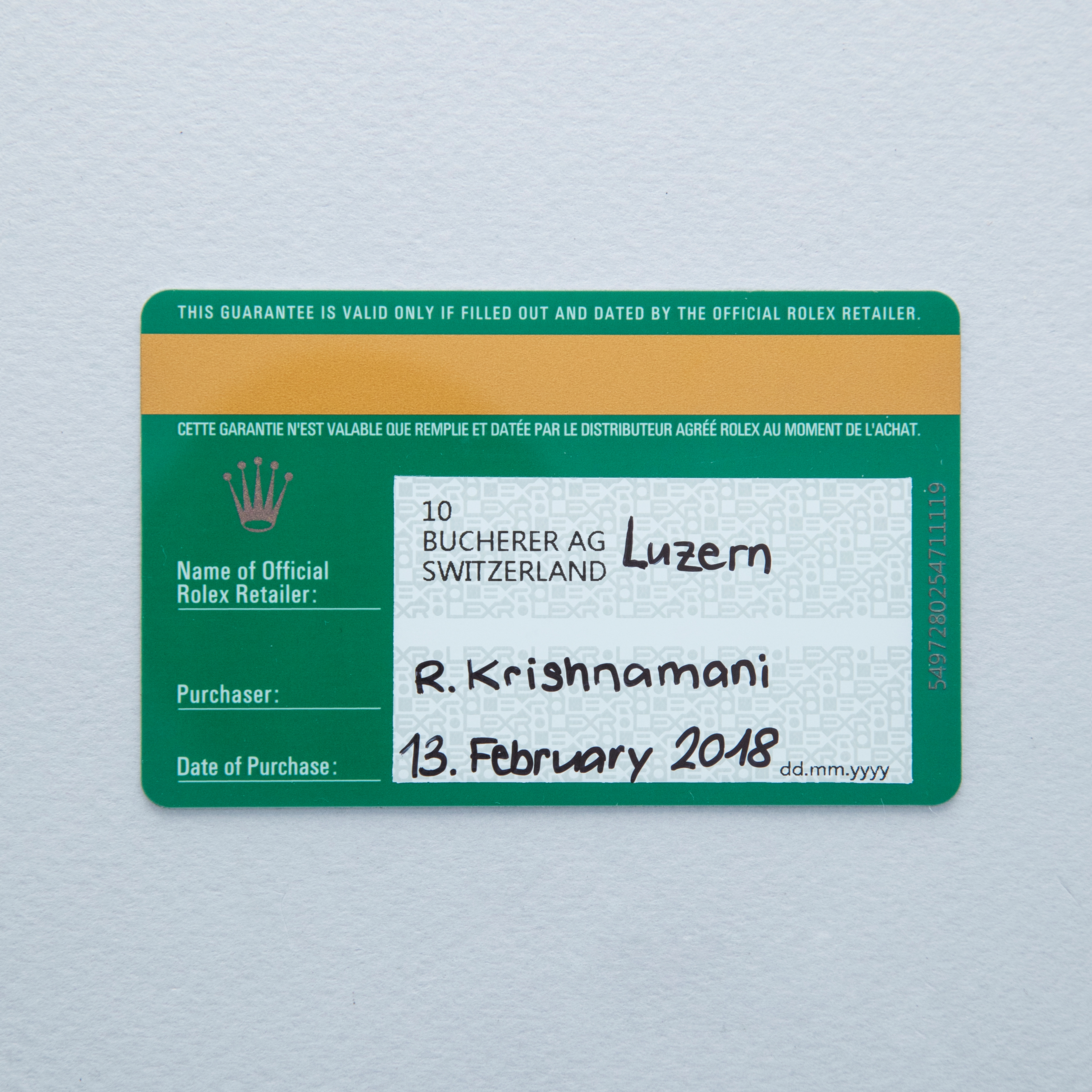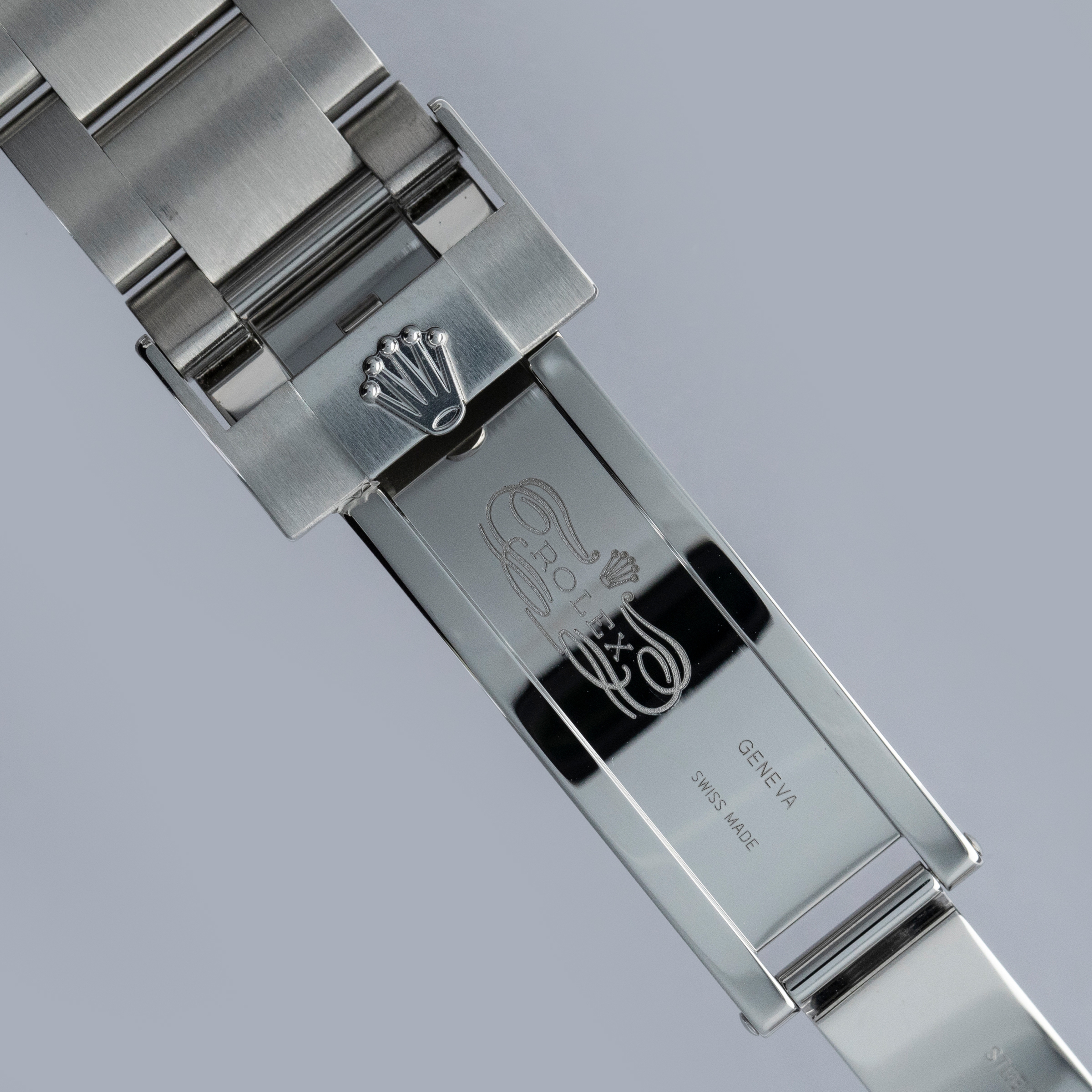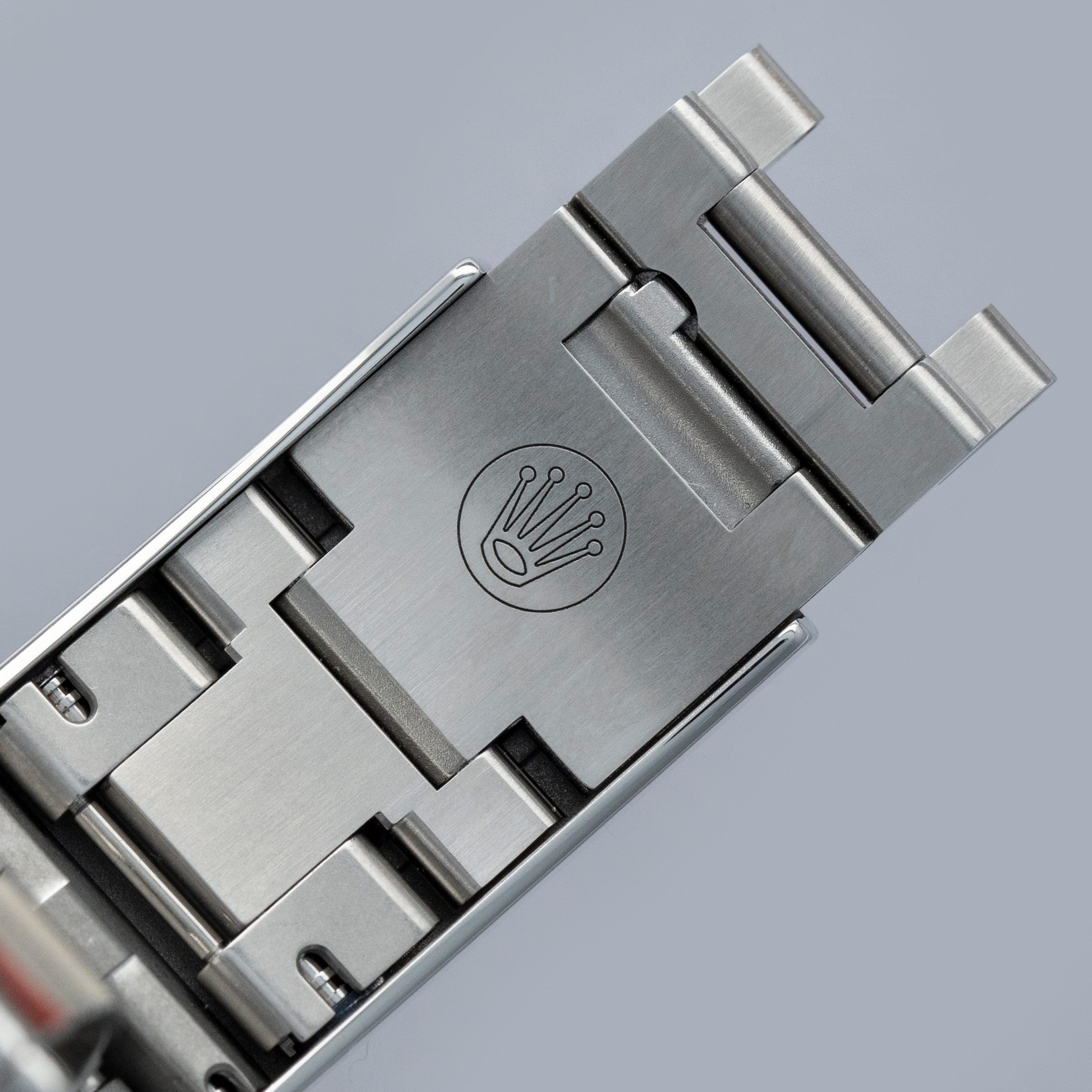Watch is in near-mint condition. The case has partial factory stickers in place. There are three light scratches on the case side on the lower lug, crown side, as well as minor marks near the rear of the lugs caused by the springbars. The case back sticker is still in place. The dial is perfect. The bracelet is like new and currently fits an 8" wrist and has 10 links, 3 of which are removable. Comes complete with box and papers and a Rolex pouch.