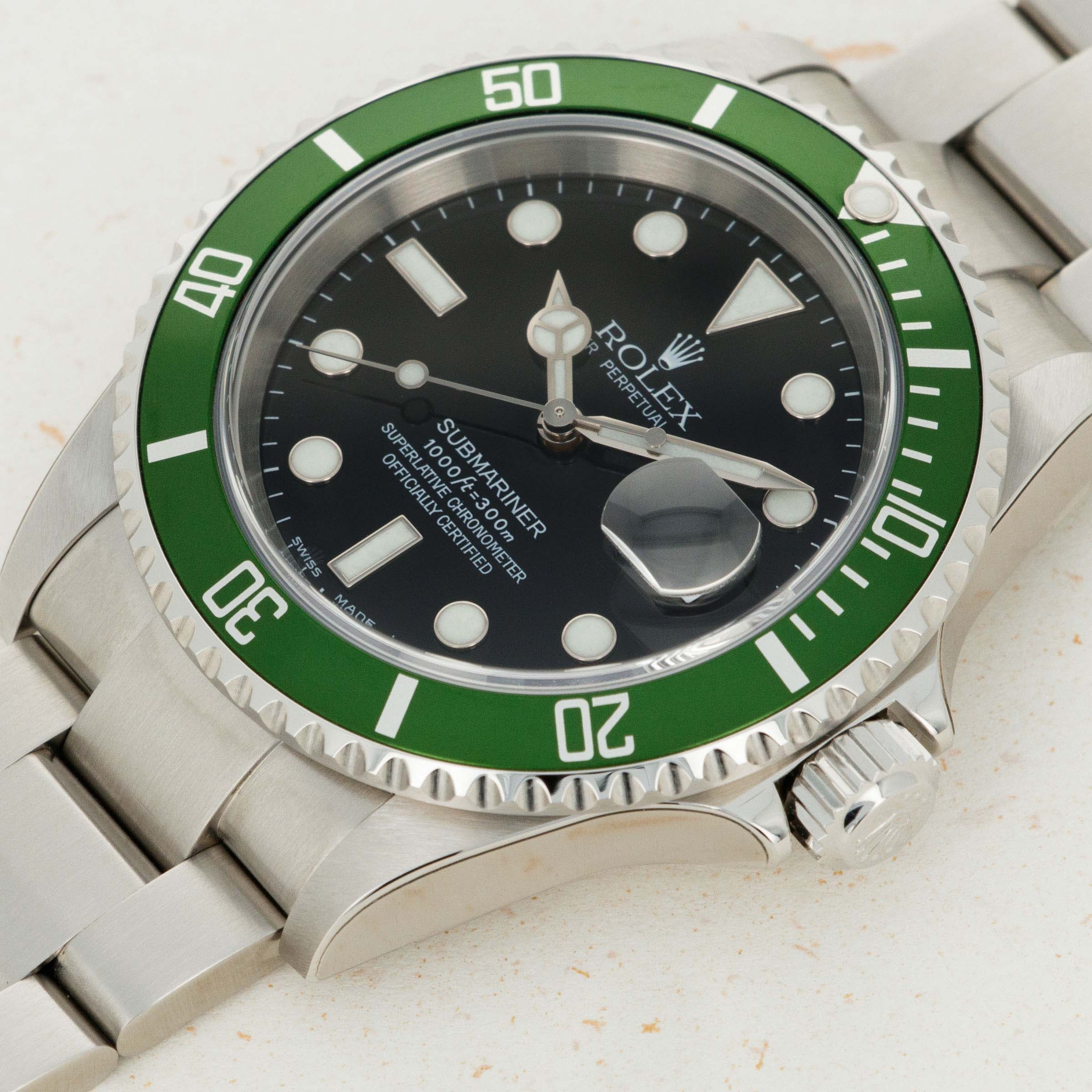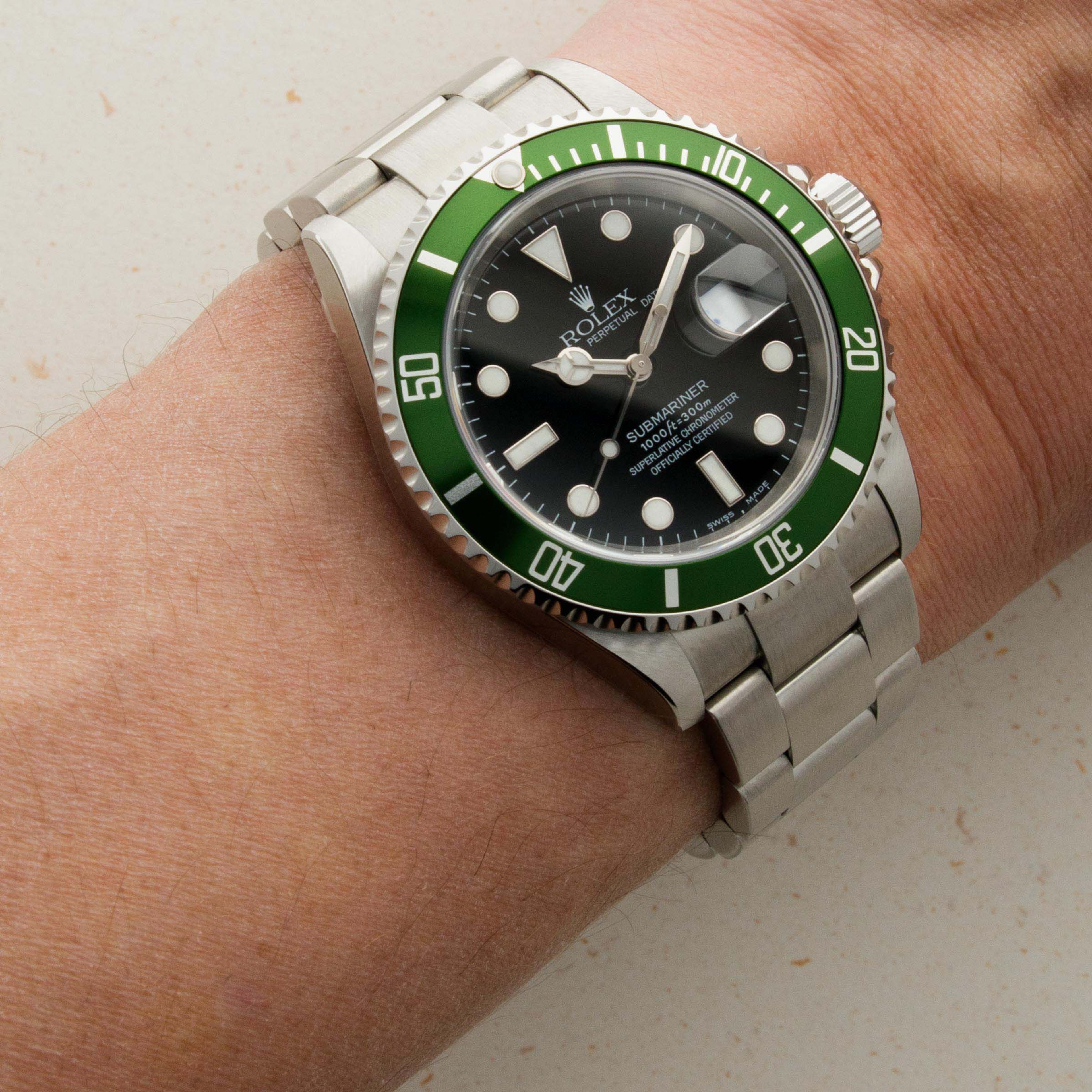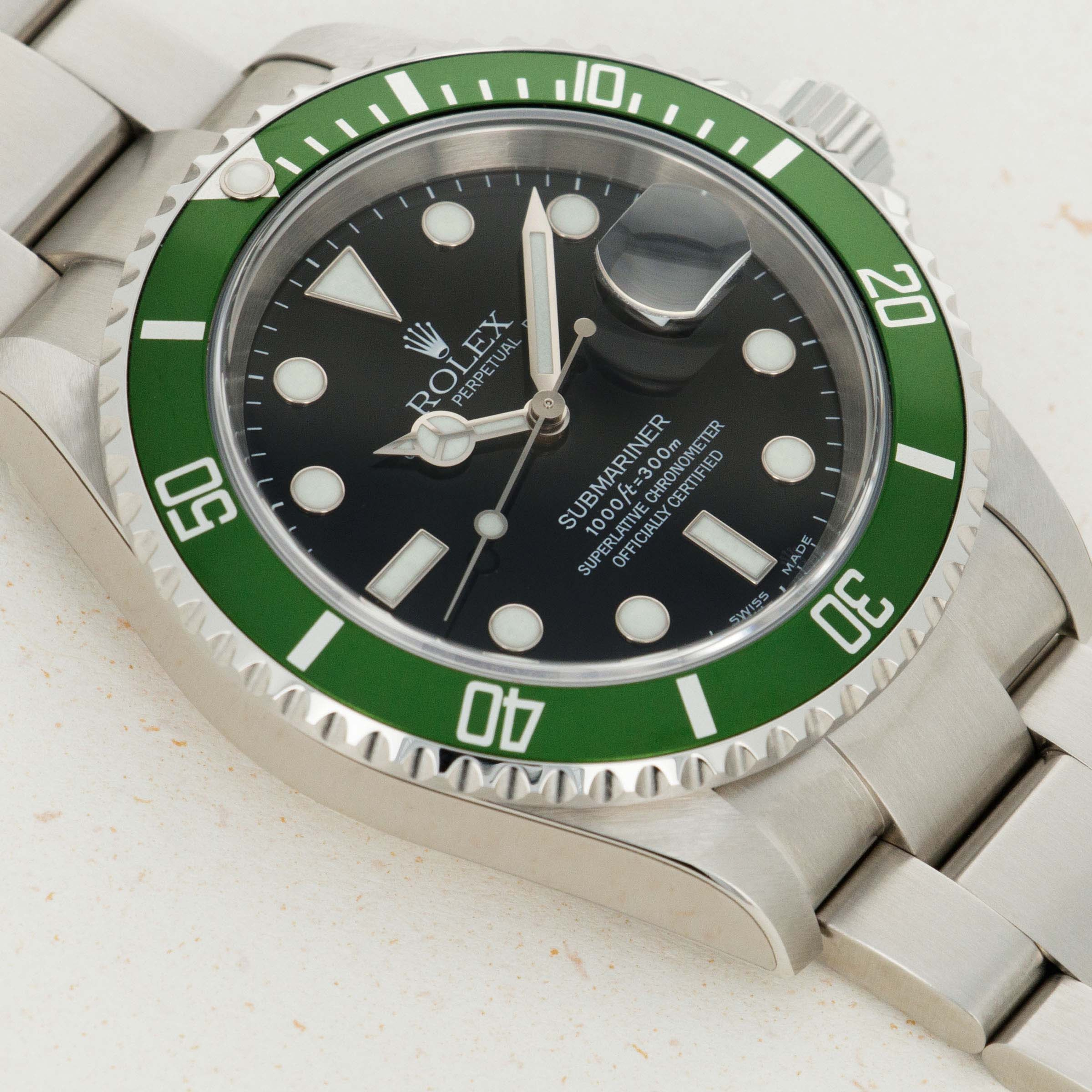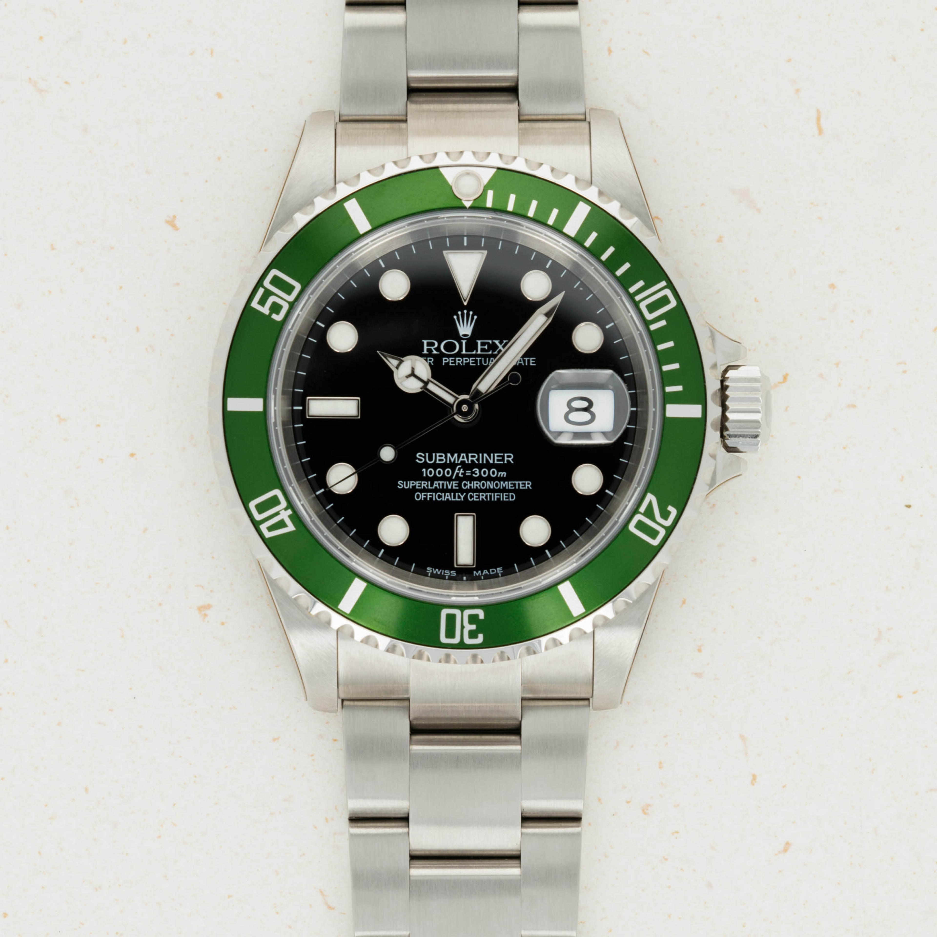 Released in 2003 as the Submariner's 50th-anniversary model, the Rolex Submariner ref. 16610LV "Kermit" is perhaps the most highly coveted 5-digit Submariner on the market. Like most Rolex models, the Kermit has some intricacies that set specific variants apart, much like the mark 1 "Flat Four" variant, so-called for the flat-four found in the '40' on its bezel. Produced for just a year before the four was changed to what remained until the model's discontinuation in 2010, the Mark 1 "Flat Four" is an exceedingly rare variant of the Kermit that is extensively sought-after by collectors. Rolex fitted the Kermit with a green anodized aluminum bezel (which is where the model's nickname comes from) to celebrate its anniversary status. This was also the first time Rolex would use a color other than black on a stainless-steel Sub. Featuring vintage aspects like hollow center links but modern elements too, like solid end links and maxi-plot hour markers, the Kermit is a transitional timepiece that, for many collectors, marks the end of Rolex's golden period and the beginning of their move into the modern watches we see today.