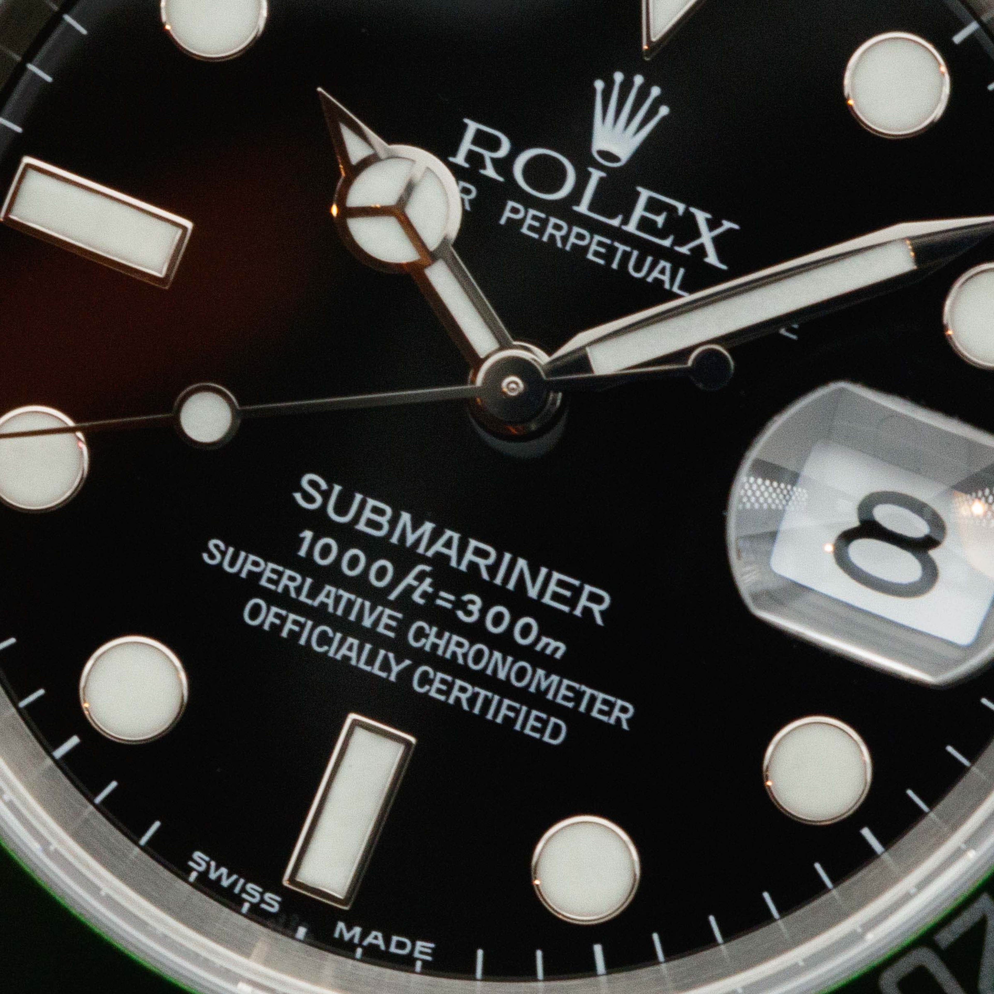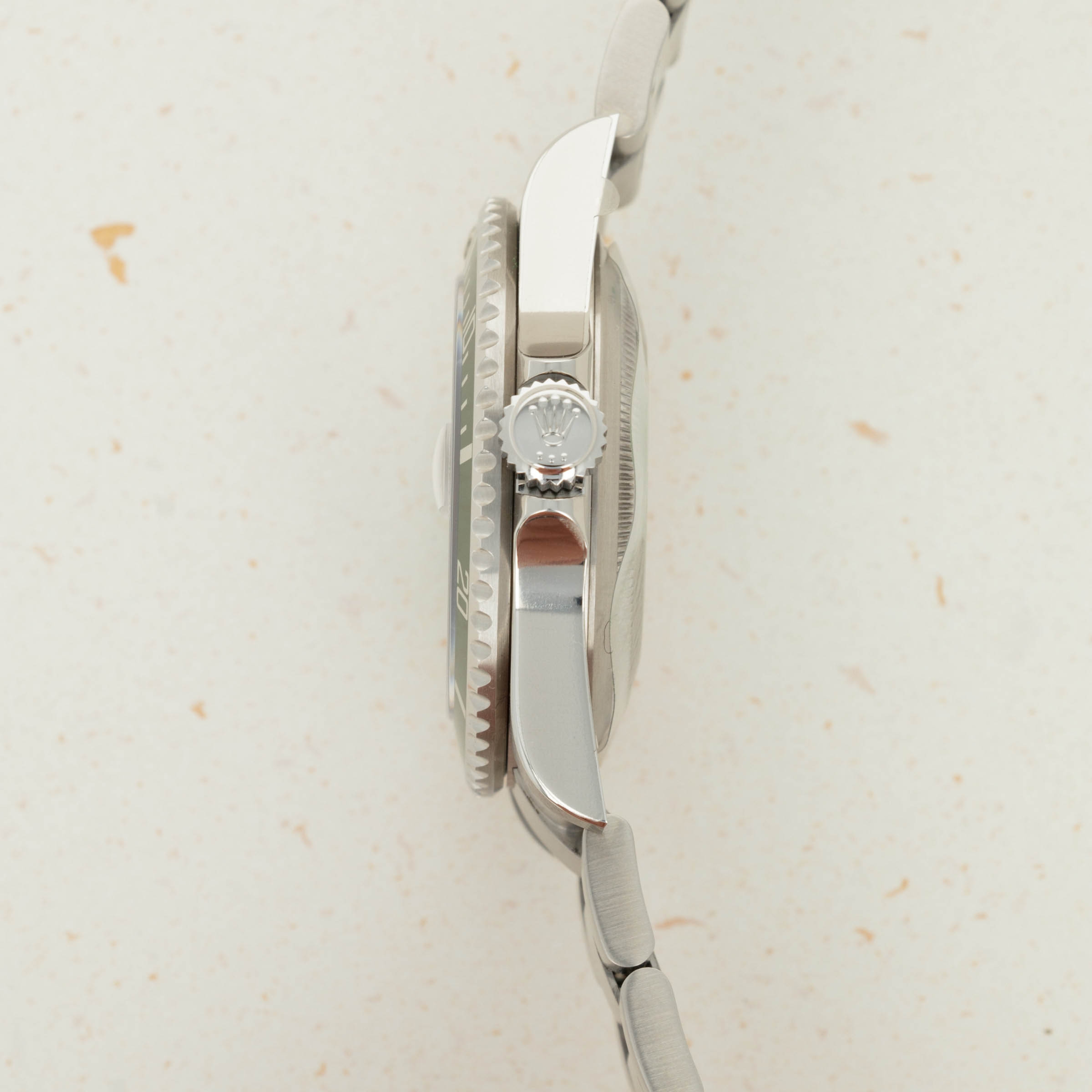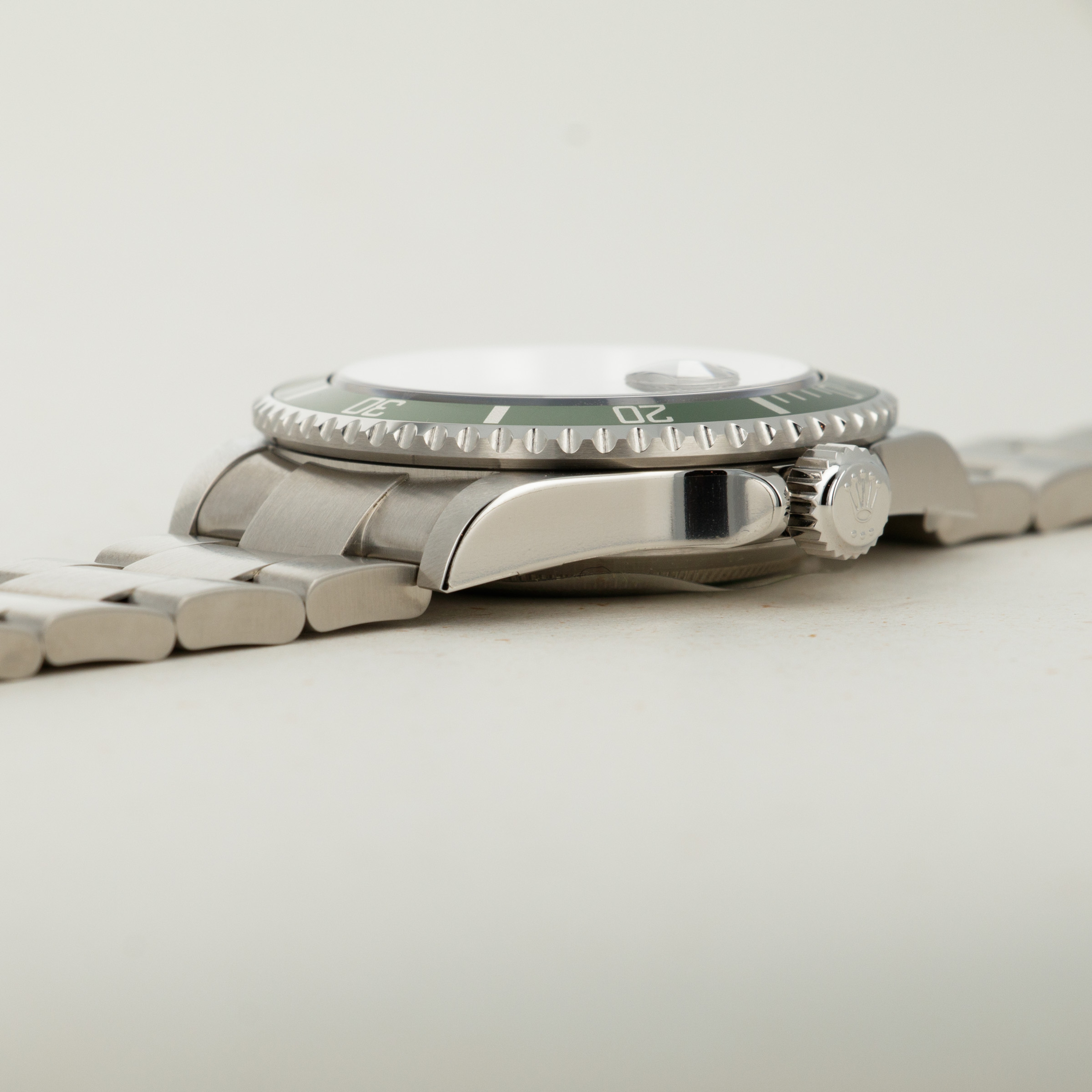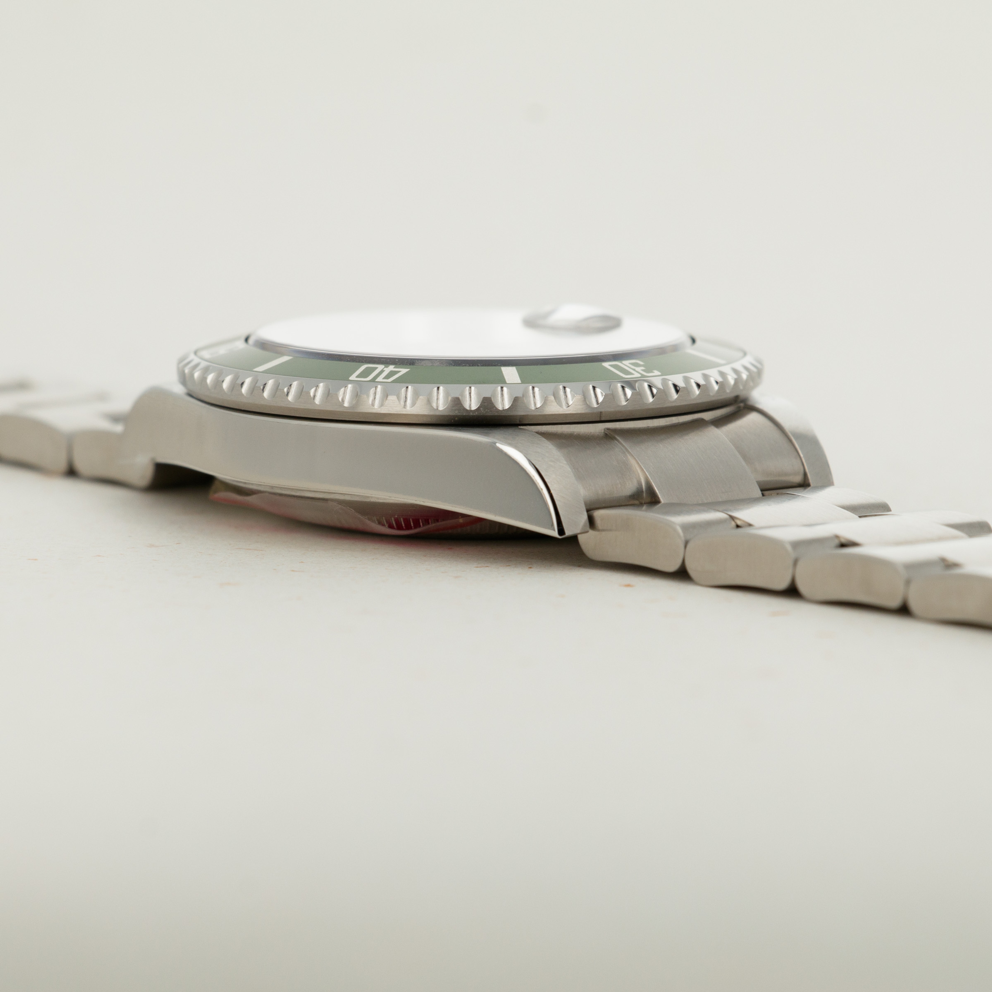 Released in 2003 as the Submariner's 50th-anniversary model, the Rolex Submariner ref. 16610LV "Kermit" is perhaps the most highly coveted 5-digit Submariner on the market. Like most Rolex models, the Kermit has some intricacies that set specific variants apart, much like the mark 1 "Flat Four" variant, so-called for the flat-four found in the '40' on its bezel. Produced for just a year before the four was changed to what remained until the model's discontinuation in 2010, the Mark 1 "Flat Four" is an exceedingly rare variant of the Kermit that is extensively sought-after by collectors. Rolex fitted the Kermit with a green anodized aluminum bezel (which is where the model's nickname comes from) to celebrate its anniversary status. This was also the first time Rolex would use a color other than black on a stainless-steel Sub. Featuring vintage aspects like hollow center links but modern elements too, like solid end links and maxi-plot hour markers, the Kermit is a transitional timepiece that, for many collectors, marks the end of Rolex's golden period and the beginning of their move into the modern watches we see today.
