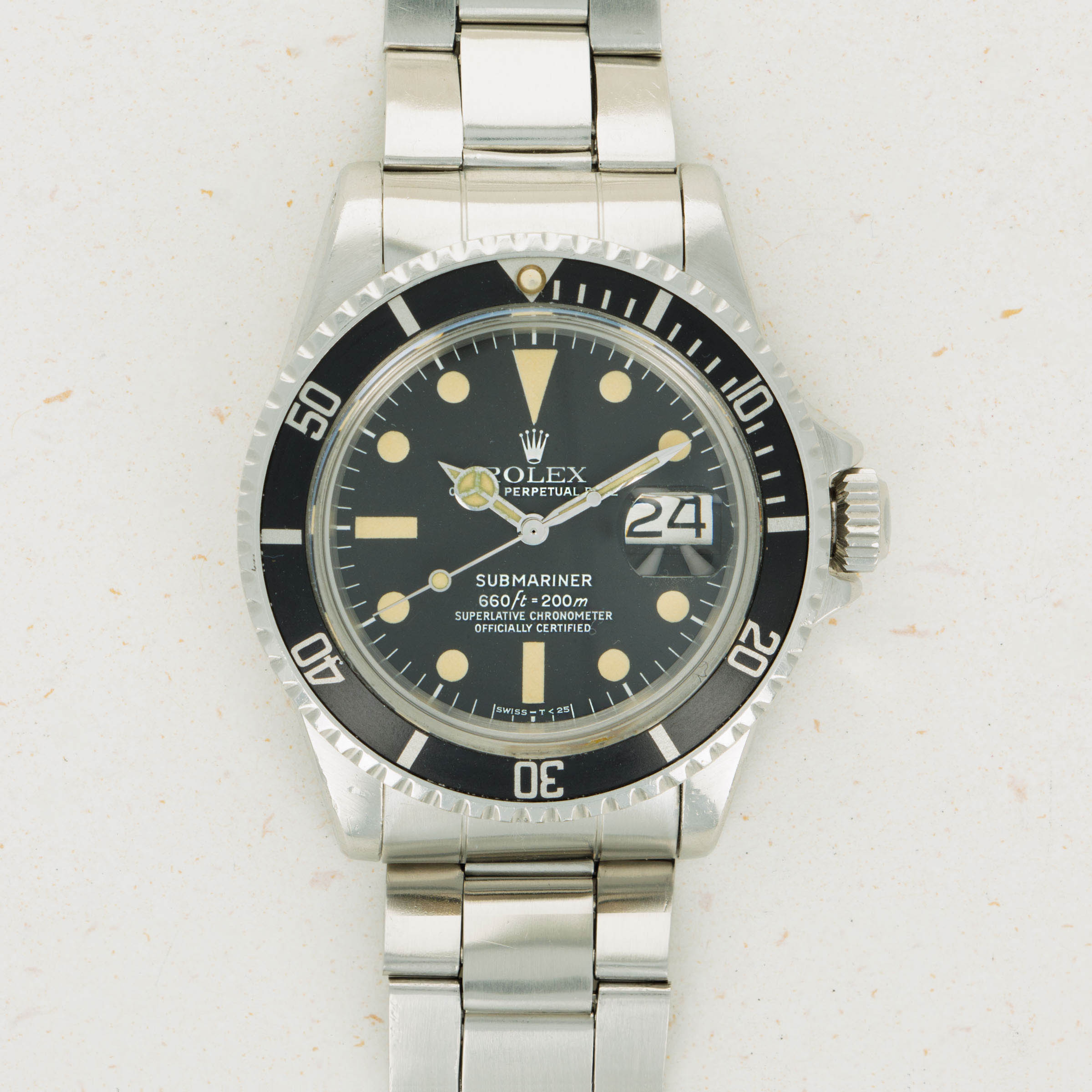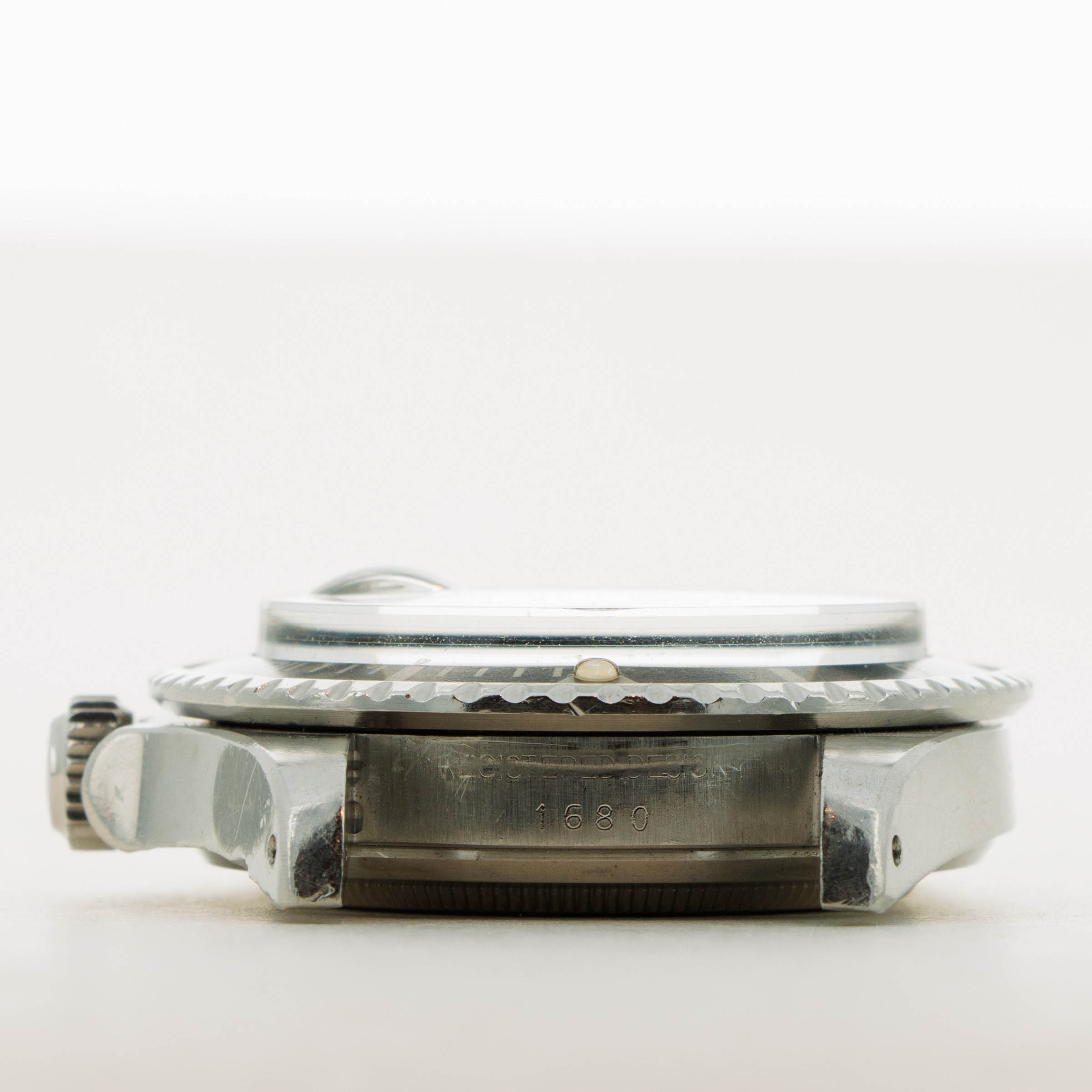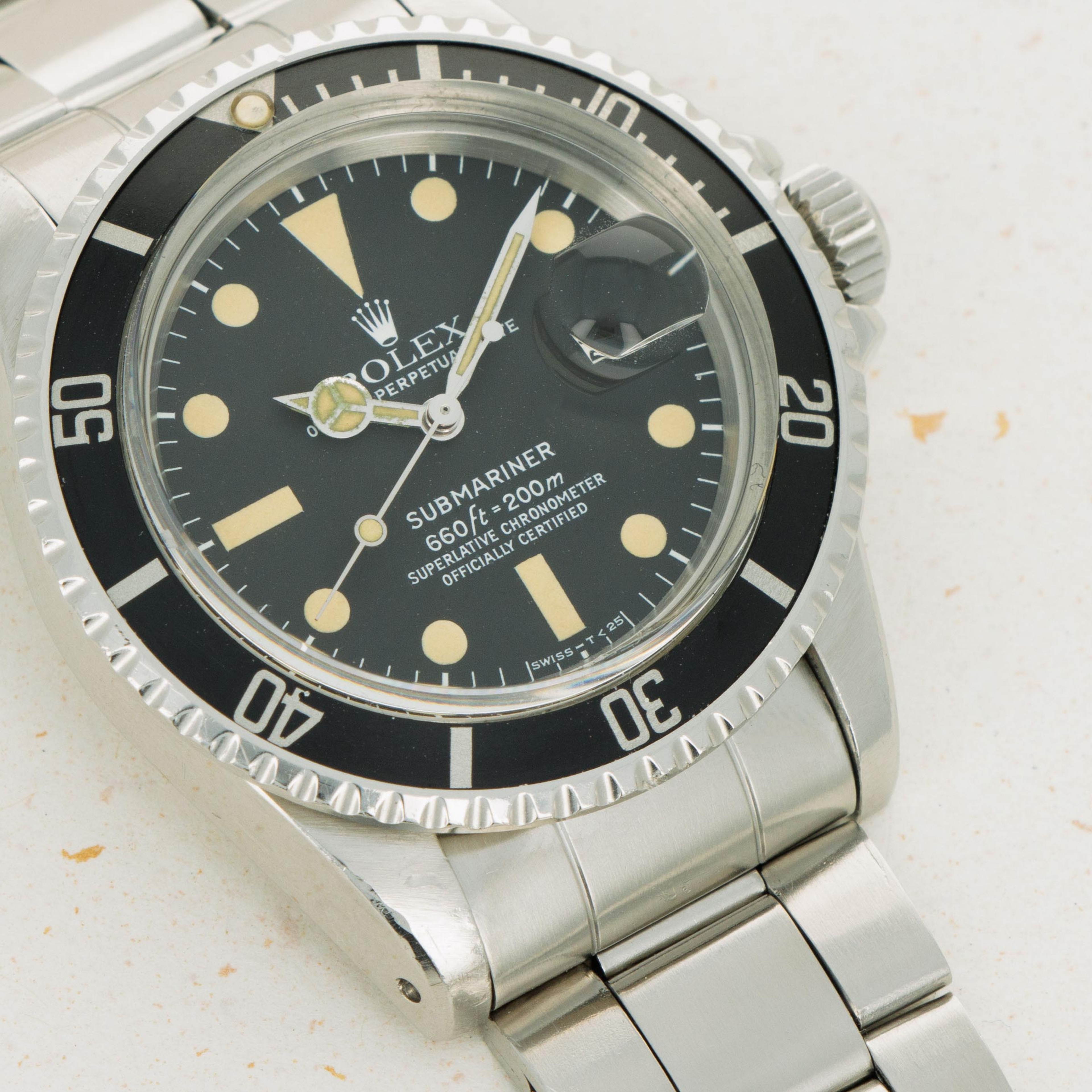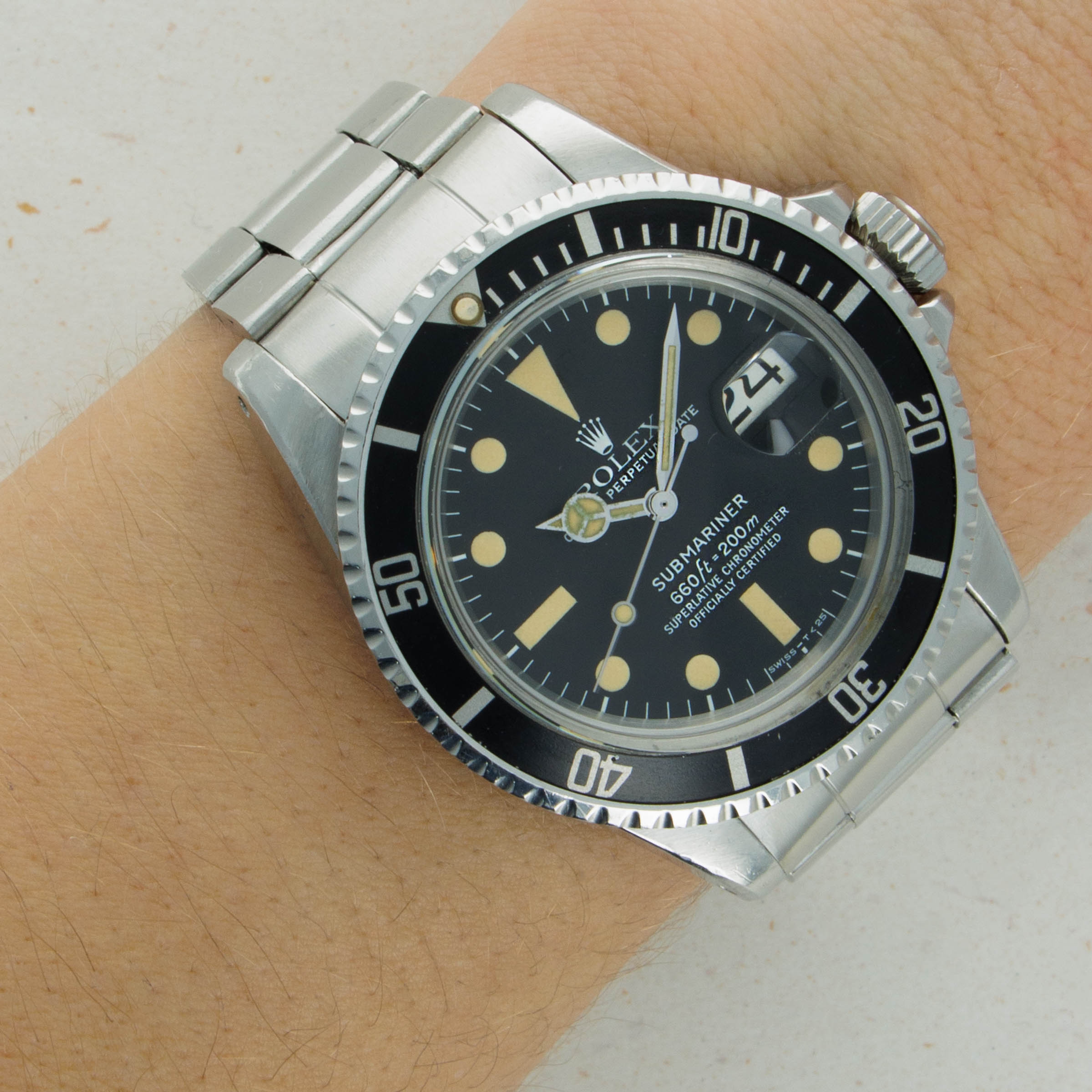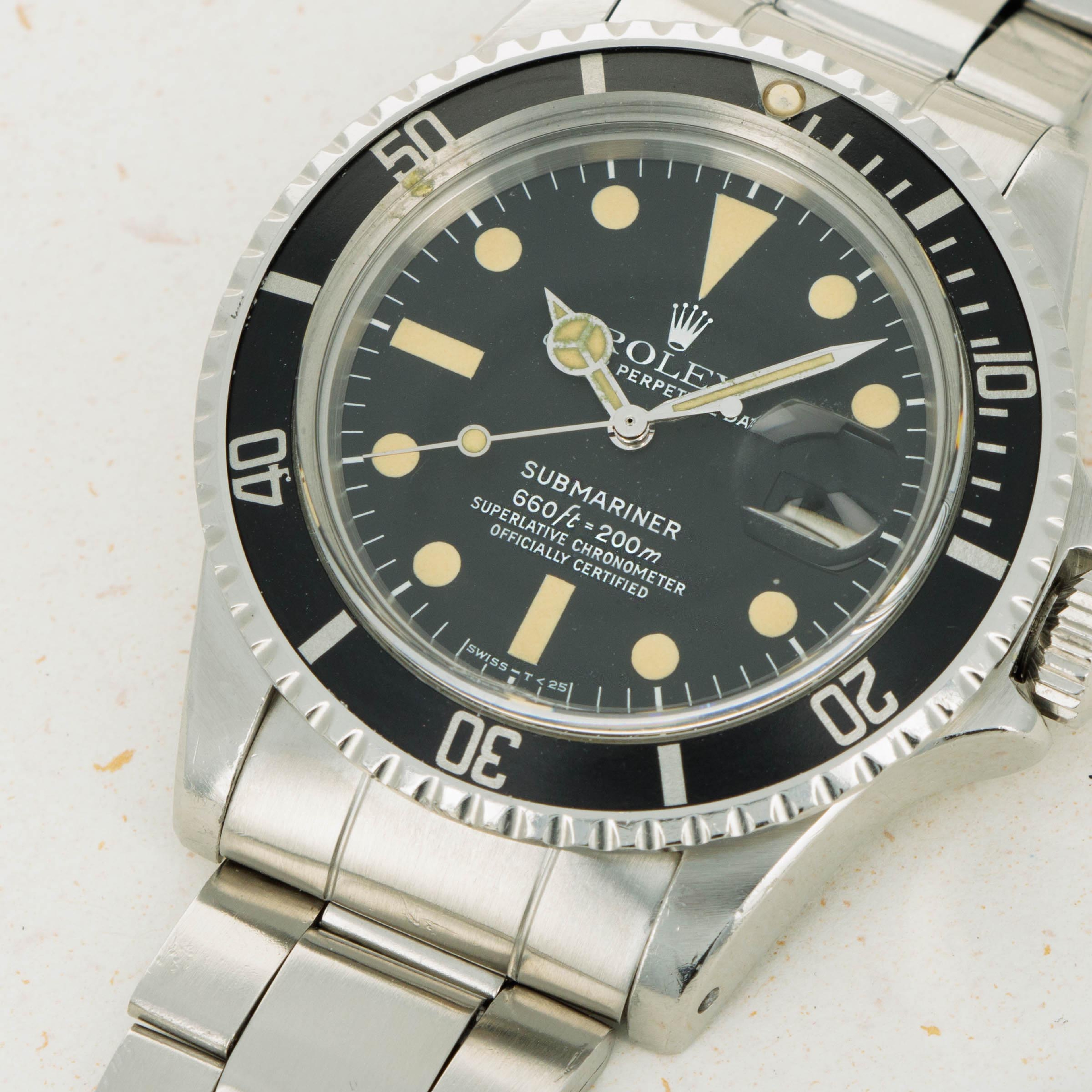 Presented with a stunning MkII ref. 1680 dial, this example's luminous indices and hands have a deep creamy patina consistent with its age that stands off its black dial and gives the watch a distinctly unique aesthetic.