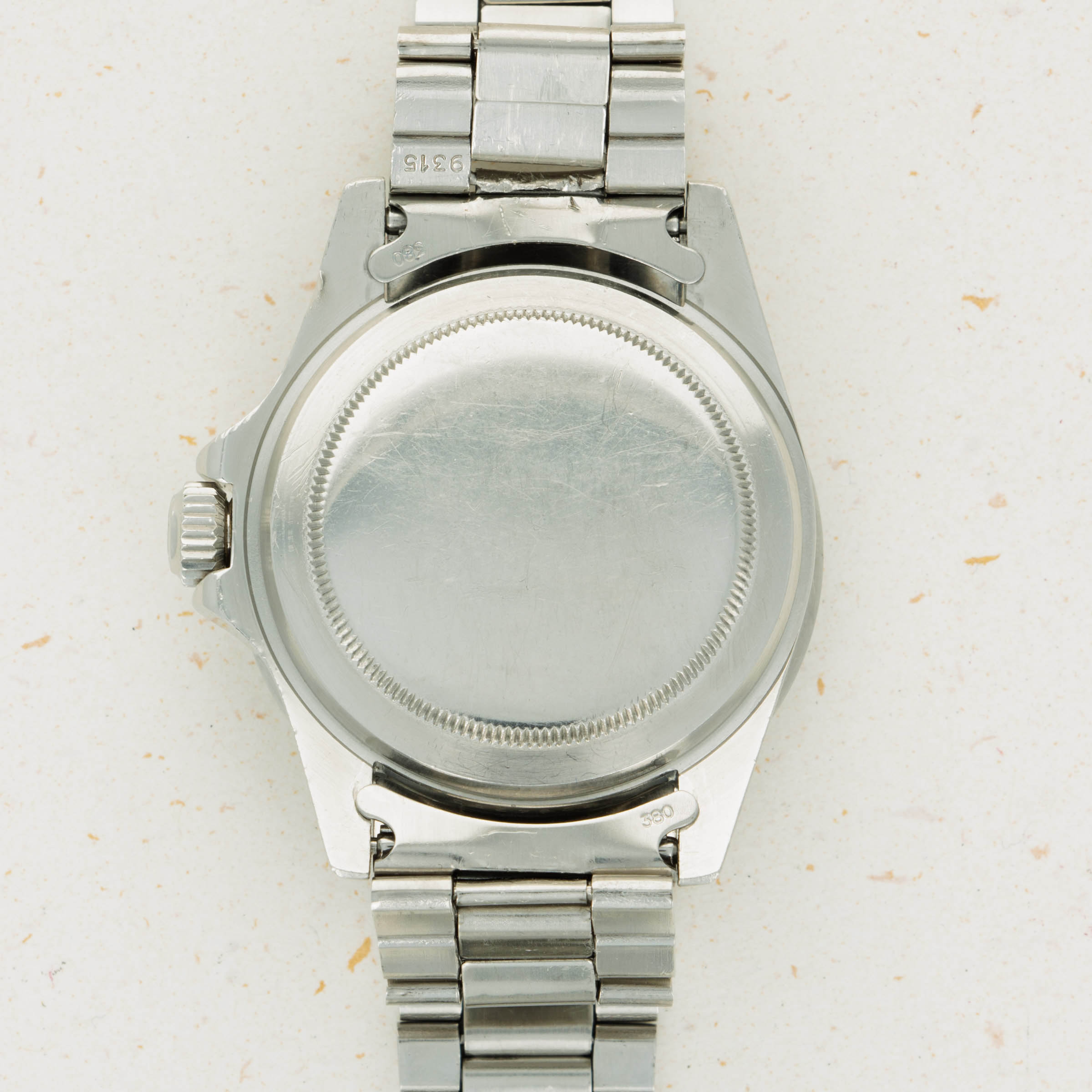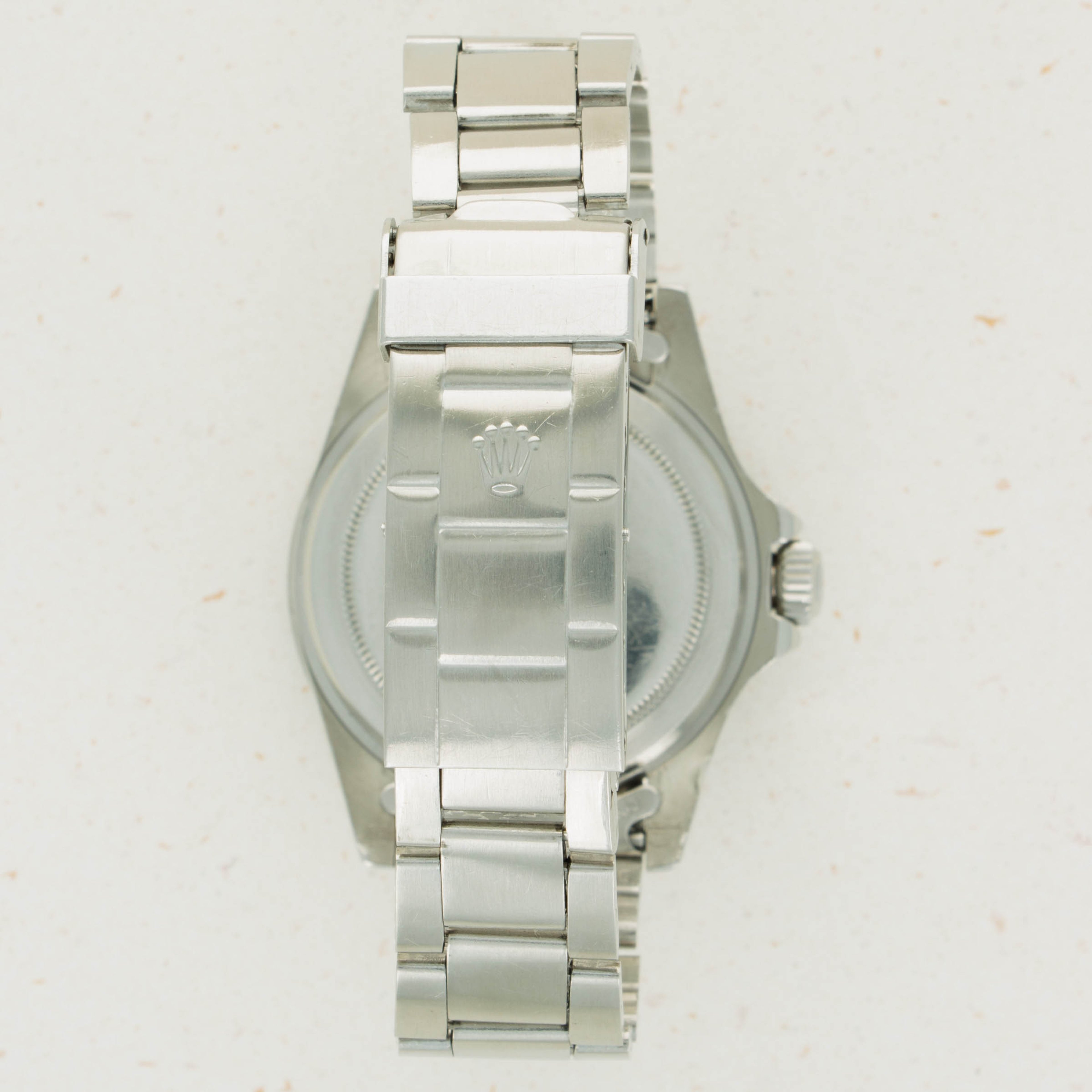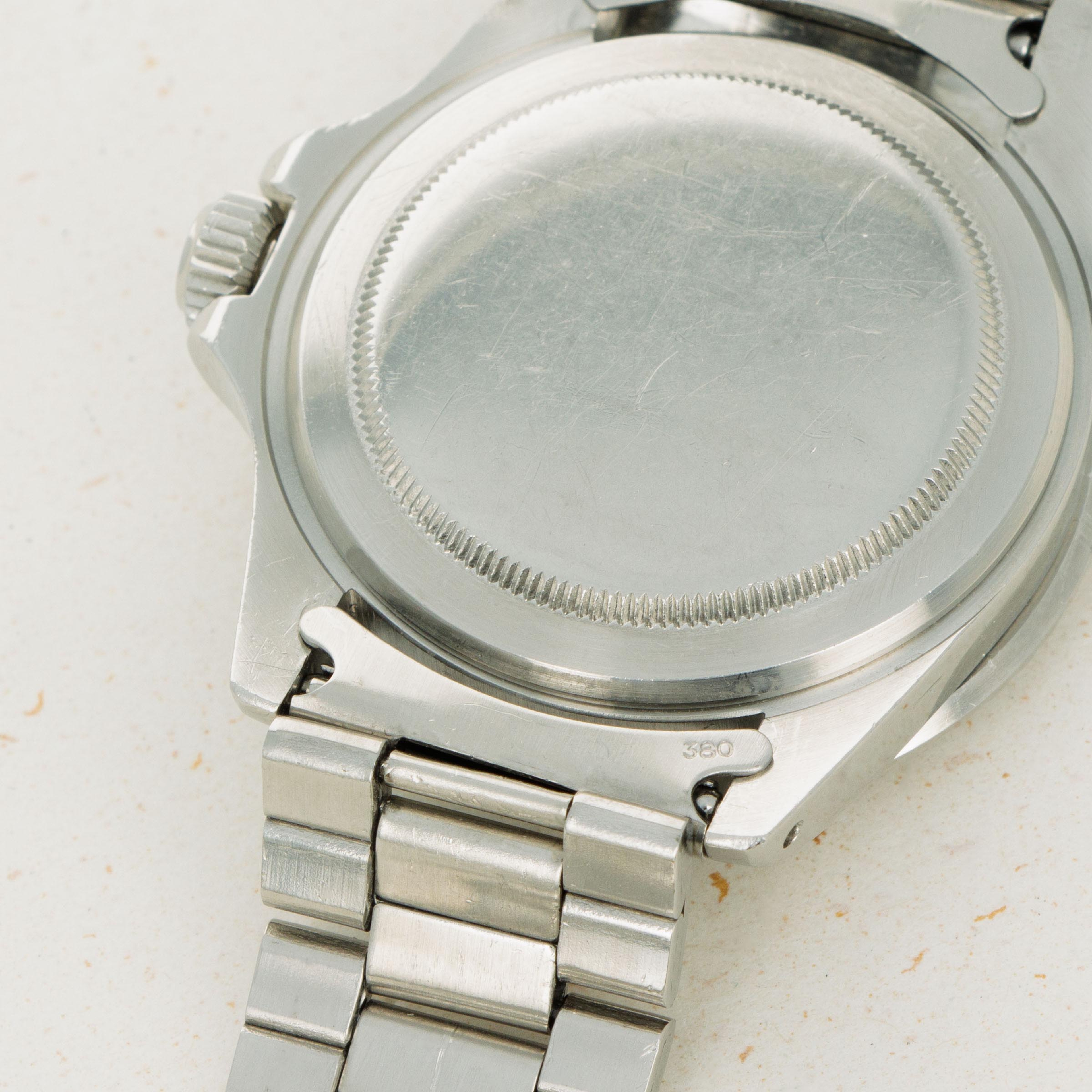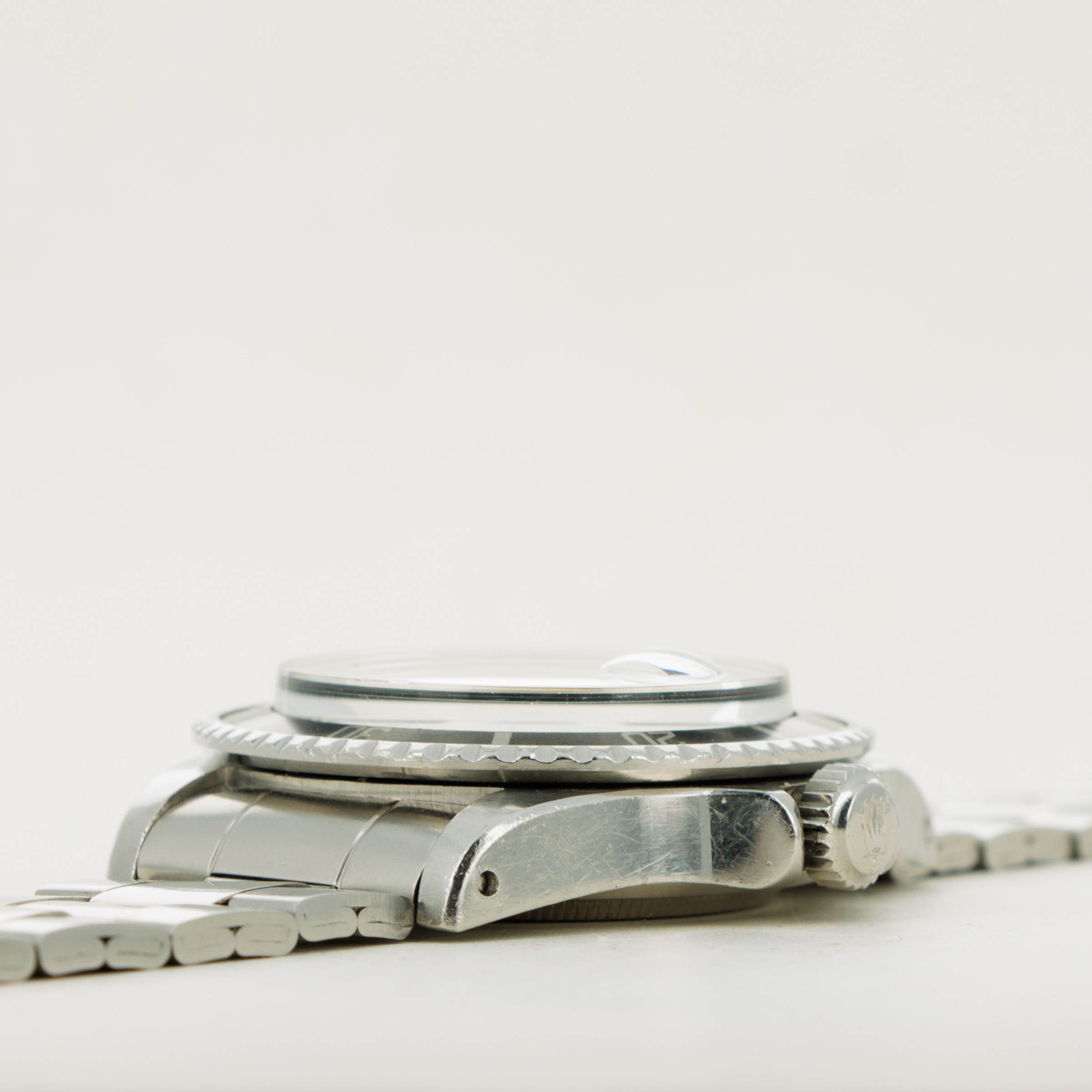 Watch is in excellent overall condition. Case exhibits sharp chamfered edges with some wear and scratches along the case. There is a ding noticeable on the upper right lug on its exterior edge. The bezel insert is lightly faded and has a pear that matches the tritium indexes of the dial and hands. Dial near mint with no wear visible to the naked eye. The hands have some oxidation and appear frosted. Folded link oyster bracelet has 12 links total with minimal stretch.