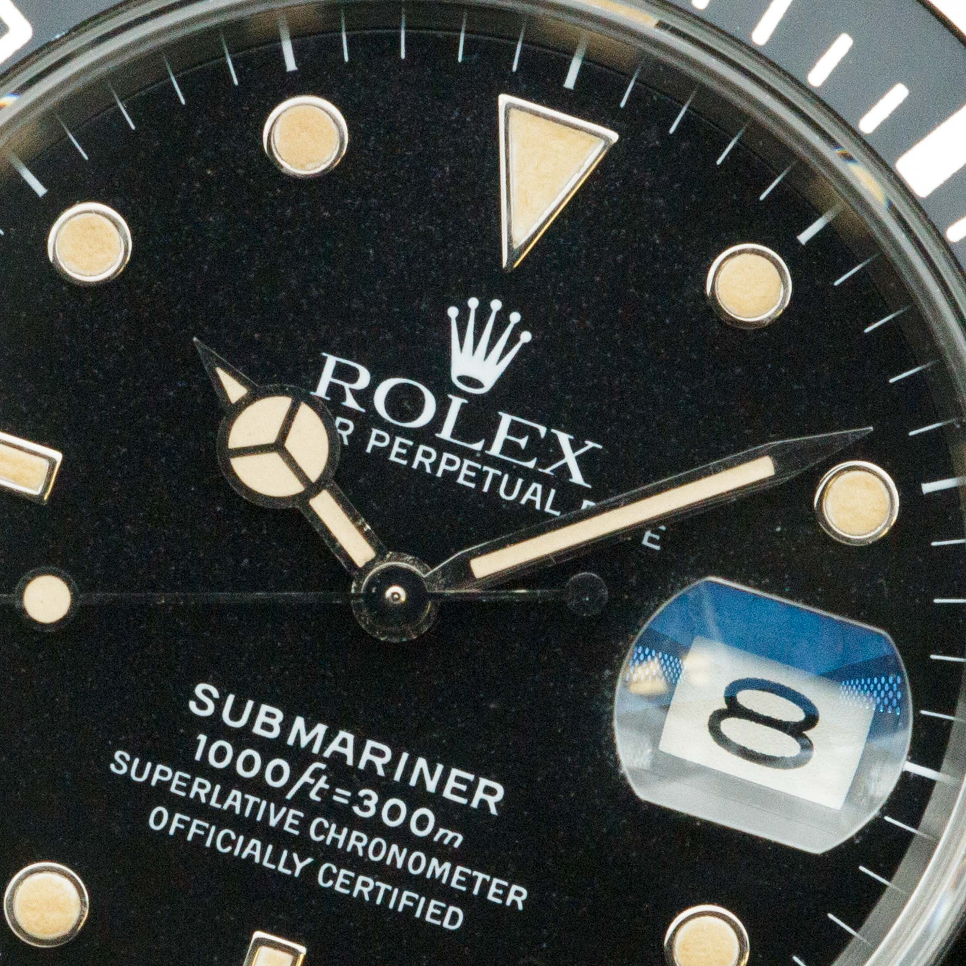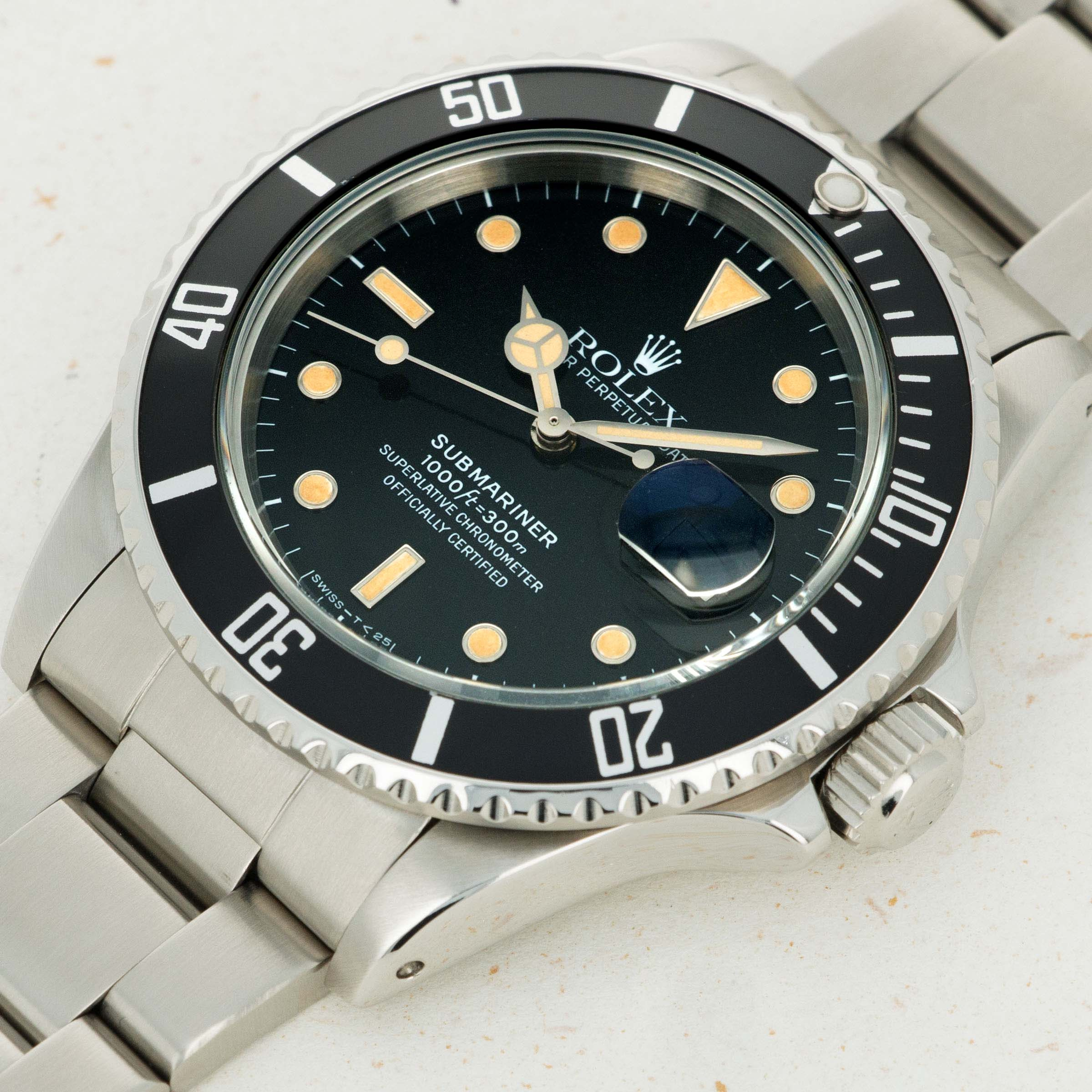 Fitted with the Submariner's iconic black dial, our example's hour markers' and hands' luminescent tritium has developed a beautiful soft yellow color that is rare to find in examples due to Rolex's tendency to swap original parts with service parts.