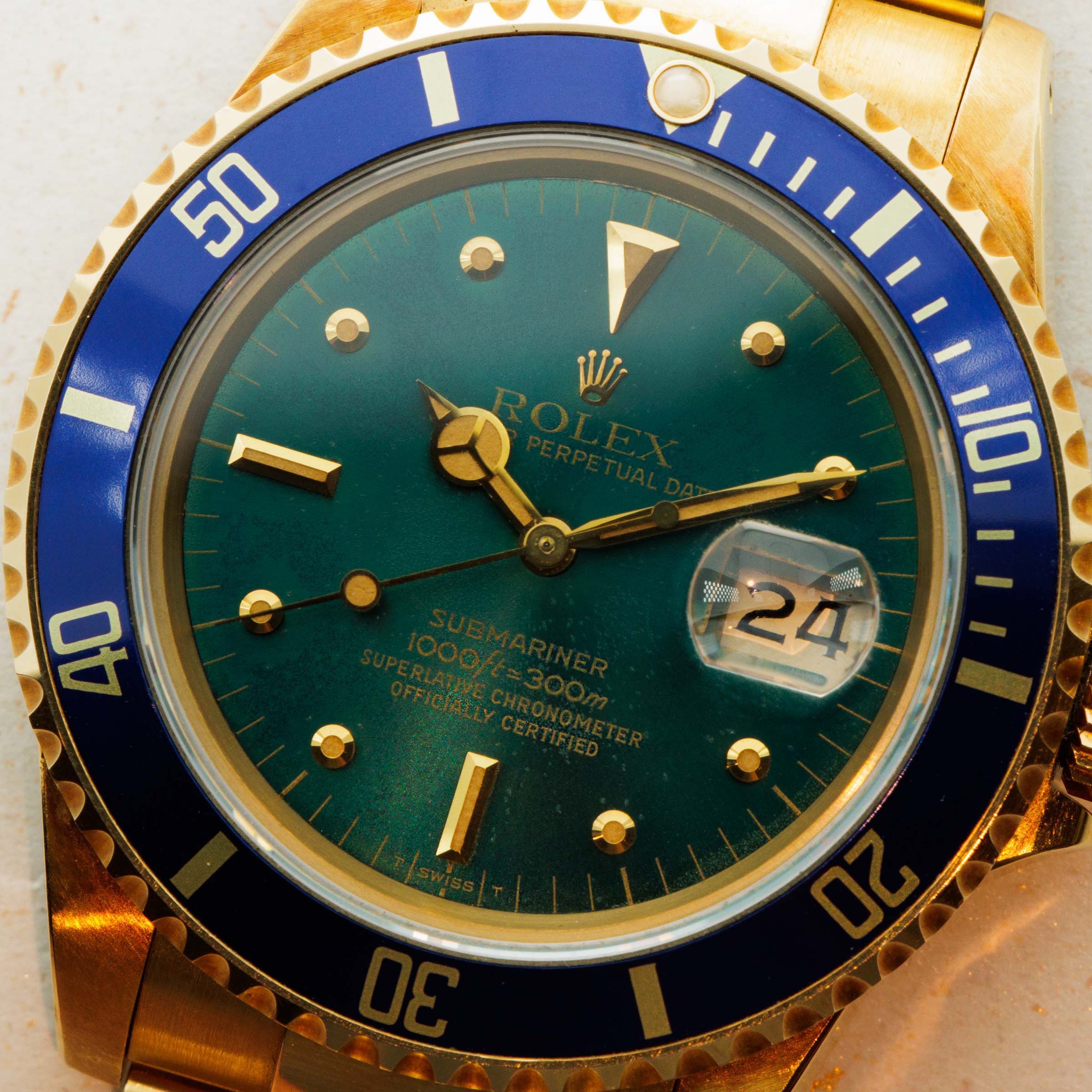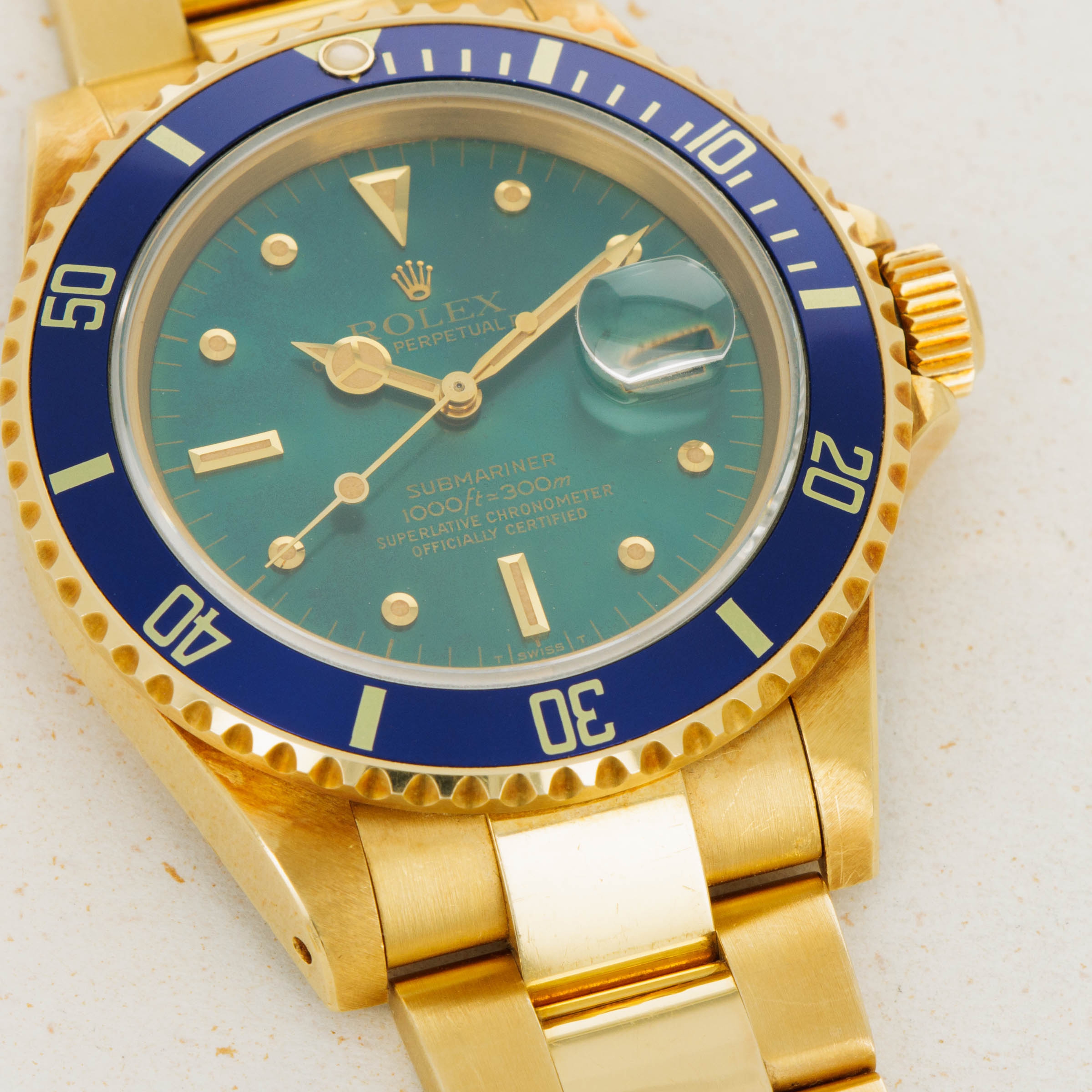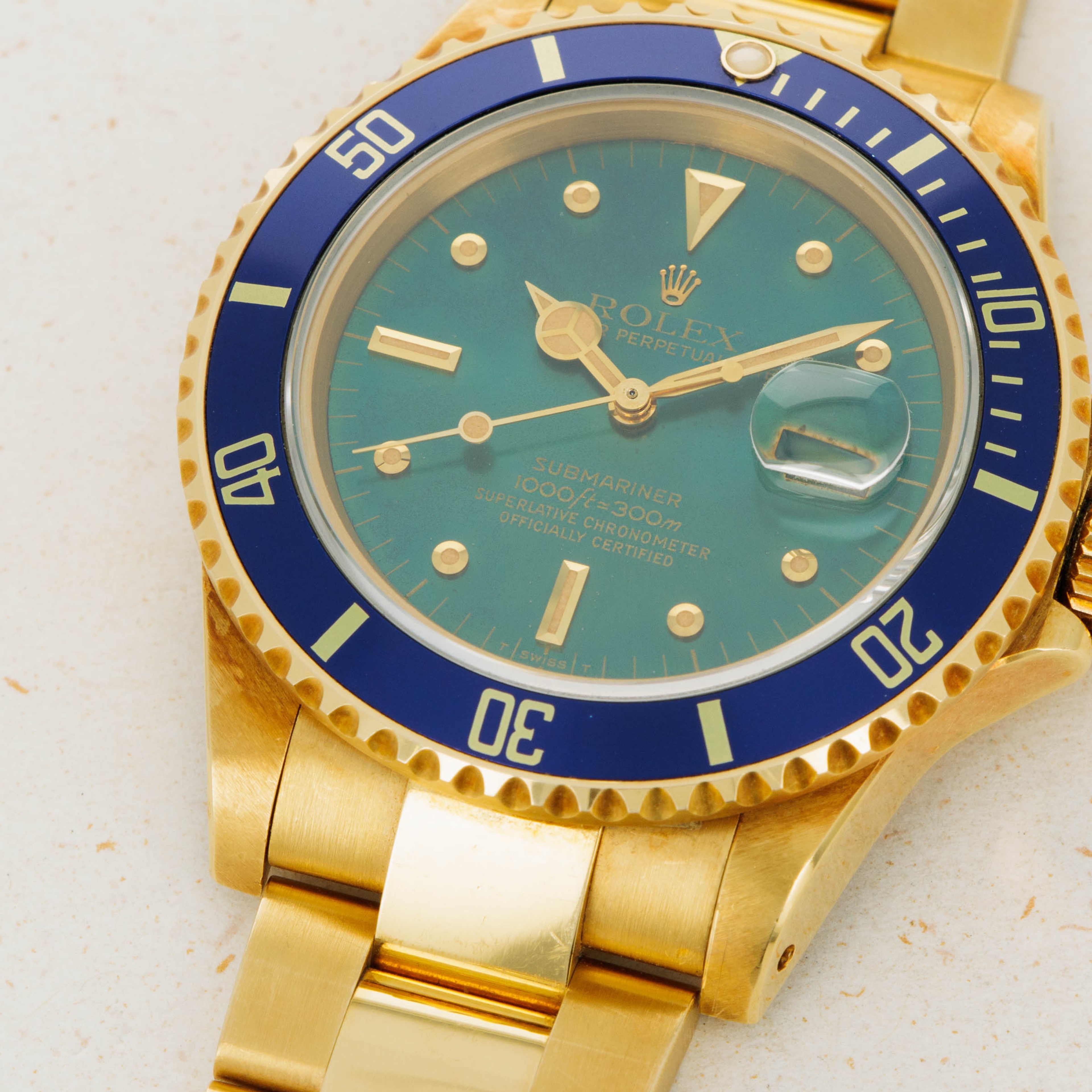With its 18kt yellow gold nipple hour markers, this ref. 16808's dial is already distinctive, but with the addition of its incredible blue-green tropical patina, this example's tropical dial makes this an intensely unique one-of-a-kind watch.