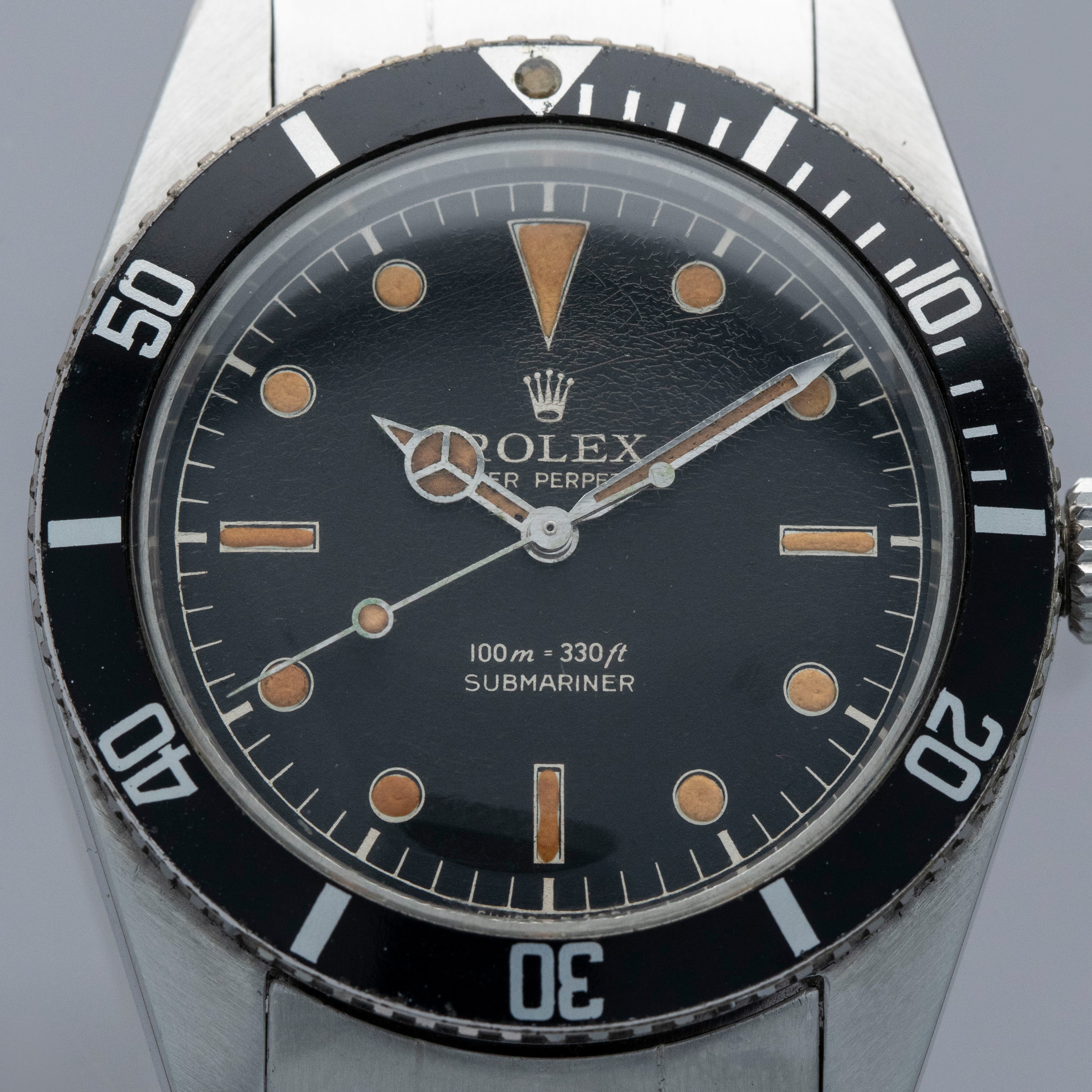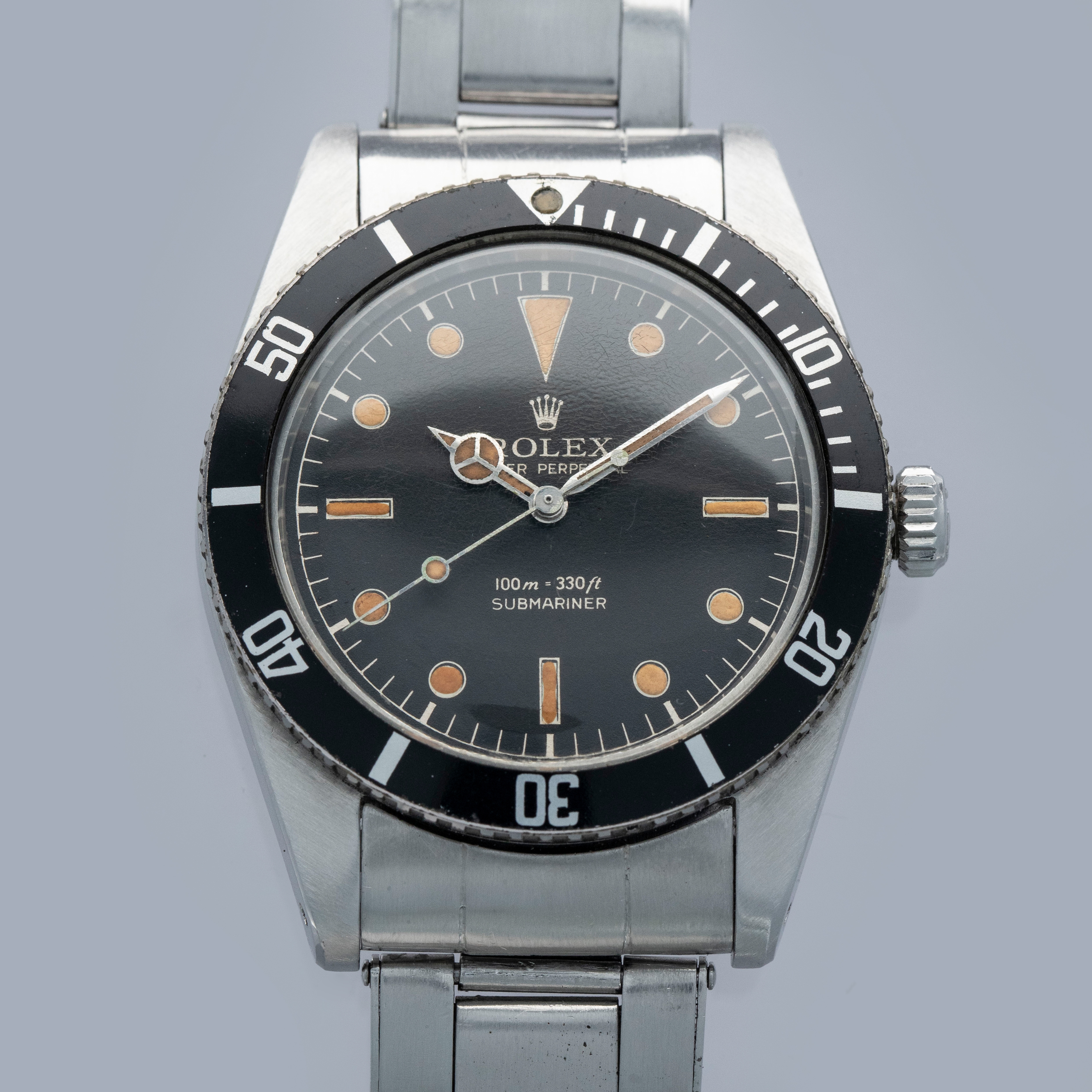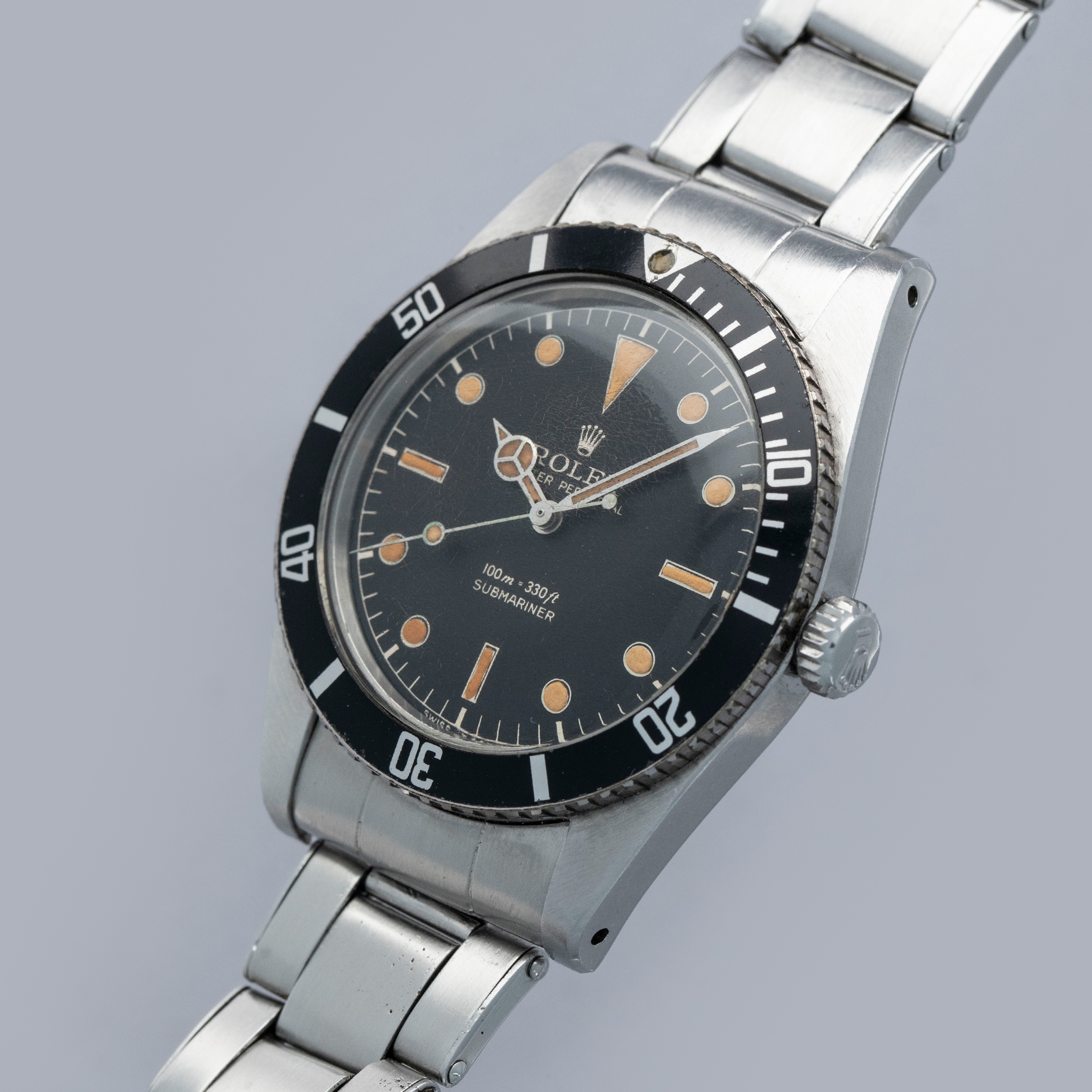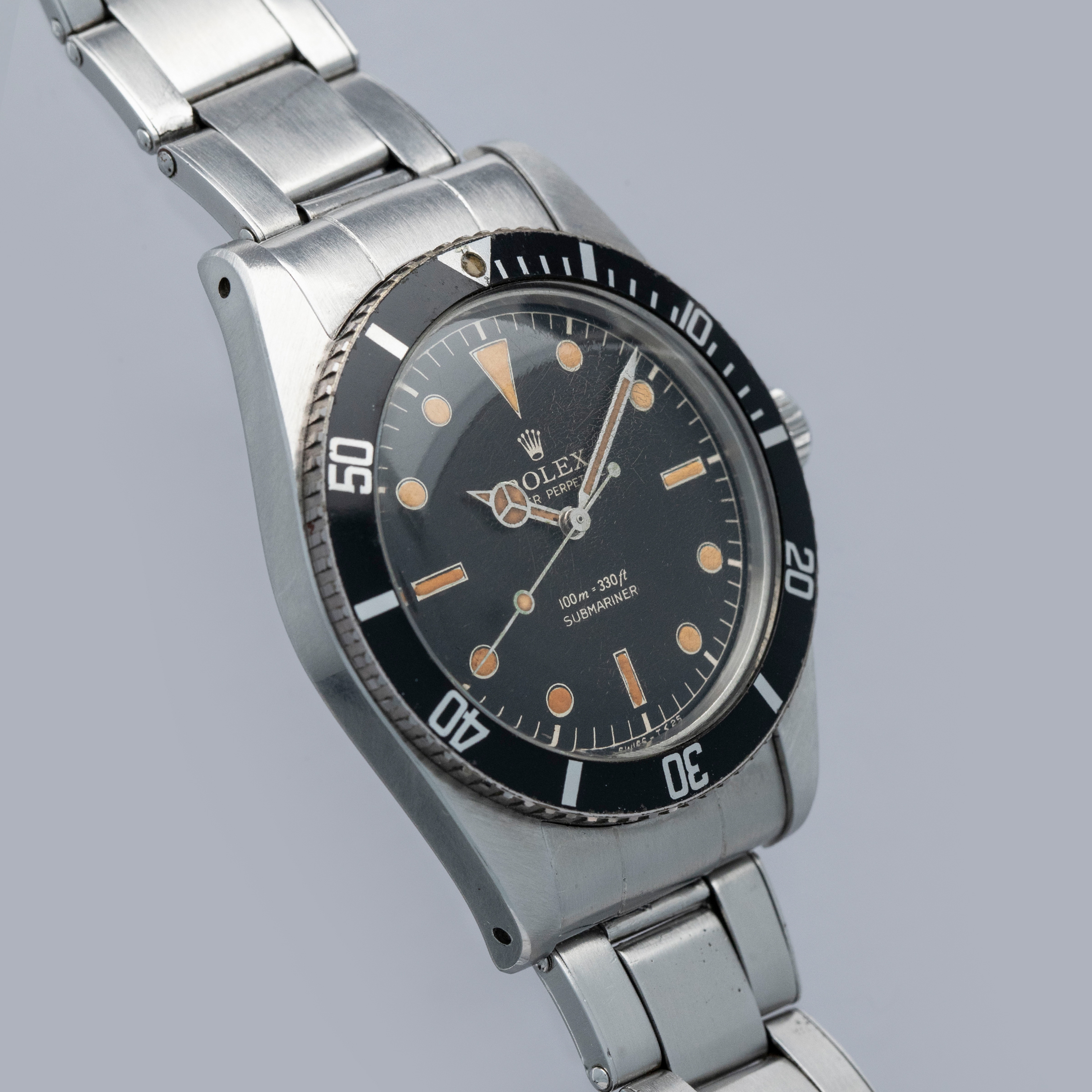 The watch is in overall excellent condition. The steel case remains well defined with light surface marks as expected of a watch of this vintage. The bezel is well defined, and the later black insert is very clean with a tight crack visible in the "triangle". The SWISS T 25 dial shows light surface aging, with luminous that has aged to a pleasing dark tone. The tone of luminous is slightly darker in the lower left quadrant. Hands have a luminous shade similar in tone with some cracks and discolorations. The Swiss rivet bracelet has been repaired at some point and the clasp comes from a later Jubilee bracelet. The bracelet has 10 links and fits an approximately 6 3/4” wrist. It shows light stretch.