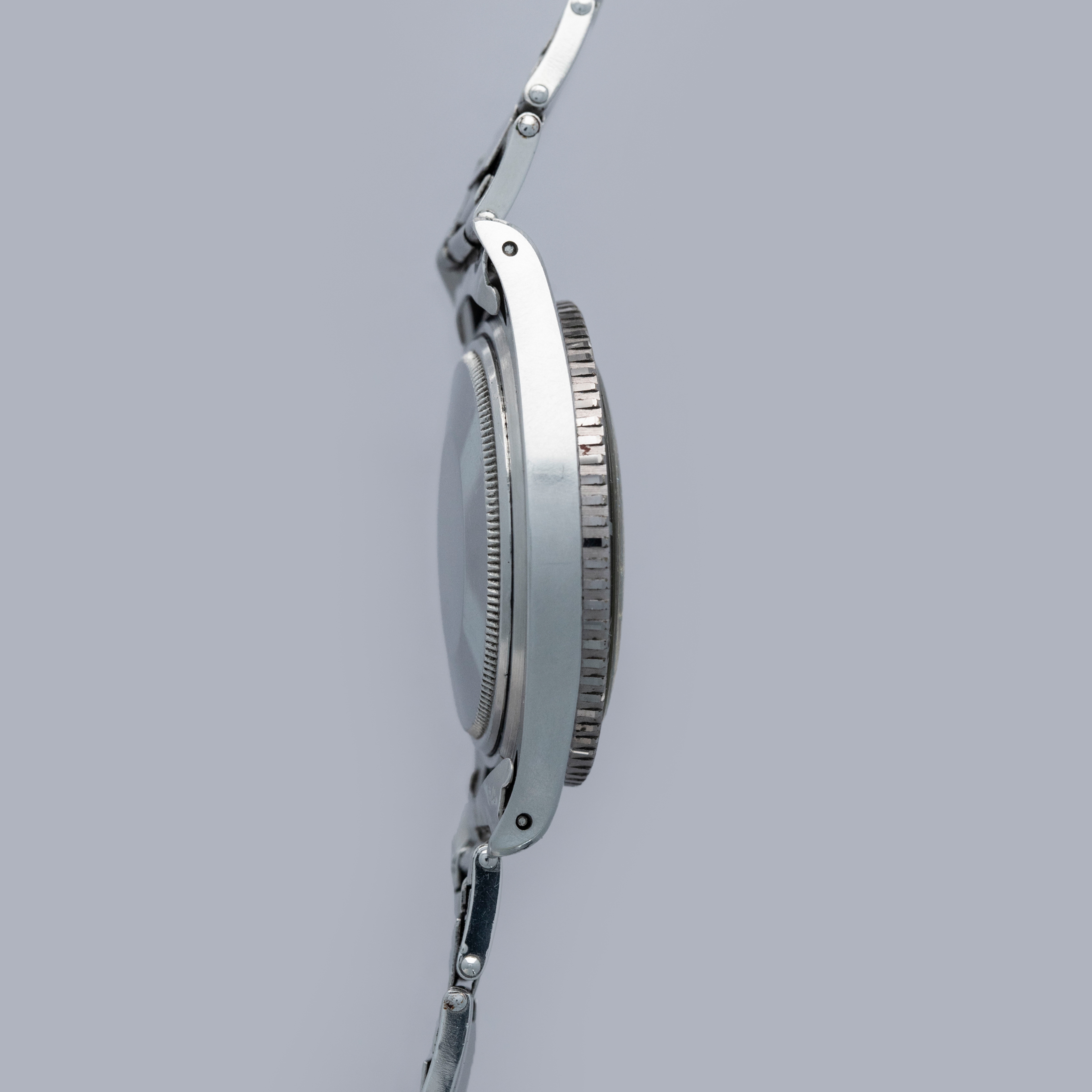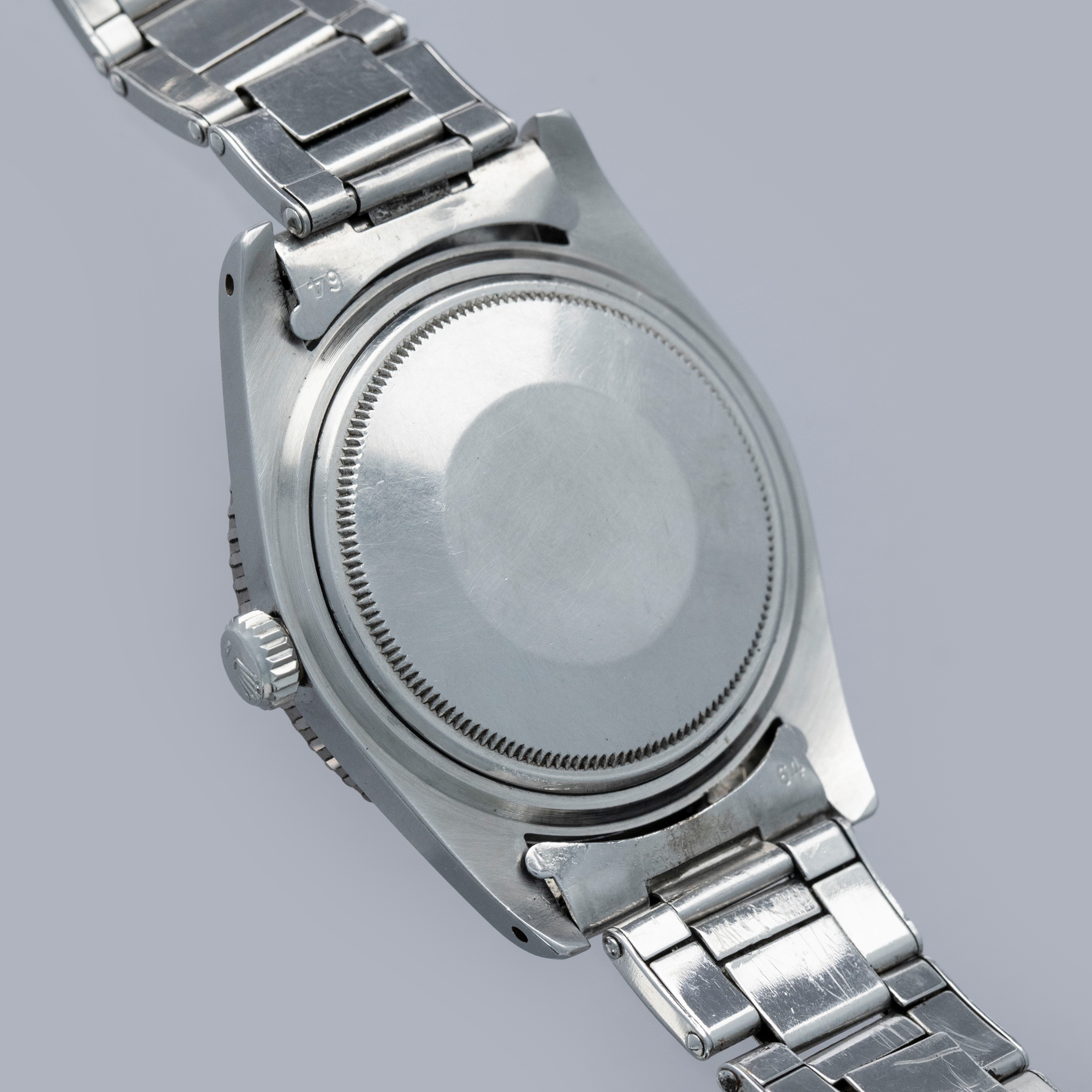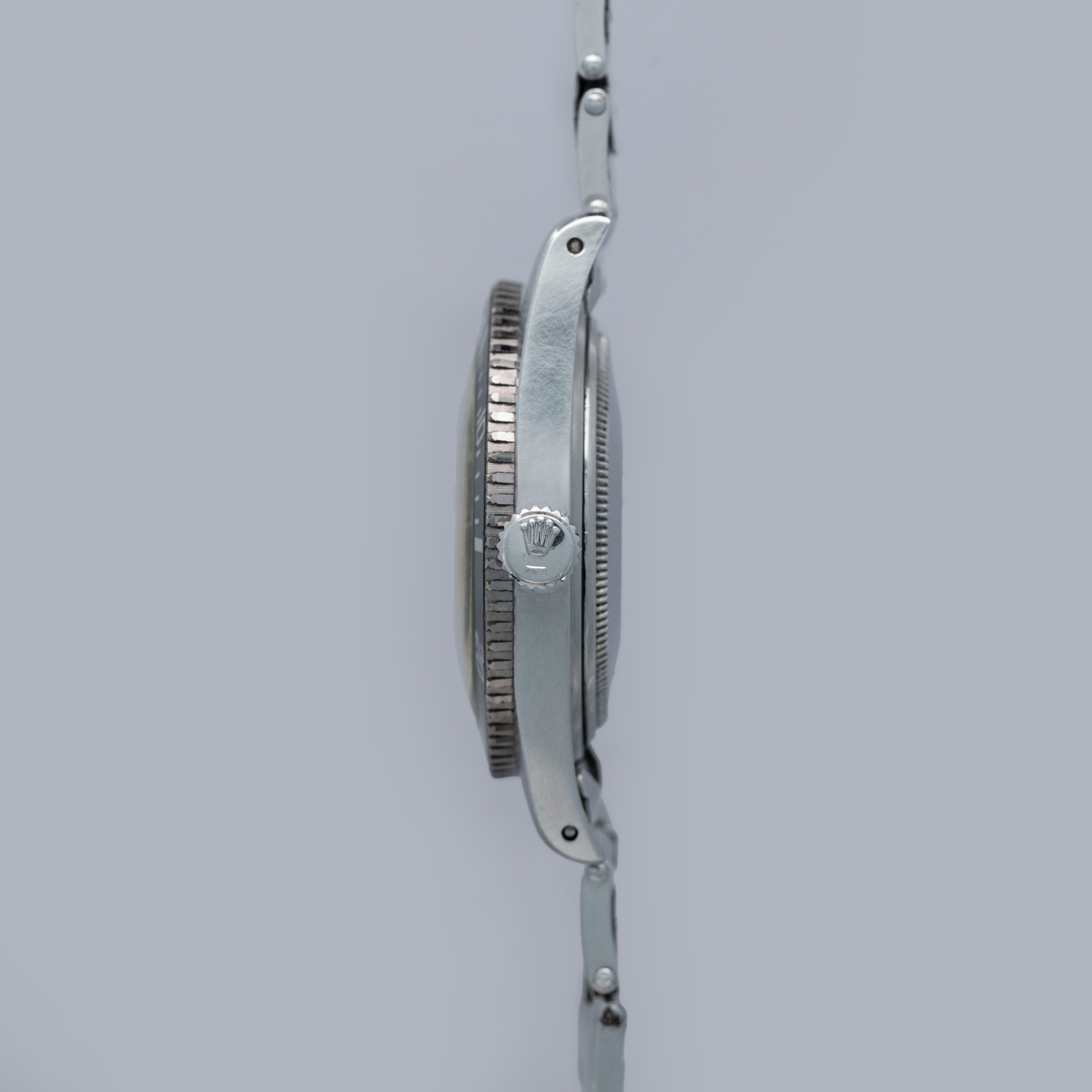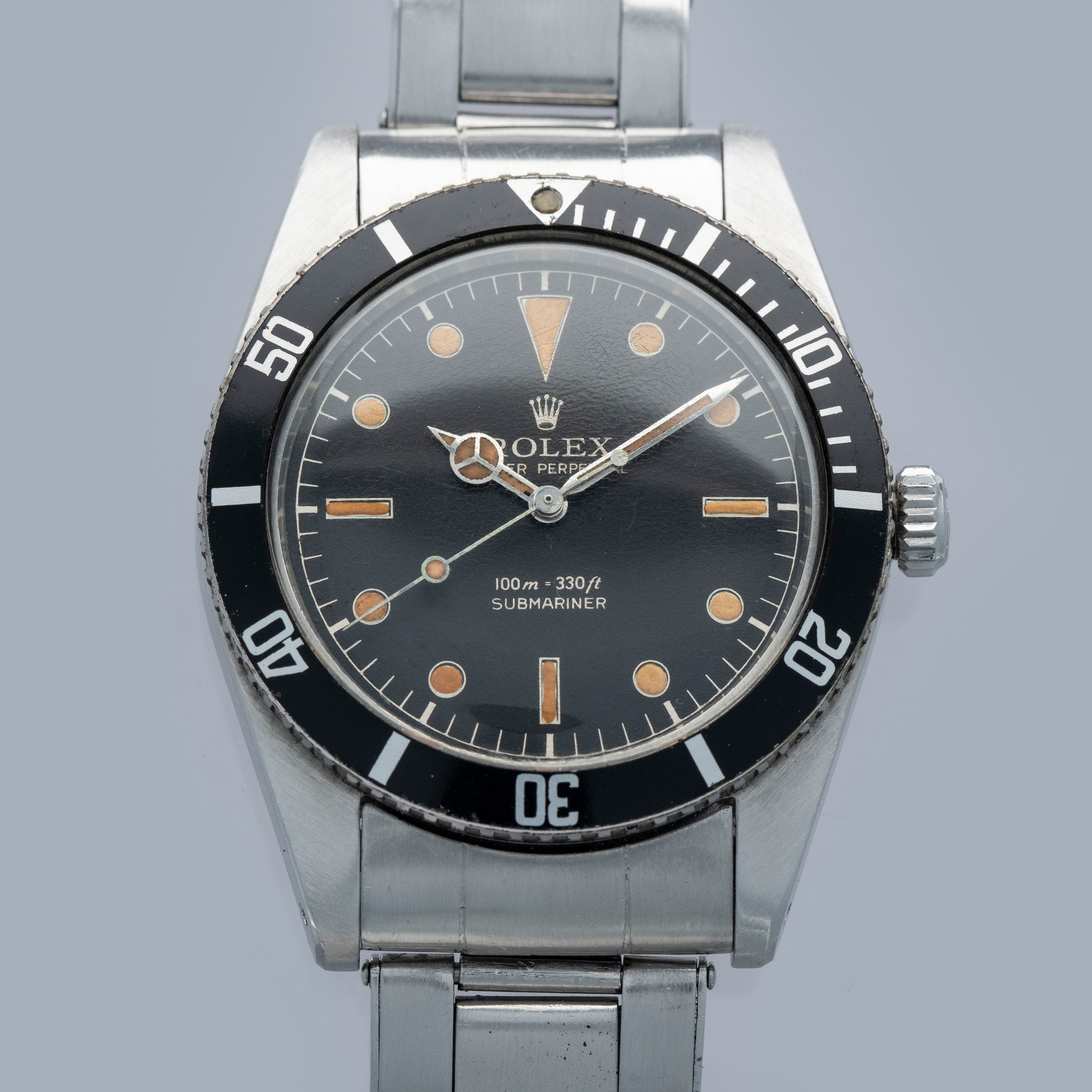 The watch is in overall excellent condition. The steel case remains well defined with light surface marks as expected of a watch of this vintage. The bezel is well defined, and the later black insert is very clean with a tight crack visible in the "triangle". The SWISS T 25 dial shows light surface aging, with luminous that has aged to a pleasing dark tone. The tone of luminous is slightly darker in the lower left quadrant. Hands have a luminous shade similar in tone with some cracks and discolorations. The Swiss rivet bracelet has been repaired at some point and the clasp comes from a later Jubilee bracelet. The bracelet has 10 links and fits an approximately 6 3/4” wrist. It shows light stretch.