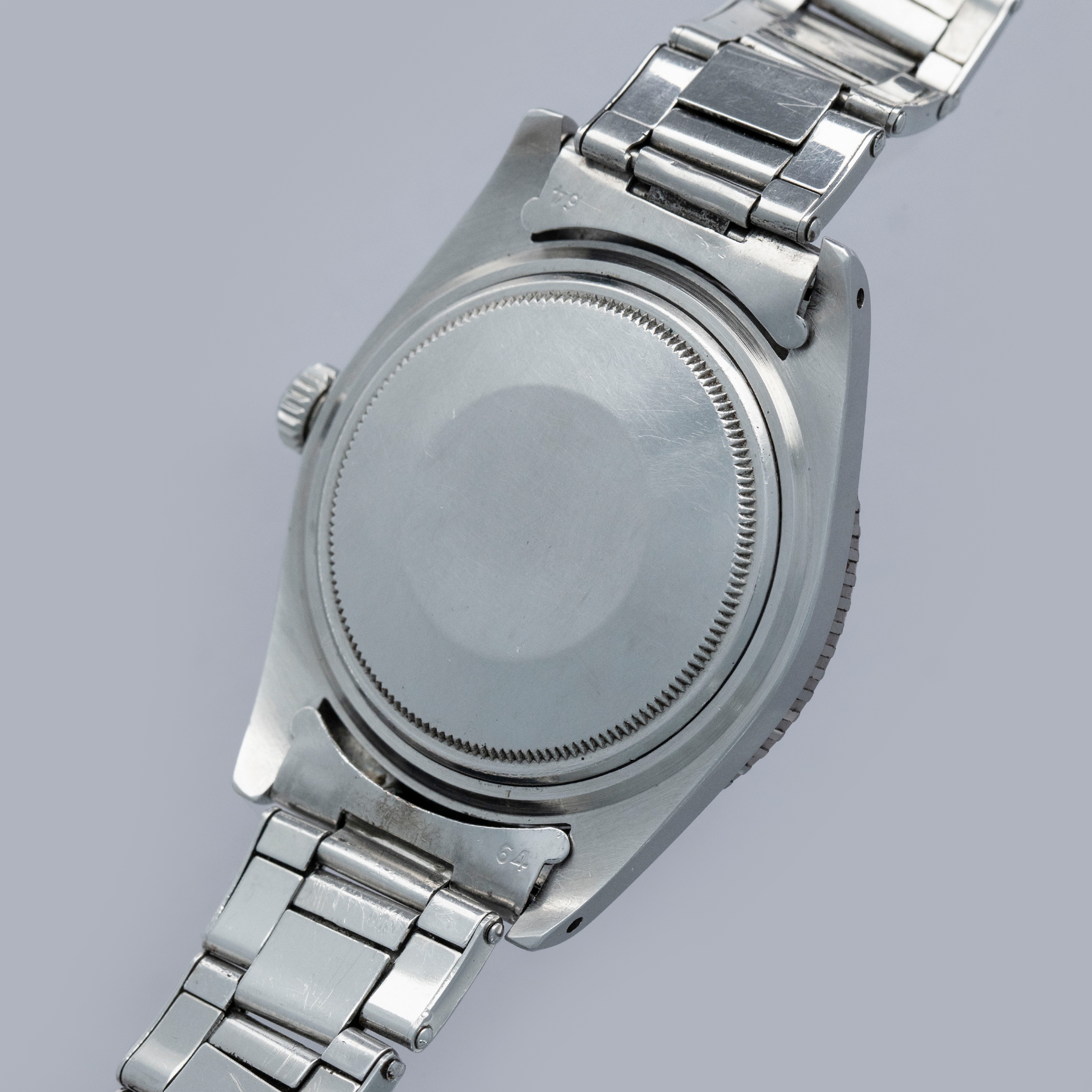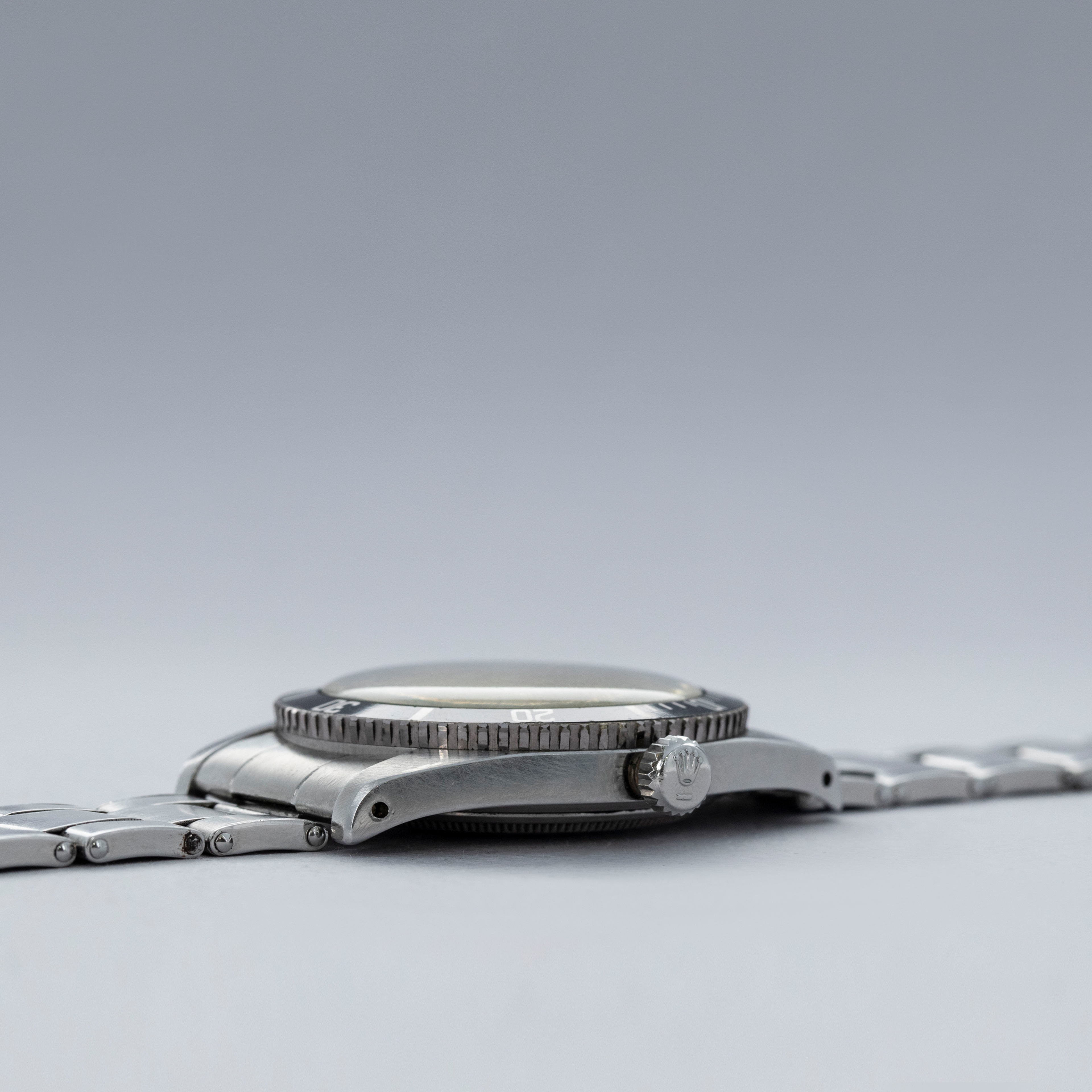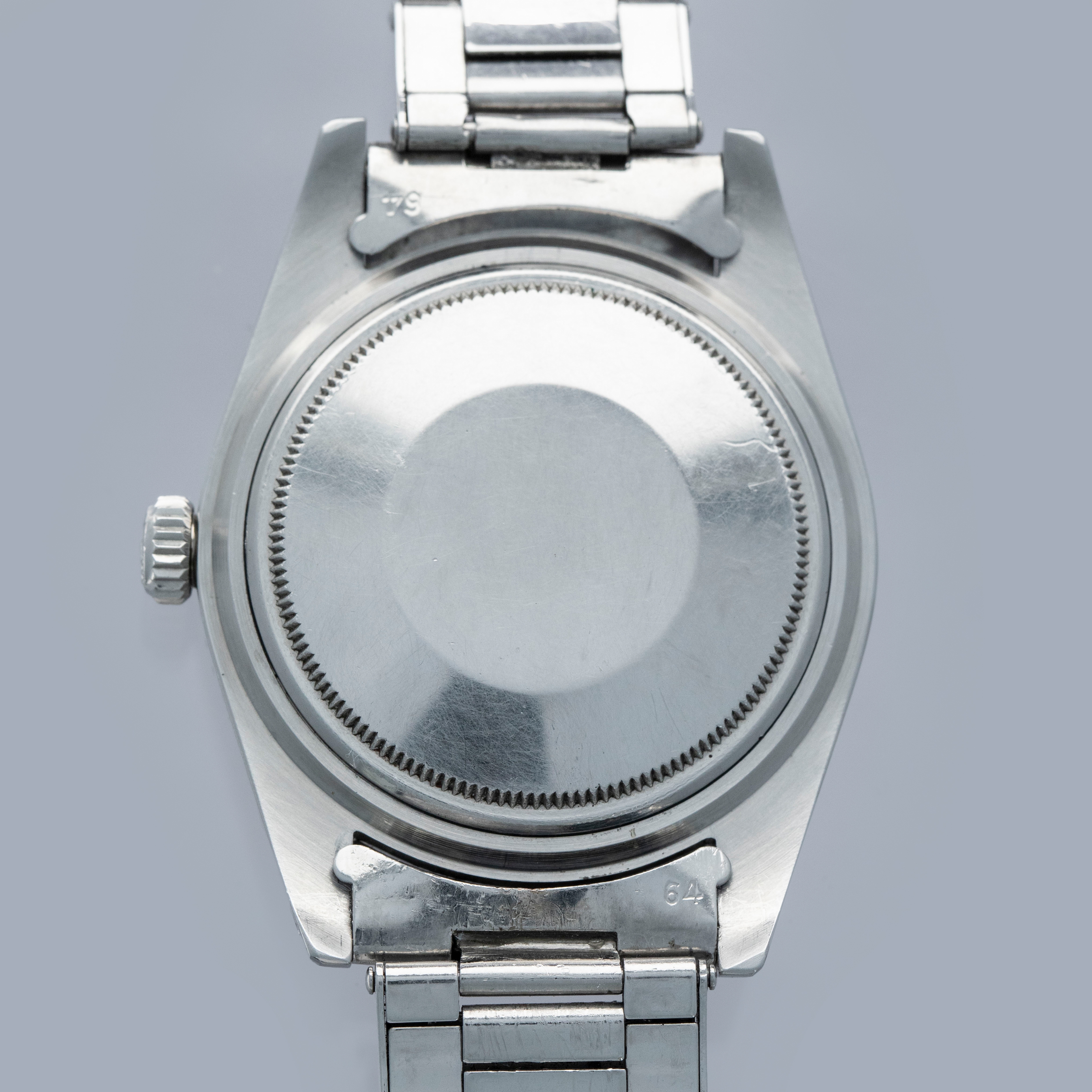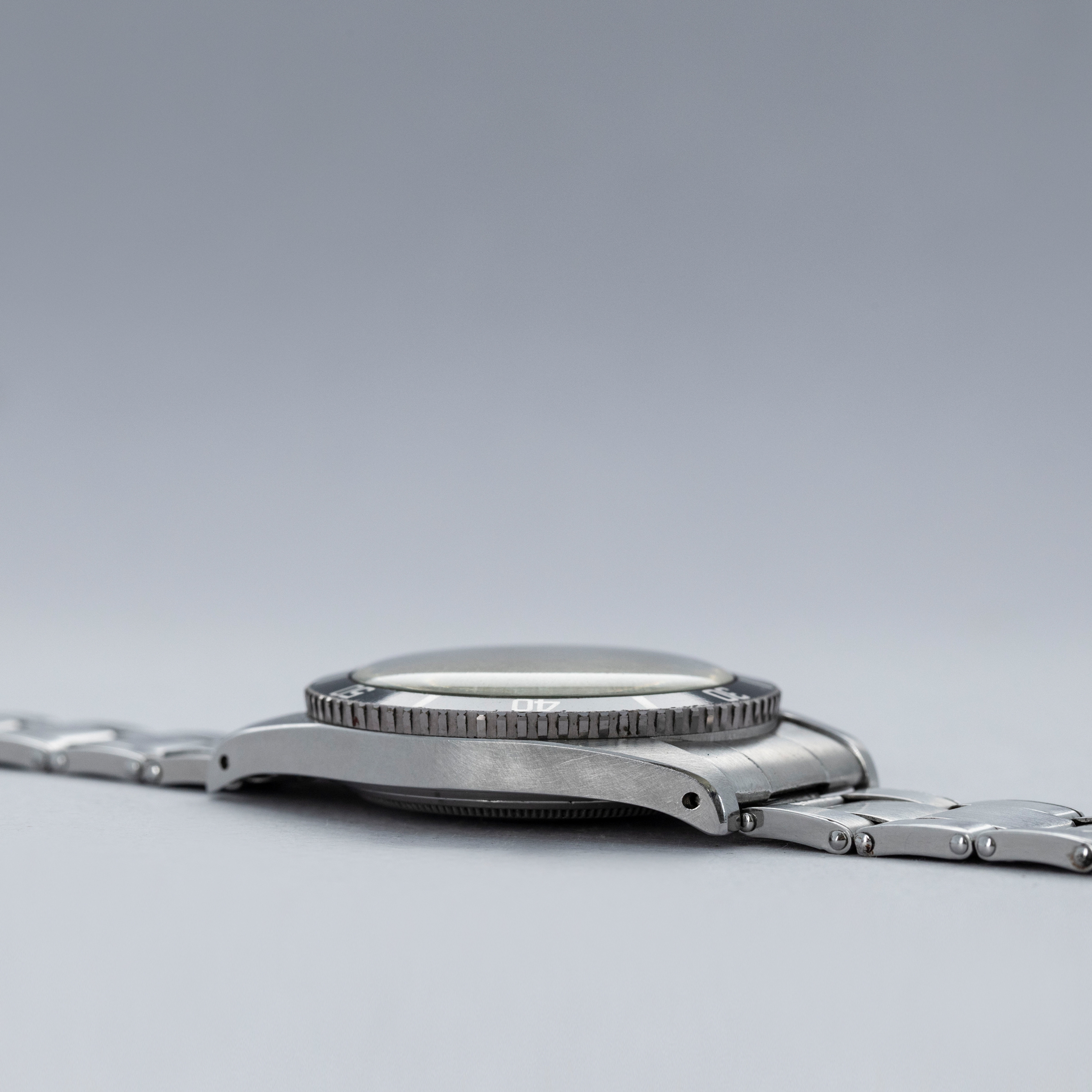 The watch is in overall excellent condition. The steel case remains well defined with light surface marks as expected of a watch of this vintage. The bezel is well defined, and the later black insert is very clean with a tight crack visible in the "triangle". The SWISS T 25 dial shows light surface aging, with luminous that has aged to a pleasing dark tone. The tone of luminous is slightly darker in the lower left quadrant. Hands have a luminous shade similar in tone with some cracks and discolorations. The Swiss rivet bracelet has been repaired at some point and the clasp comes from a later Jubilee bracelet. The bracelet has 10 links and fits an approximately 6 3/4” wrist. It shows light stretch.