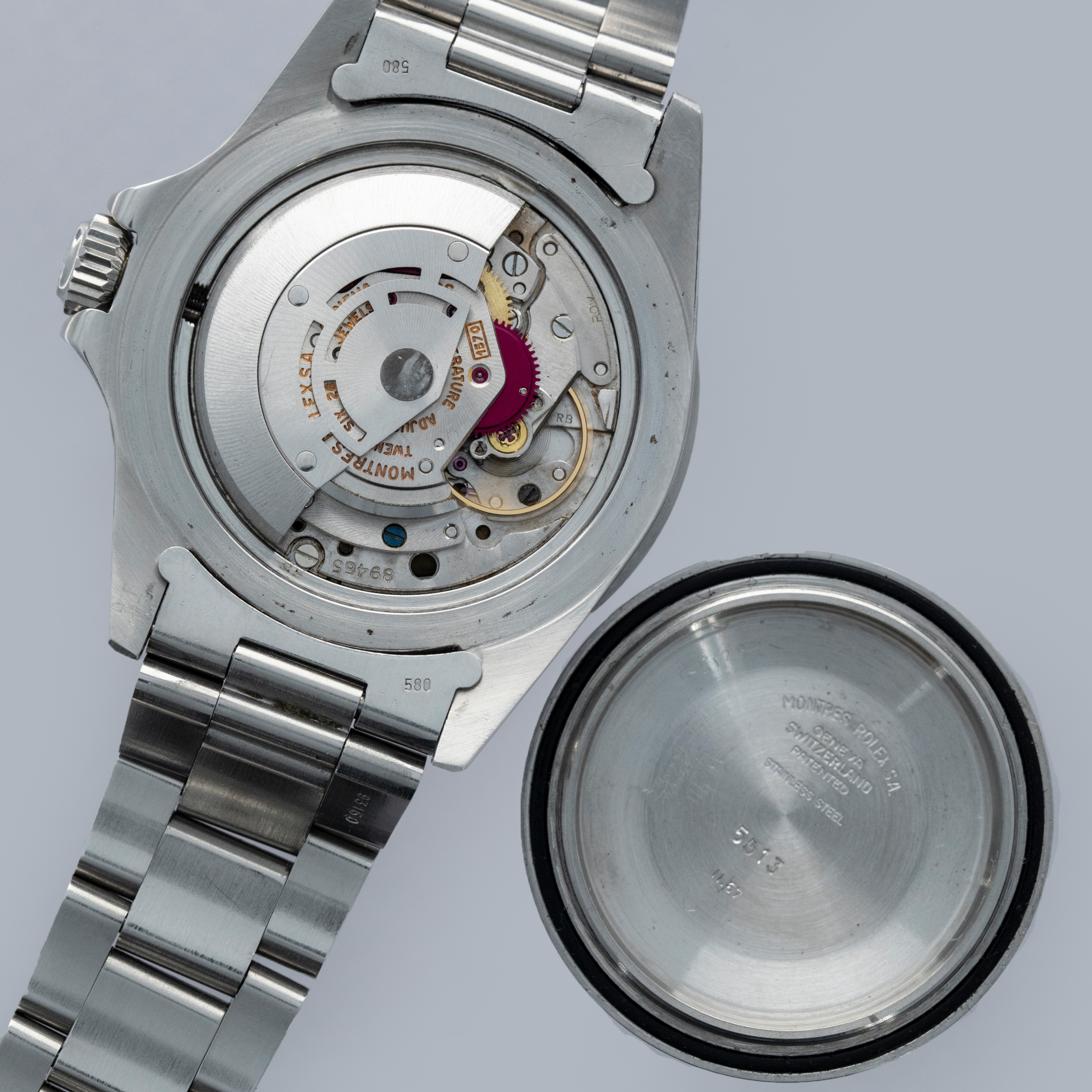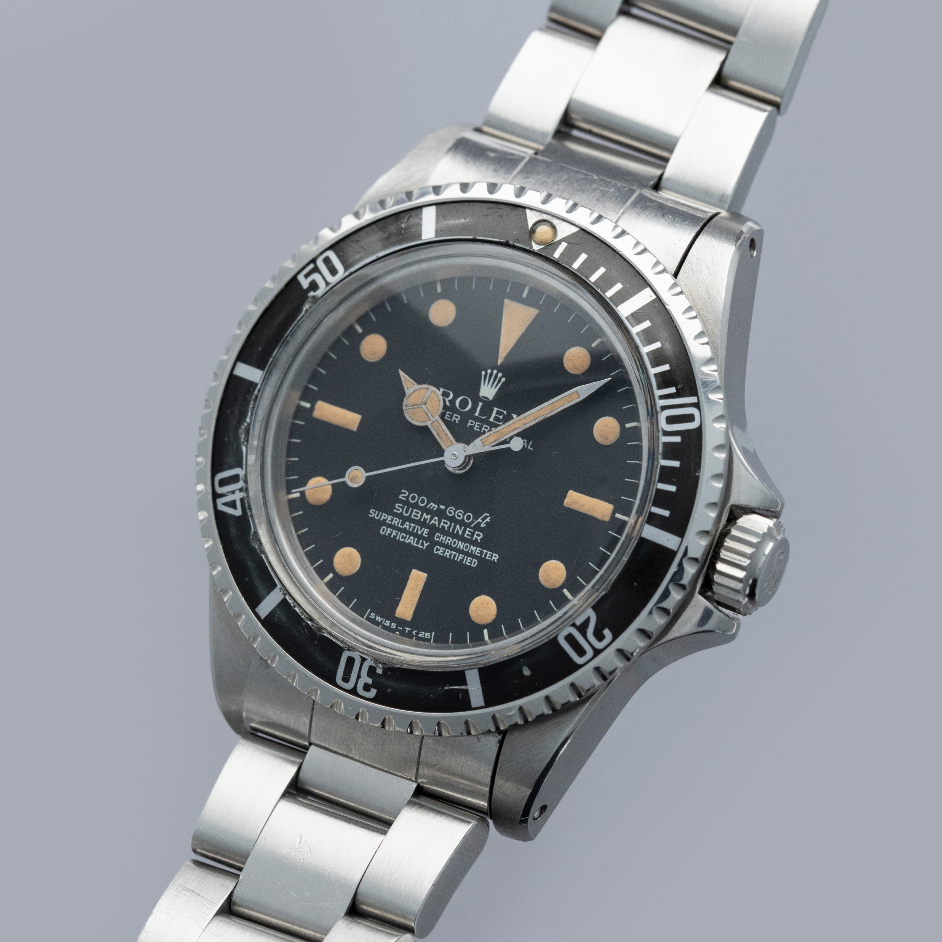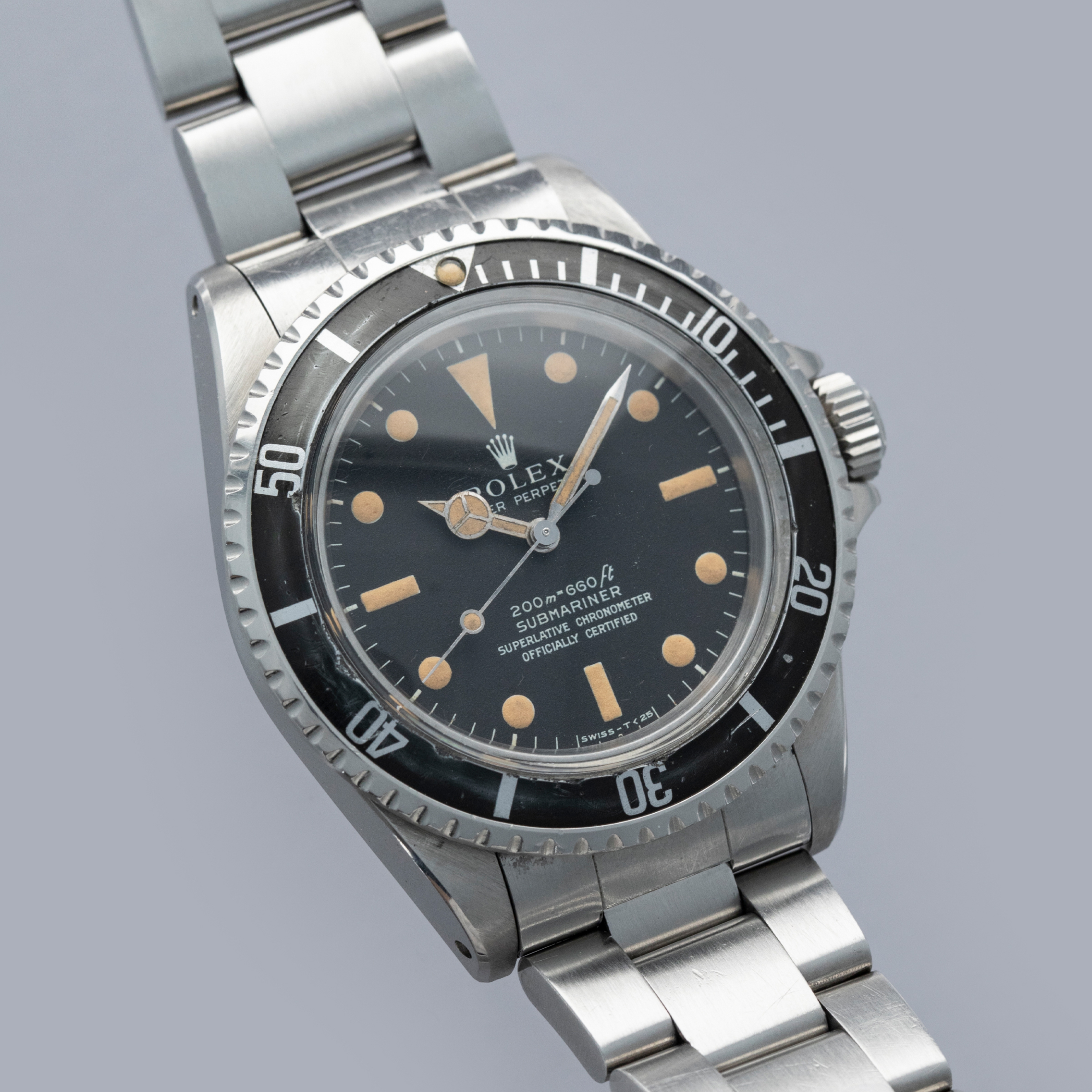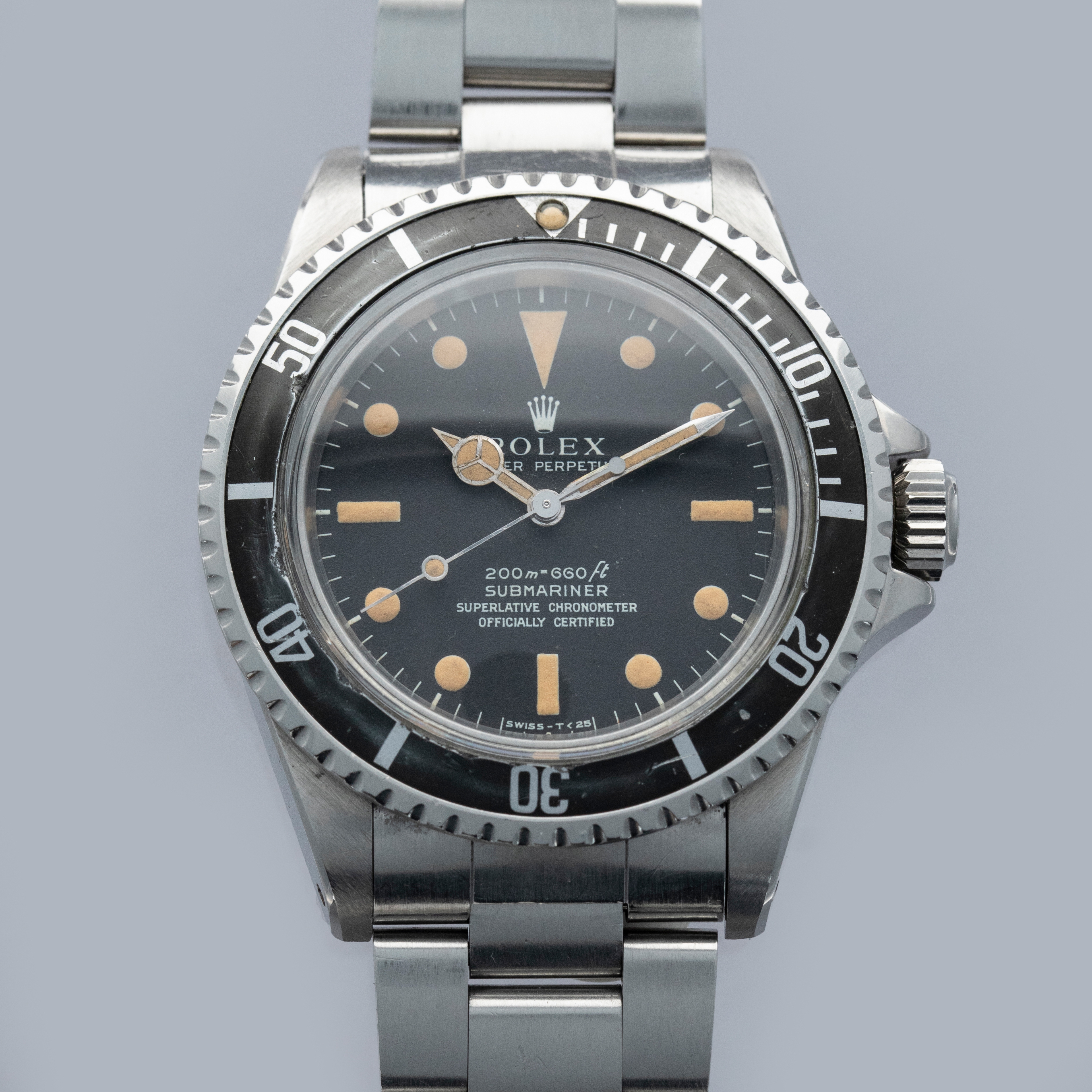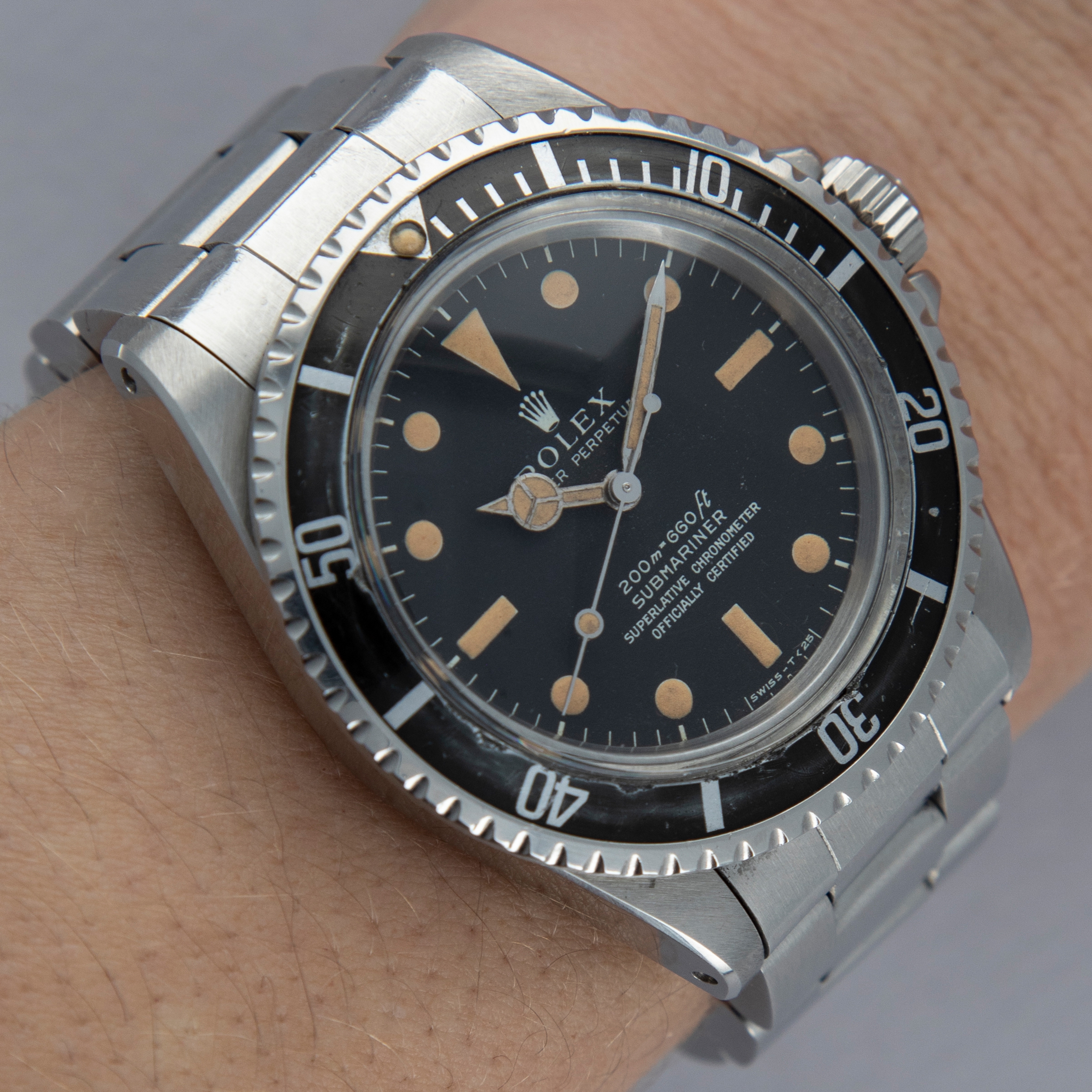 Watch is in very good overall condition. Case was previously detailed, and has thick lugs and a wide and sharp chamfered edge. The bezel insert has moderate wear along the inner edge and color fading and scratches as seen in the images. The dial and hand luminous have been skillfully relumed at some point to mimic naturally aged luminous. It is otherwise in excellent condition showing only minimal wear and aging. The watch is currently fitted on a 91350 solid oyster bracelet with 10 links fitting a 6 1/2" wrist. There are three removable links included with the watch. Additionally, a Swiss rivet band dated 1967 is included with the watch. It has 12 links total, and shows light stretch. The watch comes with a punched guarantee certificate as well as its original COSC timing certificate. Watch was purchased at an Antiquorum auction in 2021, and a receipt / invoice is included.