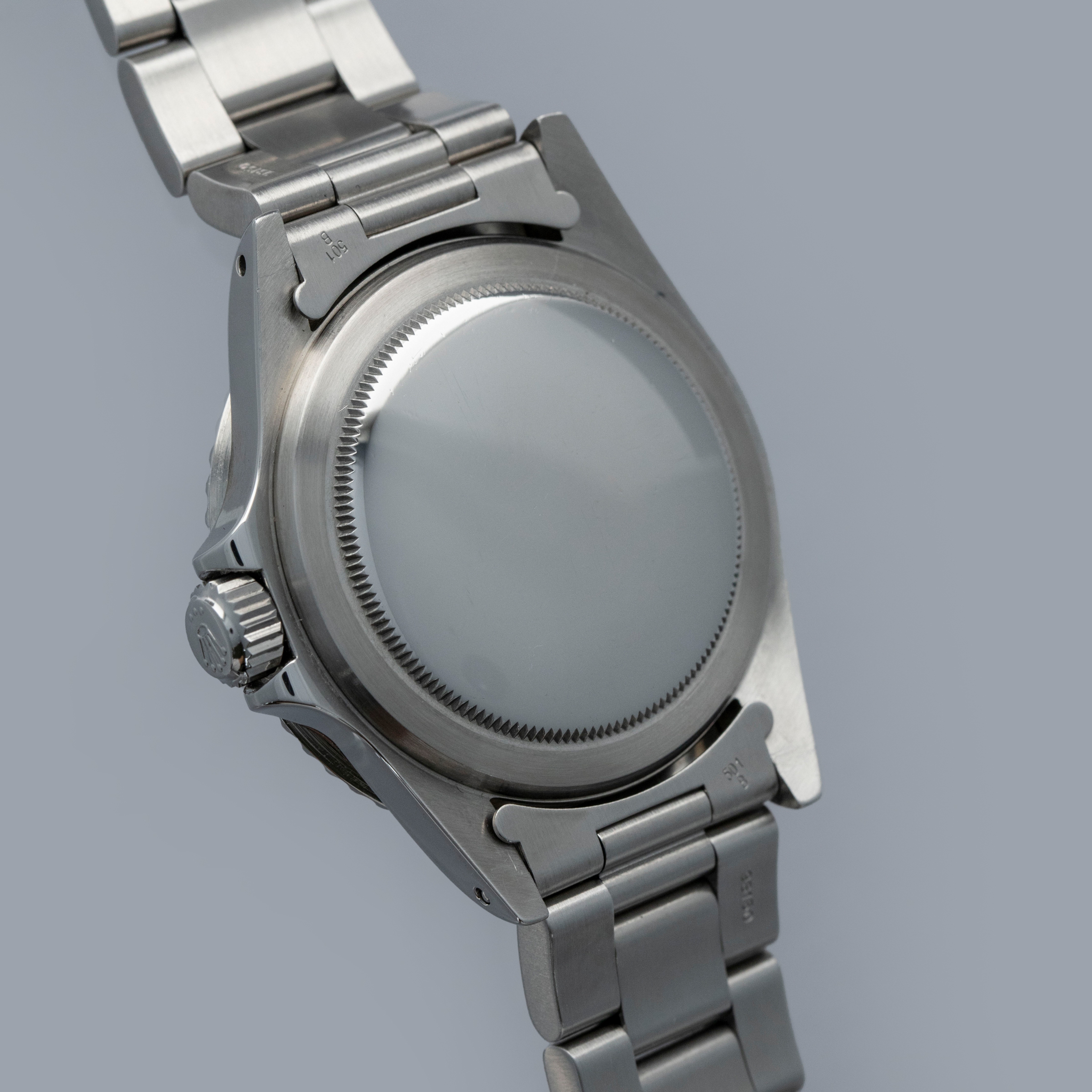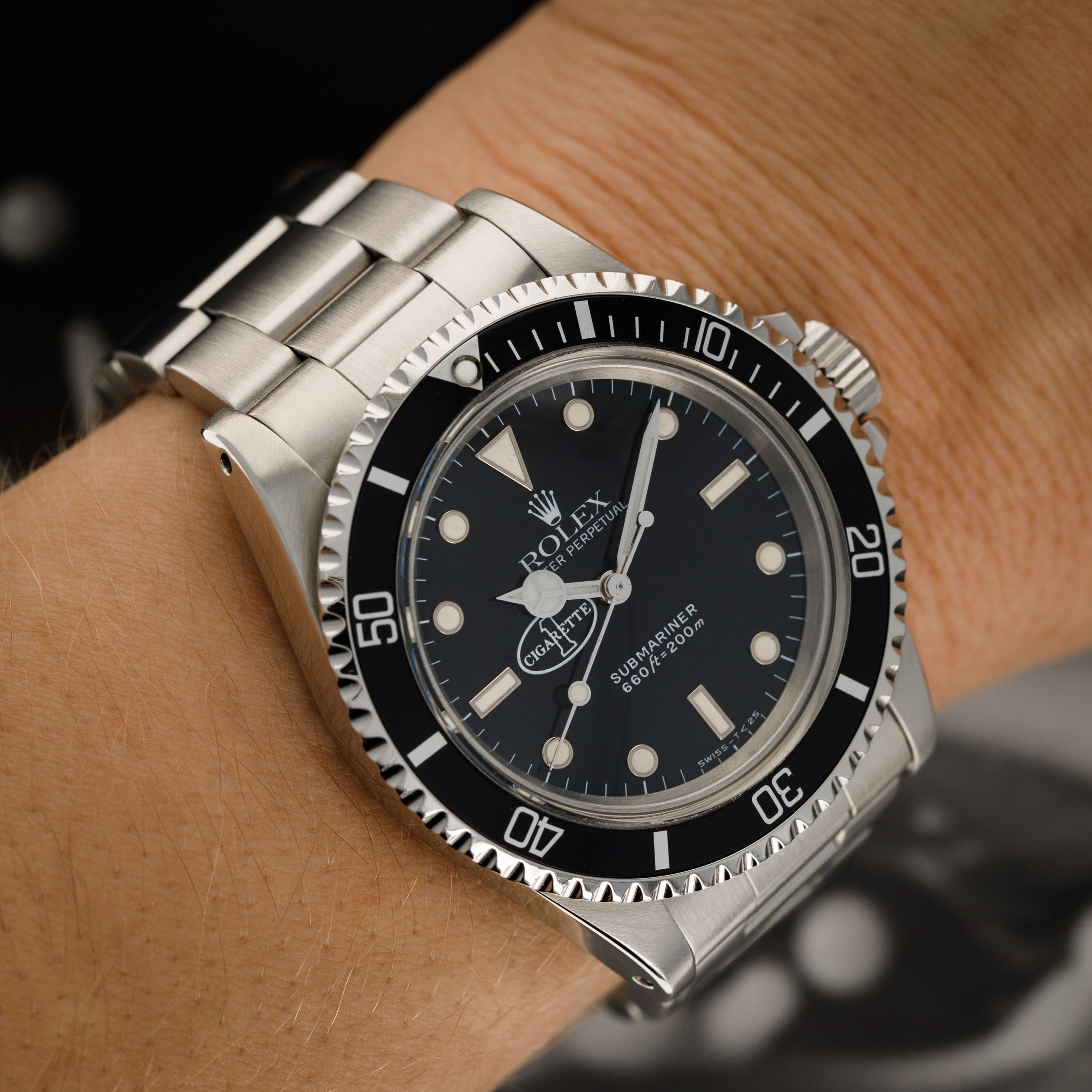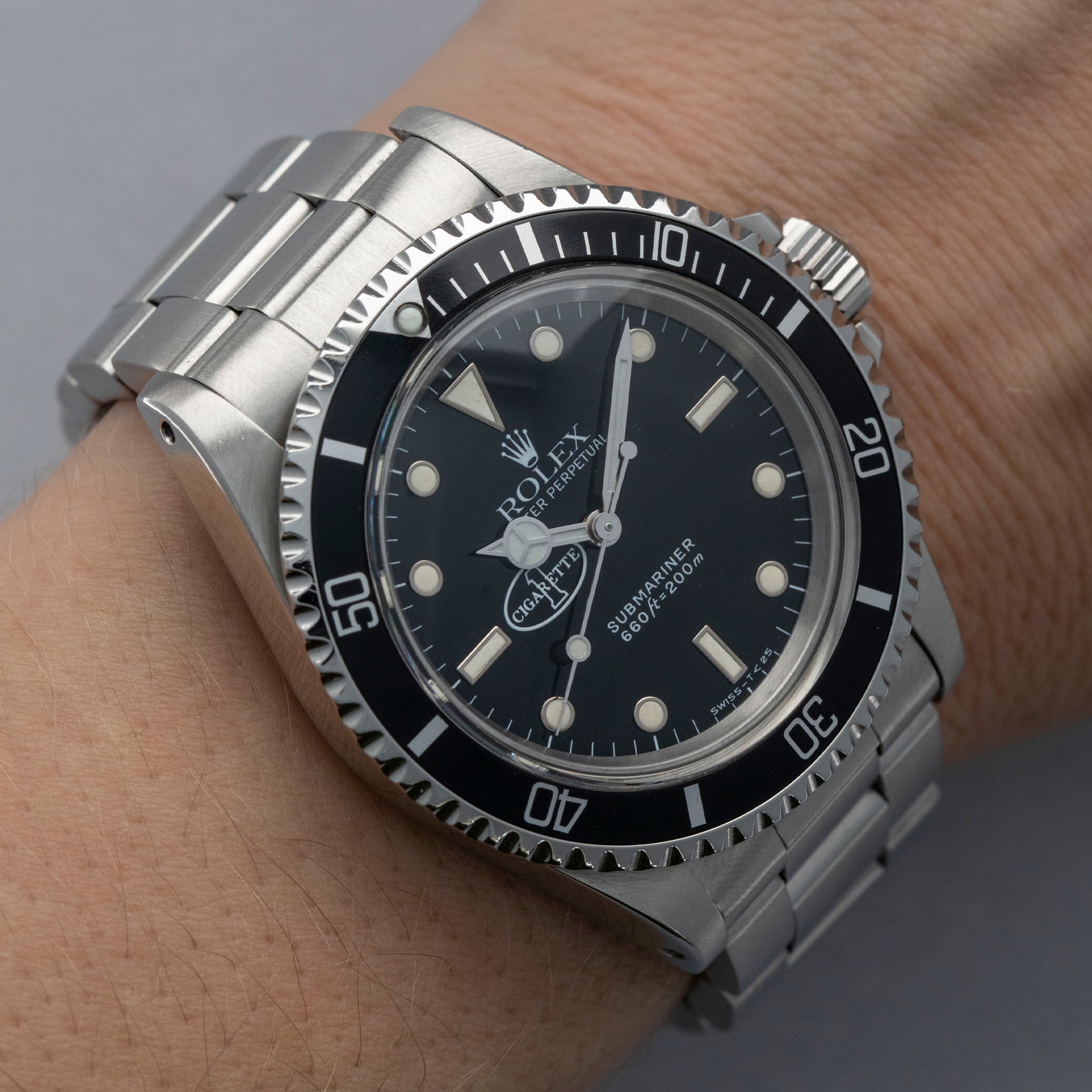 The watch is in near-mint condition. The steel case presents as near mint, having been fully serviced in 2020, with signs of previous polishing and light wear visible. The case back has some light marks. The bezel is well defined, and the black insert is virtually mark-free. The black dial is near mint, featuring the Cigarette 1 logo and original tritium lume that has aged to a warm cream tone. The hands are later Luminova replacements. The watch is fitted with a solid link Oyster bracelet with 501B end links, showing light marks and negligible play between the links. The bracelet currently fits a 7 1/4” wrist, and is fitted with 11 links, 1 of which is removable. The watch comes with a Rolex service pouch and service card dated 2020.