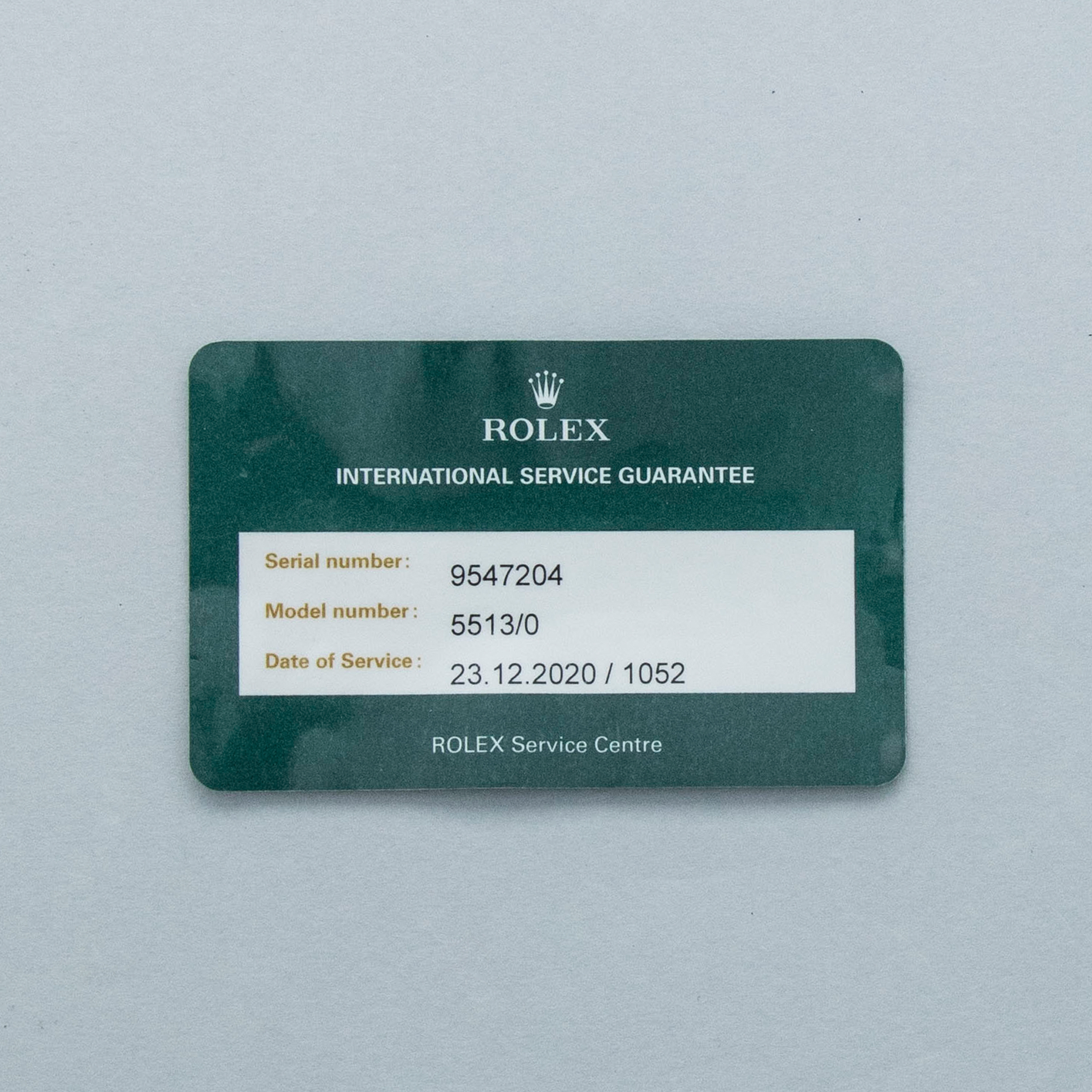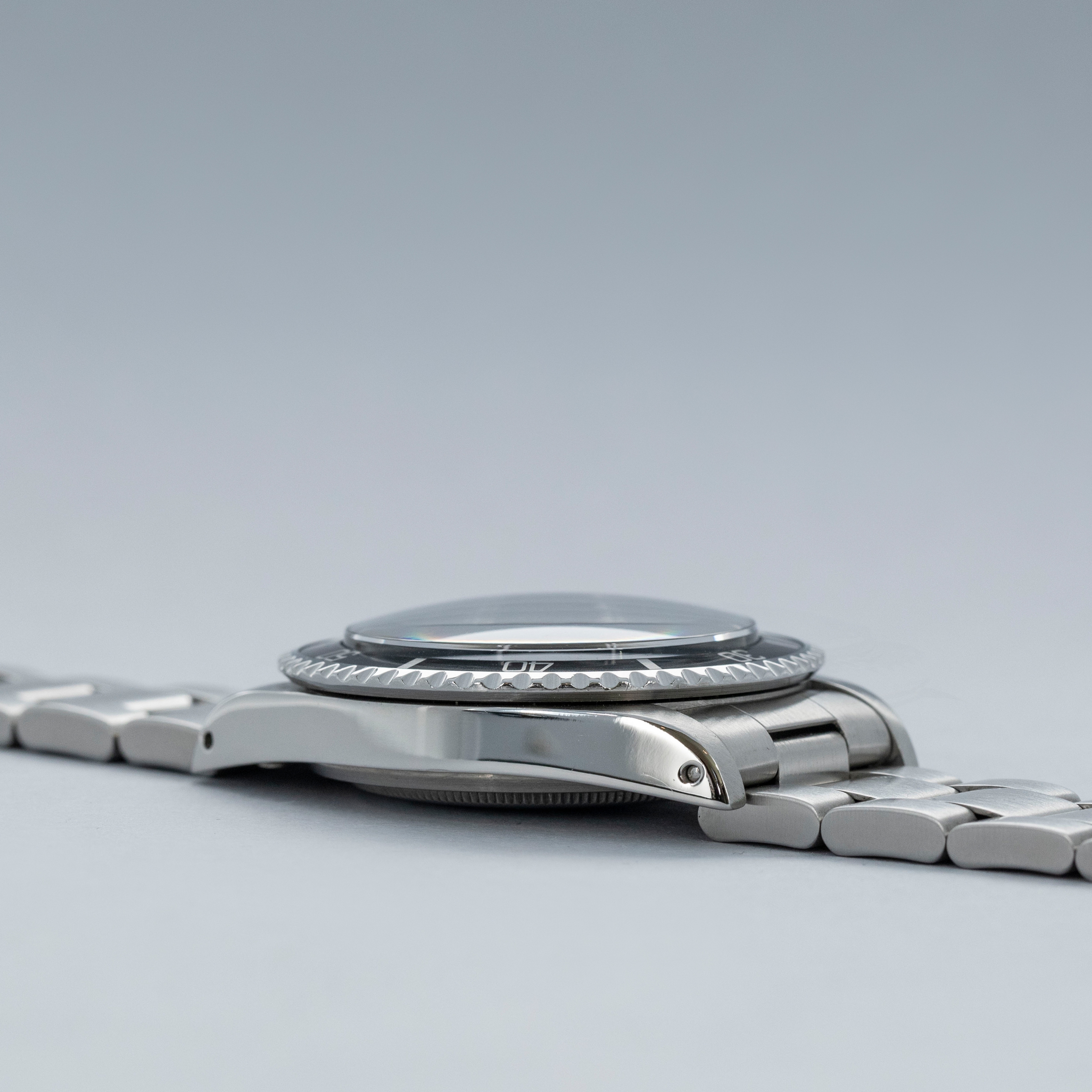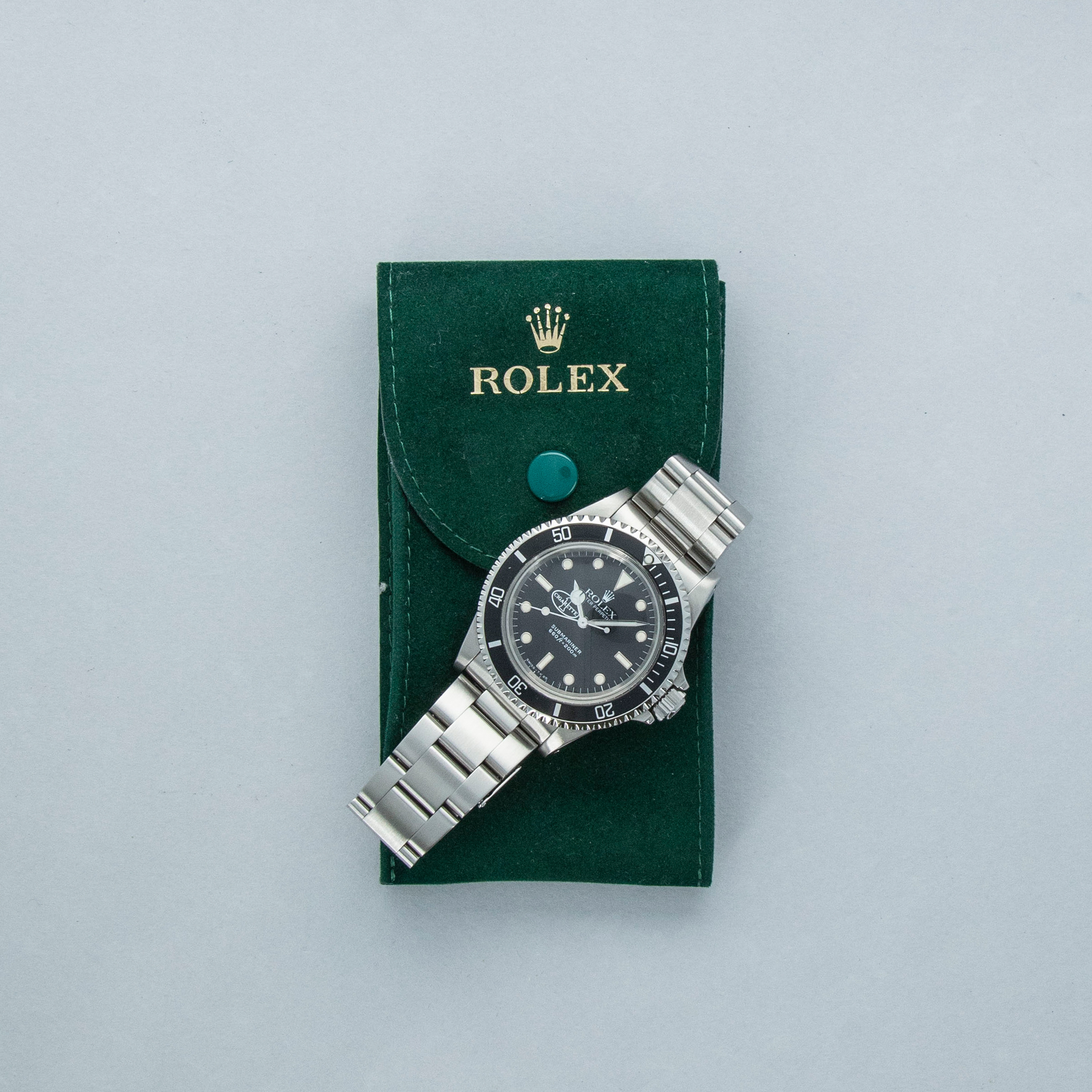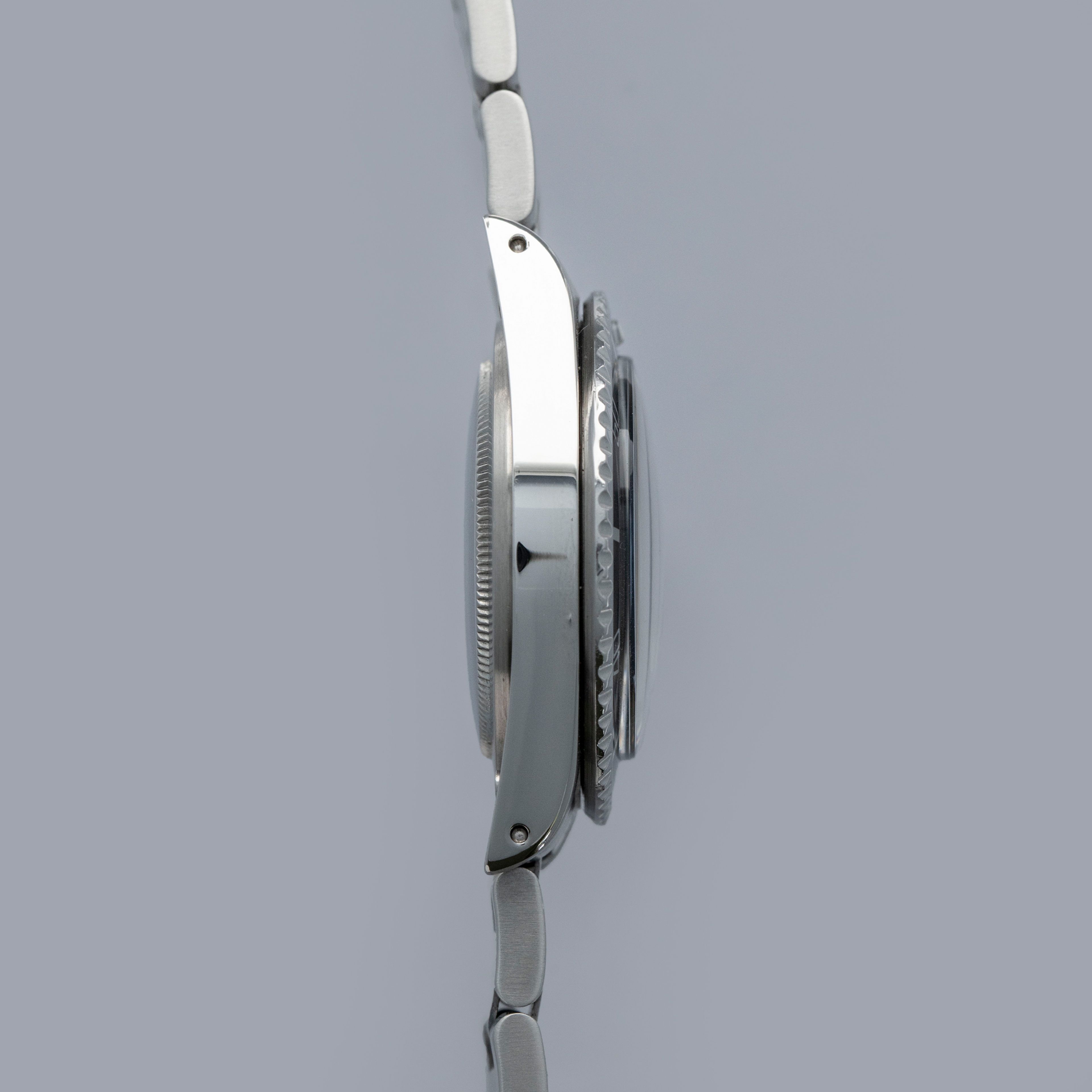 The watch is in near-mint condition. The steel case presents as near mint, having been fully serviced in 2020, with signs of previous polishing and light wear visible. The case back has some light marks. The bezel is well defined, and the black insert is virtually mark-free. The black dial is near mint, featuring the Cigarette 1 logo and original tritium lume that has aged to a warm cream tone. The hands are later Luminova replacements. The watch is fitted with a solid link Oyster bracelet with 501B end links, showing light marks and negligible play between the links. The bracelet currently fits a 7 1/4” wrist, and is fitted with 11 links, 1 of which is removable. The watch comes with a Rolex service pouch and service card dated 2020.