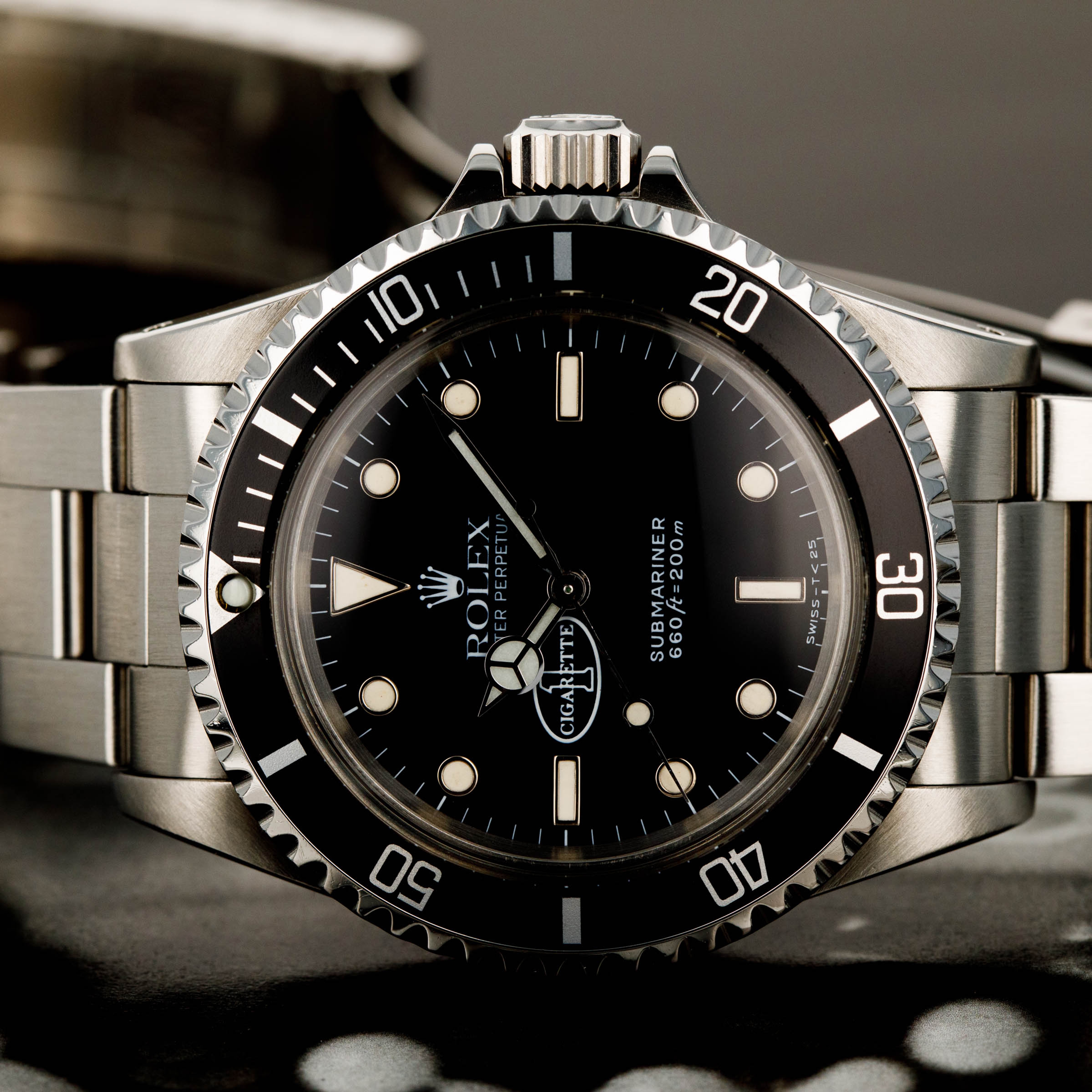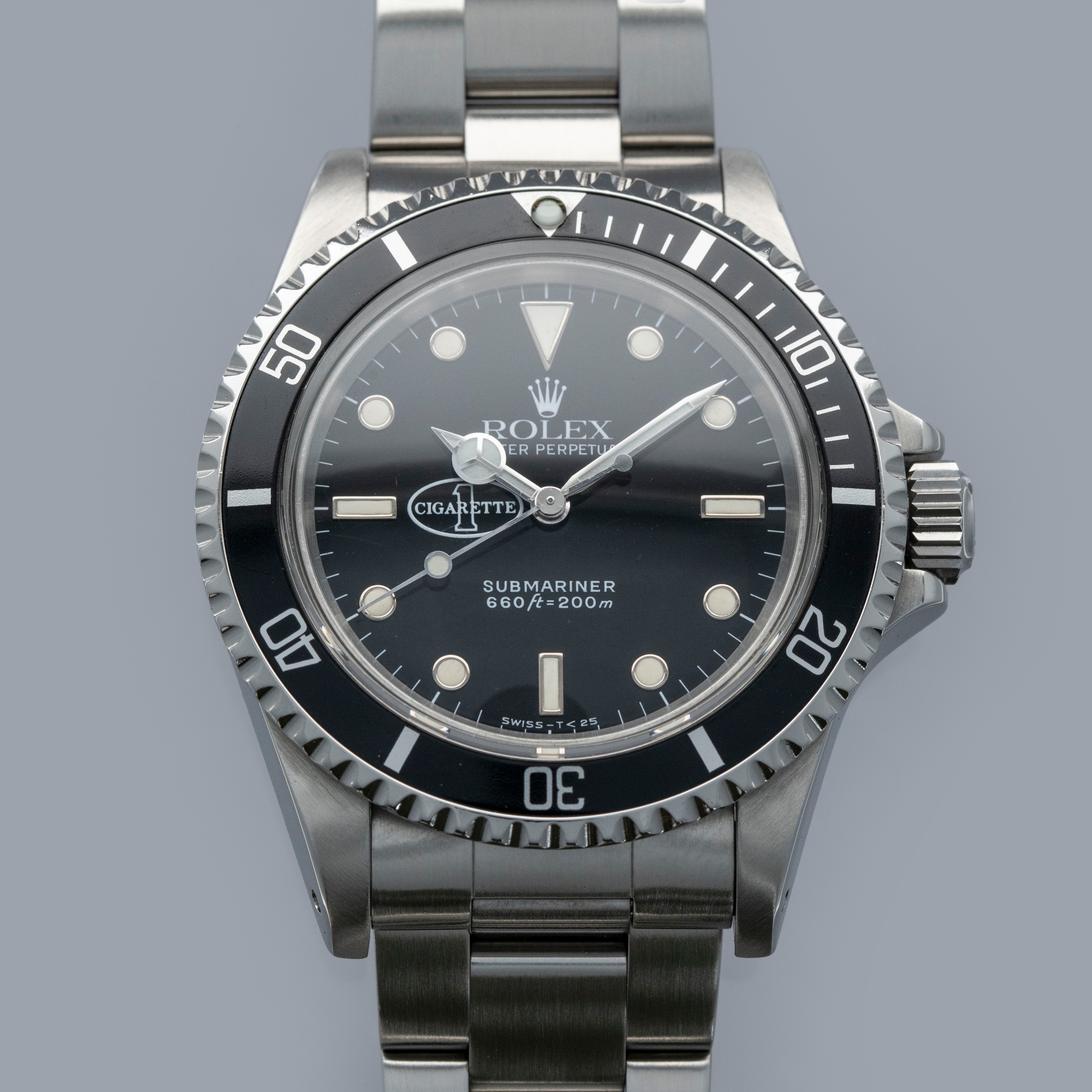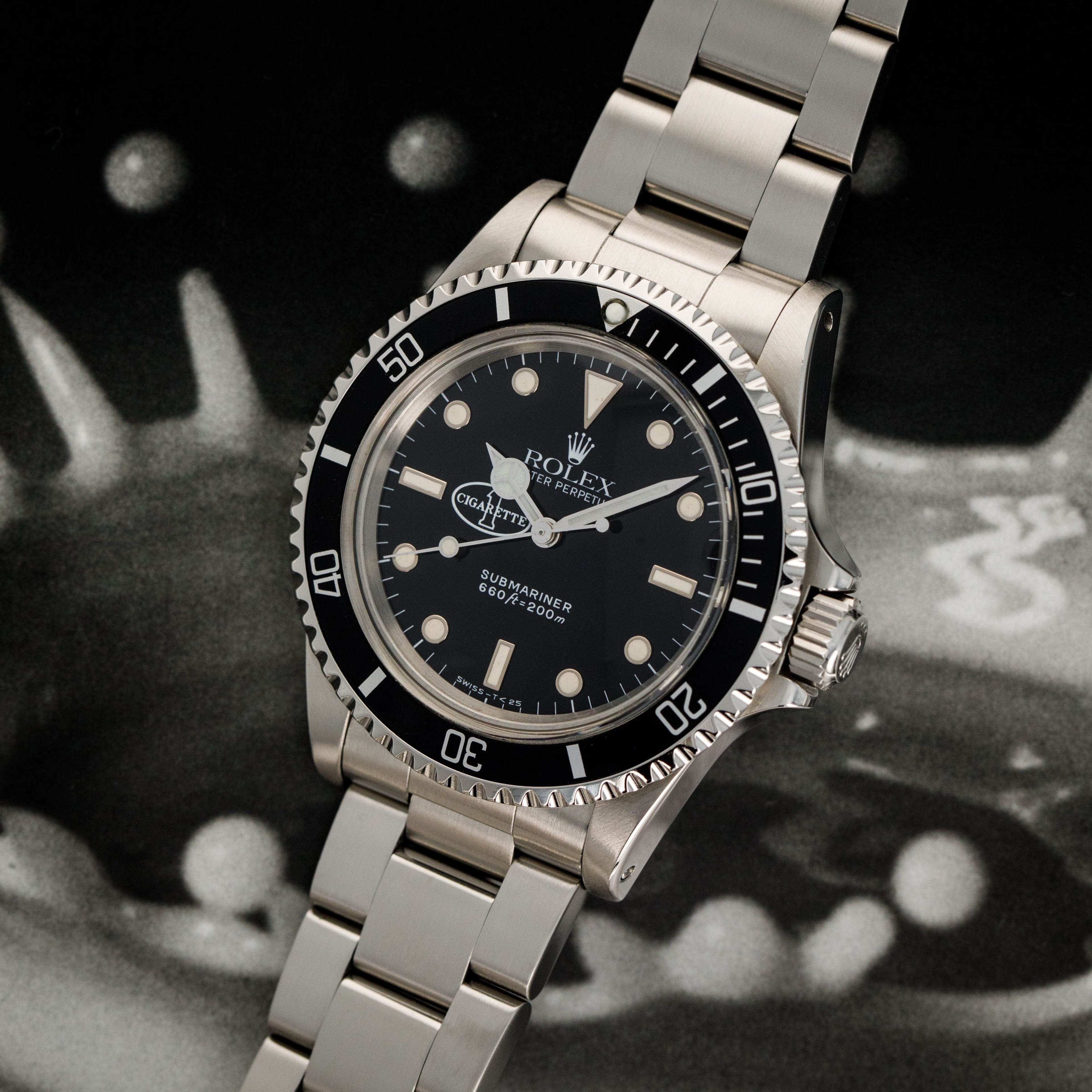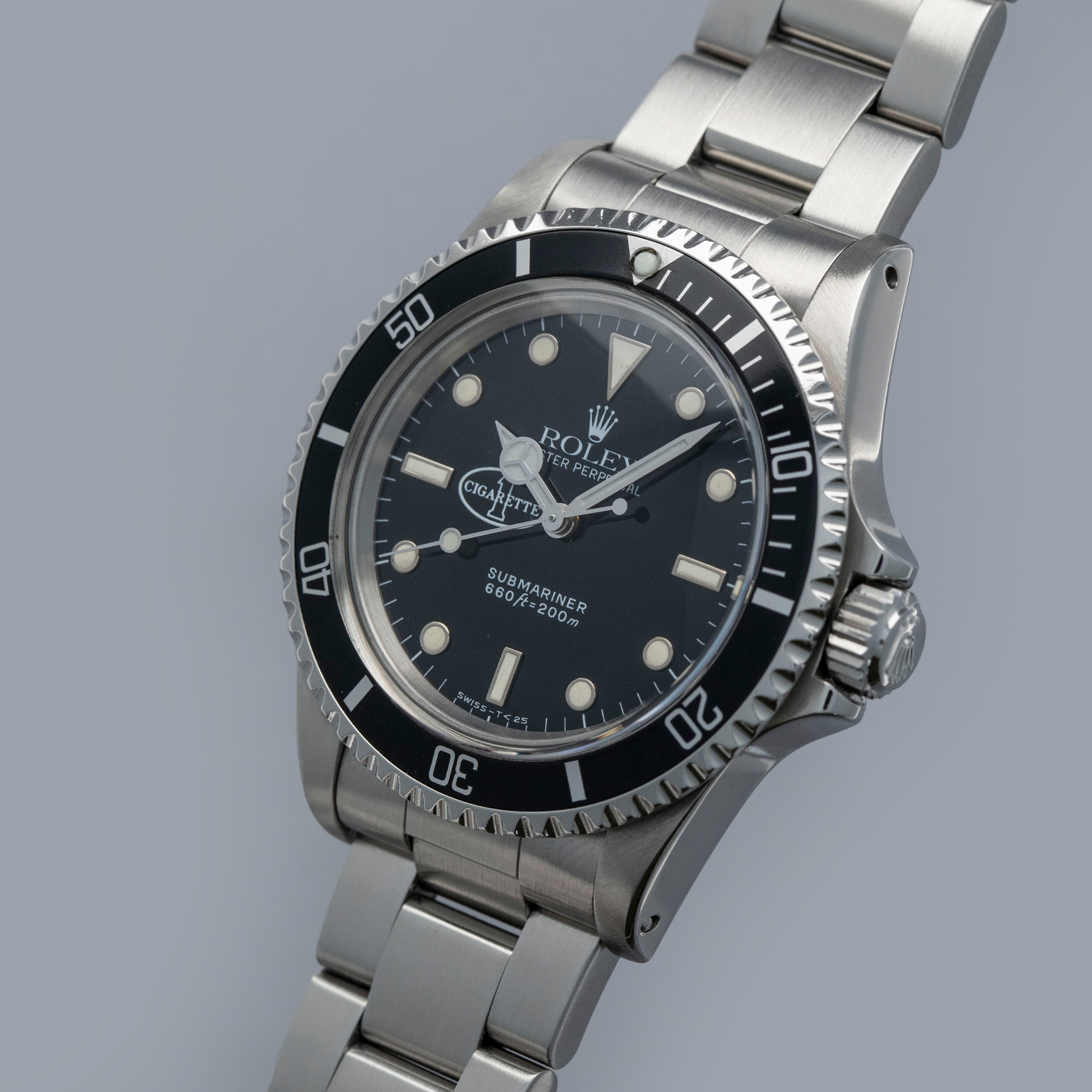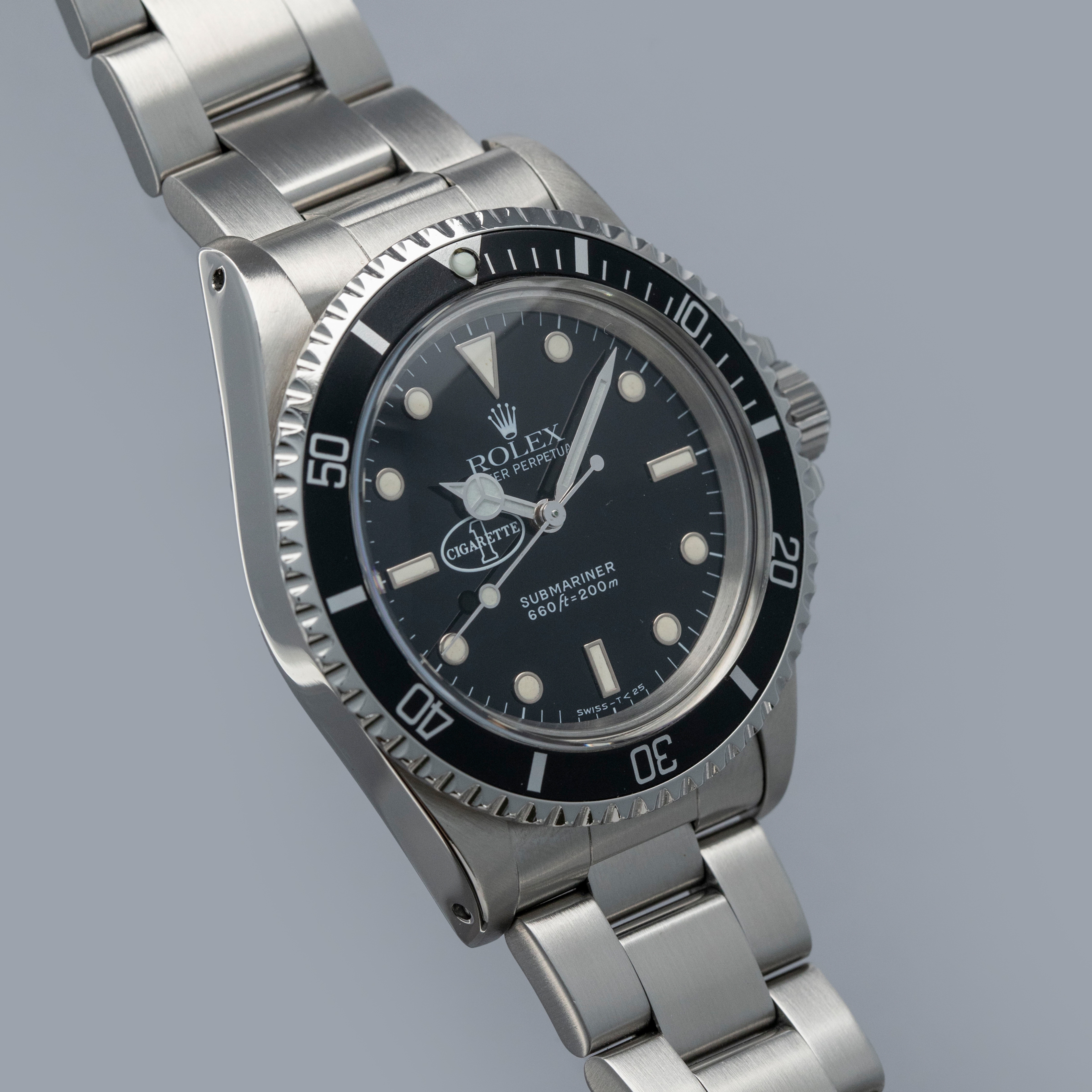 The 5513 was produced from 1962 to 1988, and was the non-chronometer version of the non-date Submariner. There were a multitude of dial variants made over those 26 years, ranging from gilt chapter ring dials in the beginning to matte dials, then ultimately the glossy dials with white gold luminous surrounds. Offered here, we have what is believed to be one of only six Cigarette 1-cosigned Submariners in existence, with five of them being in steel like ours, and one in 18kt yellow gold. So the story goes, Don Aronow, the owner of Cigarette 1, a company that produced long hulled speedboats and also operated a racing team told the crew on one of his boats during a fishing competition that if they won they would all get a Rolex. As such, when they won they were each presented with a stainless steel co-signed Cigarette 1 ref. 5513 in stainless steel as we have here. The one gold example was Don’s. Regardless of the accuracy of the folklore behind these watches, it is certain that they are rare, seldom come to market, and special given Cigarette 1’s history as one of the world’s premier speedboat manufacturers.