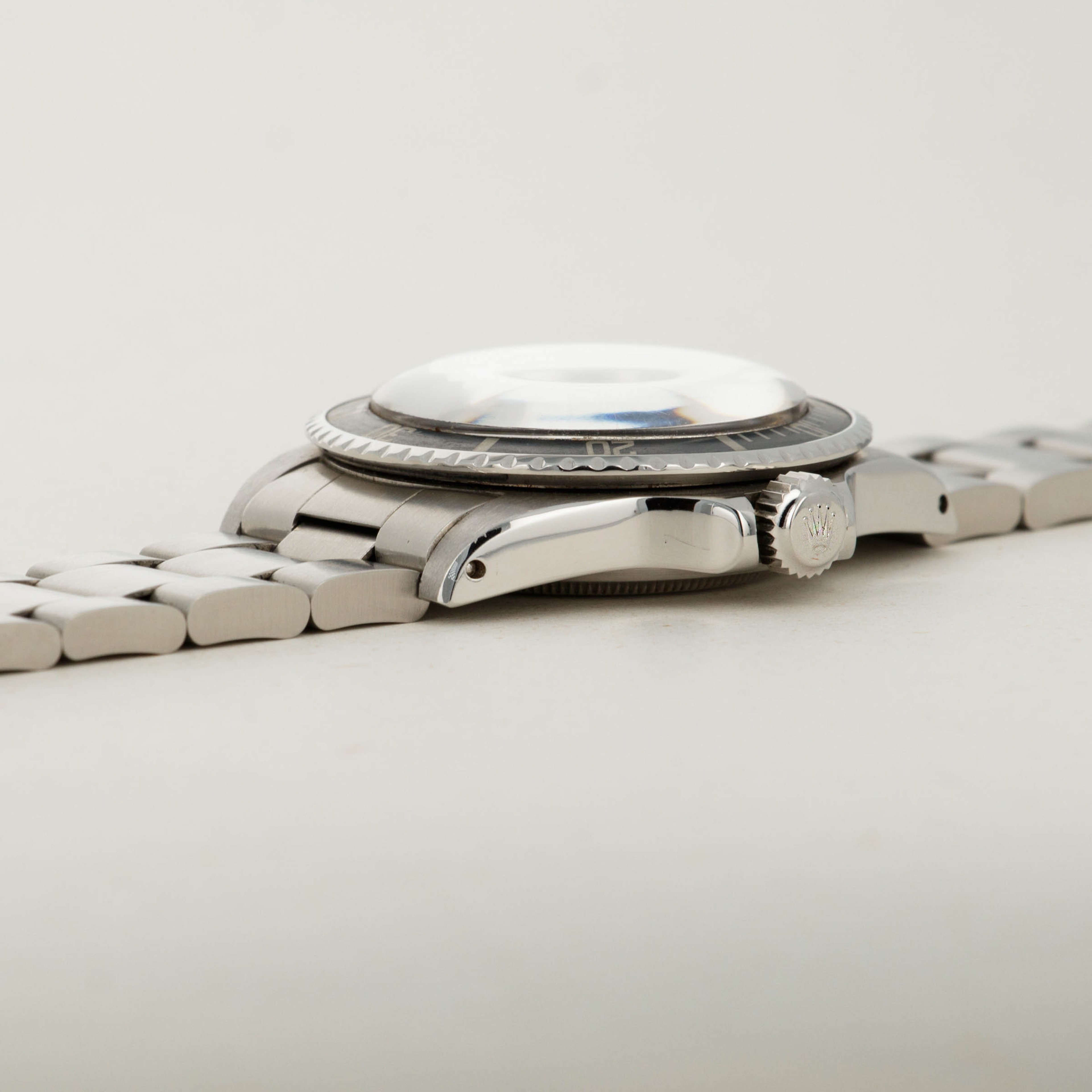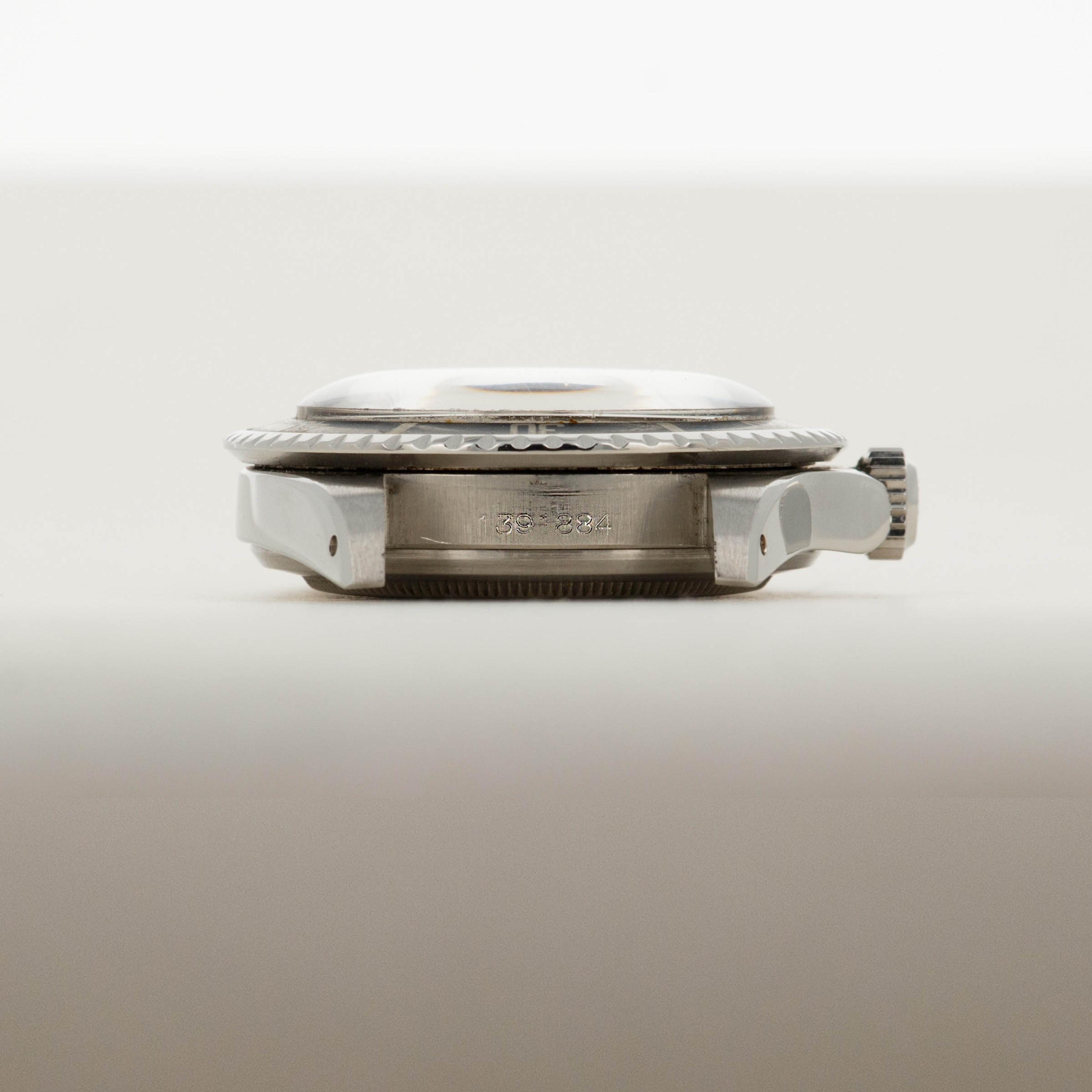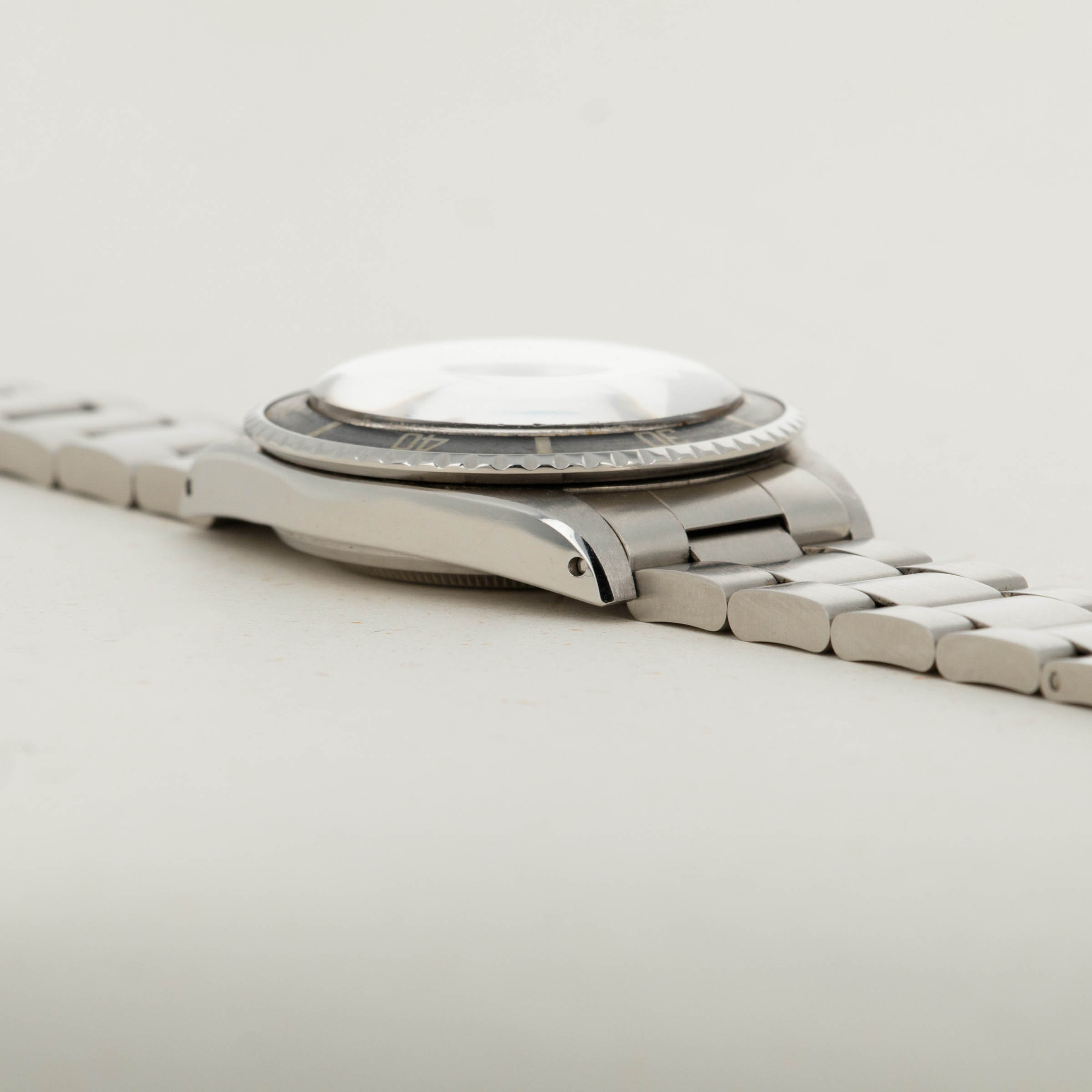 Watch is in excellent overall condition. Recently detailed case has sharp chamfered edges and no major dings or scratches. The original twin lock crown is still fitted to the watch. The dial has original dome shaped luminous that is cream colored. The surface has light matting and very minimal spotting as shown in the images. The hands do not fluoresce and have been re-lumed to match the dial. Pear in the insert is also replaced. Later solid oyster band has 11 links total and exhibits little stretch.