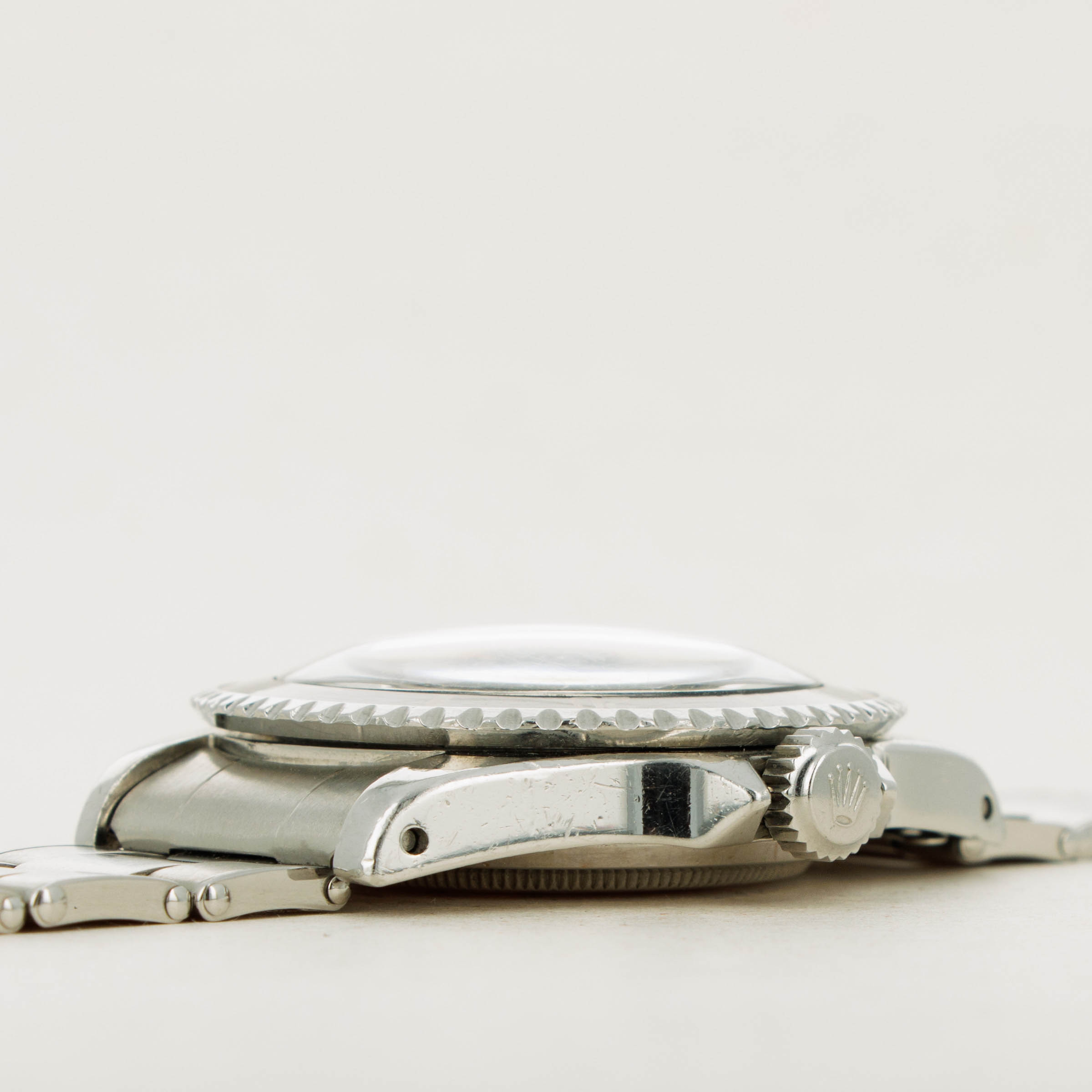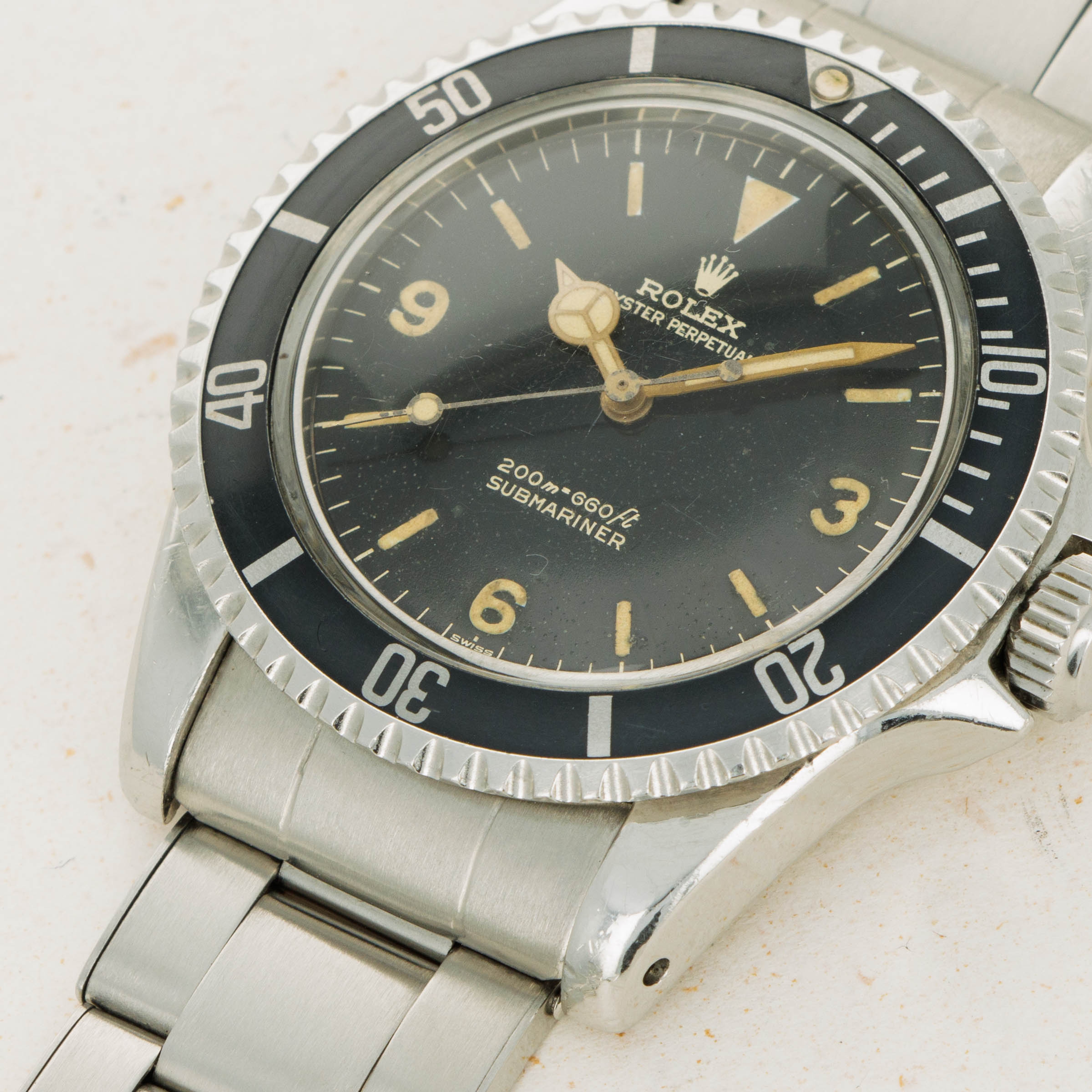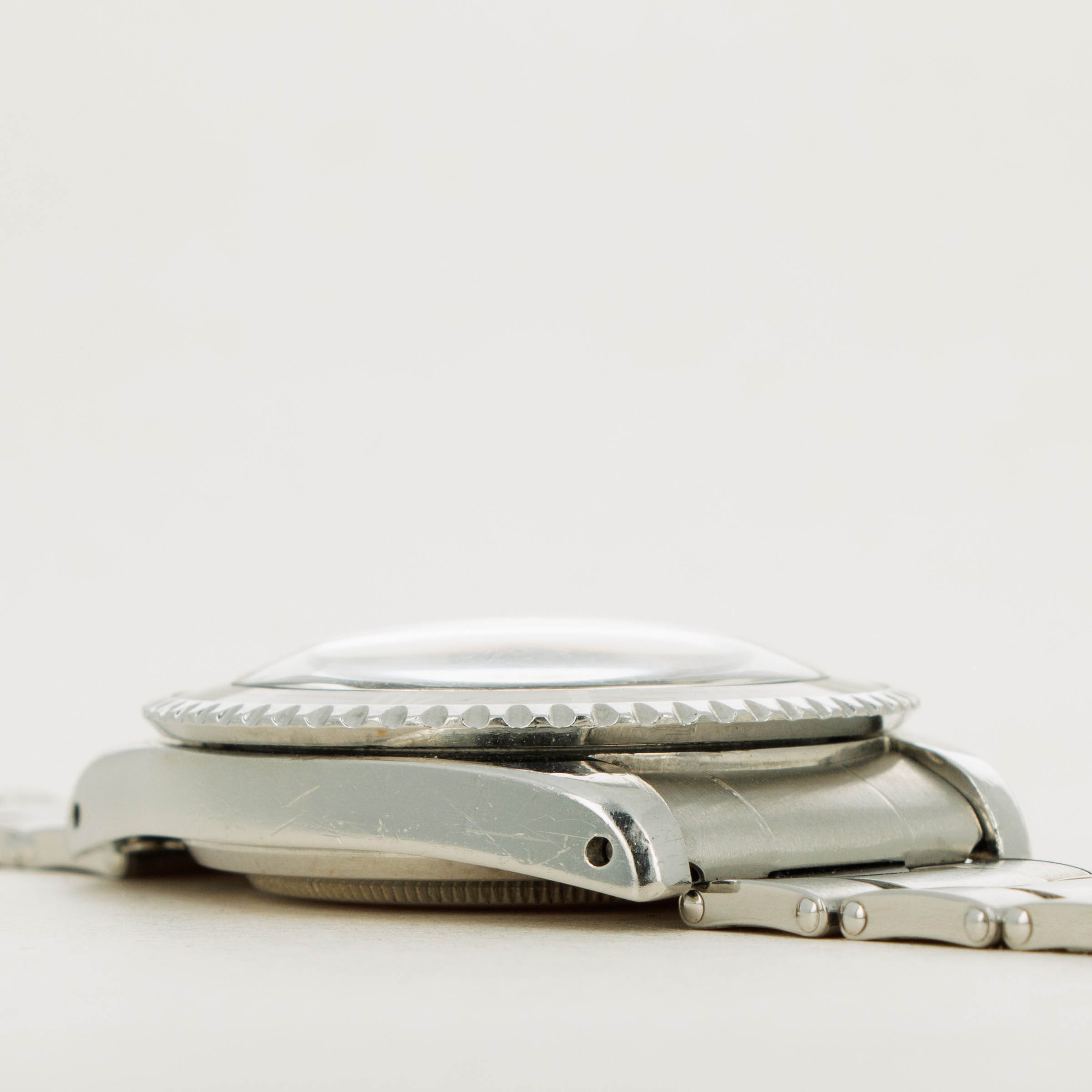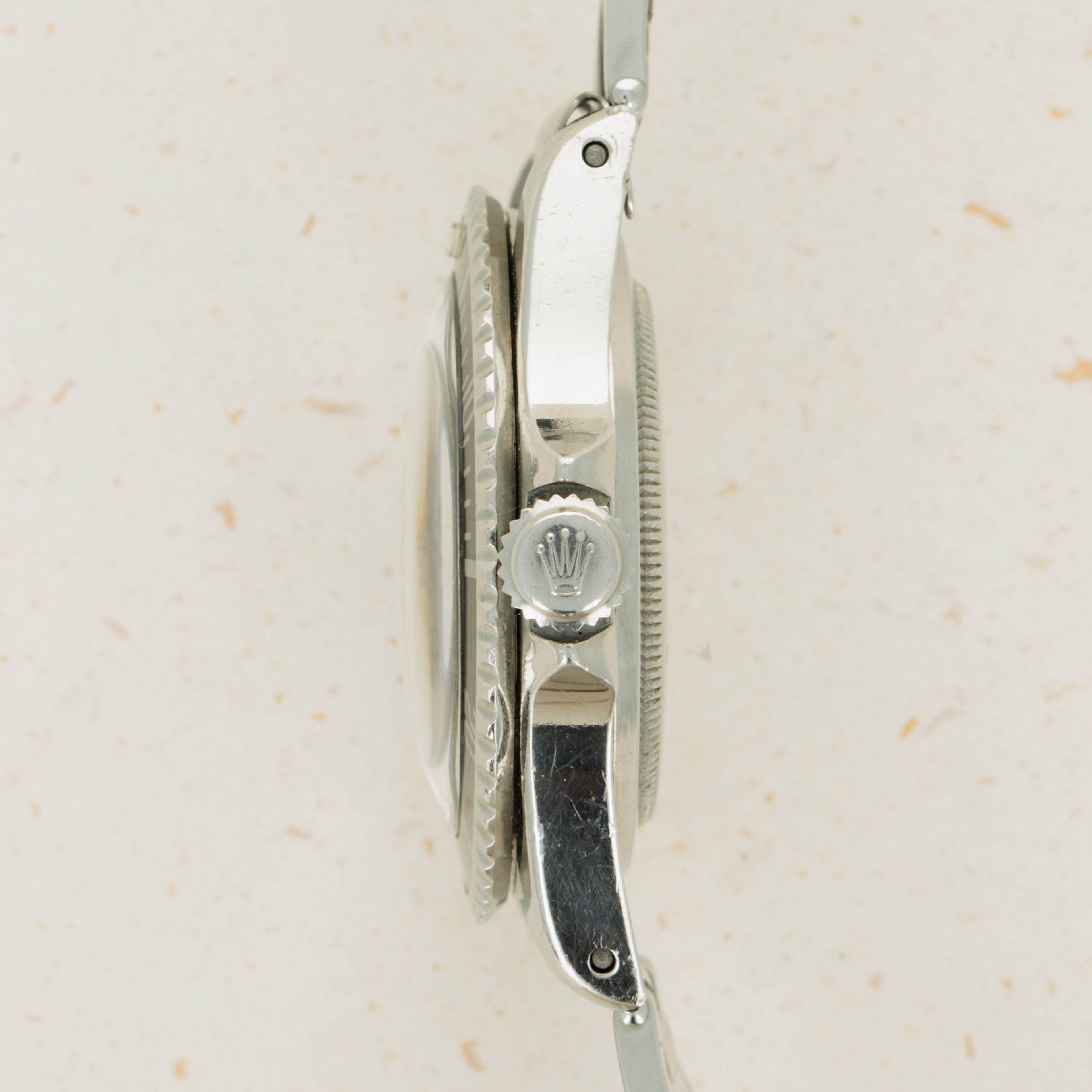 Offered as an exceptionally early example of the ref. 5513 from 1962, this ref. 5513 features a rare "Explorer dial" with 3-6-9 Arabic numerals like those seen on the Rolex Explorer. Additionally, those numerals and the dials accompanying indices and hands have a rich golden patina that is as stunning as it is unique. This is a "Kissing L" variation, as the L and E in rolex are very closely spaced, as if they are kissing.