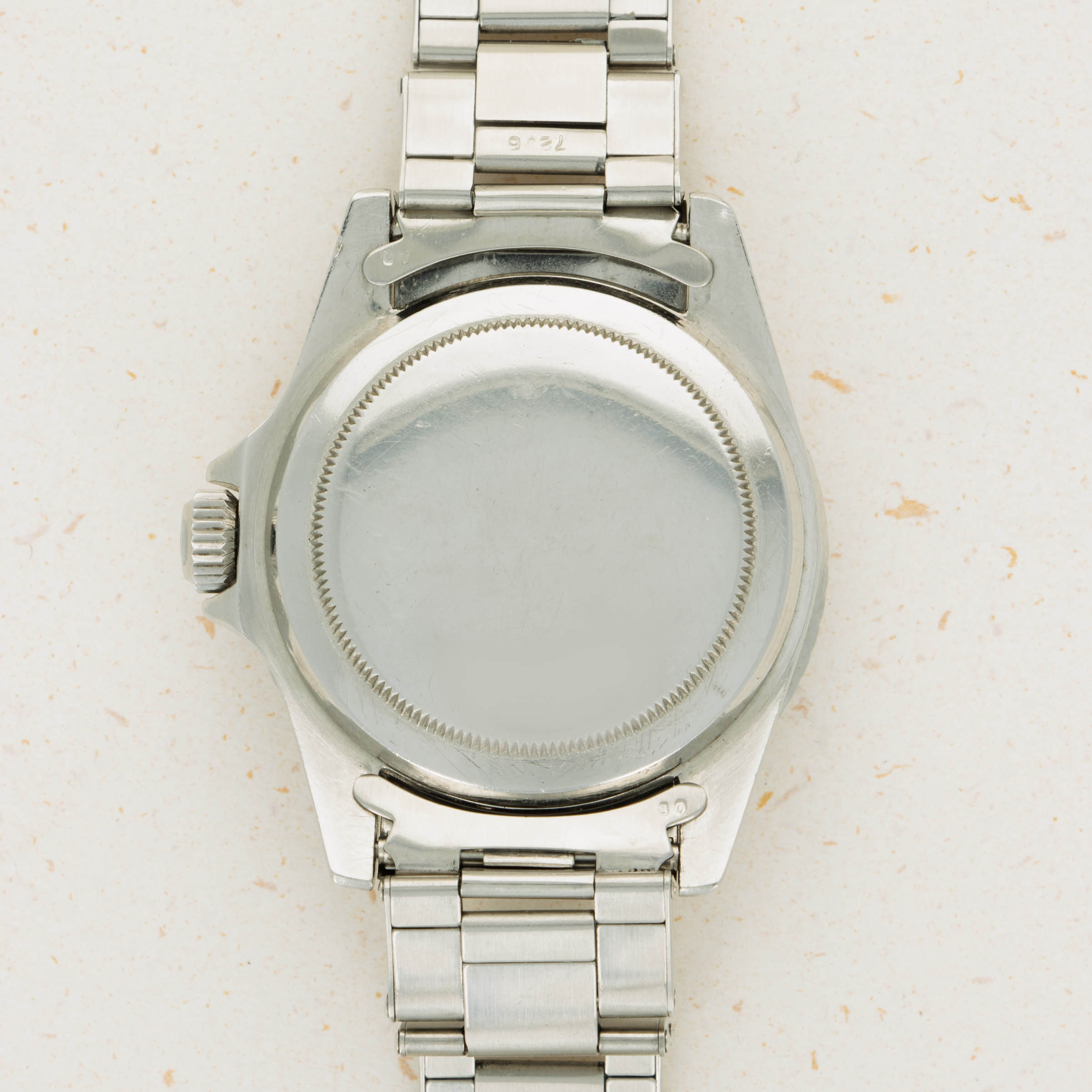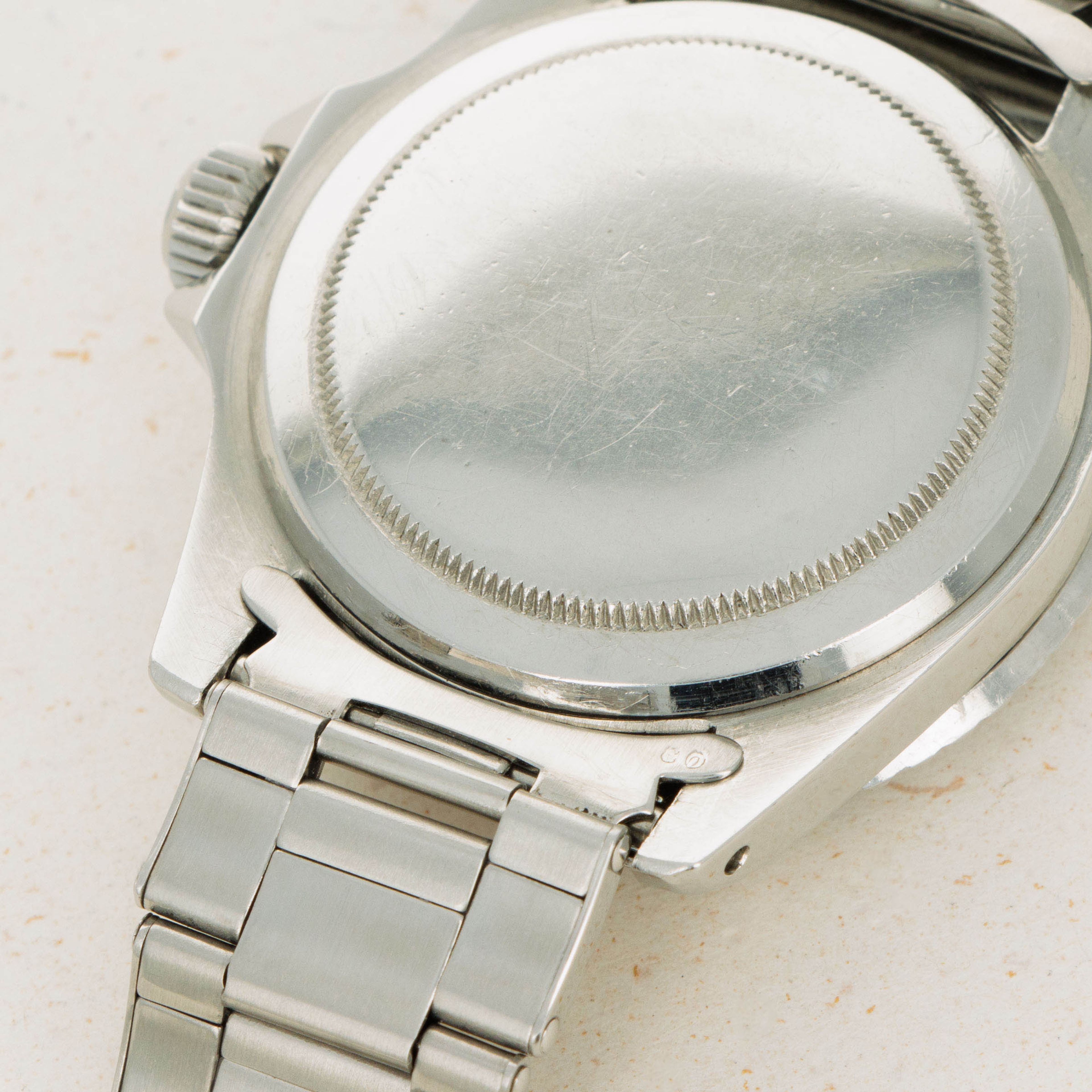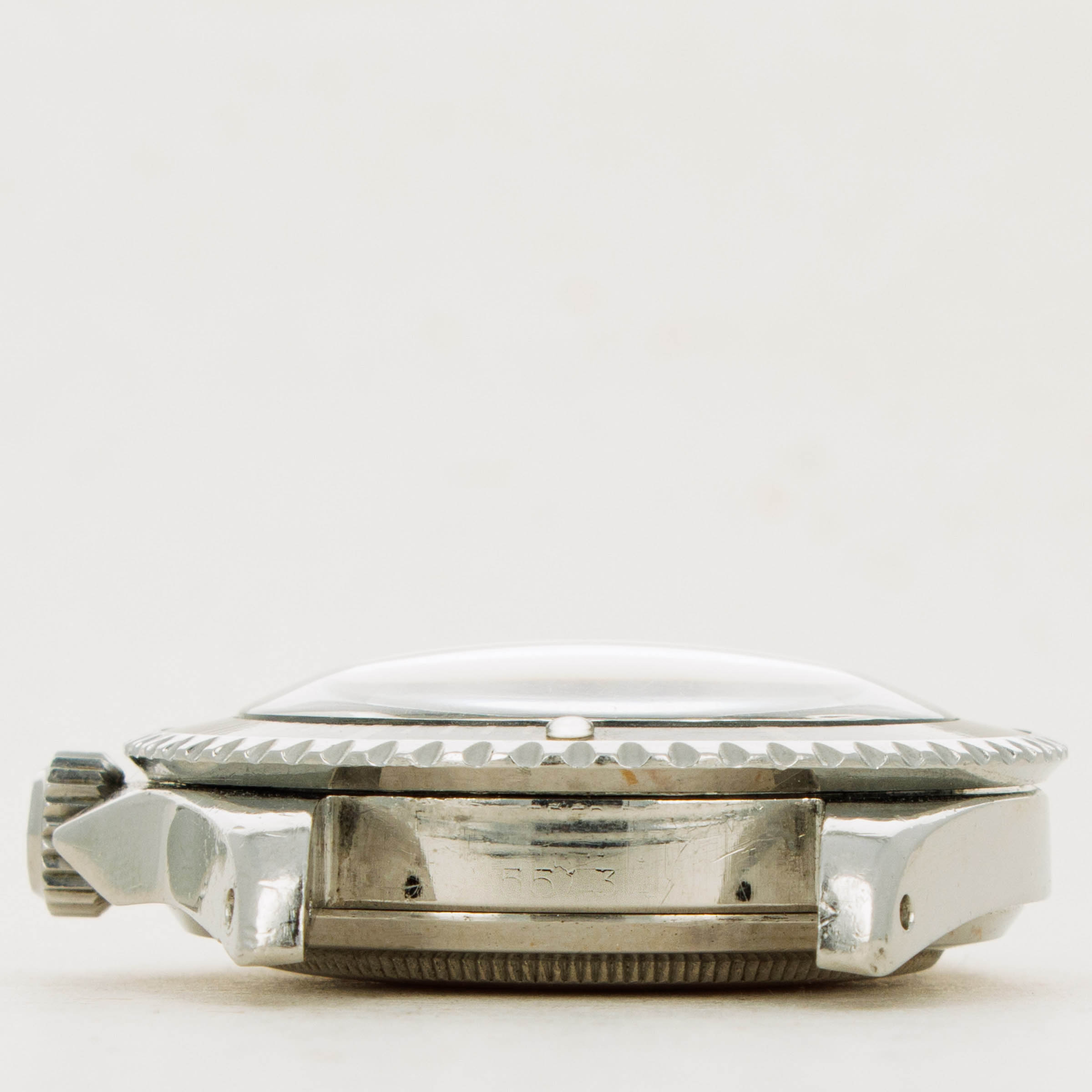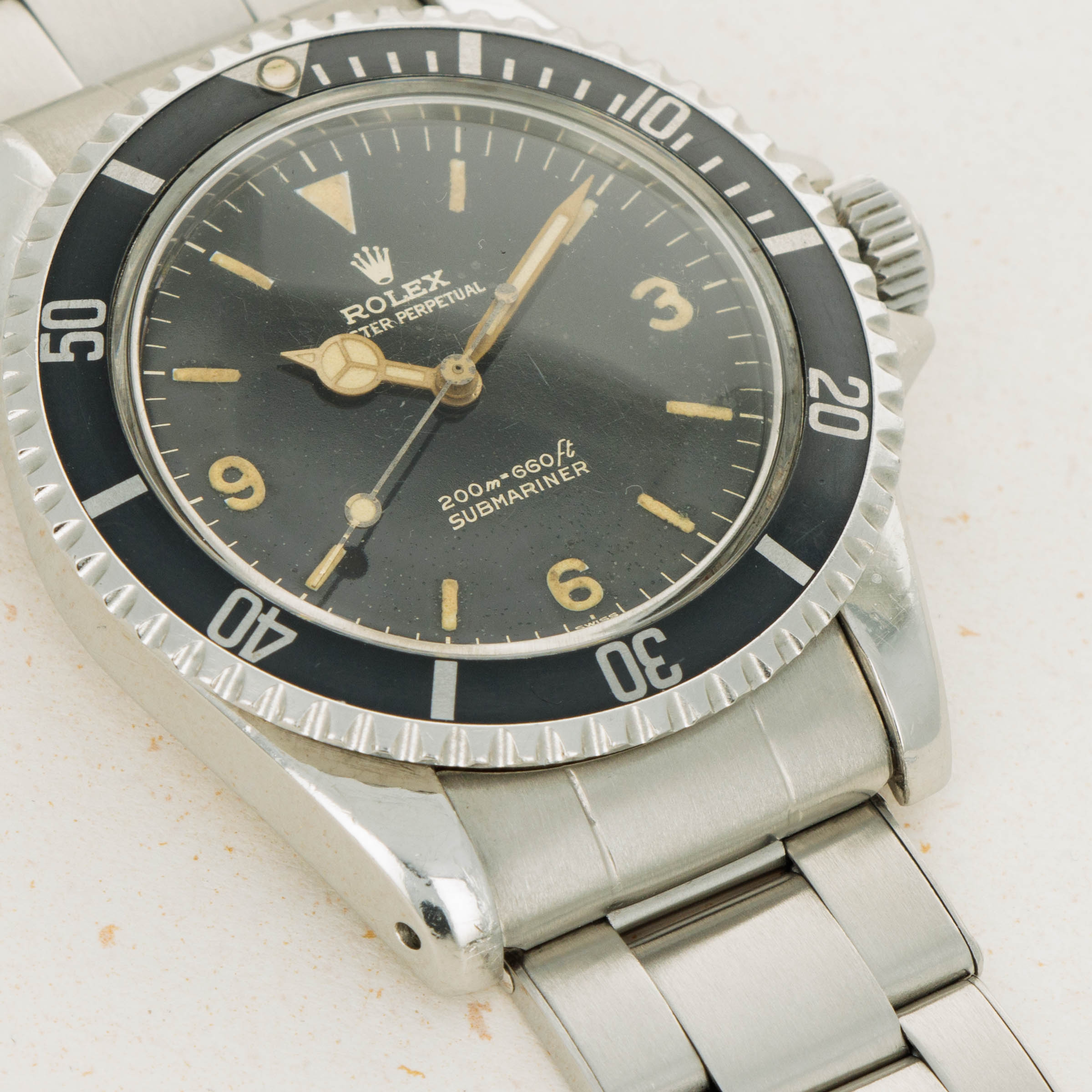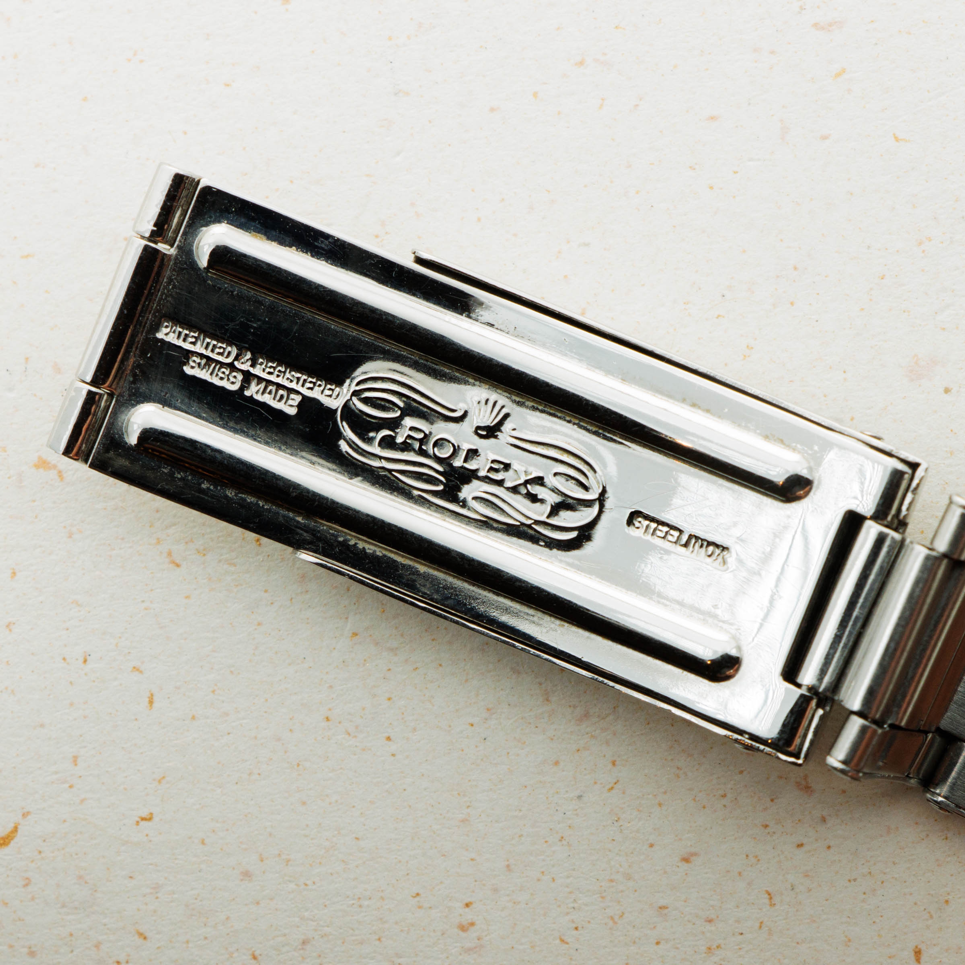 Offered as an exceptionally early example of the ref. 5513 from 1962, this ref. 5513 features a rare "Explorer dial" with 3-6-9 Arabic numerals like those seen on the Rolex Explorer. Additionally, those numerals and the dials accompanying indices and hands have a rich golden patina that is as stunning as it is unique. This is a "Kissing L" variation, as the L and E in rolex are very closely spaced, as if they are kissing.