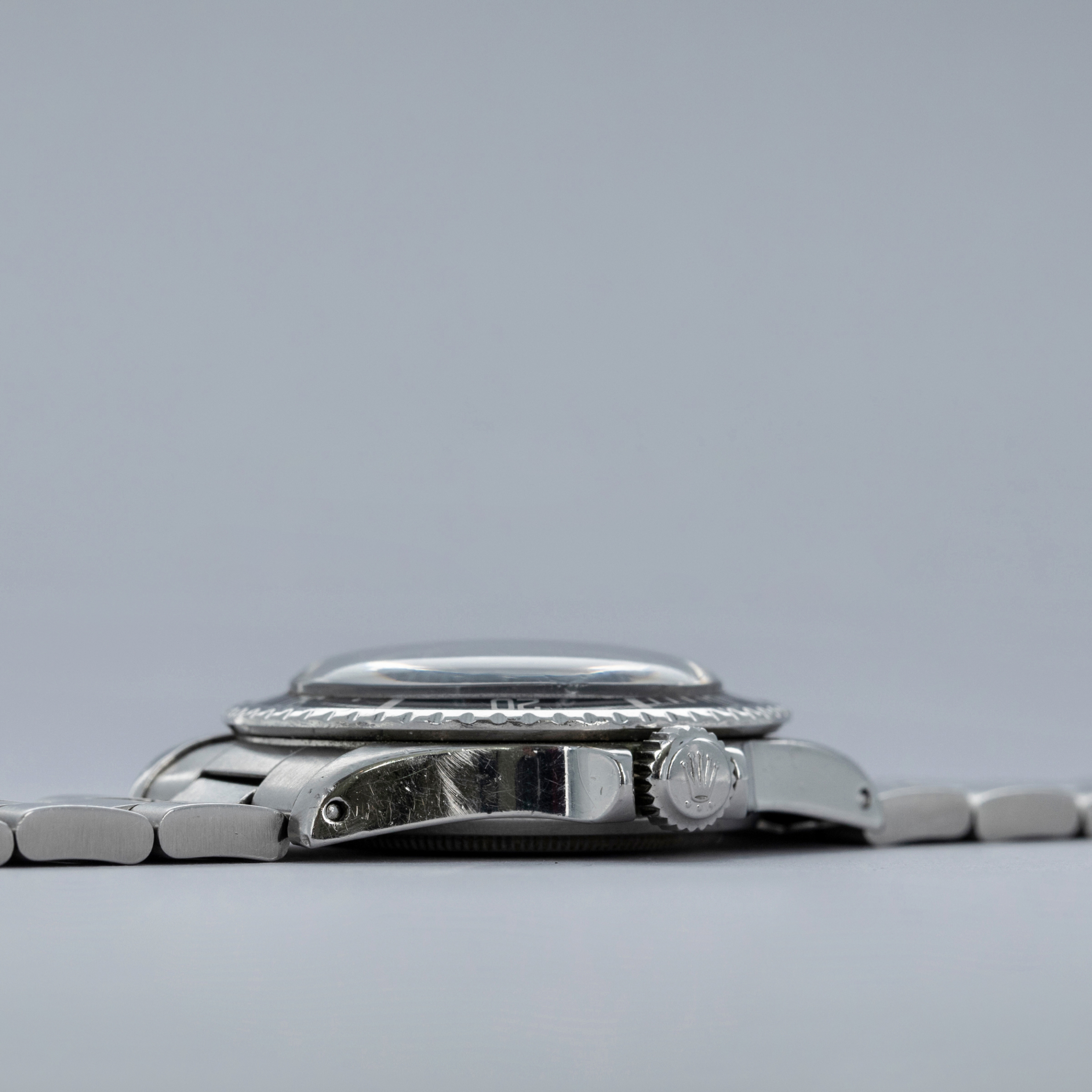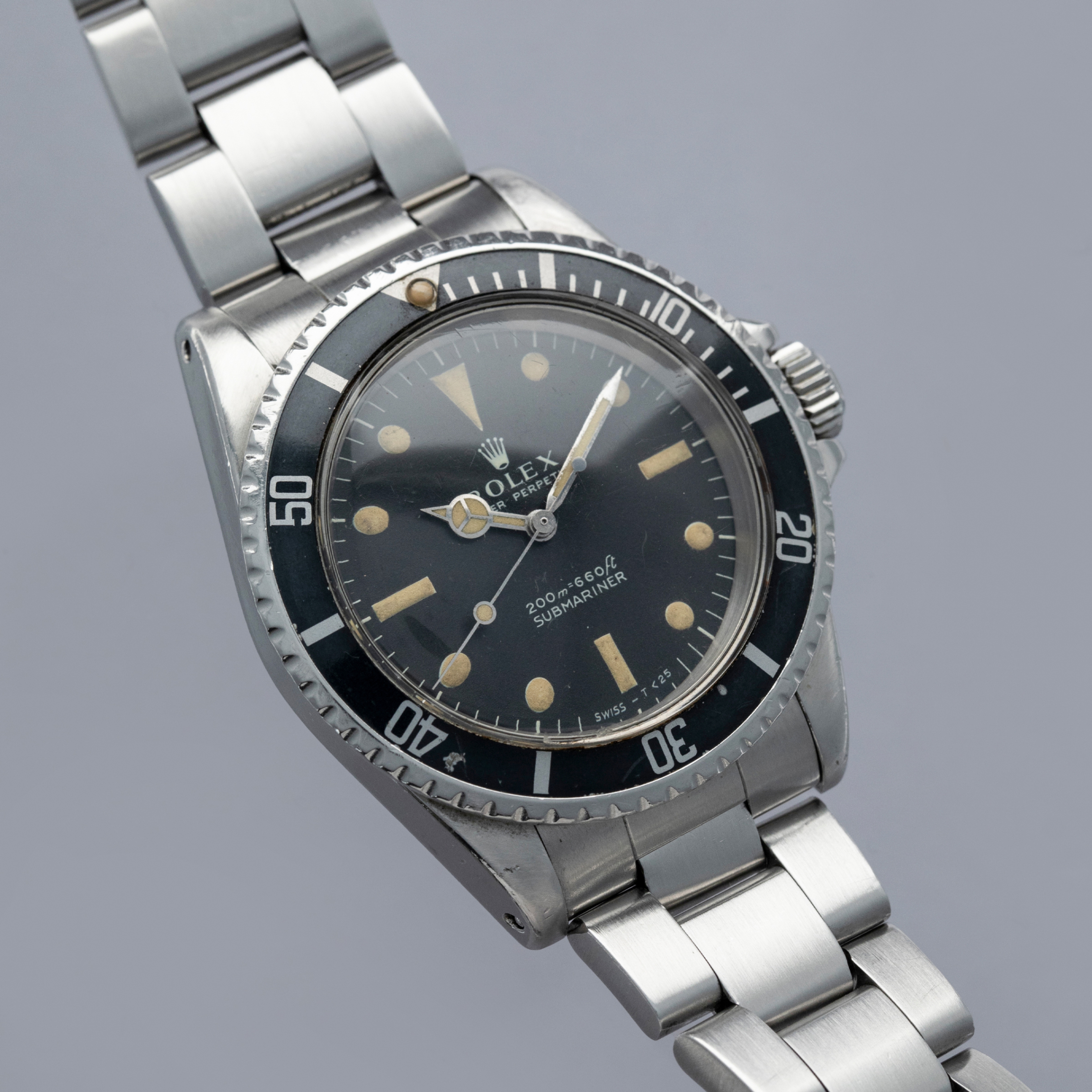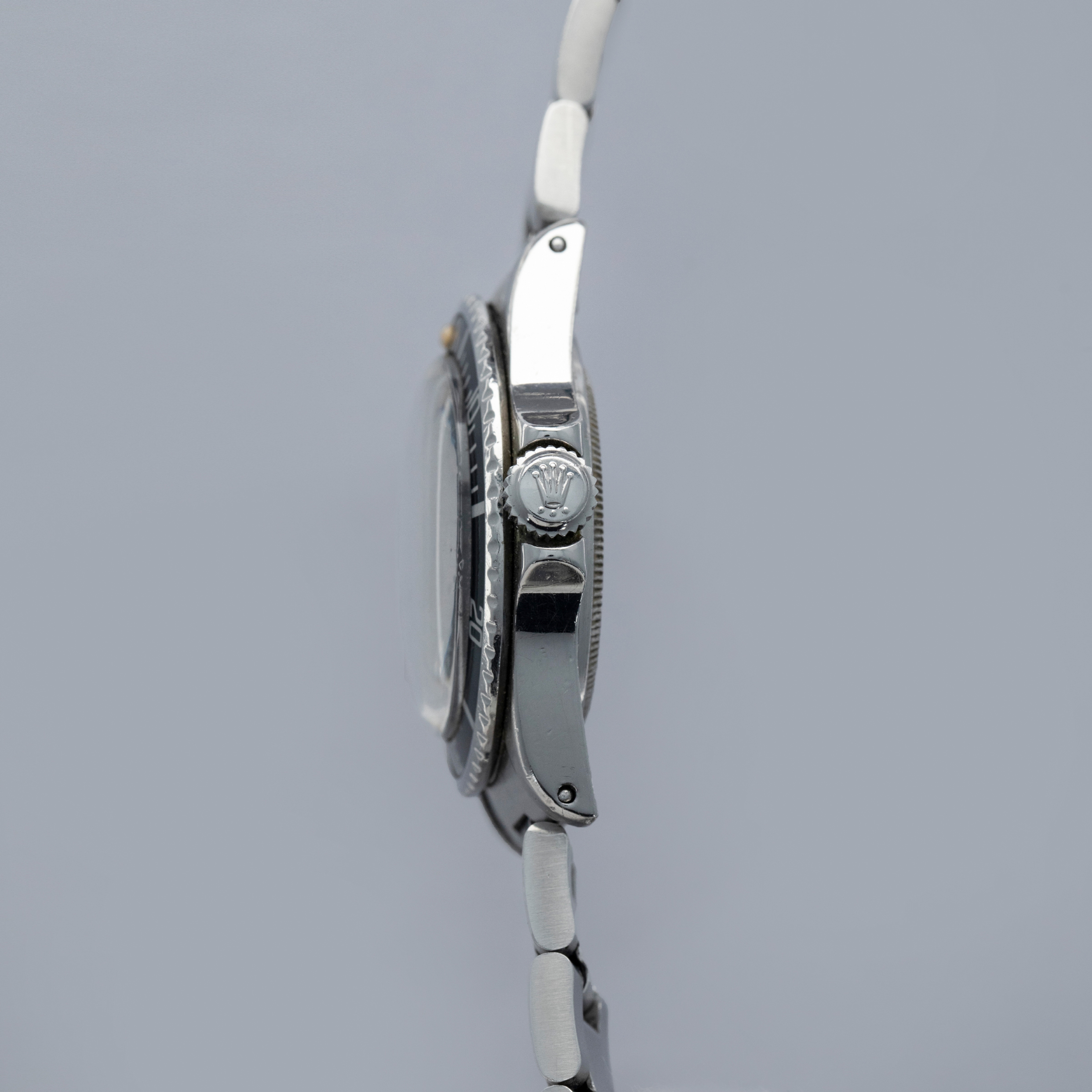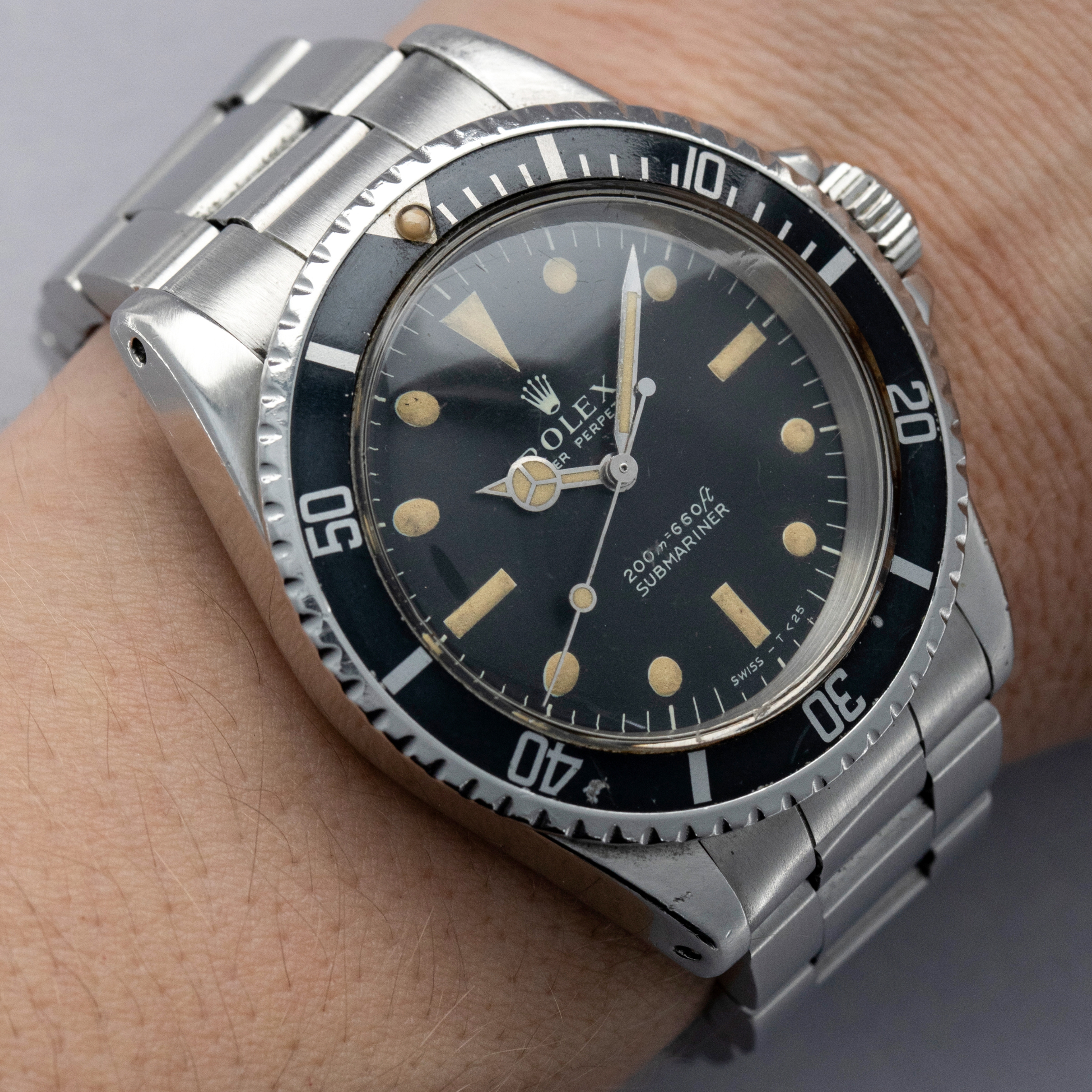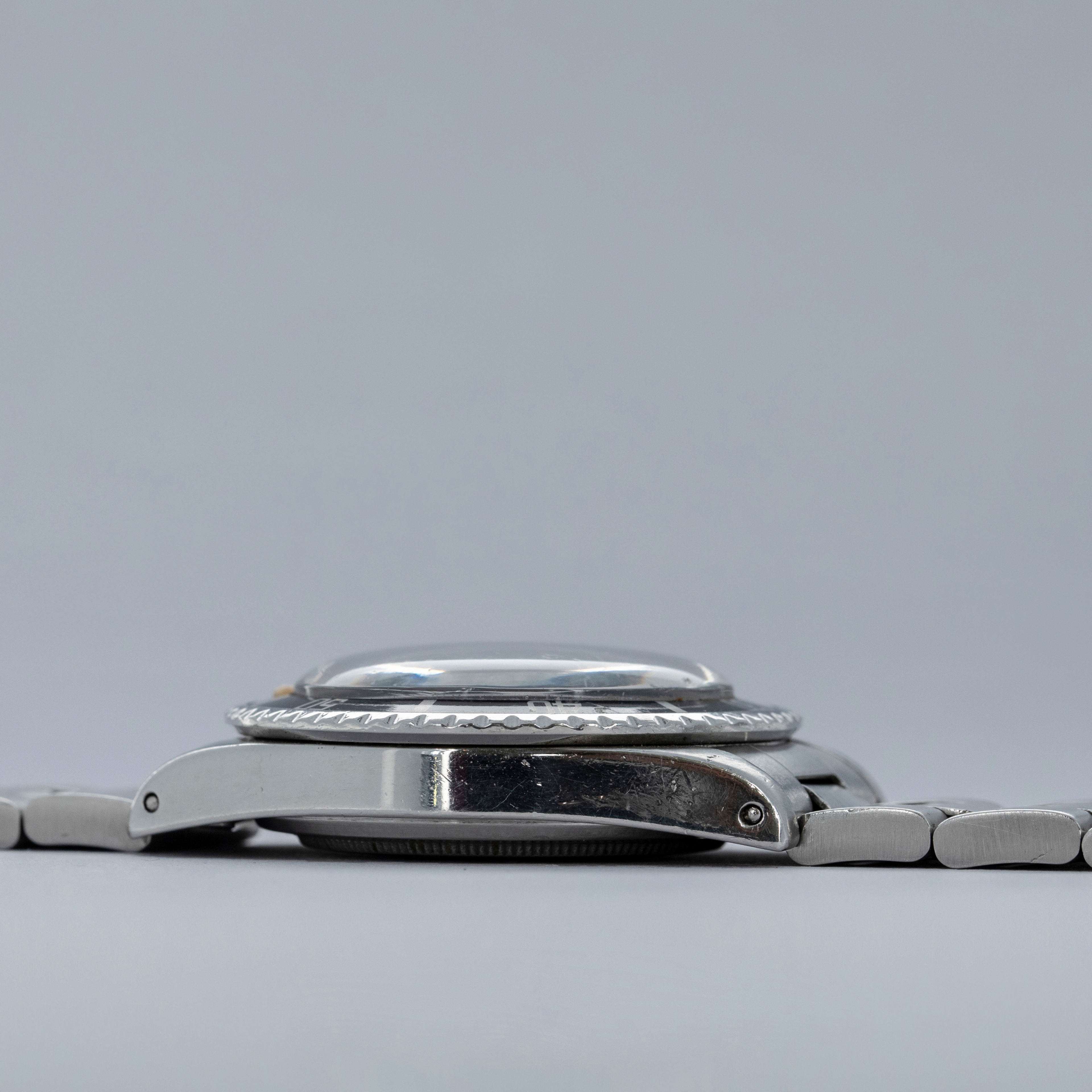 Watch is in very good overall condition, with a case that shows signs of previous polishing and some marks on the case and case back. lugs are soft and have lost some definition. The bezel remains well-defined, with a couple of visible marks on the insert. Dial in excellent condition, with signs of aging on the luminous plots. The hands are a good match to the hour markers in tone. The later solid link Oyster bracelet has moderate stretch and some notching. It is currently fitted for a 6.5" wrist, but there are 2 additional links that are included with the watch.