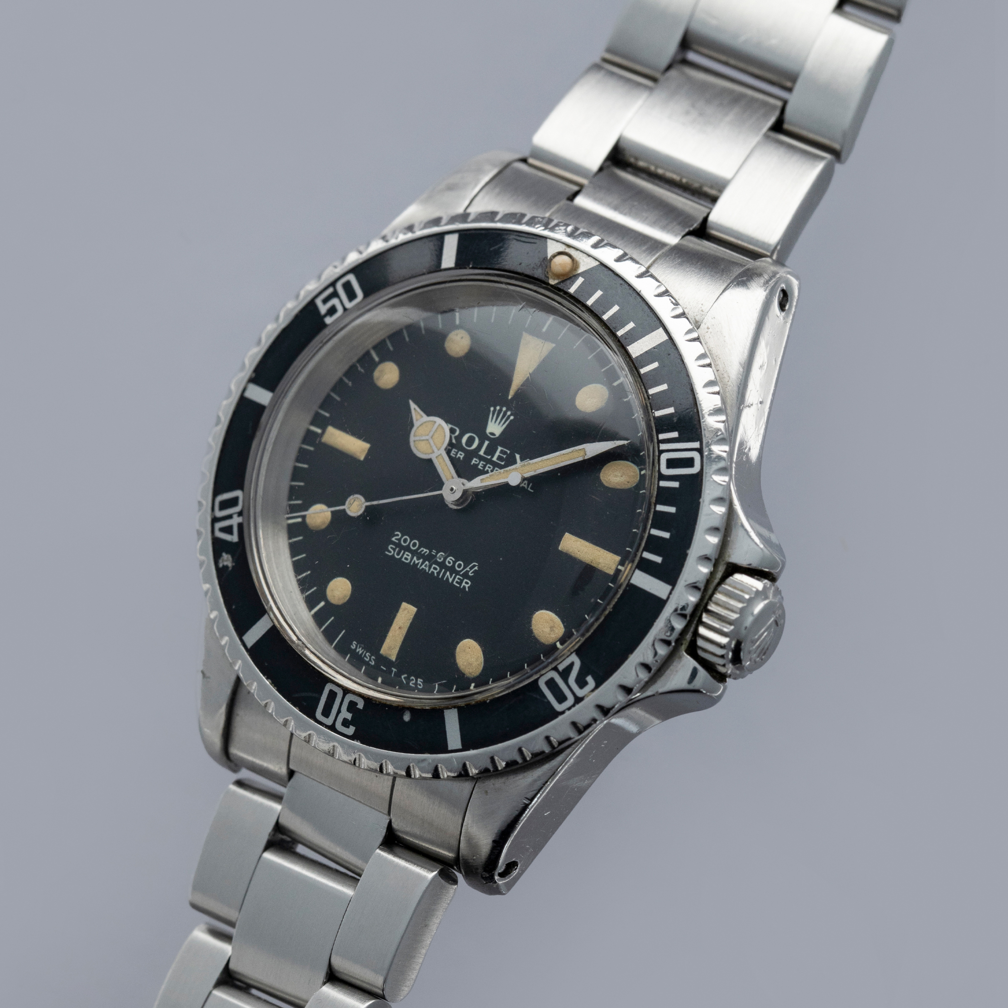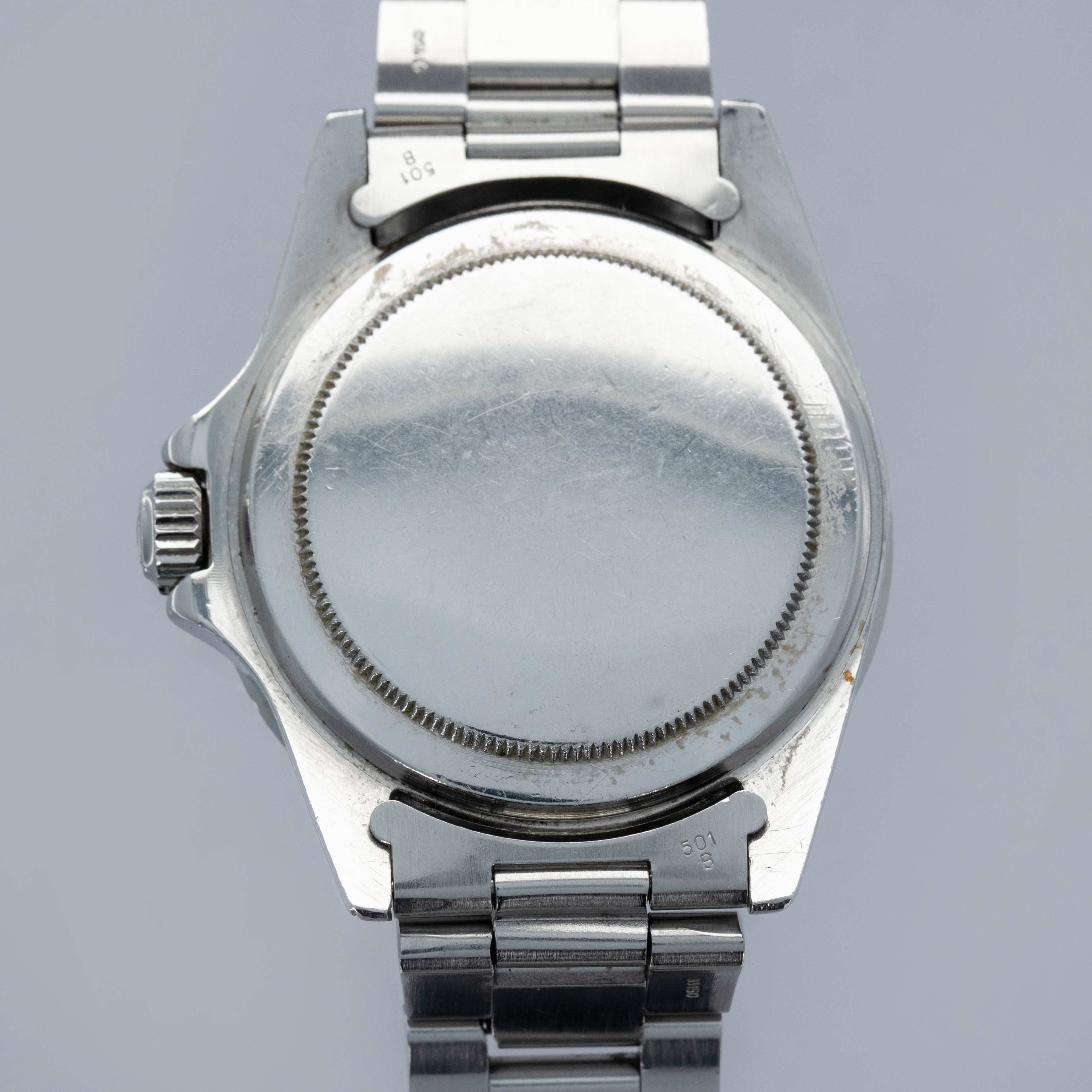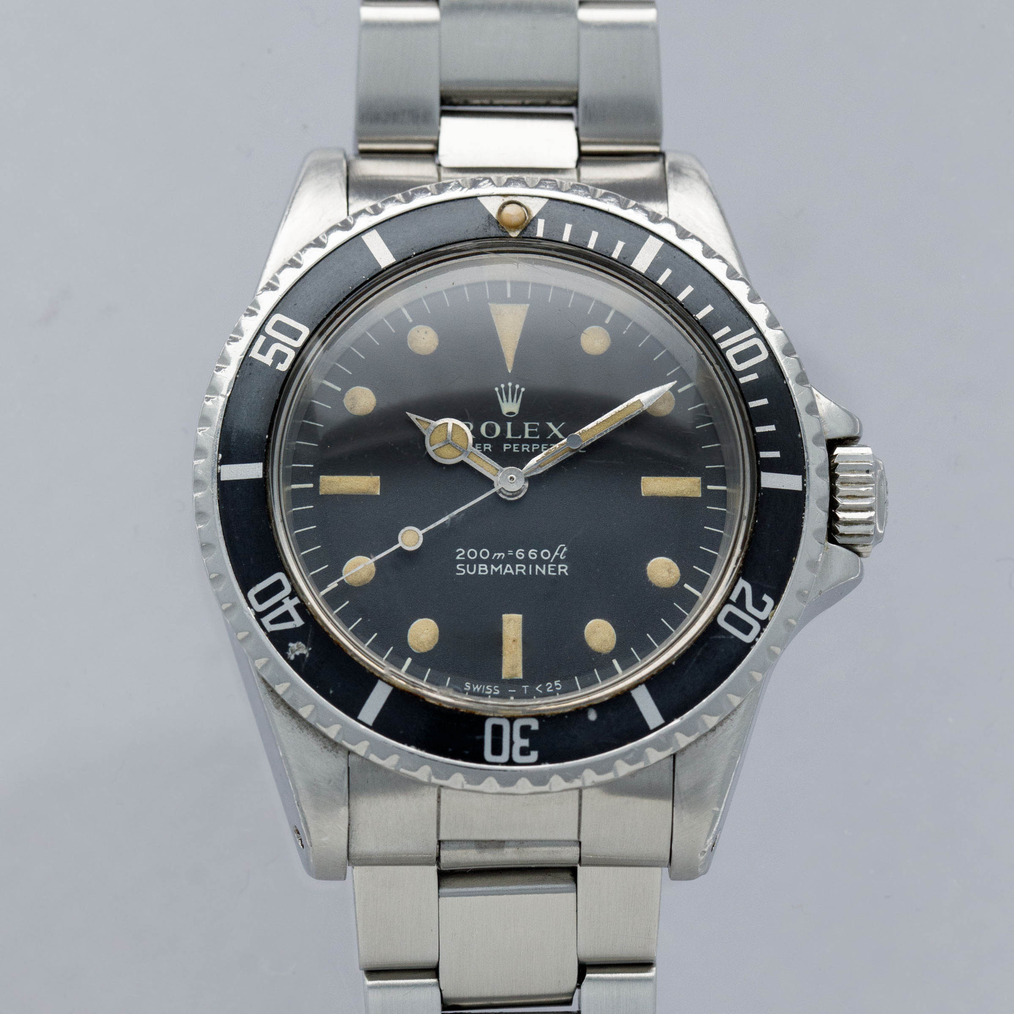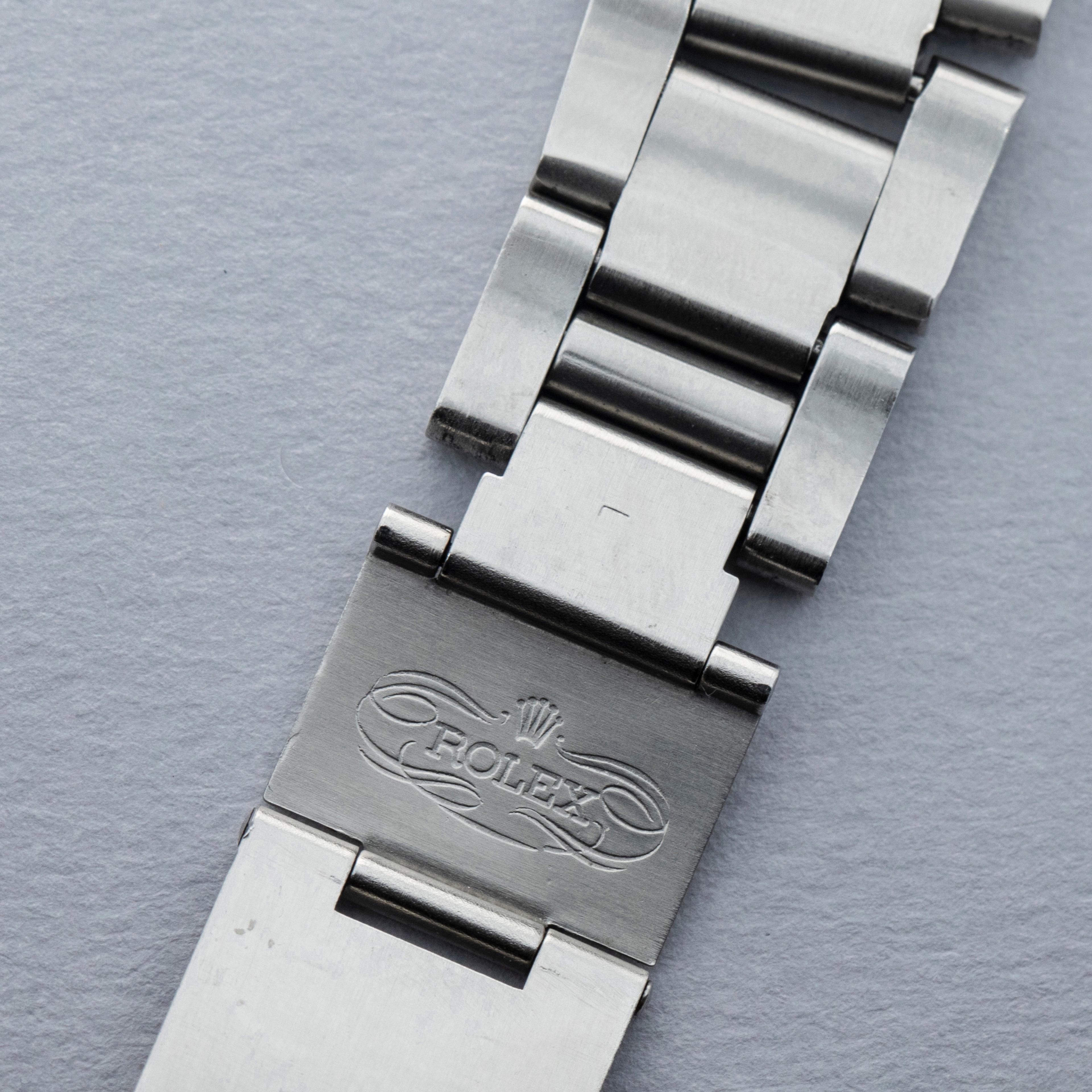 Watch is in very good overall condition, with a case that shows signs of previous polishing and some marks on the case and case back. lugs are soft and have lost some definition. The bezel remains well-defined, with a couple of visible marks on the insert. Dial in excellent condition, with signs of aging on the luminous plots. The hands are a good match to the hour markers in tone. The later solid link Oyster bracelet has moderate stretch and some notching. It is currently fitted for a 6.5" wrist, but there are 2 additional links that are included with the watch.
