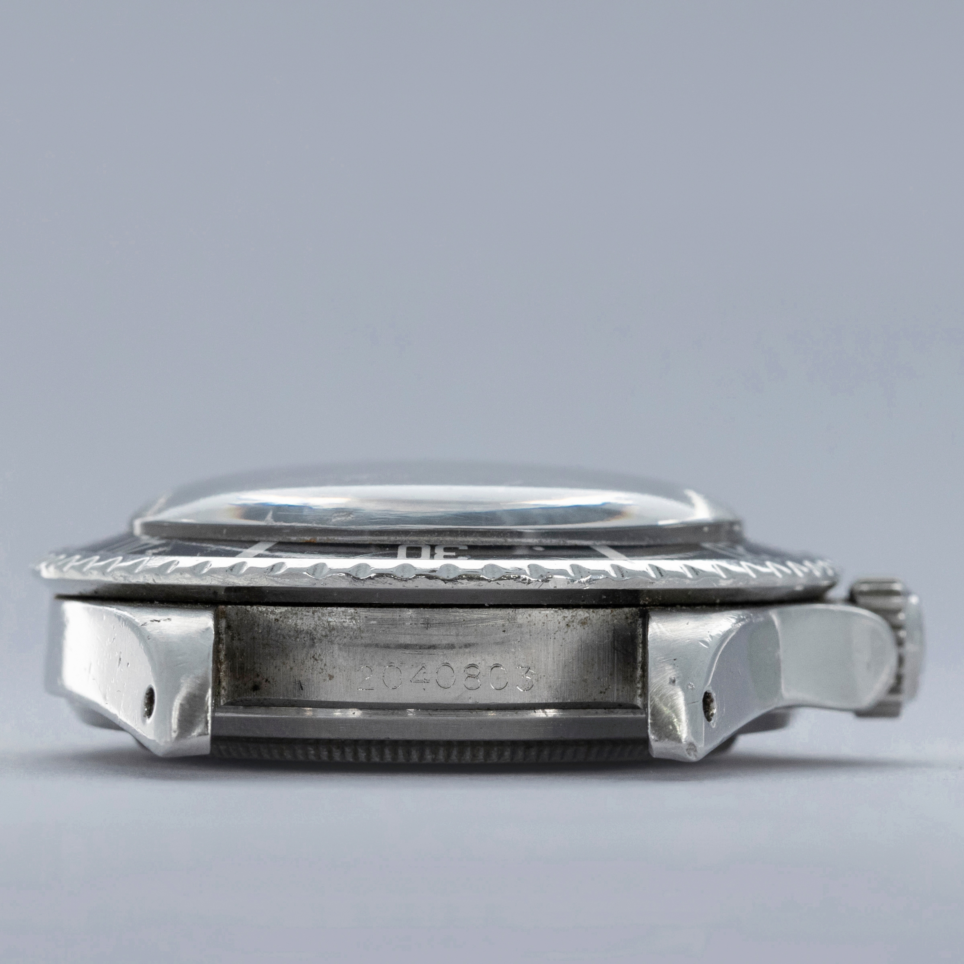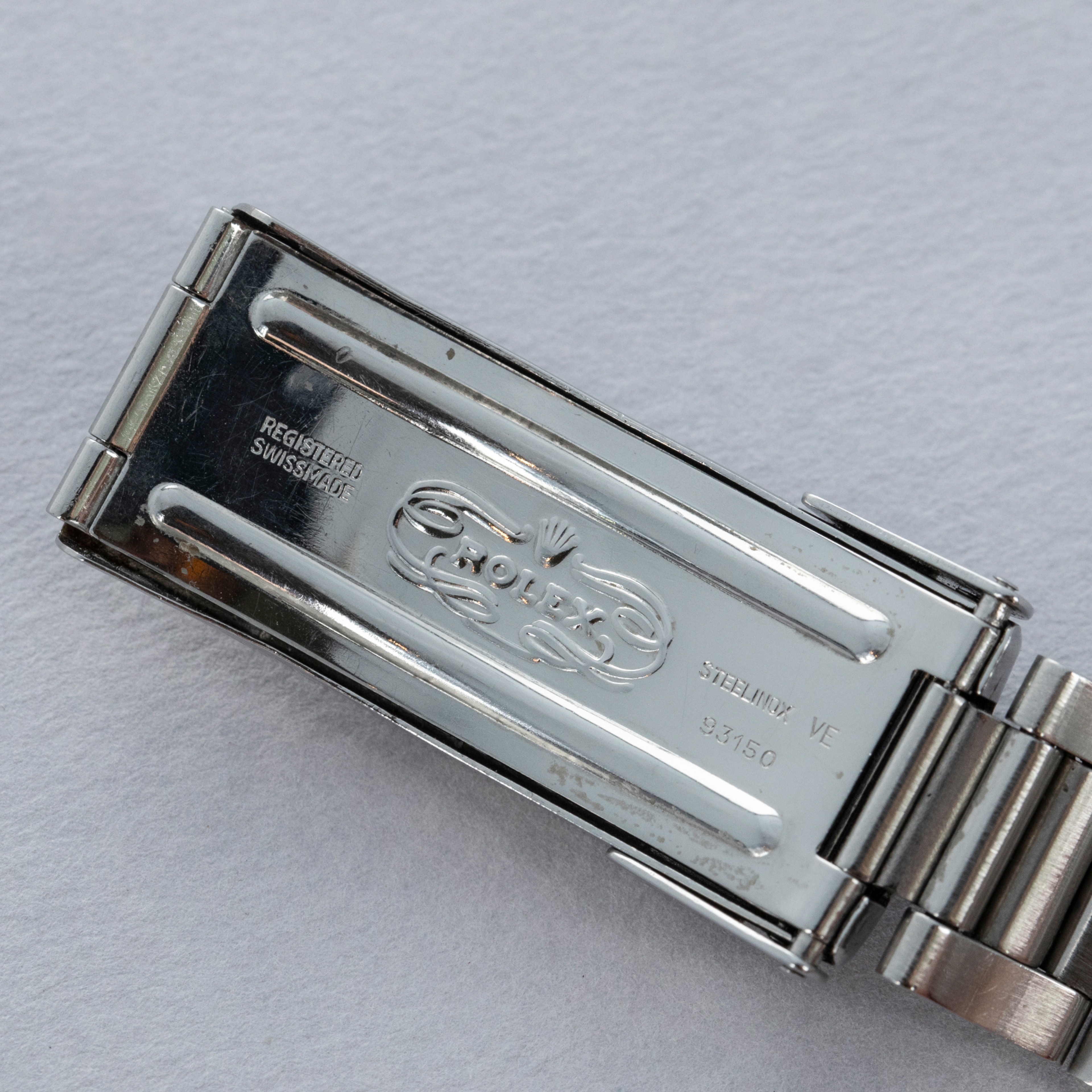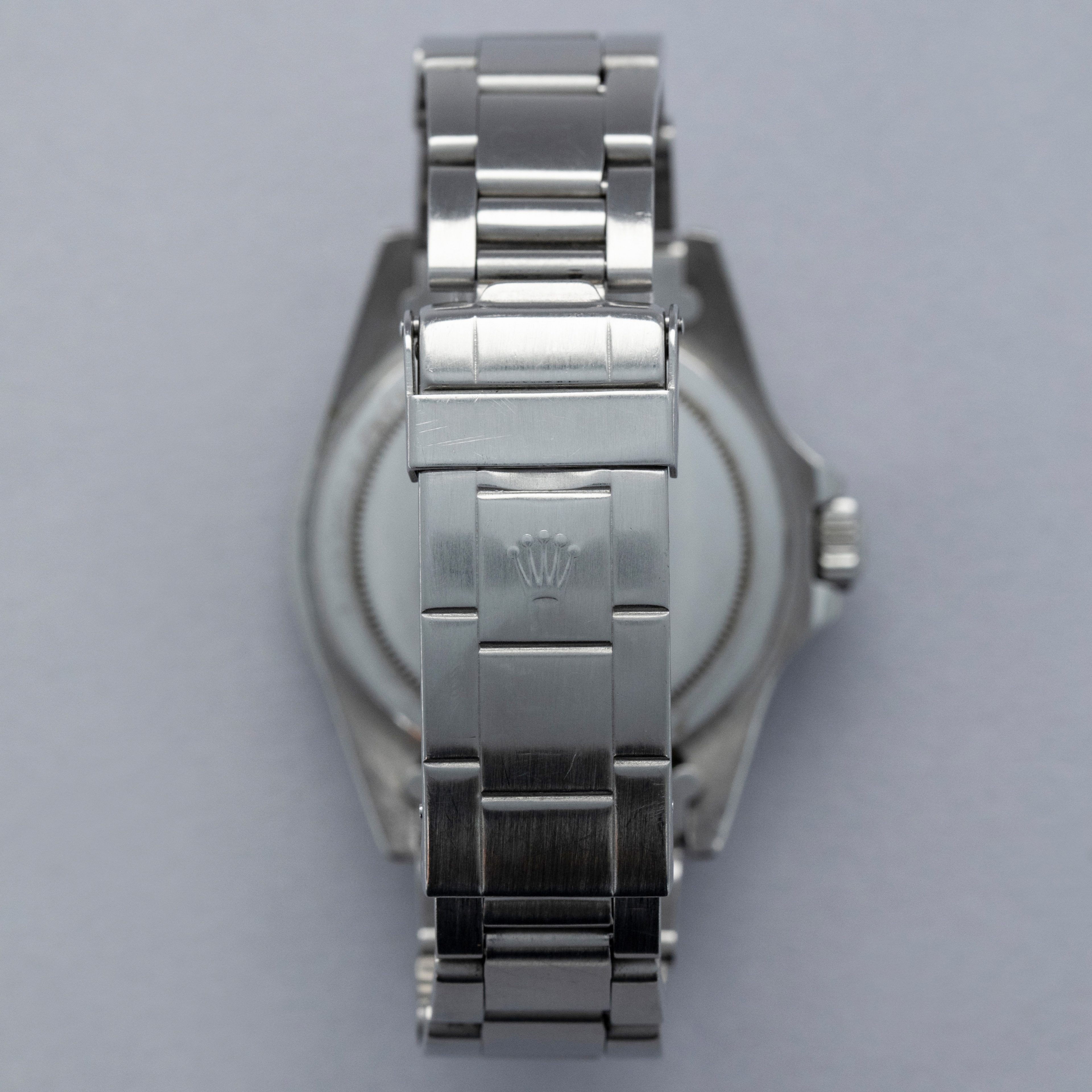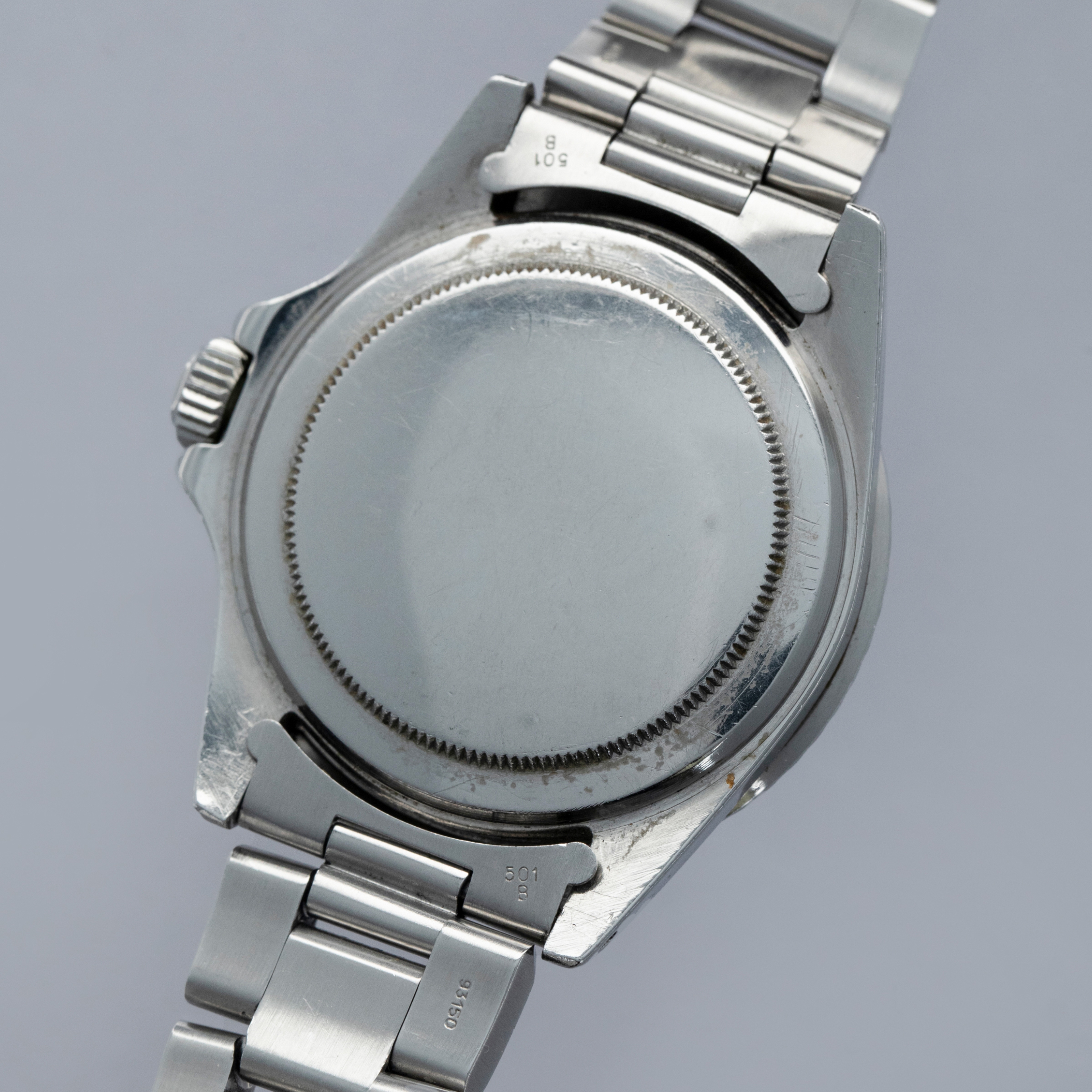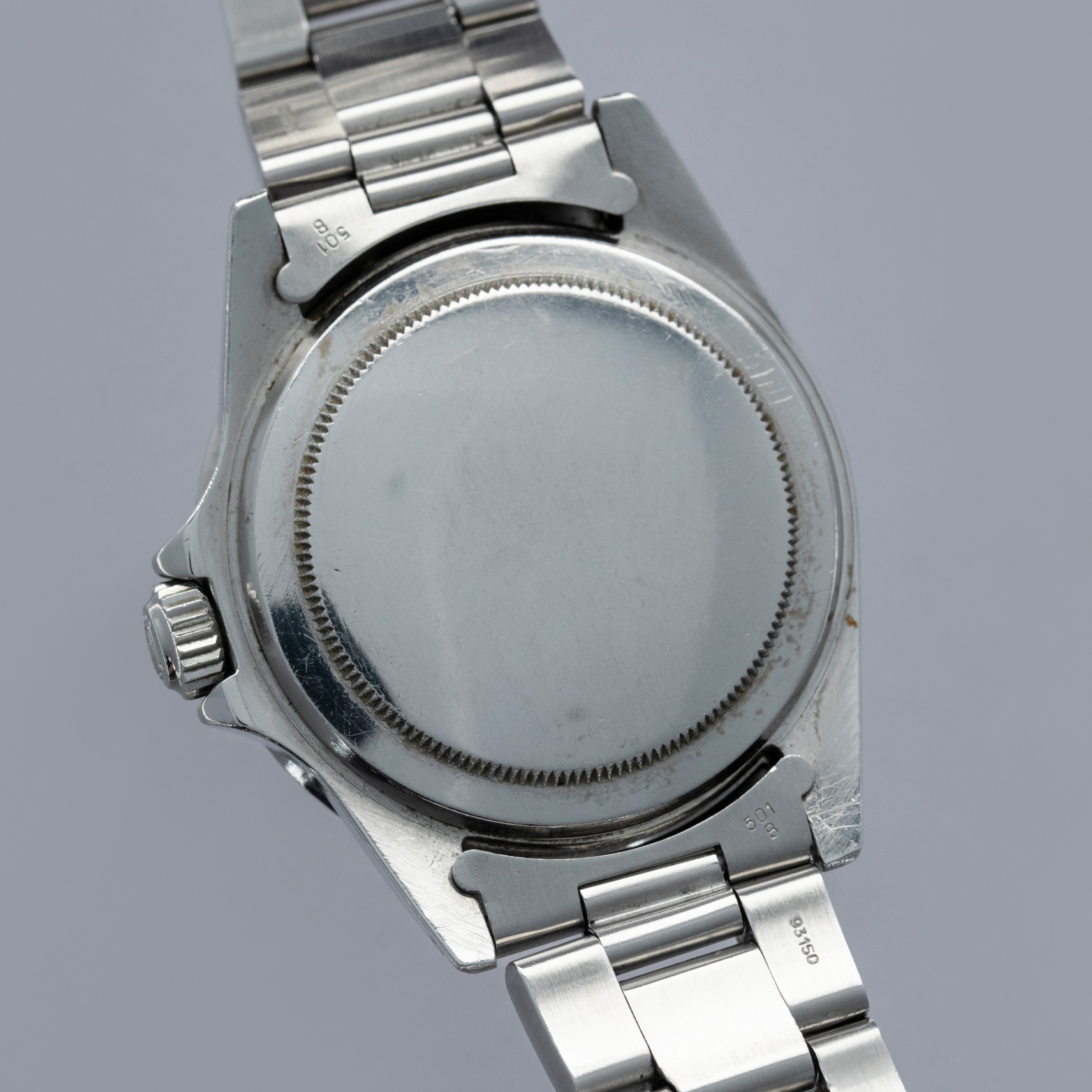 Watch is in very good overall condition, with a case that shows signs of previous polishing and some marks on the case and case back. lugs are soft and have lost some definition. The bezel remains well-defined, with a couple of visible marks on the insert. Dial in excellent condition, with signs of aging on the luminous plots. The hands are a good match to the hour markers in tone. The later solid link Oyster bracelet has moderate stretch and some notching. It is currently fitted for a 6.5" wrist, but there are 2 additional links that are included with the watch.