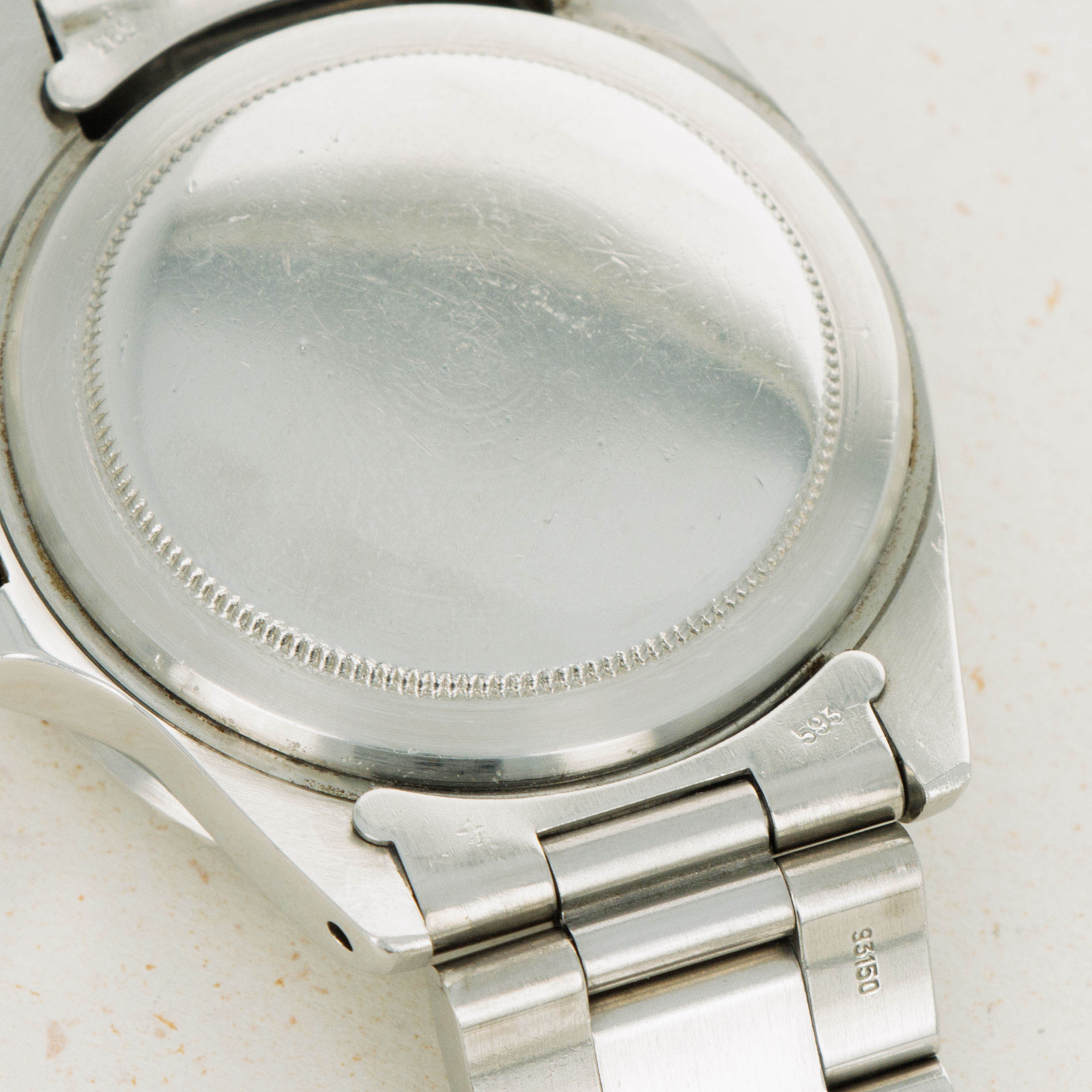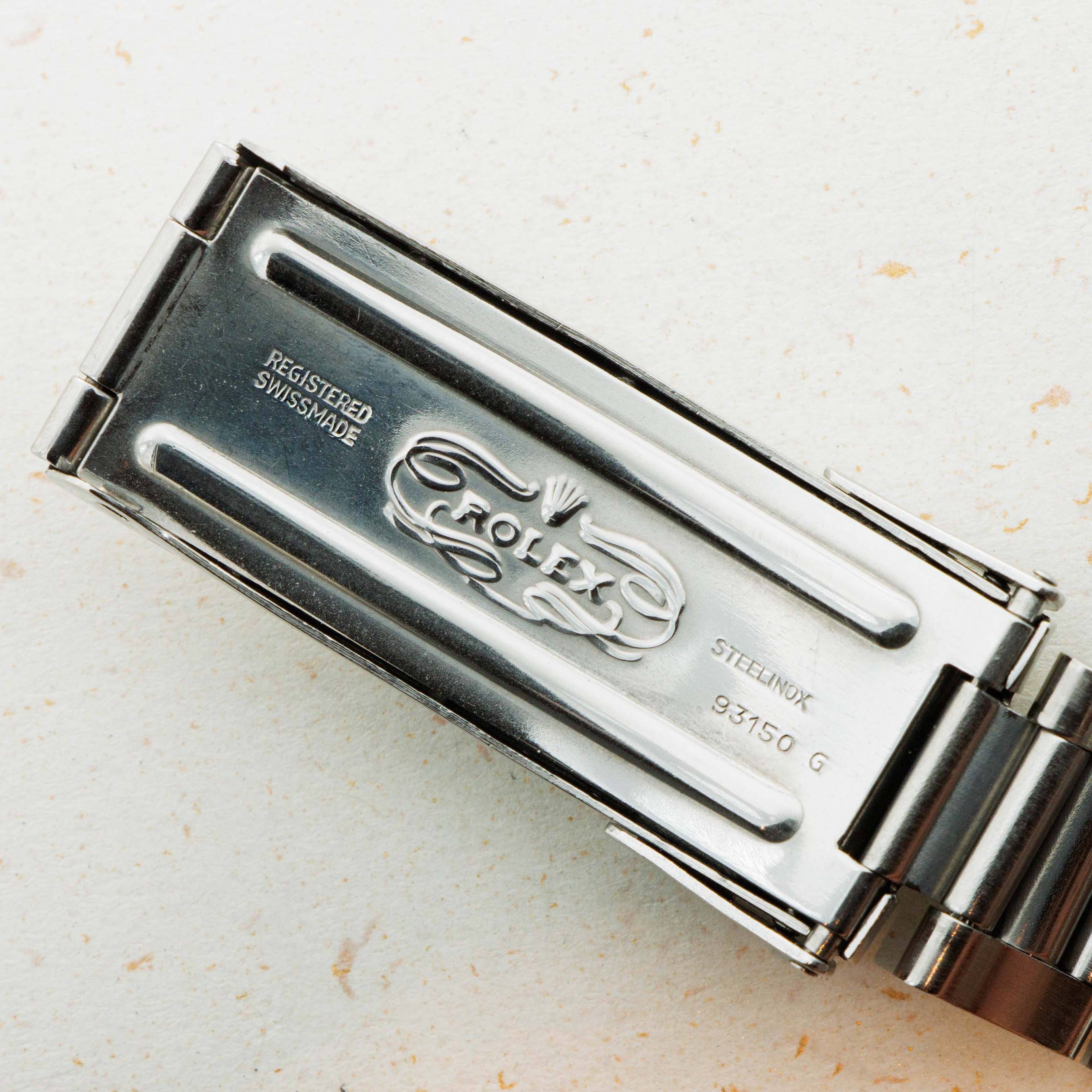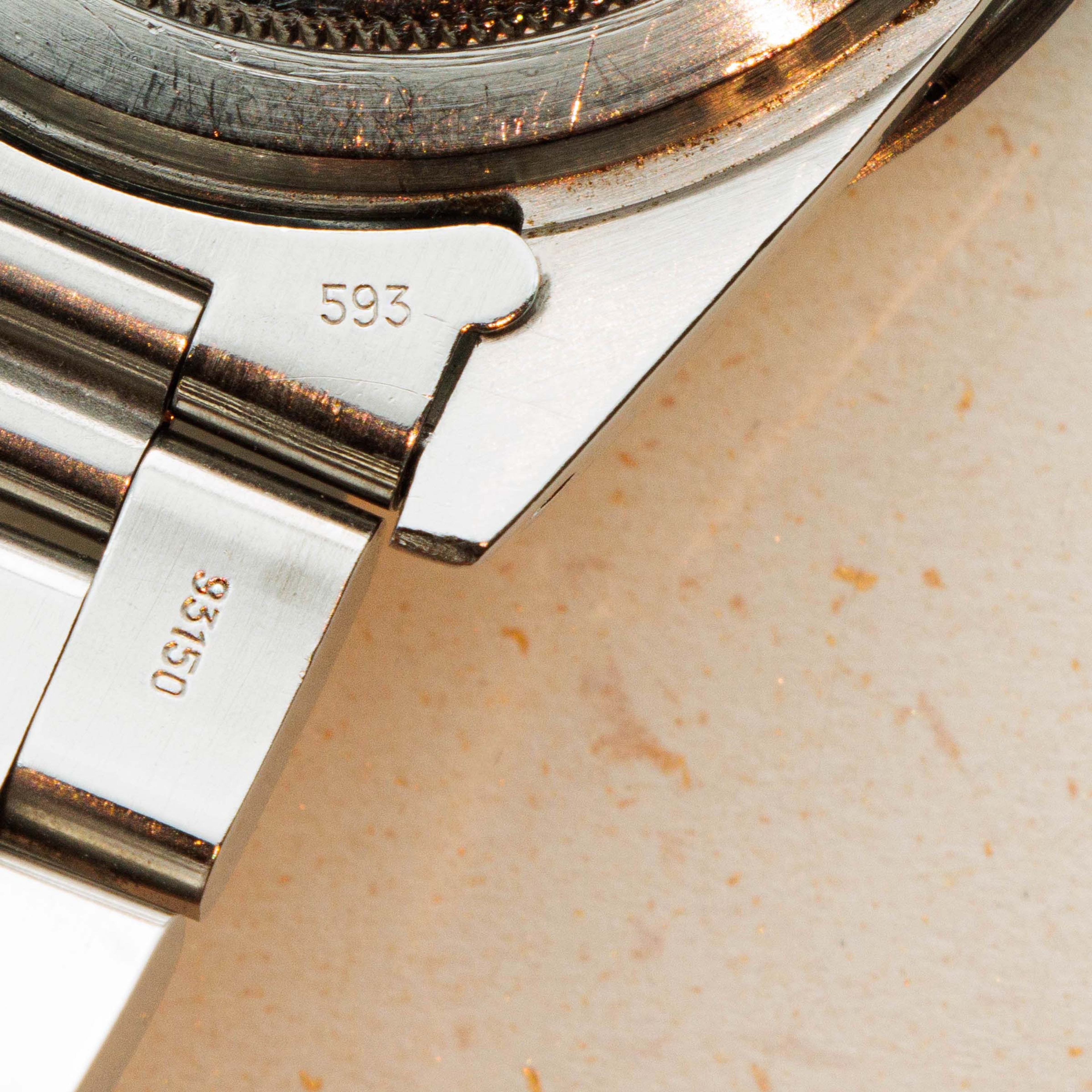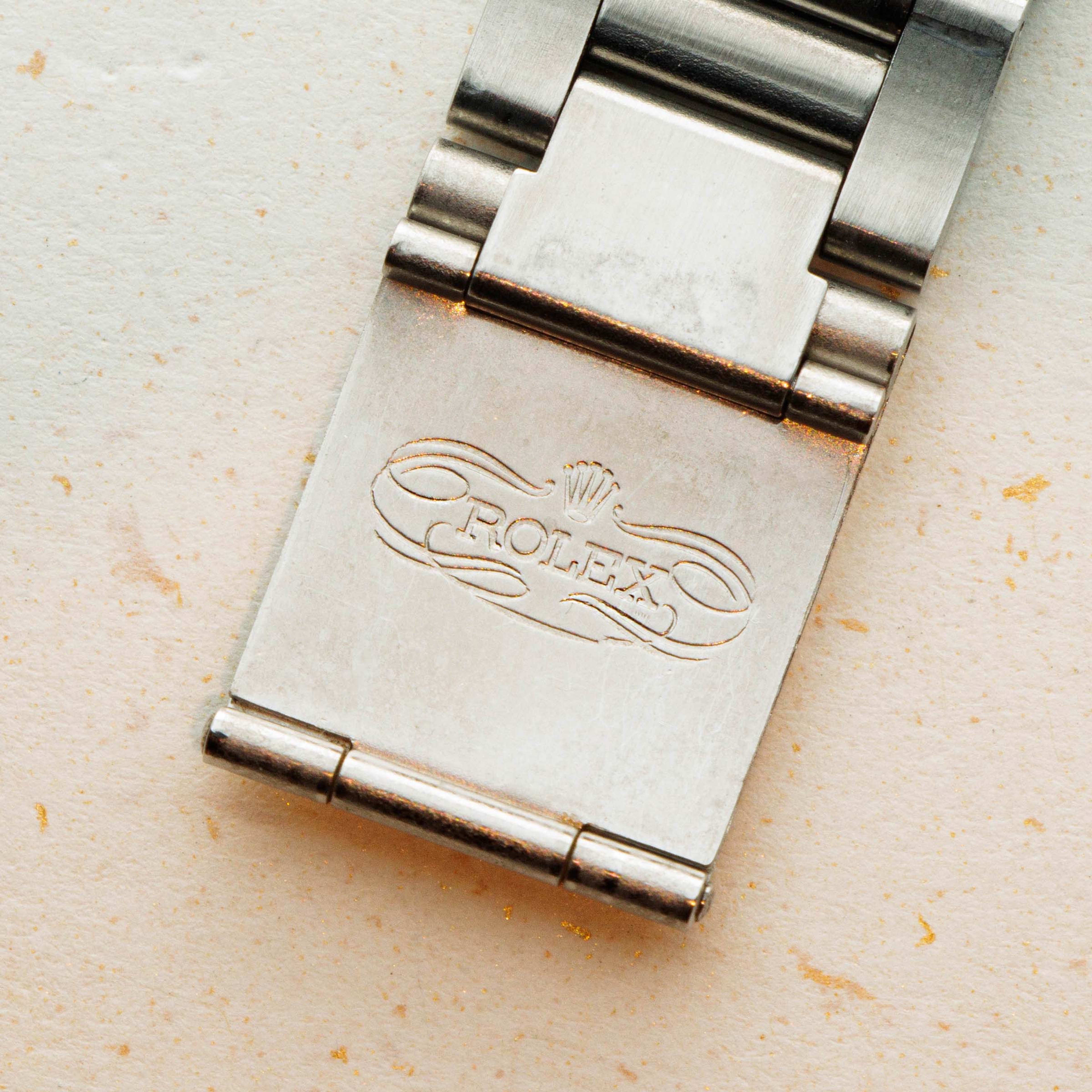 Watch is in very good overall condition. The case shows light surface wear including some mild corrosion between the lugs- the numbers are clear and legible and not obstructed by this. Bezel insert has an aftermarket pearl installed. The maxi-dial was fitted during a service at Rolex sometime in the past. It is near-mint and shows a light patina. The bracelet has 10 links currently fitted with two additional on the side.