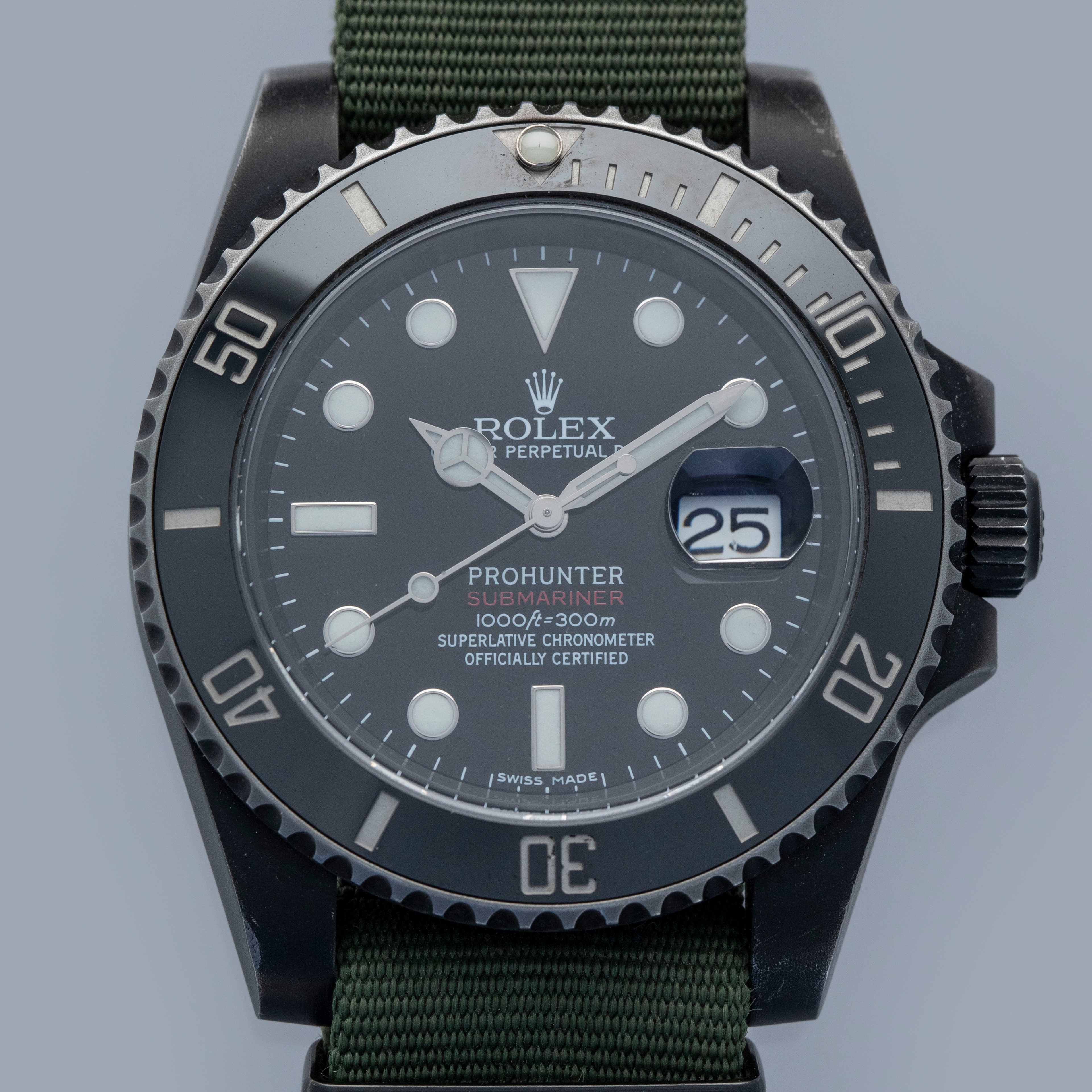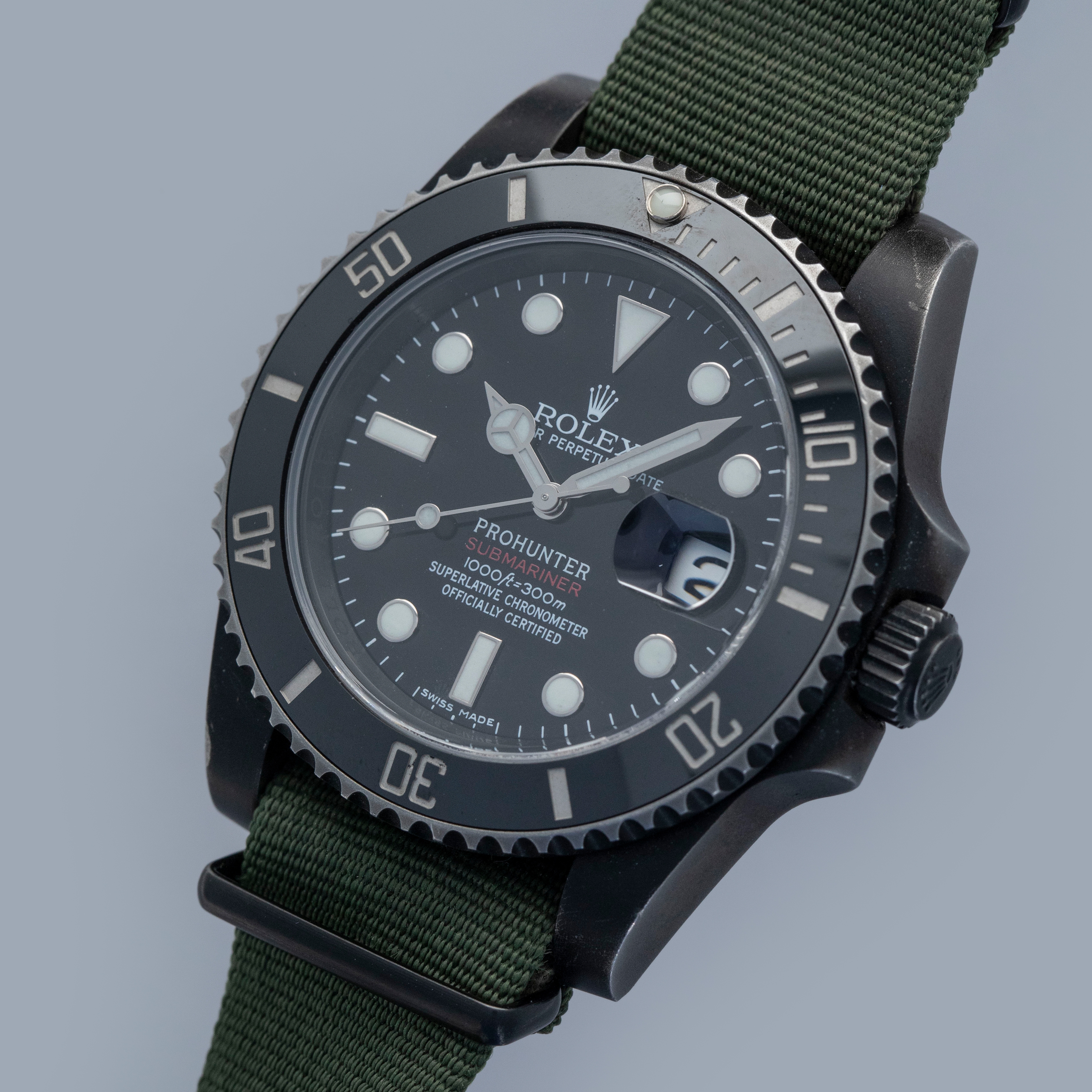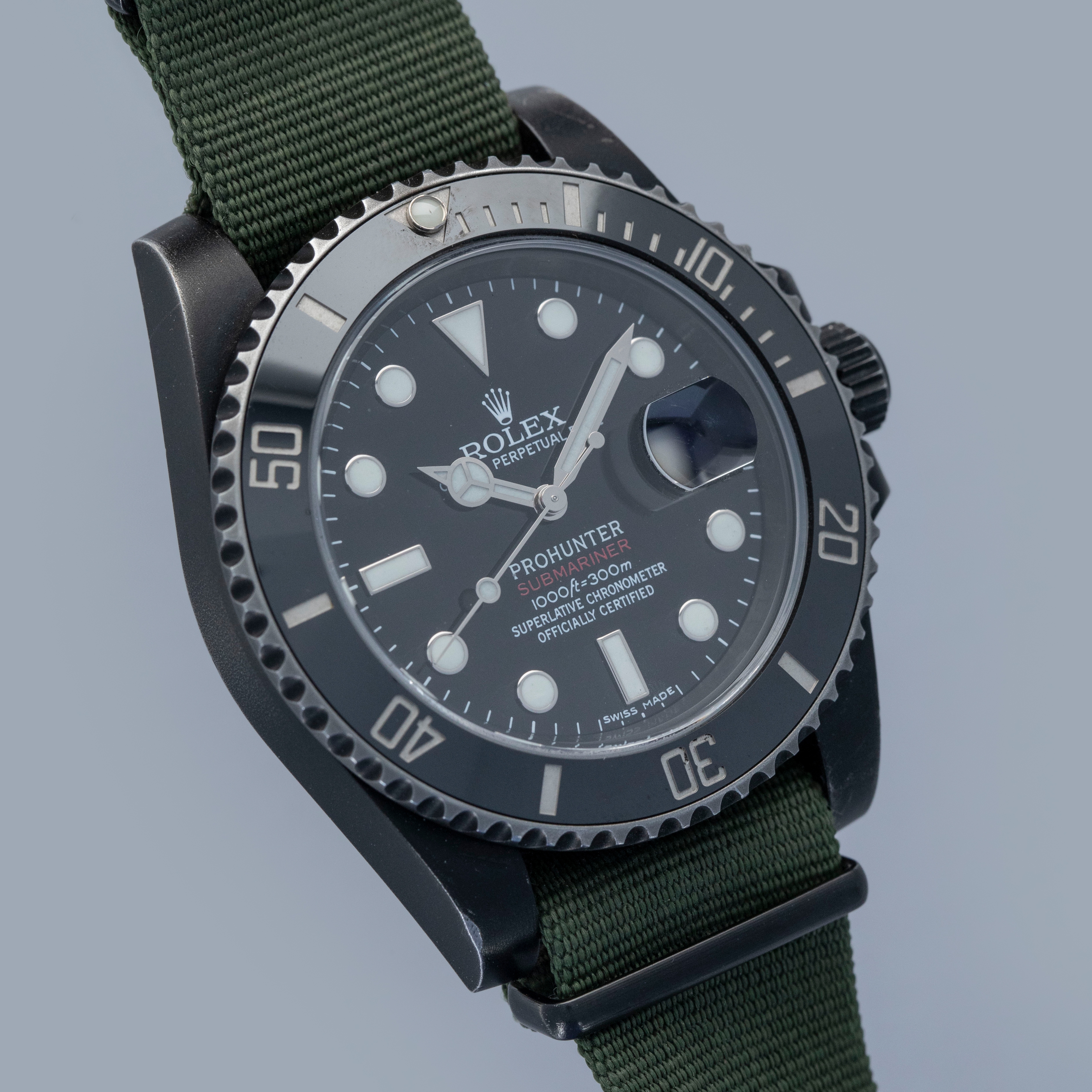 Offered here we have a Rolex Submariner ref. 116610 customized by famed watch customization house Prohunter. Best-known for their use of DLC coatings, such as the one on this example, Prohunter have taken inspiration from the Submariner’s heritage as a tool watch and given it a stealthy blacked-out aesthetic. In addition to customizing its dial with their logo and new red script for its Submariner inscription, as a throwback to its past, this timepiece combines modern ideals with heritage-inspired details. Fitted with fixed spring bars, as a reference to the legendary ref. 5517 MilSub, the resulting timepiece is aggressive and utilitarian.