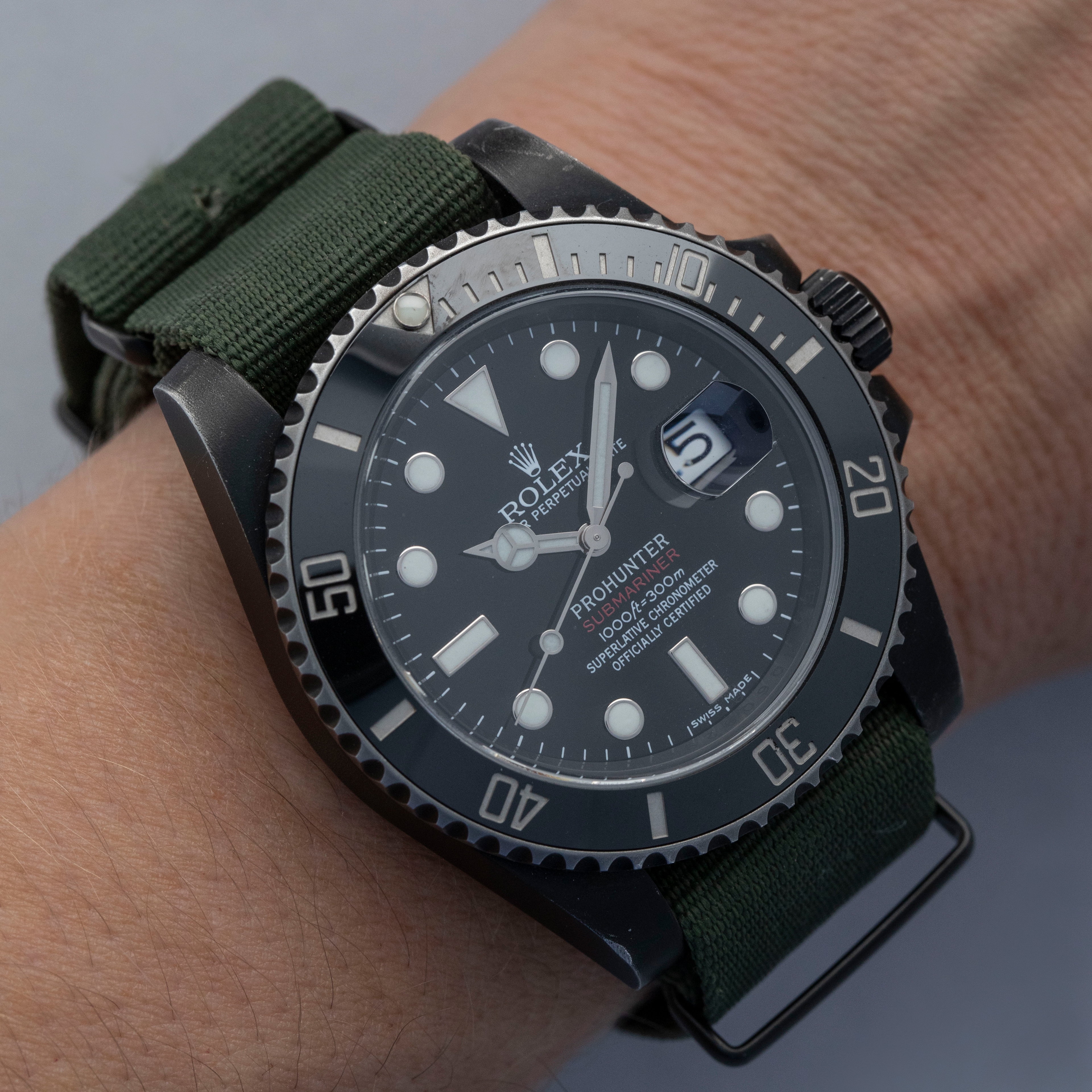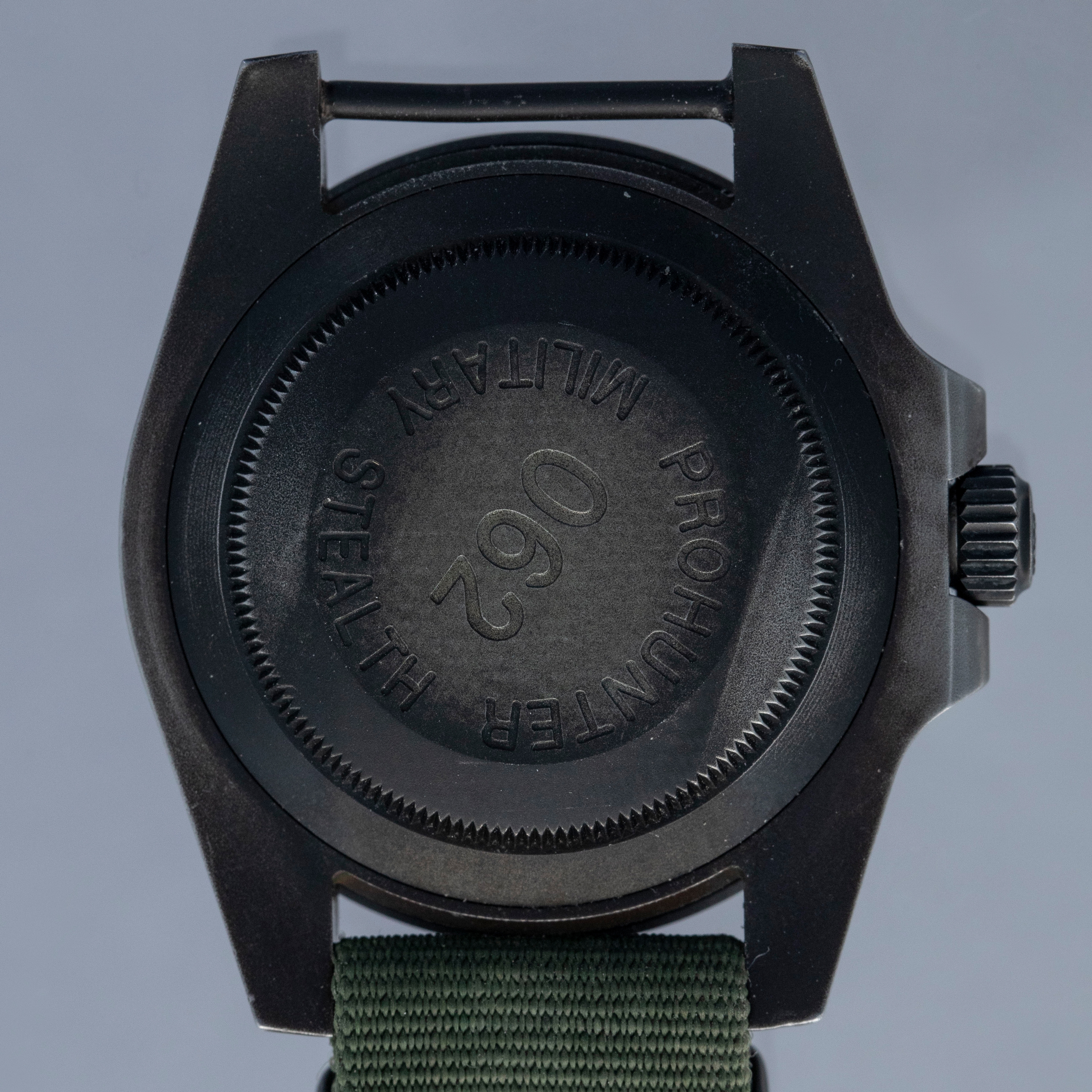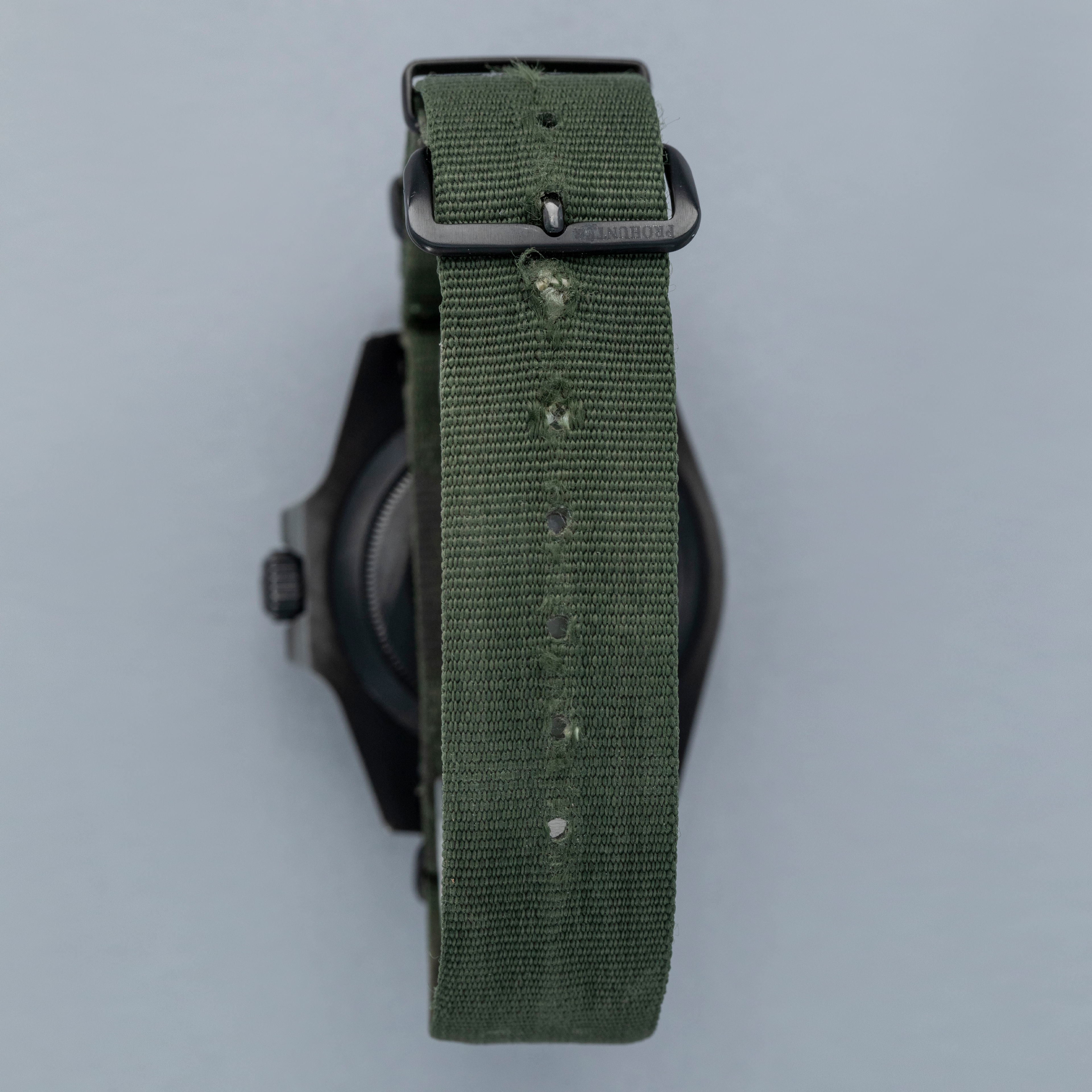 Watch is in overall very good condition. The PVD-coated steel case remains well defined, with the coating gently worn through on the edges of the case, case back, bezel edge, and winding crown, along with some additional small surface scratches present. The ceramic insert shows a few small marks. The dial and hands remain near mint. Due to the fixed lug bars, the watch can only be worn on a NATO-style strap, and it is fitted with the original Prohunter strap showing wear around the holes, along with a black buckle displaying light surface scratches.