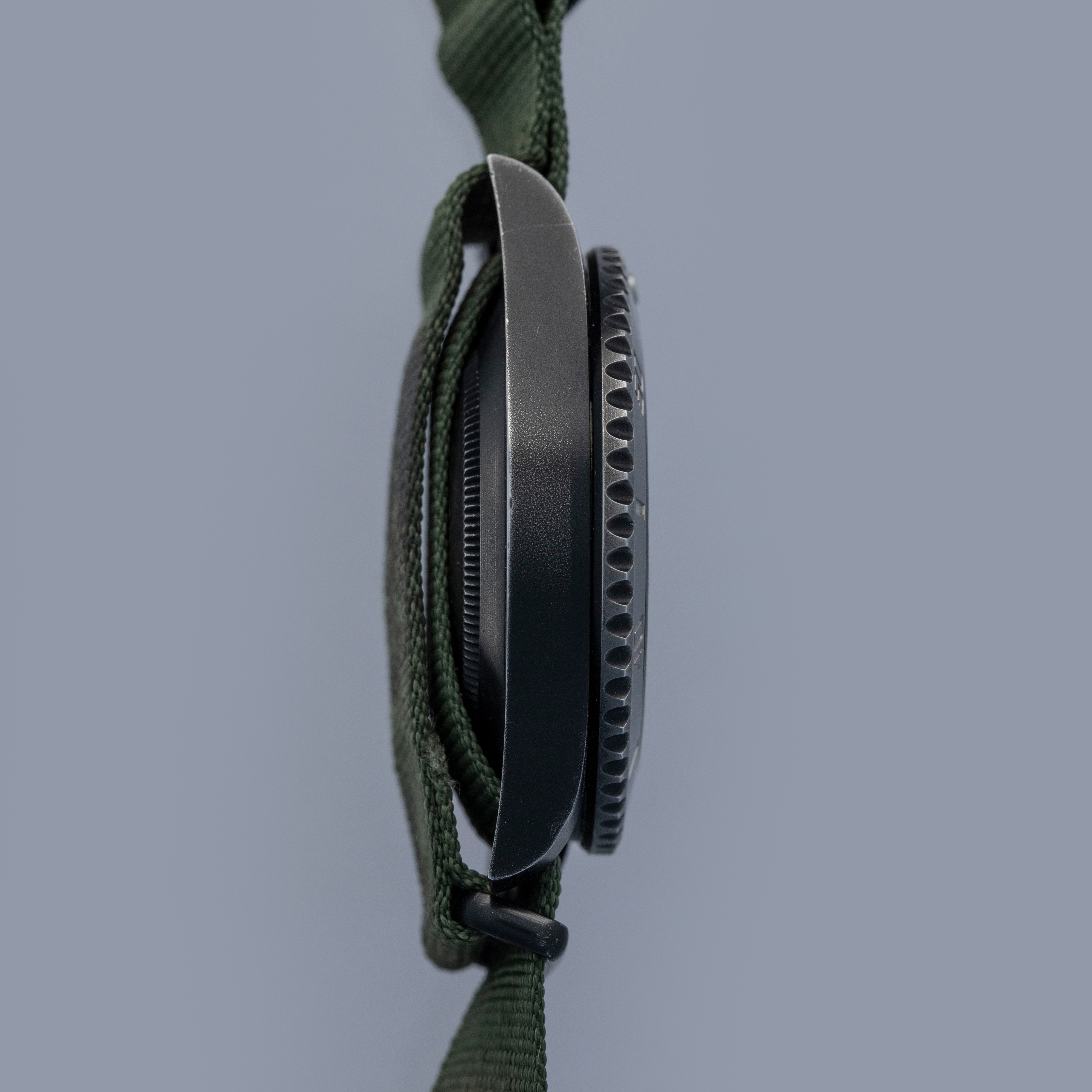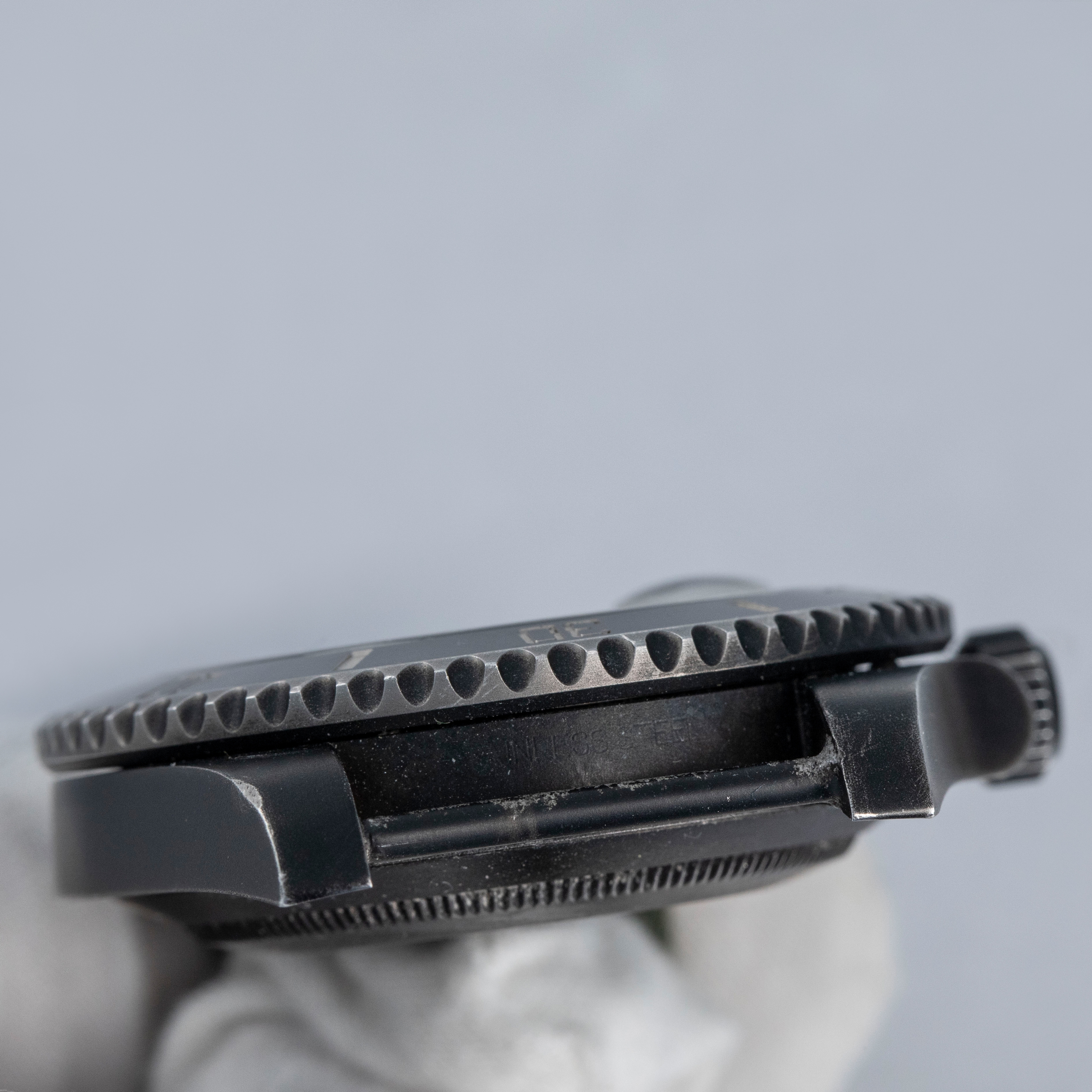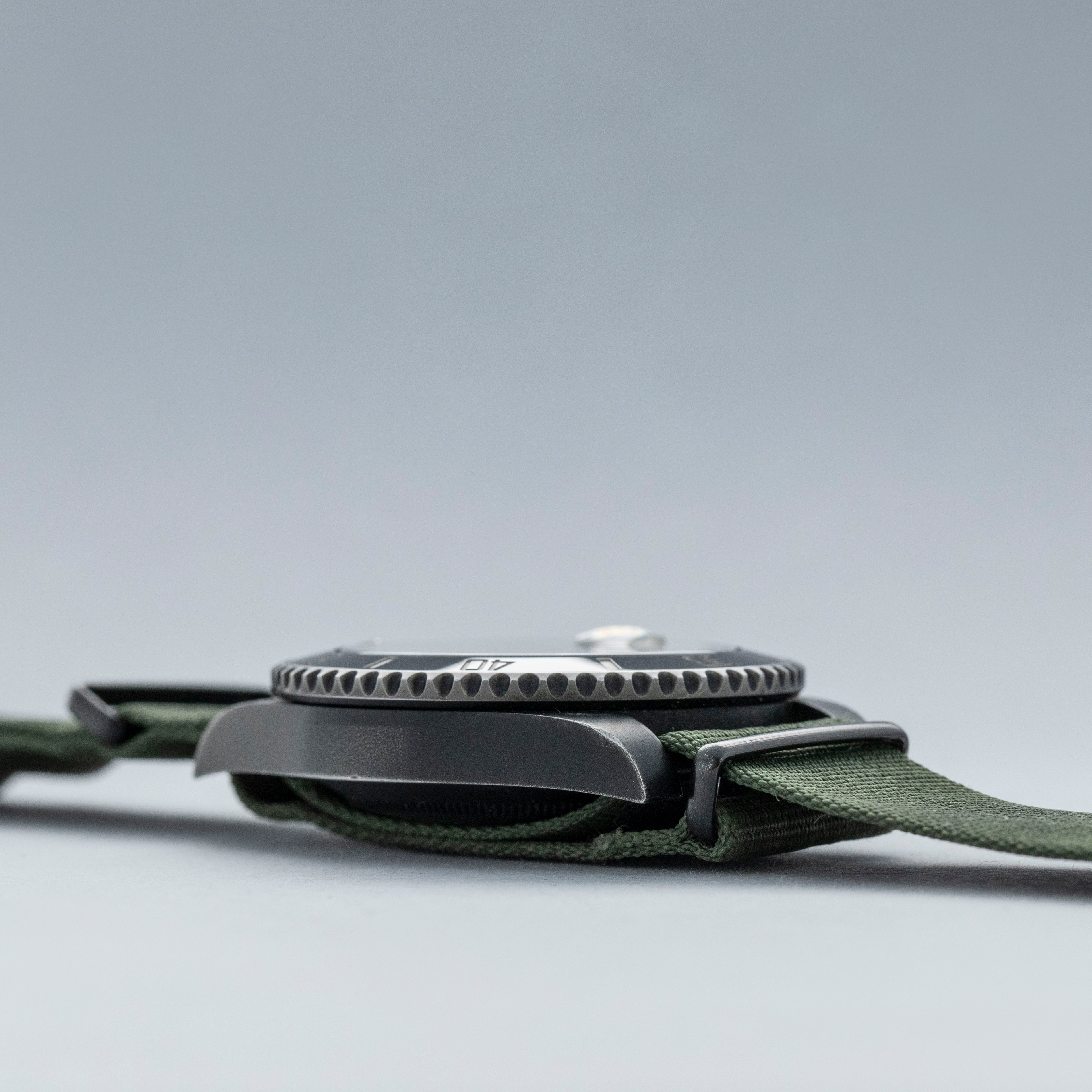 Watch is in overall very good condition. The PVD-coated steel case remains well defined, with the coating gently worn through on the edges of the case, case back, bezel edge, and winding crown, along with some additional small surface scratches present. The ceramic insert shows a few small marks. The dial and hands remain near mint. Due to the fixed lug bars, the watch can only be worn on a NATO-style strap, and it is fitted with the original Prohunter strap showing wear around the holes, along with a black buckle displaying light surface scratches.