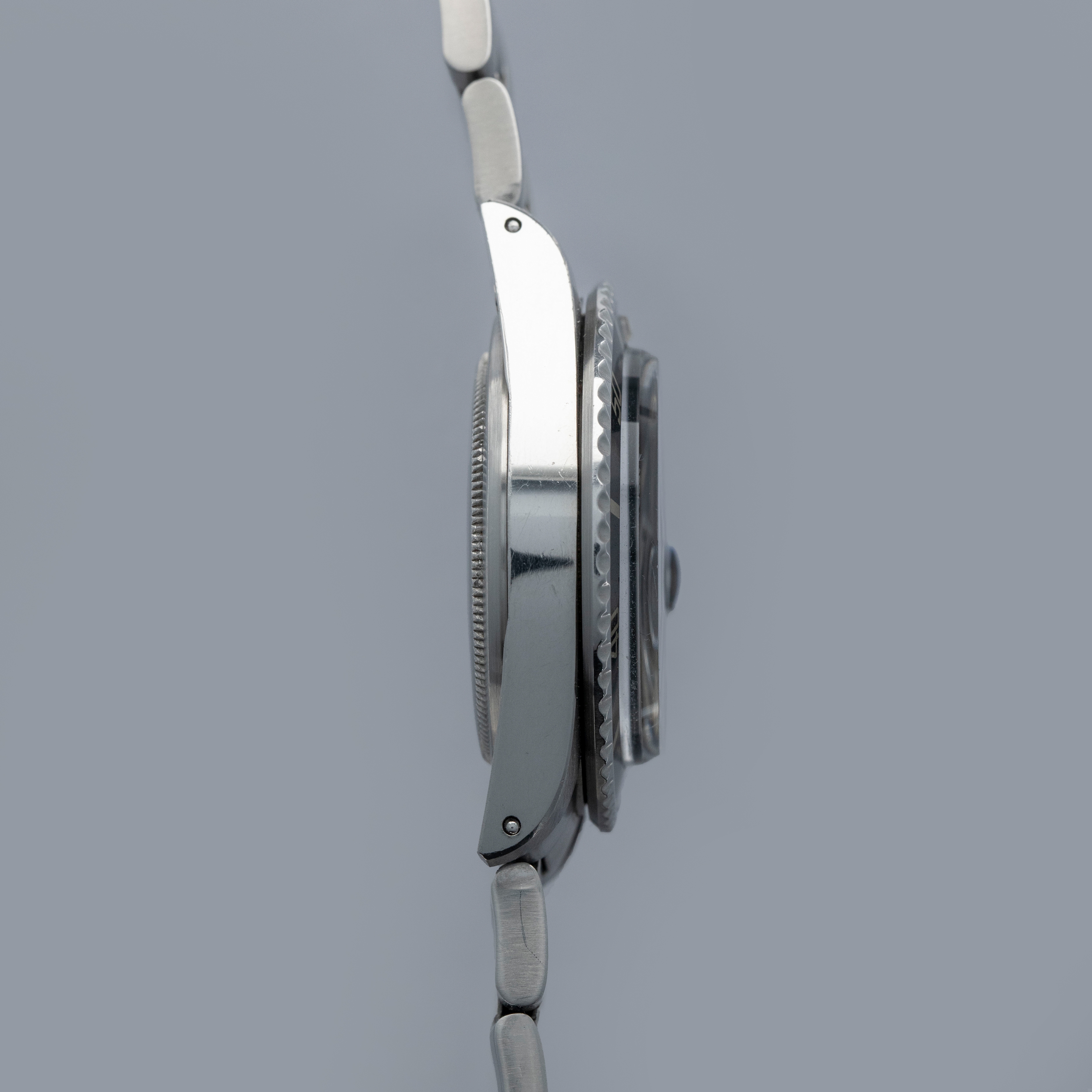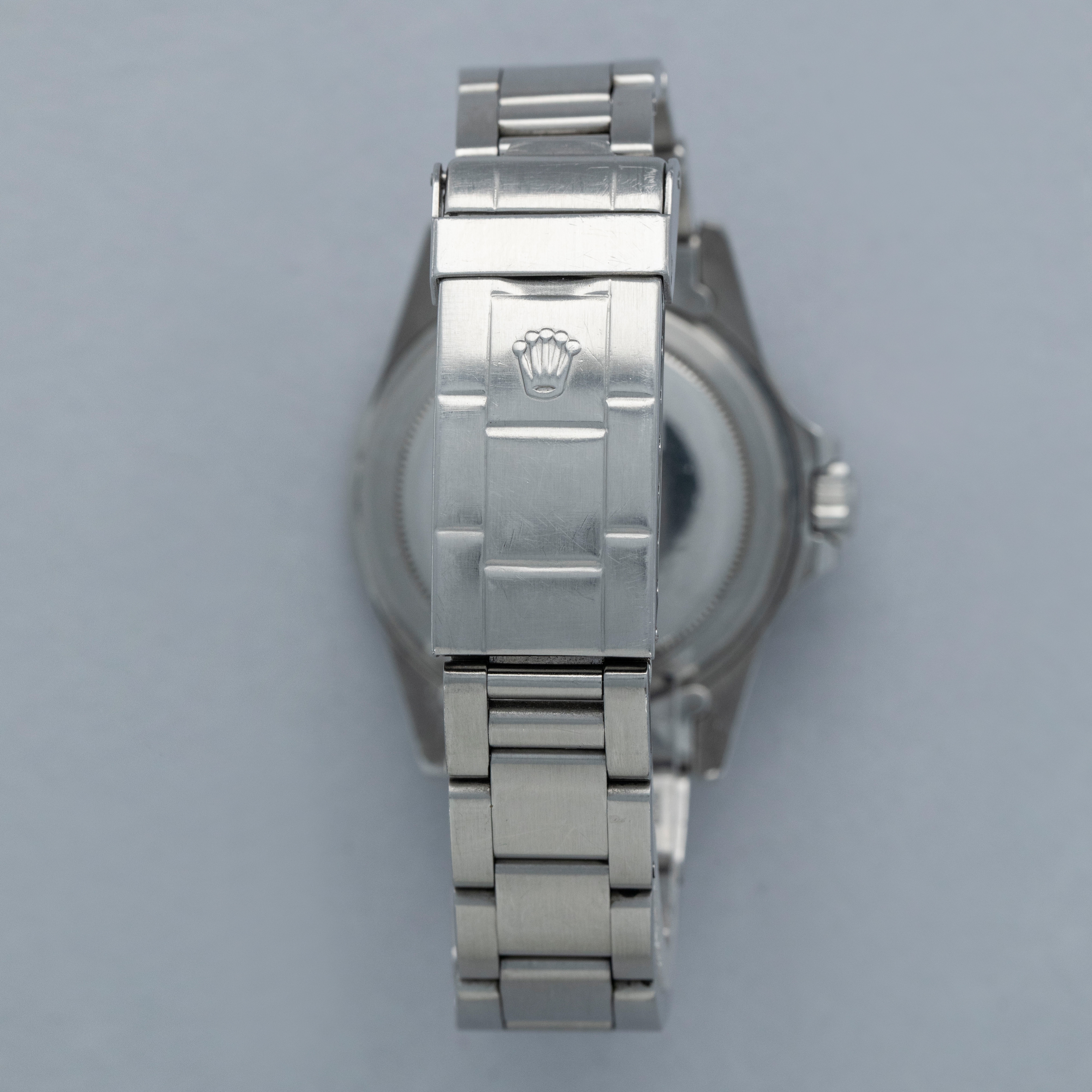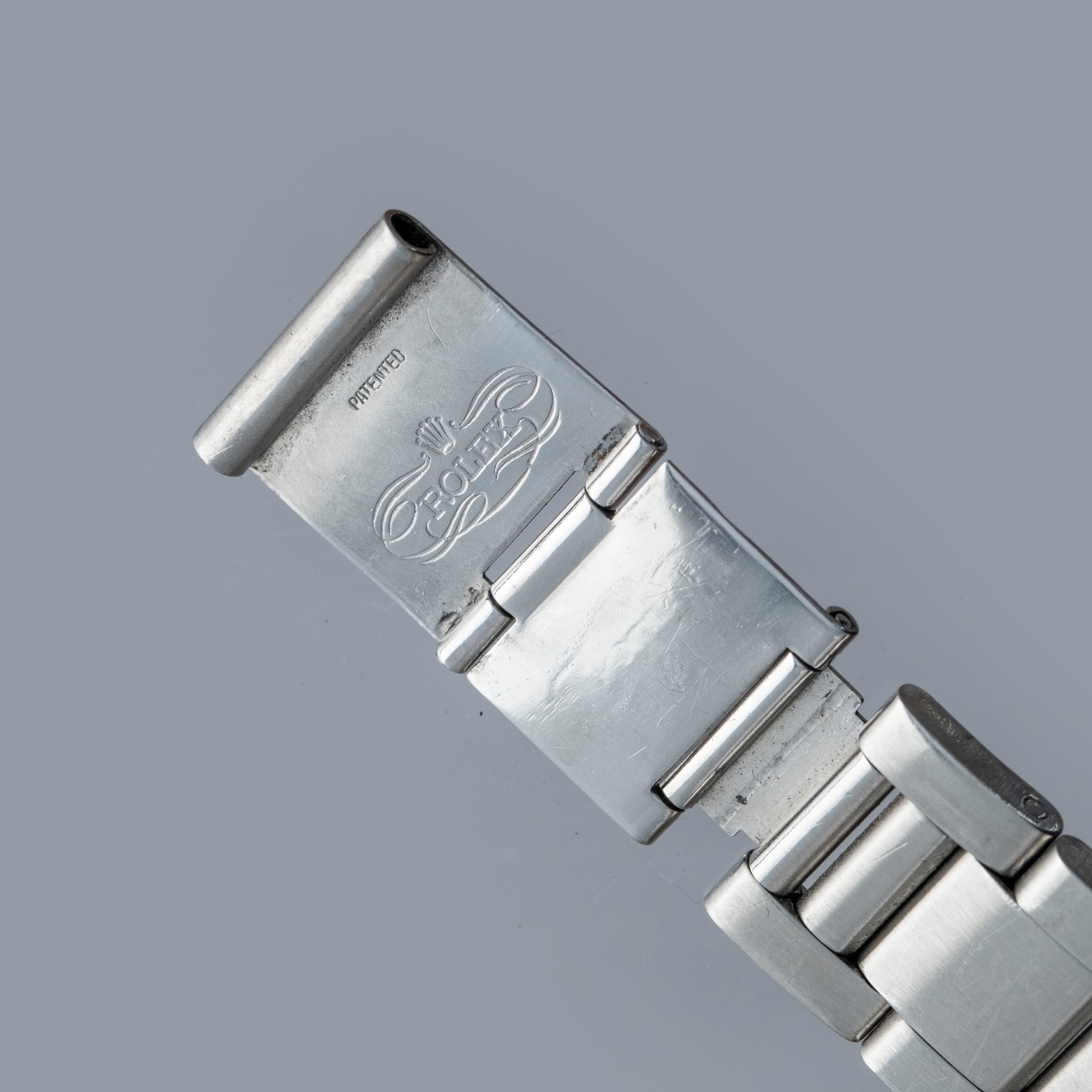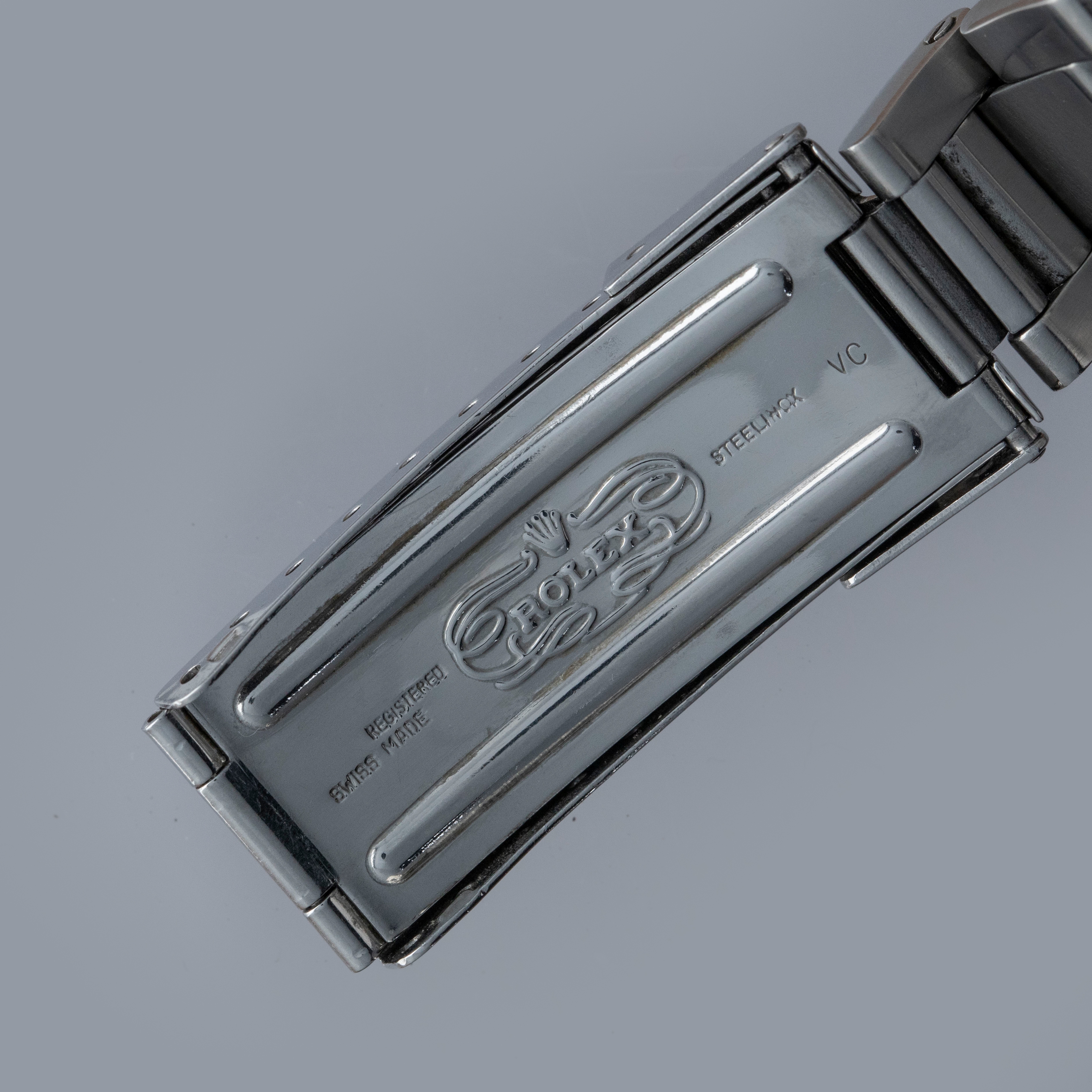 Watch is in overall excellent condition. The steel case is very well defined with some surface scratches and light marks, while the case back shows more noticeable scratches and scuffs, likely from a case back removal tool. The bezel is well defined, and the insert has only a couple of small marks, with the silver numerals and triangle having taken on a warm patina. The dial is near mint, with minor marks in some of the lume plots, and the hands are very clean. Fitted with a solid link Oyster bracelet showing light surface wear and slight play between the links. 11 links, 1 of which is removable, and fits approximately a 7 1/4” wrist.