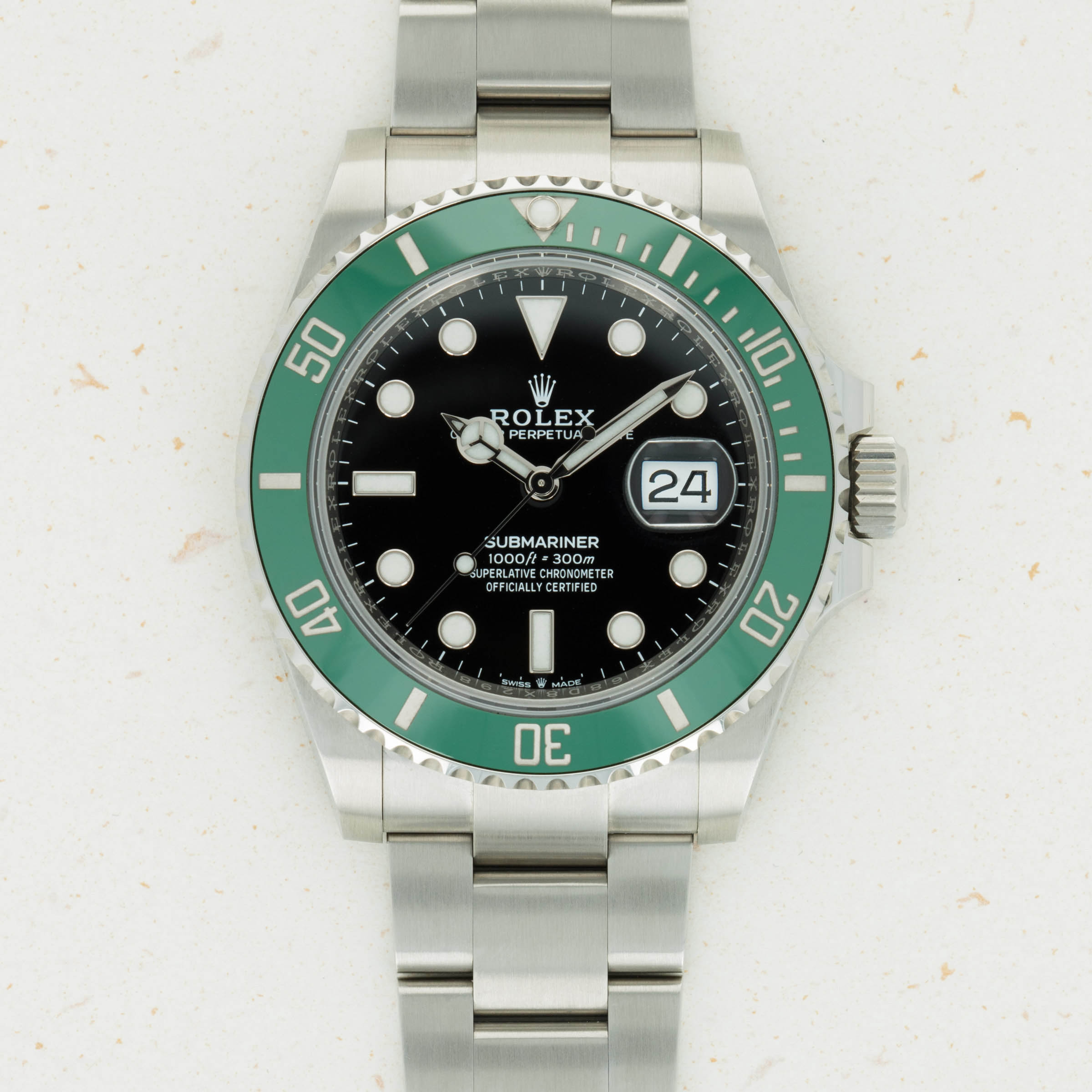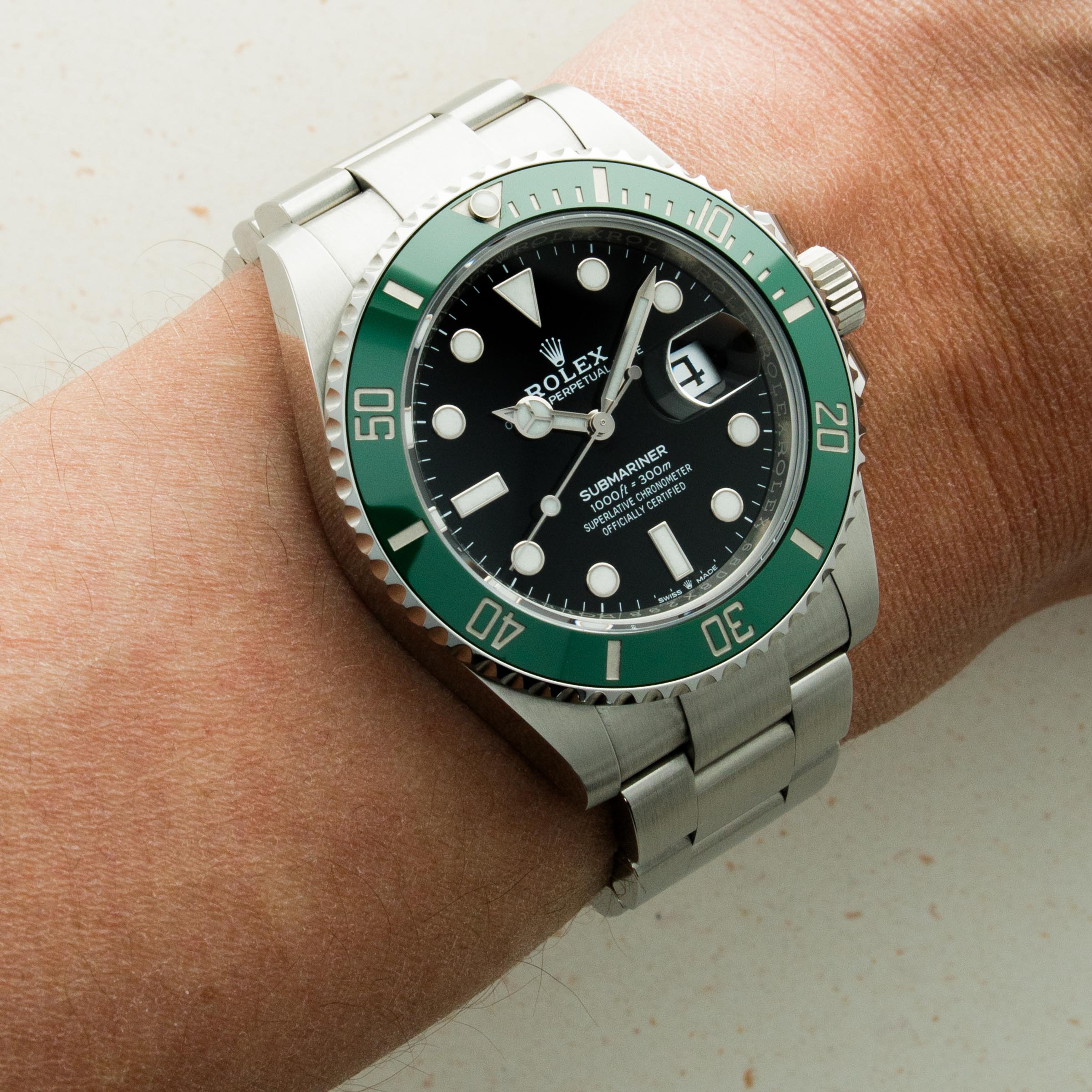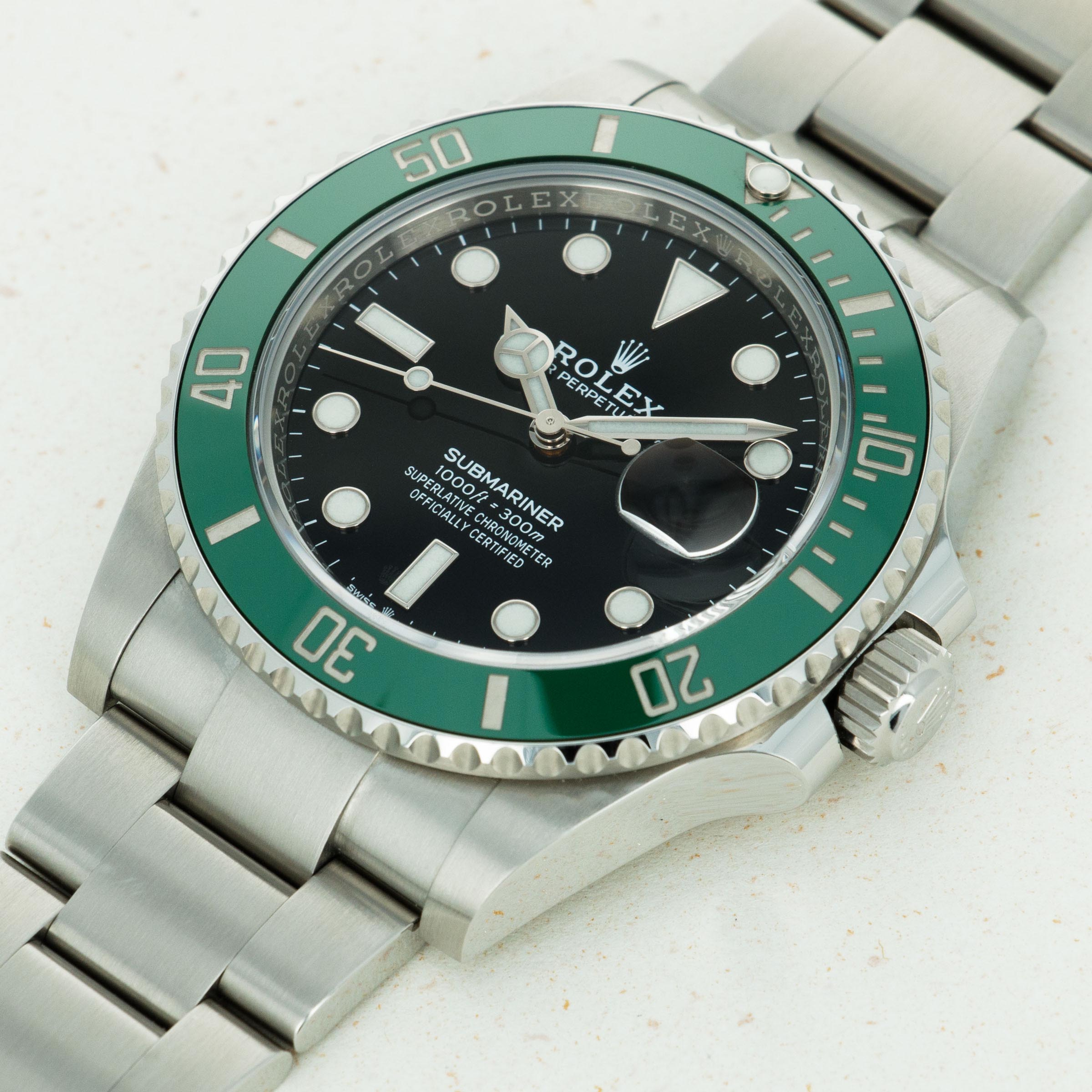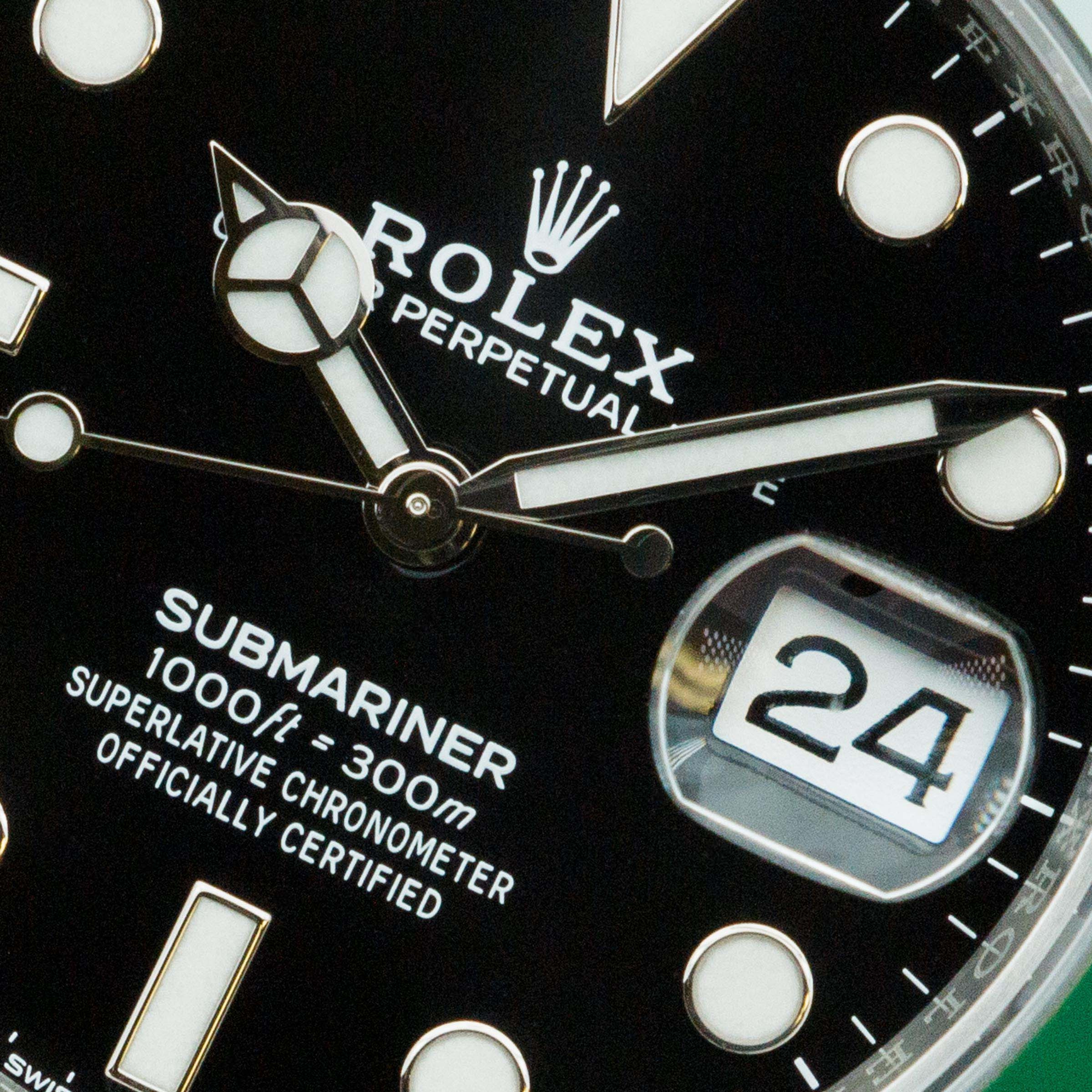 Released in September of 2020, the Rolex Starbucks became the latest addition to the ever-popular and growing family of green-themed Rolex Submariners. Succeeding the fan-favorite Rolex "Hulk", the Starbucks resembles the model that came before it, the 50th-anniversary Submariner "Kermit", thanks to its green bezel and black dial. Ditching the Hulk's maxi-case lugs, the Starbucks features thinner lugs that bring it even closer to its predecessor. Fitted with a green Cerachrom bezel insert, the updated cal. 3235 movement with a 70-hour power reserve, an impressive 300m water resistance, and Rolex's incredible Glidelock clasp system, the Starbucks remains an incredibly reliable and functional dive watch, should you ever decide to take the plunge. Measuring in at 41mm in diameter, the Starbucks sits with a more modern profile on the wrist as its proportions increase legibility and comfort.