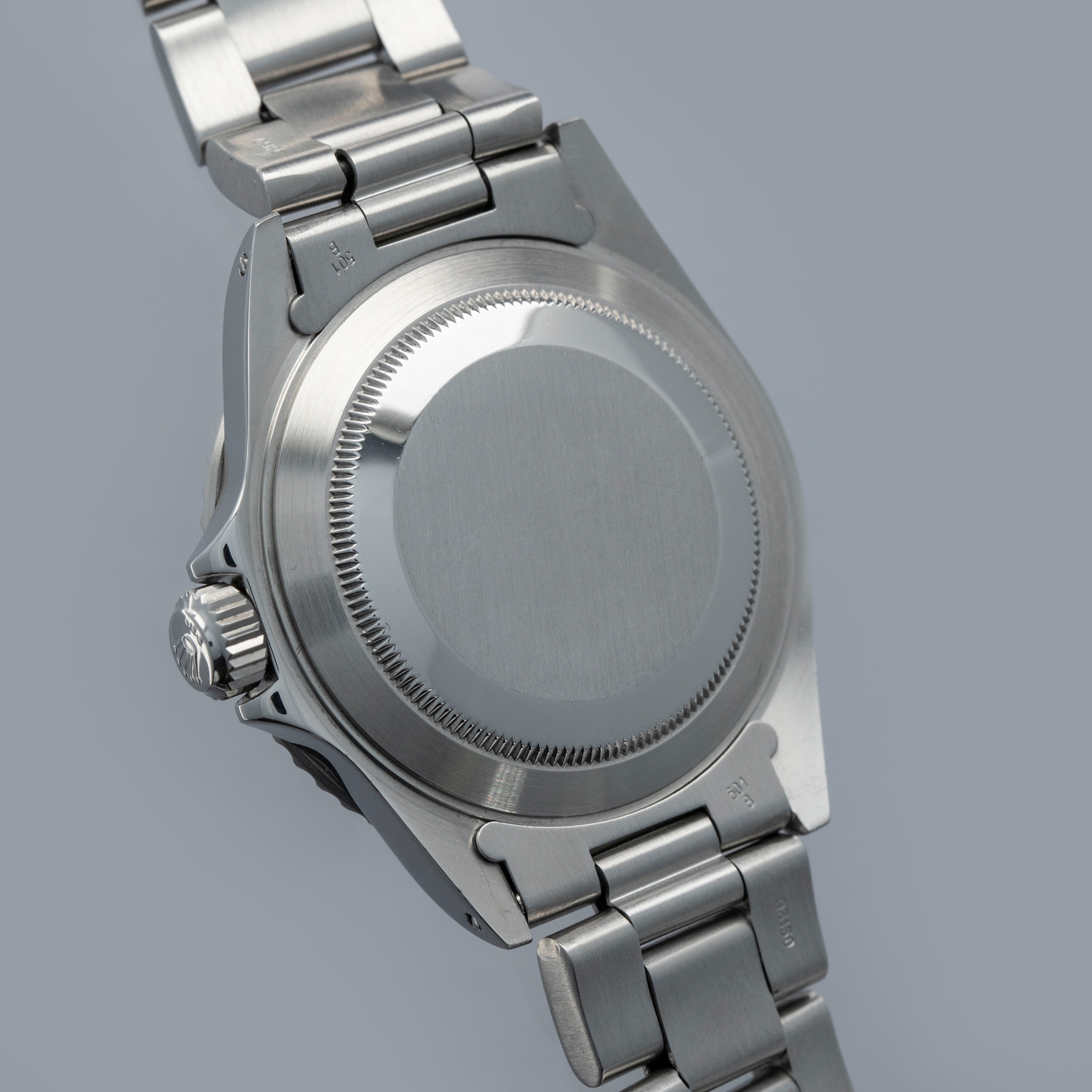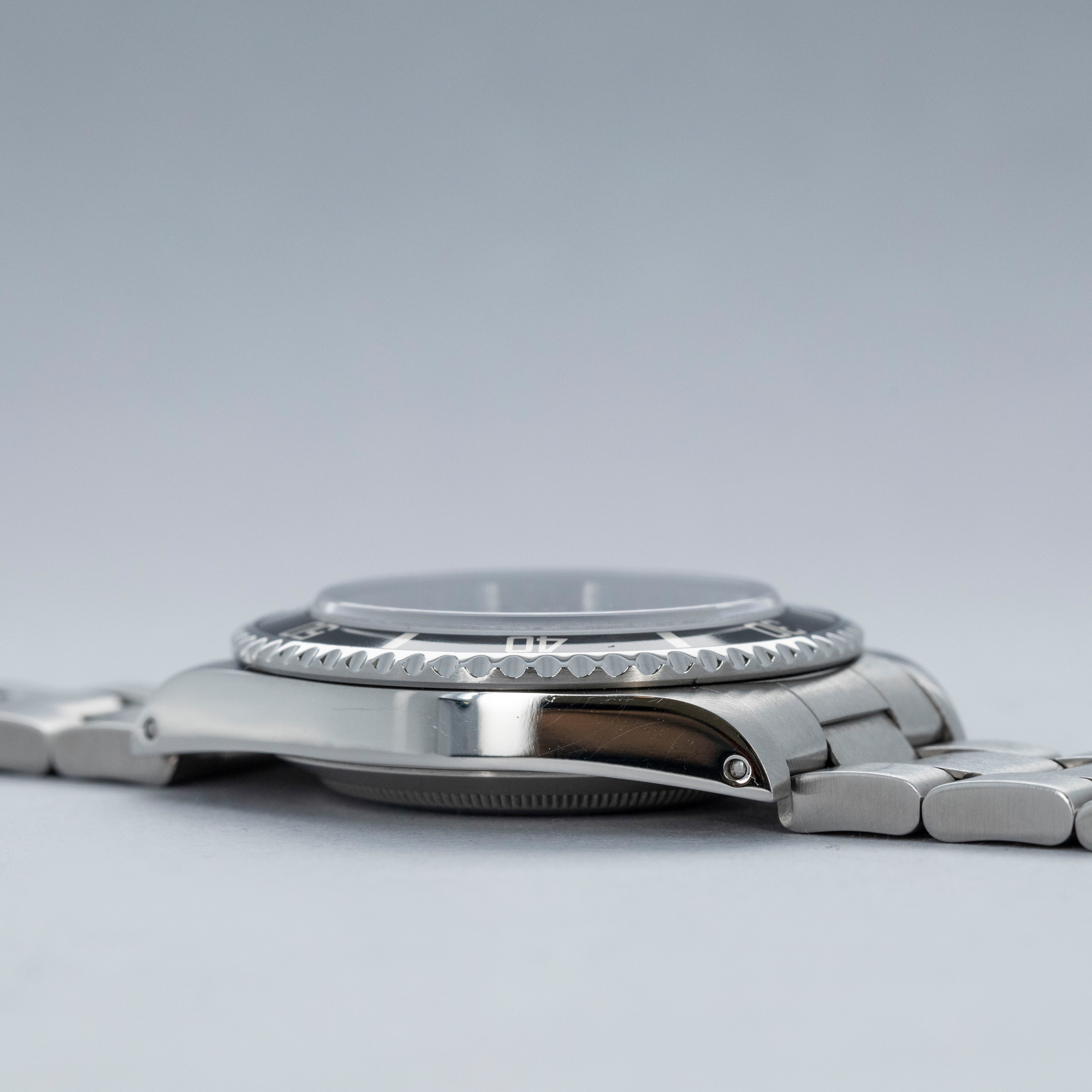 Watch is in overall excellent condition. The steel case shows light surface scratches along with a more noticeable ding to the upper right lug near the bezel and evidence of a previous polish, while the case back remains clean. The bezel remains well defined, and the black insert shows some surface scratches and marks. The dial and hands remain near mint. It is fitted with a solid-link Oyster bracelet showing surface scratches and light play between the links. The bracelet is fitted with 12 links, 2 of which are removable, and fits approximately a 7¾” wrist. Comes complete with inner and outer boxes, warranty card, booklet, card holder, two hangtags, and additional service cards and booklets.