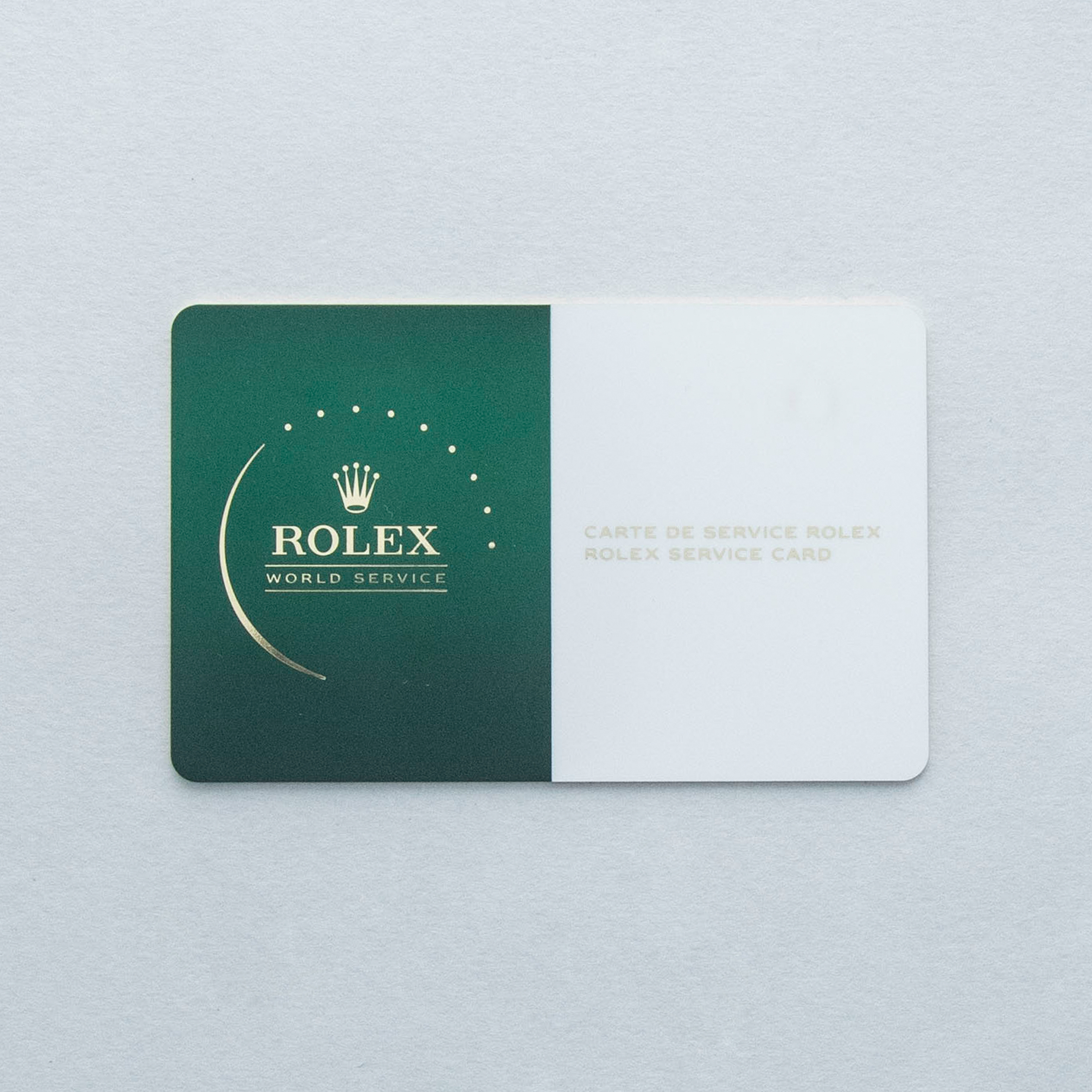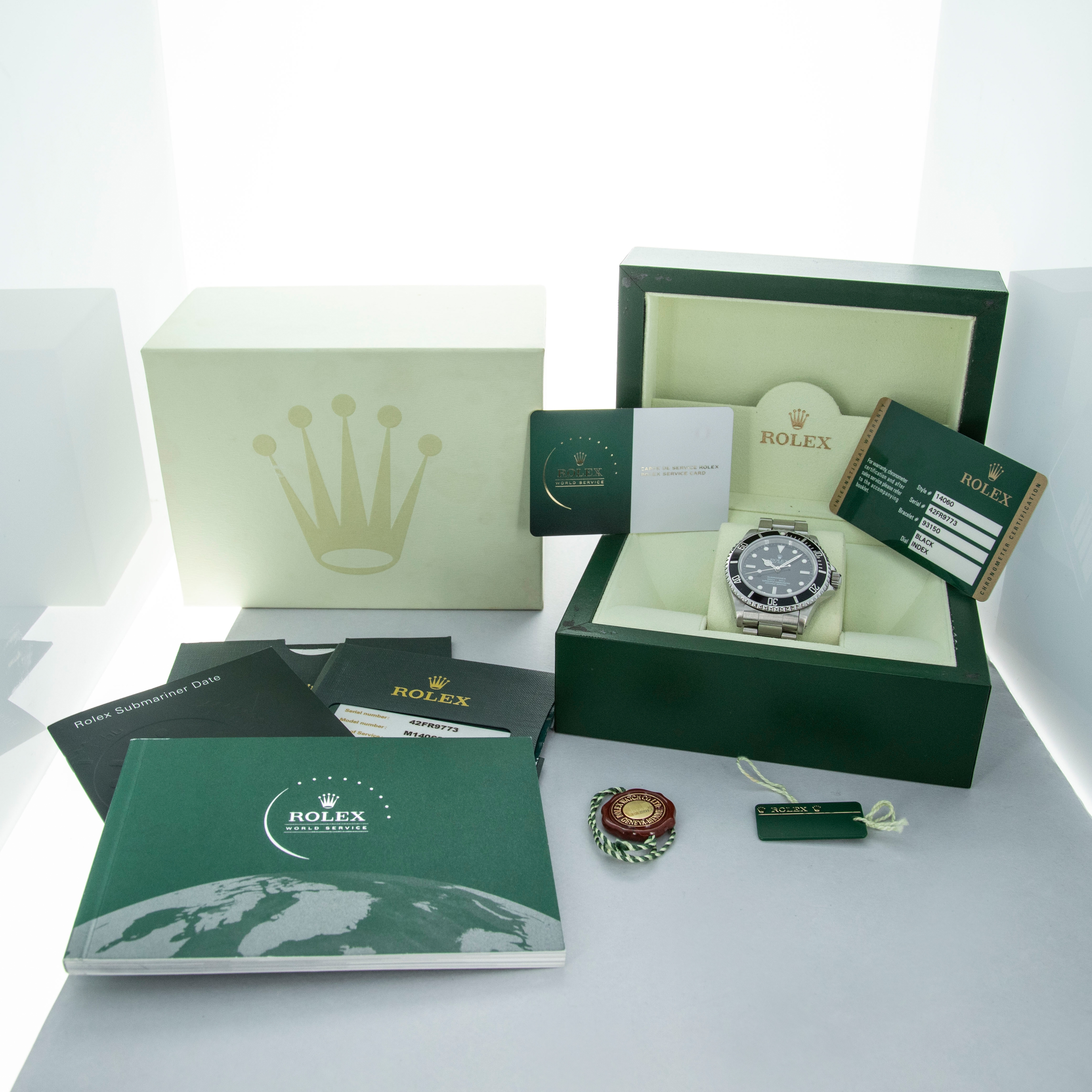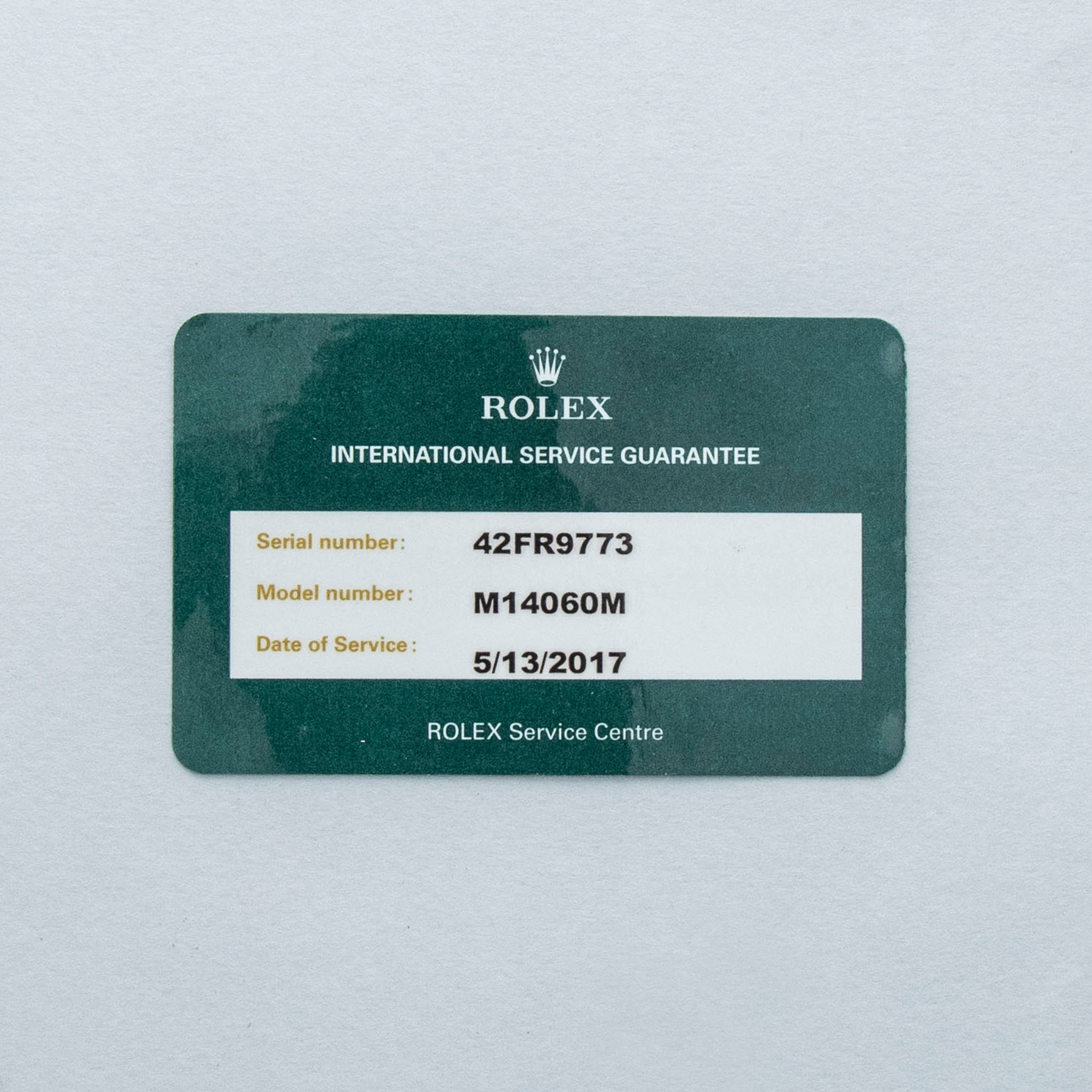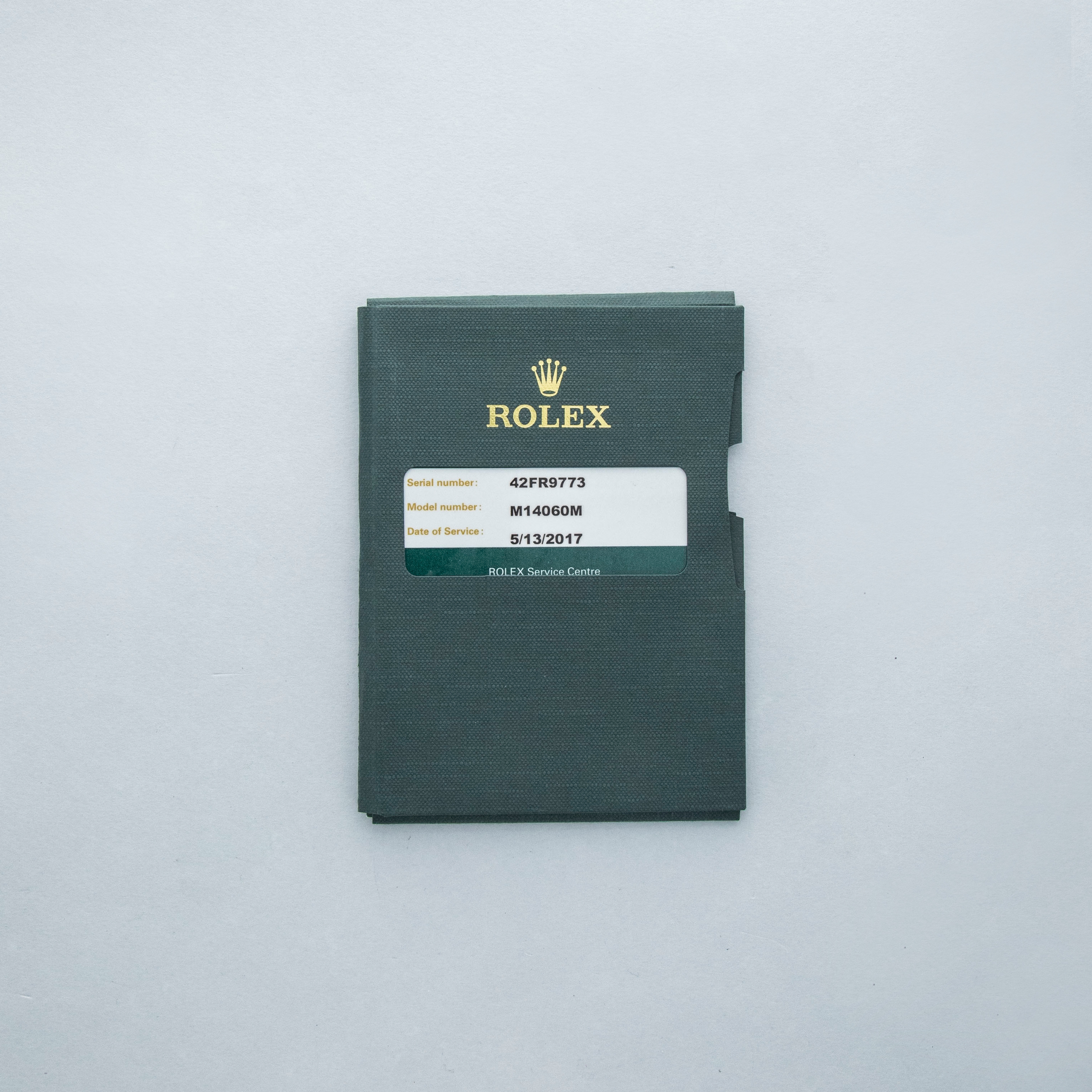 Watch, box, and papers, two Rolex service cards (one dated, one NFC)
