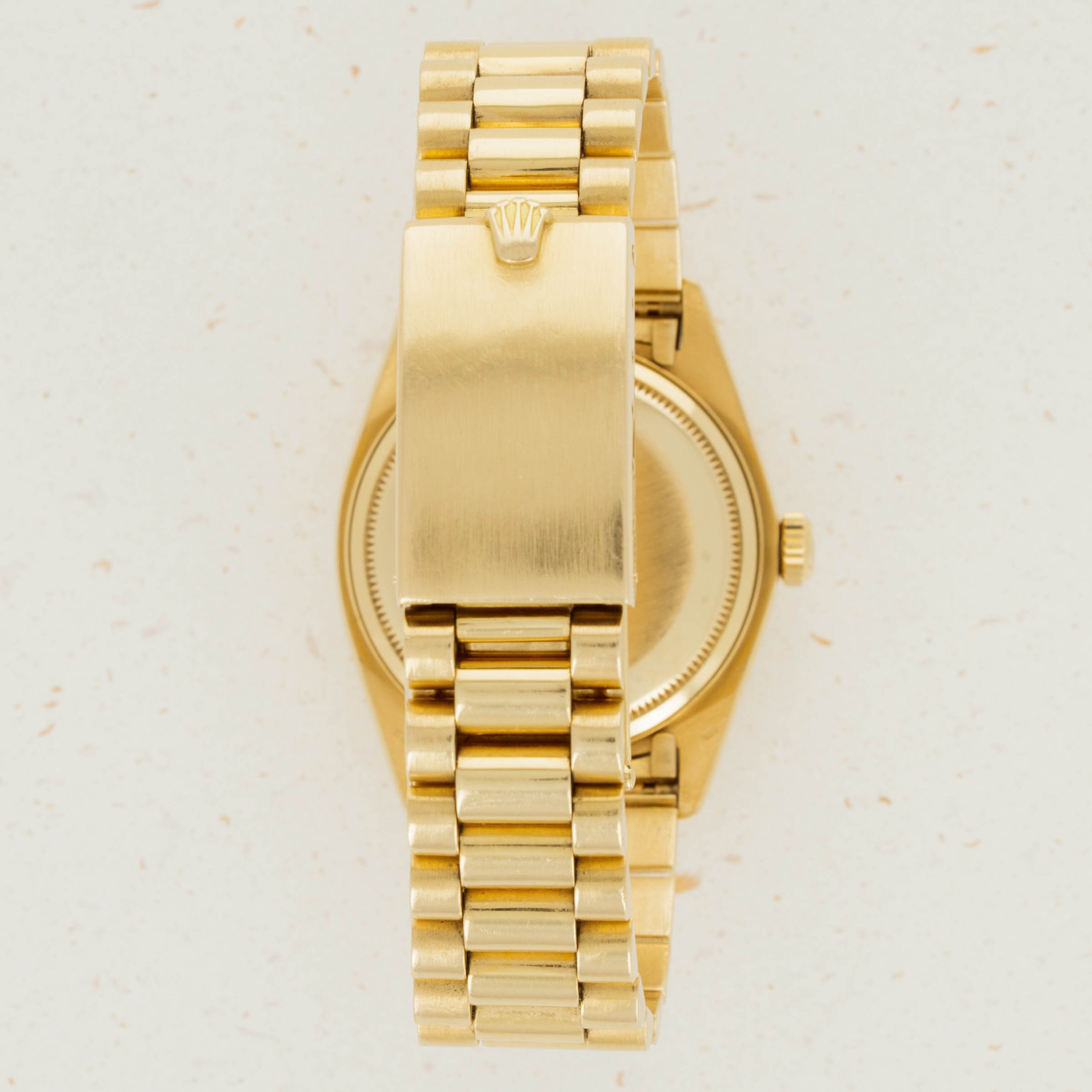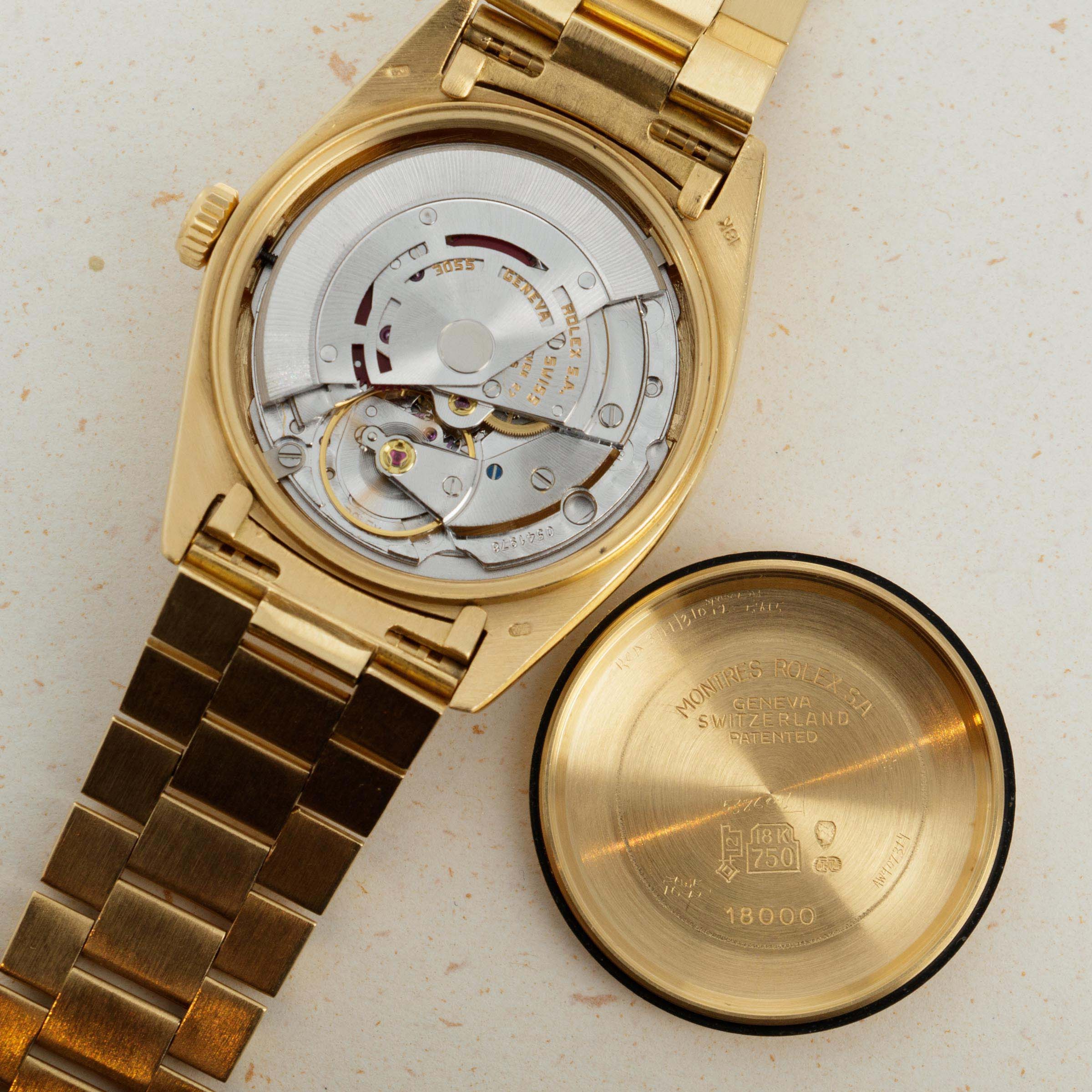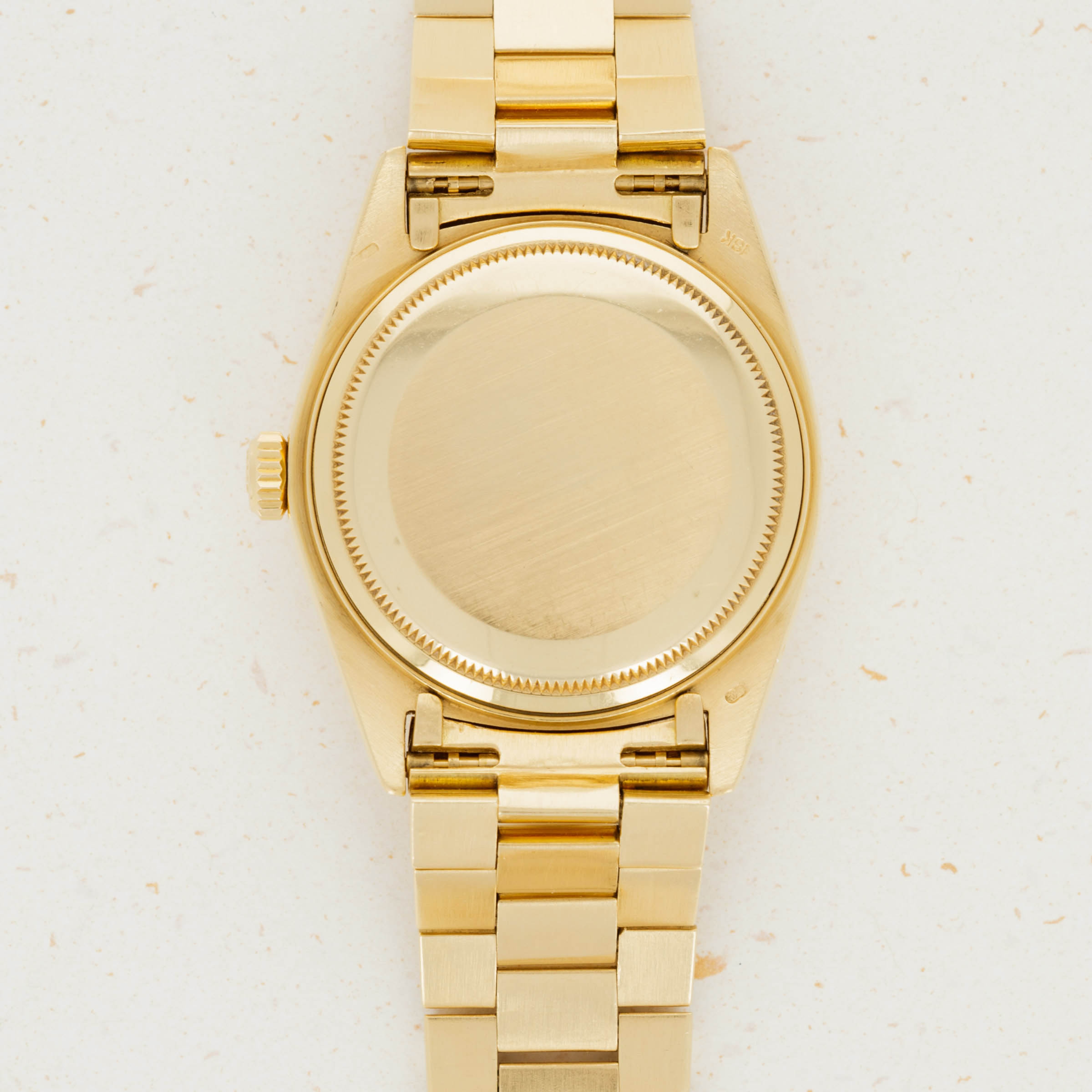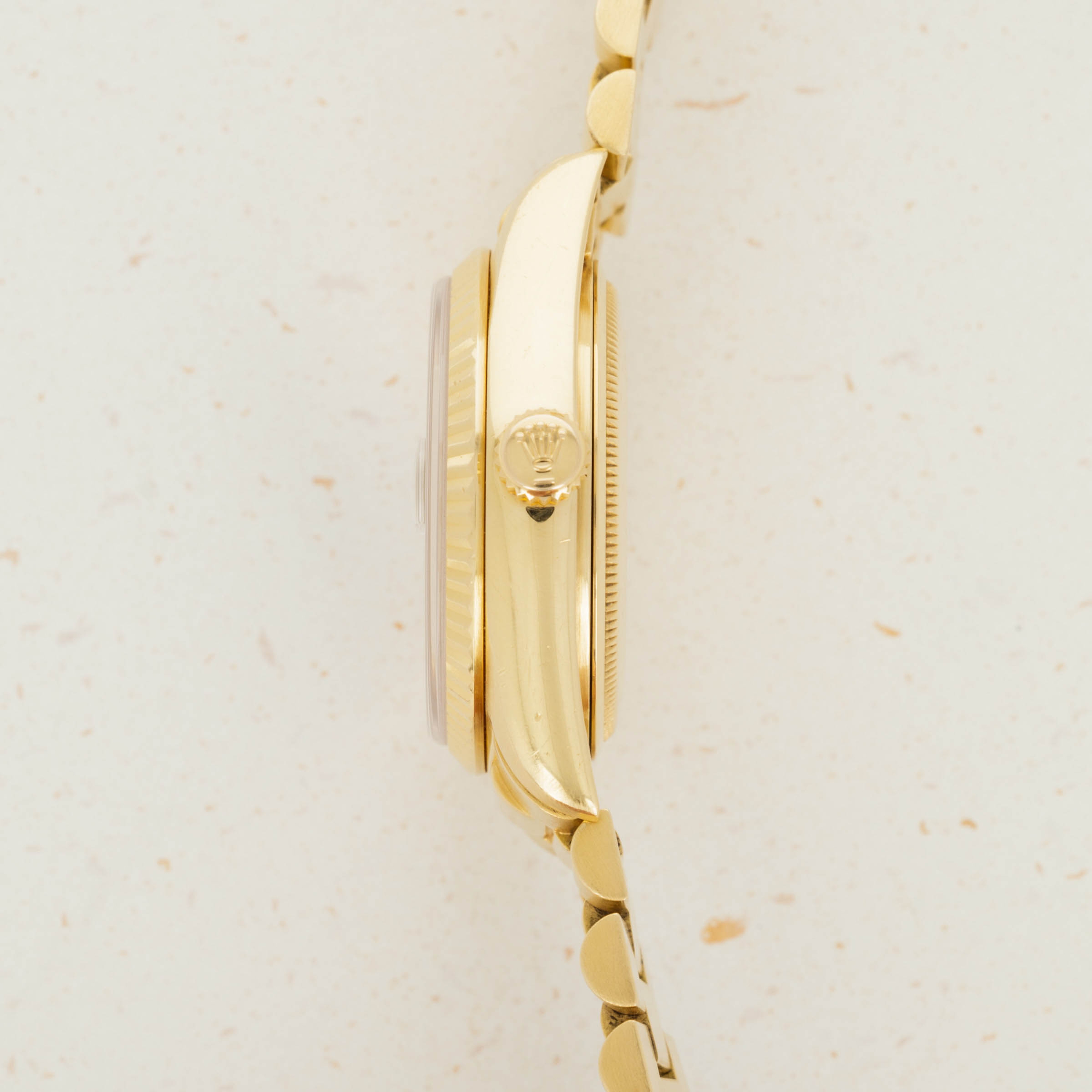 While its dial is certainly unusual, this ref. 18038's 18kt yellow gold construction is entirely classical in its design with its traditional 36mm case, Presidential bracelet and wonderful fluted bezel.