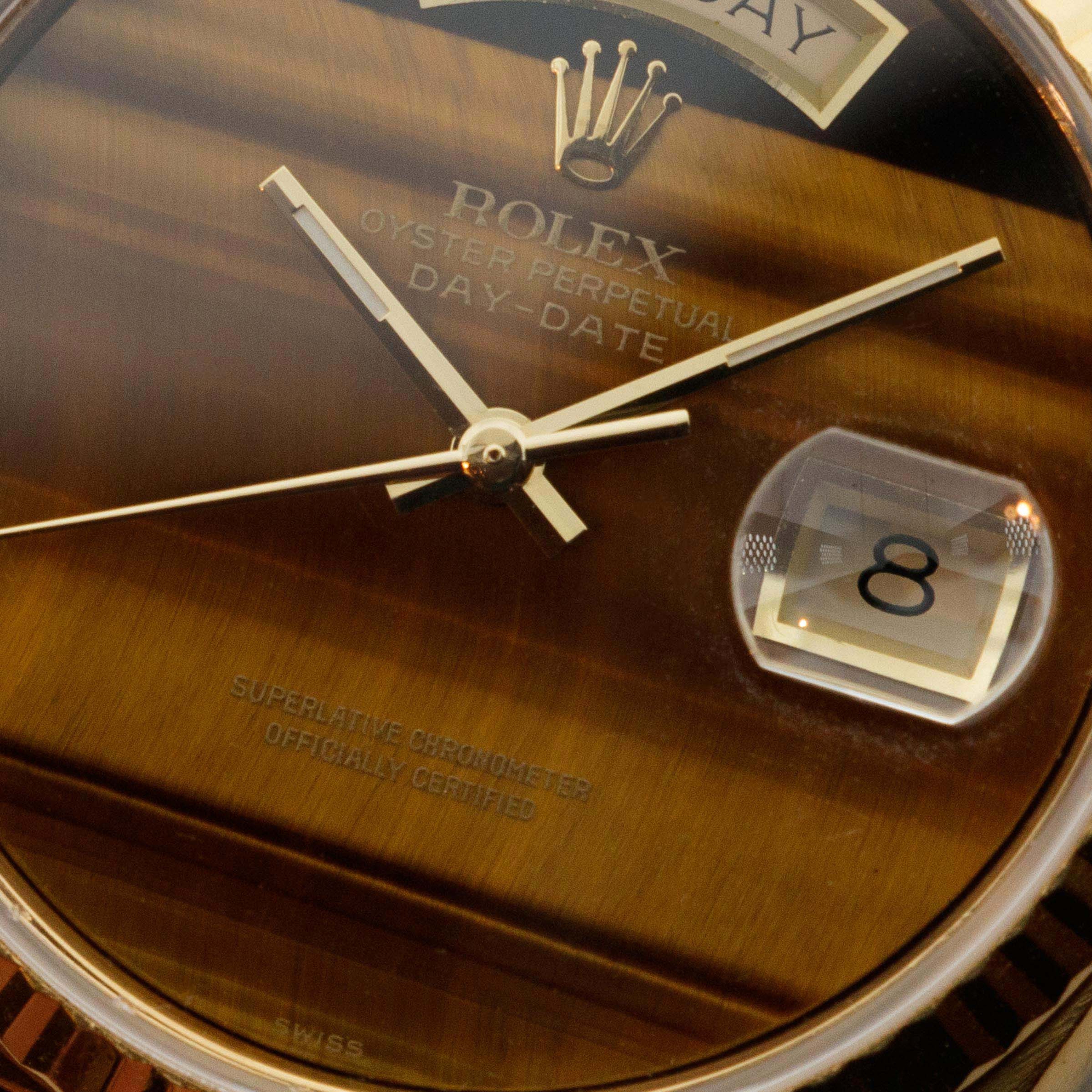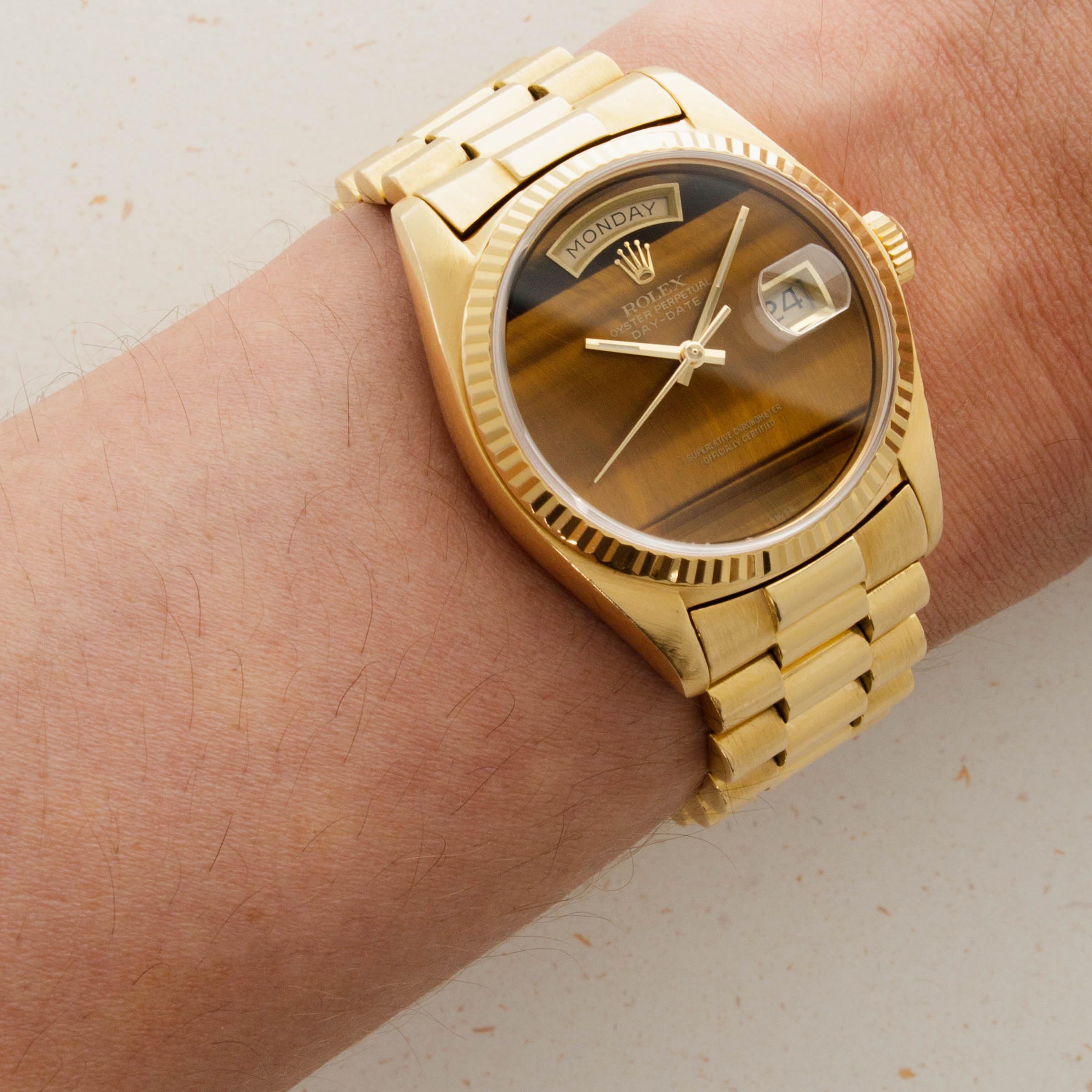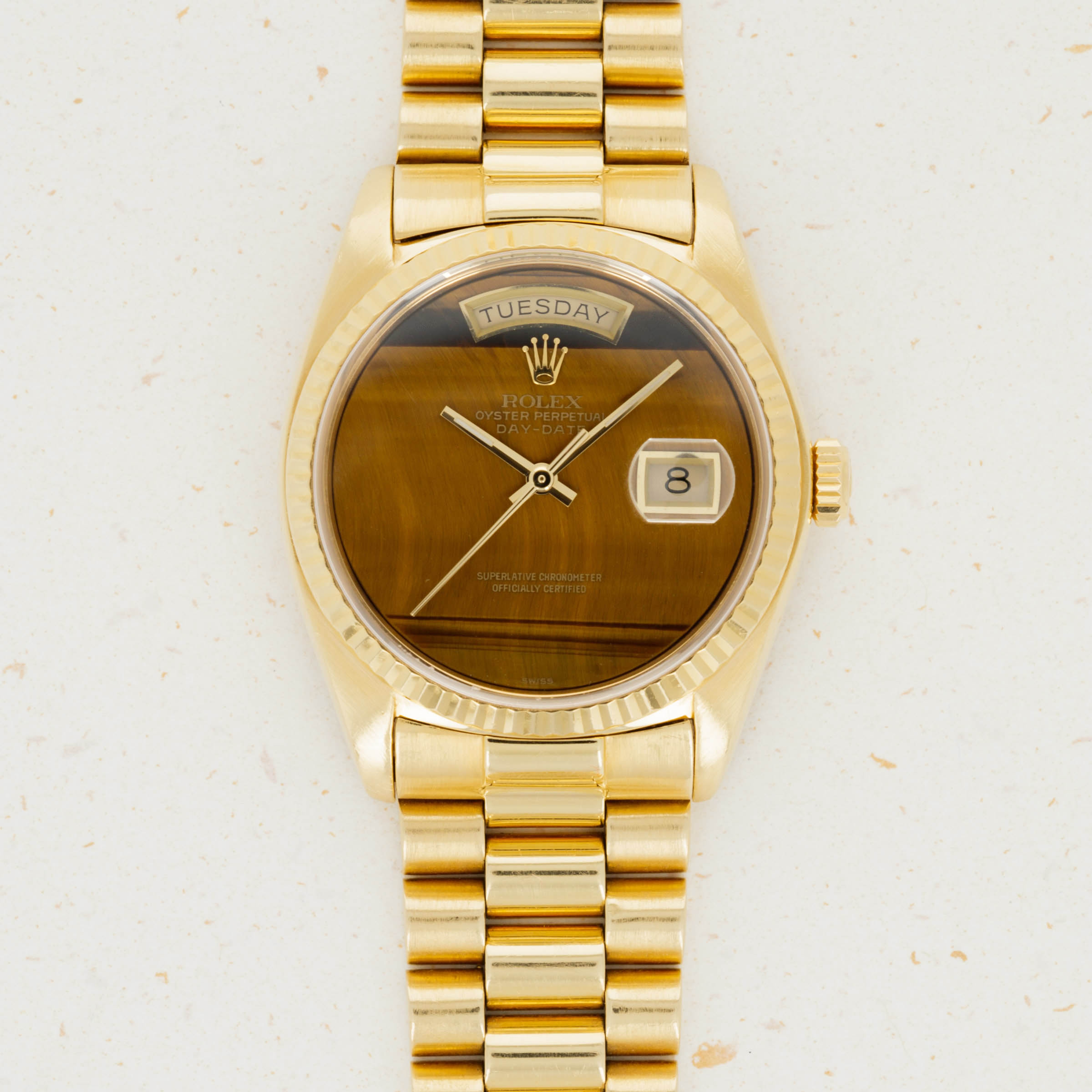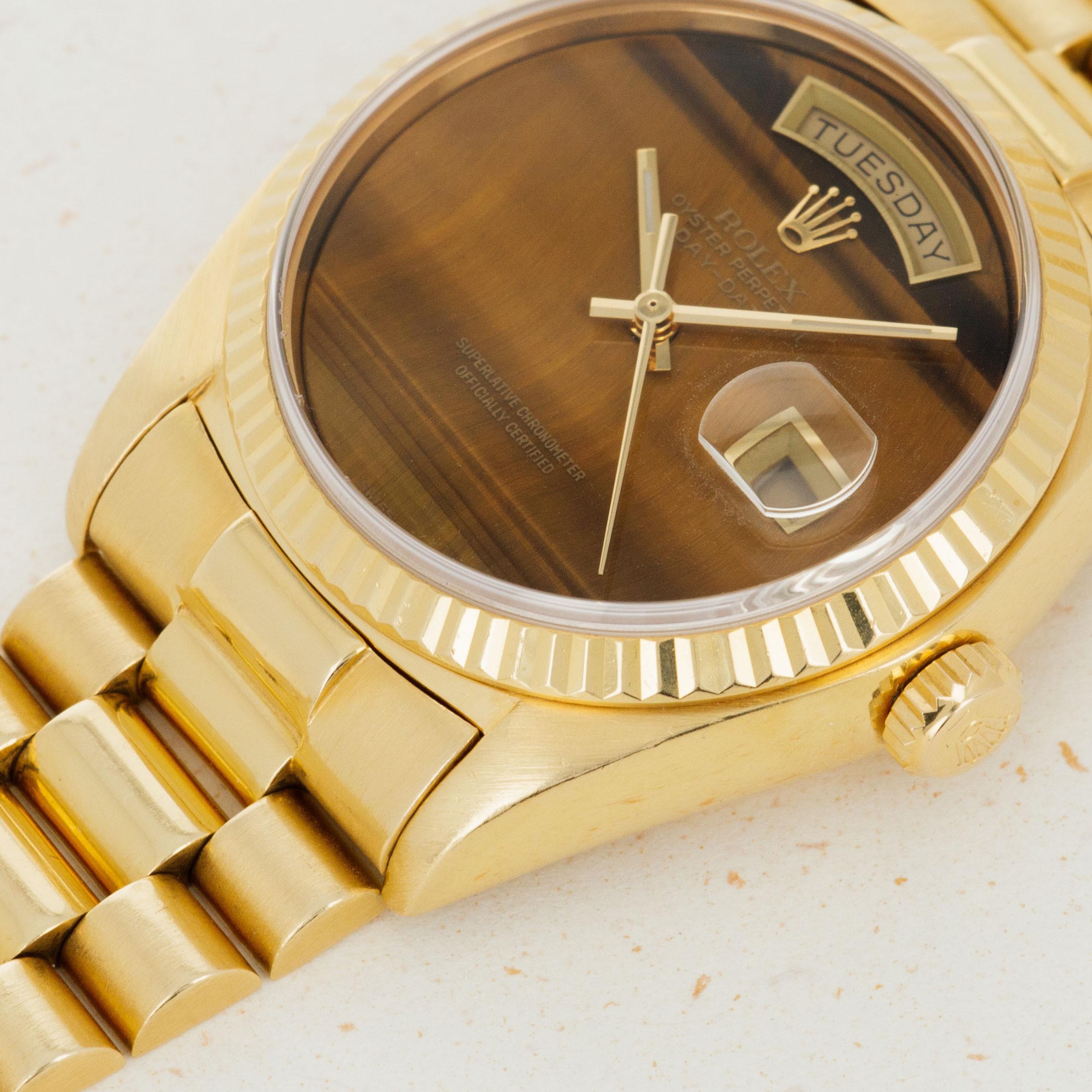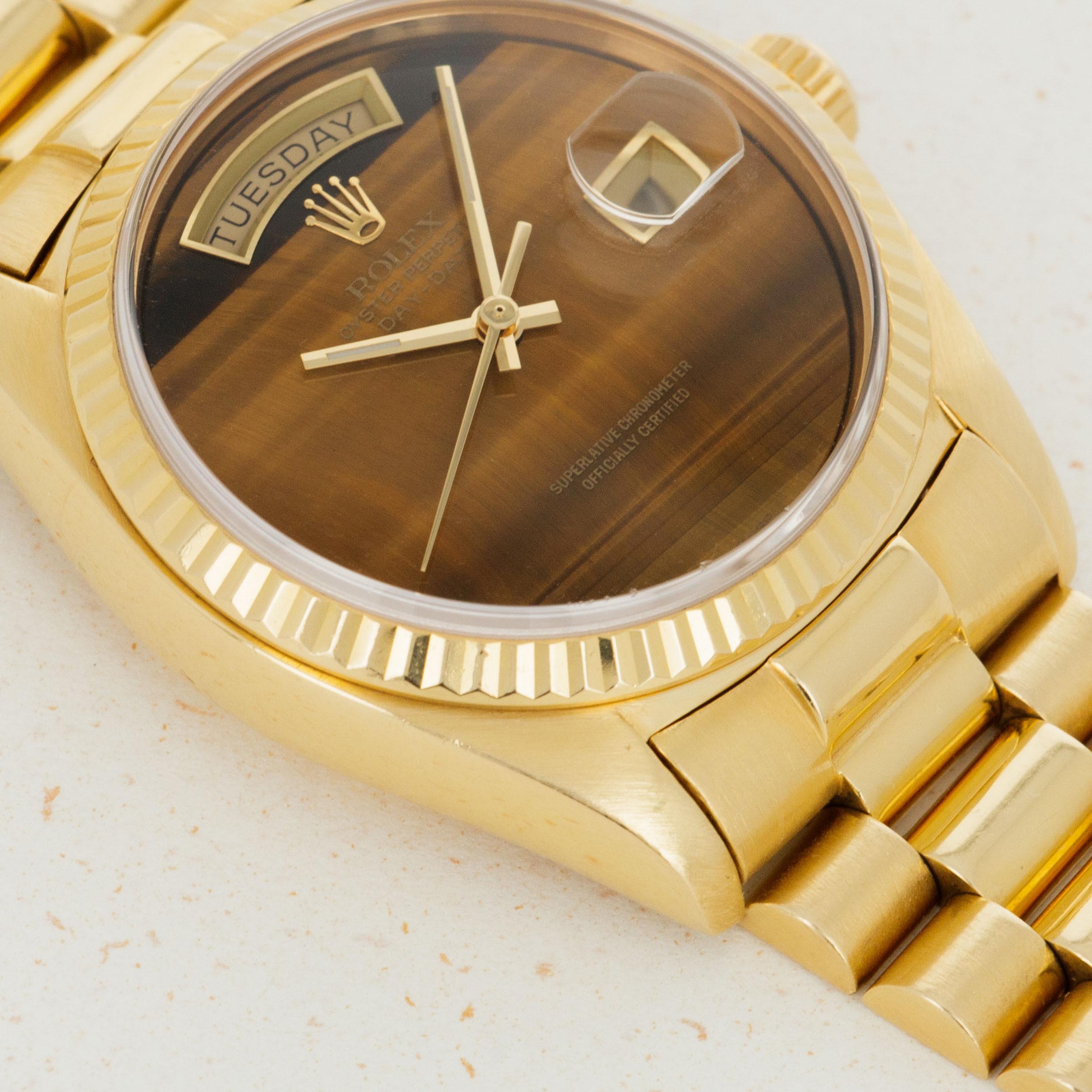 A legendary timepiece with an unrivaled history, the Rolex Day-Date has earned its place as "The Ultimate Watch of Prestige" from its decades on the wrists of the world's most influential people. Released in 1956, the Day-Date quickly became synonymous with luxury, prestige, and exclusivity thanks to being the watch of choice for the world's athletes, visionaries, and world leaders alike. Only ever constructed of precious metals, the Day-Date's aesthetic is that of sheer elegance and grace. With its timeless style and inescapable impact on horology, the Day-Date stands as a vivid reminder of just how successful Rolex has been in realizing that very mission. This particular example features a spectacular stone 'Tiger's Eye' dial and is in spectacular condition. In the pantheon of Day-Date dial types, the Tiger's Eye dial stands as the king of stone dials. A semi-precious gemstone from the quartz family, Tiger Eye is famed for its array of golden hues and colors, and banded appearance thanks to its formation process. Like all stone dials, they can be fragile, and so, this example, in its spectacular condition, is a rare and wonderful beast. Like all gemstones, Tiger's Eye varies from piece to piece due to its subtle natural variations, and this piece, with its large central band of goldish brown, is wonderfully stunning and lends to the ref. 18038's already monochromatic golden construction.