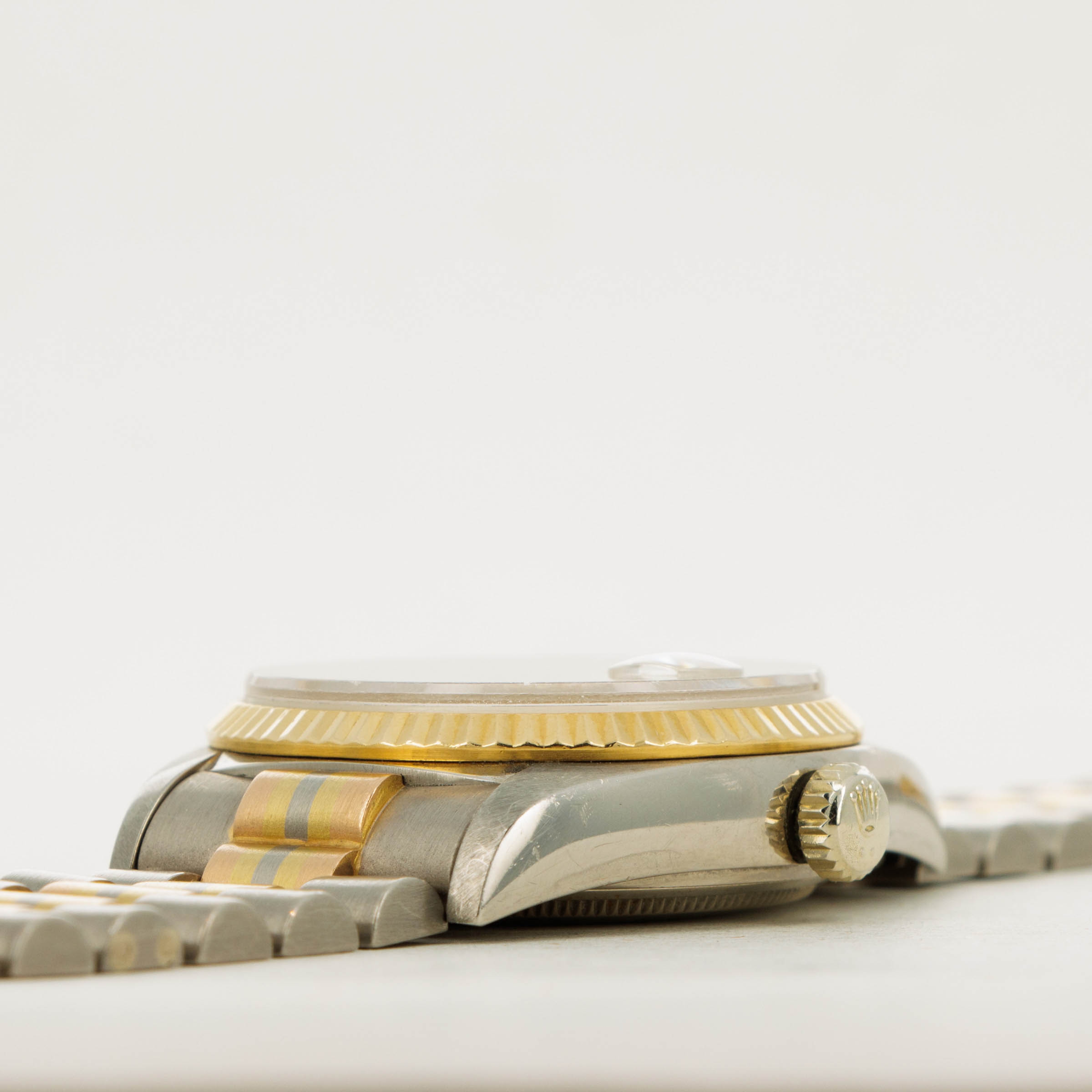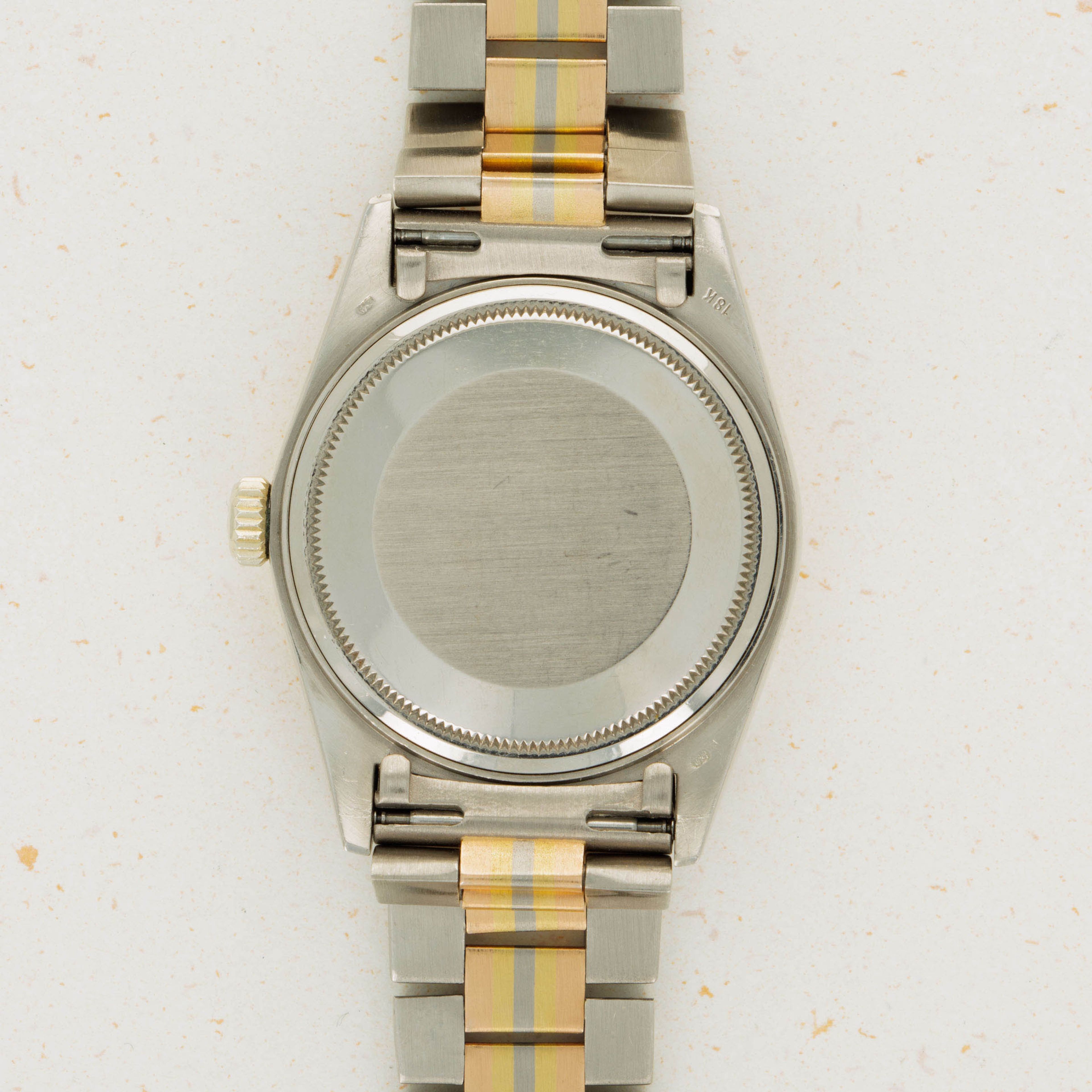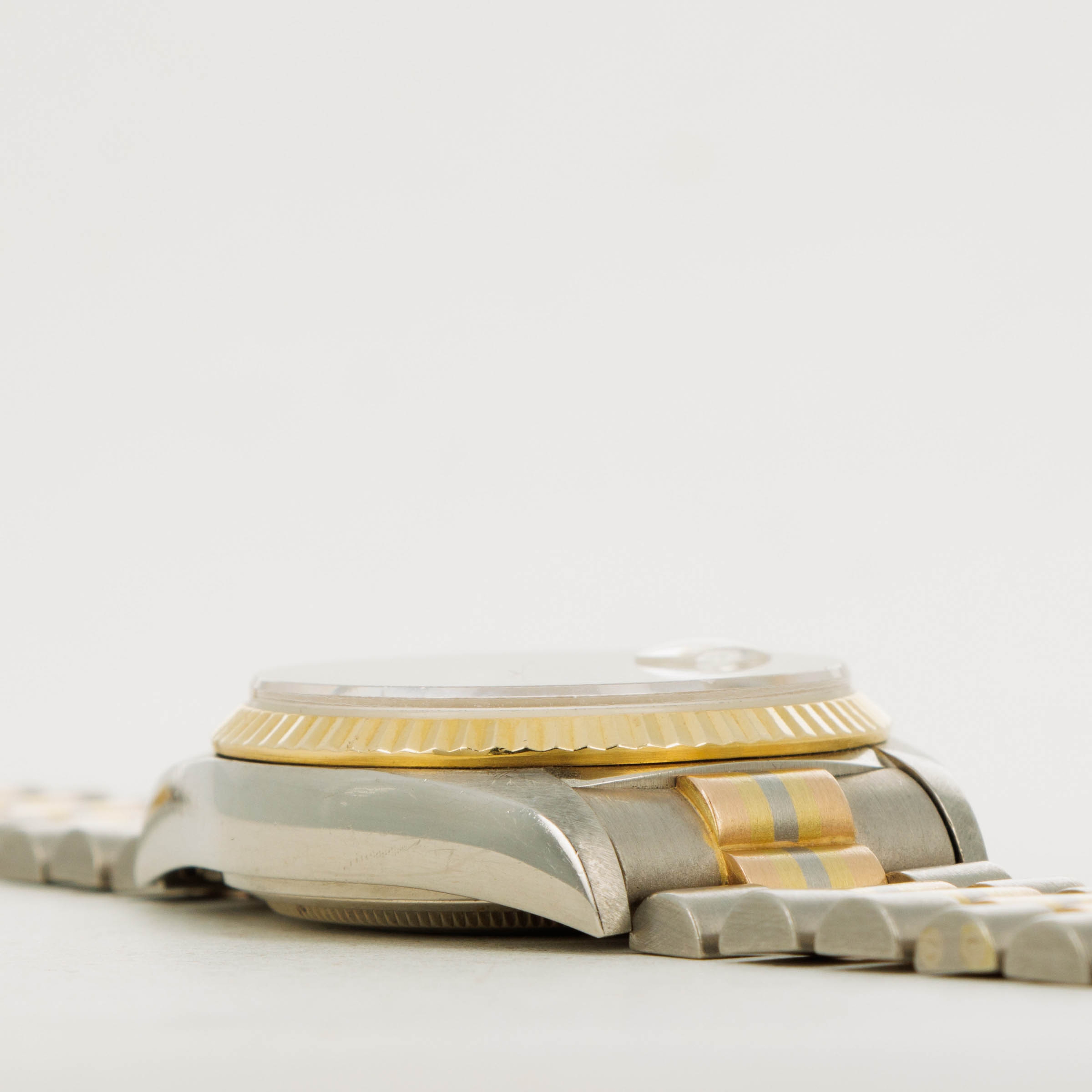 Released in the 1980s, the Rolex Day-Date Tridor is perhaps one of the most unique Day-Date variants to come out of the Genevan Giant’s hallowed halls. Remaining in production until the early 2000s, the Tridor was heavily influenced by 1980’s design as tri-gold jewelry like rings, necklaces, and bracelets made their way into the mainstream. Constructed from white gold and featuring a yellow gold bezel, the Tridor’s most striking element is the center link found on its bracelet. With two white gold peripheral links, the center links are made of rose, yellow and white gold, all meticulously fused together so that the line between each gold stripe is perfectly level and uniform. A relic of Rolex’s more diverse days of design, the Tridor is a wonderfully unique watch that takes the iconic Day-Date design and alters its aesthetic in a playful and carefully constructed way. Offered here, our example compounds upon its luxurious tri-gold construction with a diamond-set bezel and dial that elevate the Day-Date's stunning design to the next level, just as its multi-colored bracelet does over the collection’s usual mono-tone President bracelet.