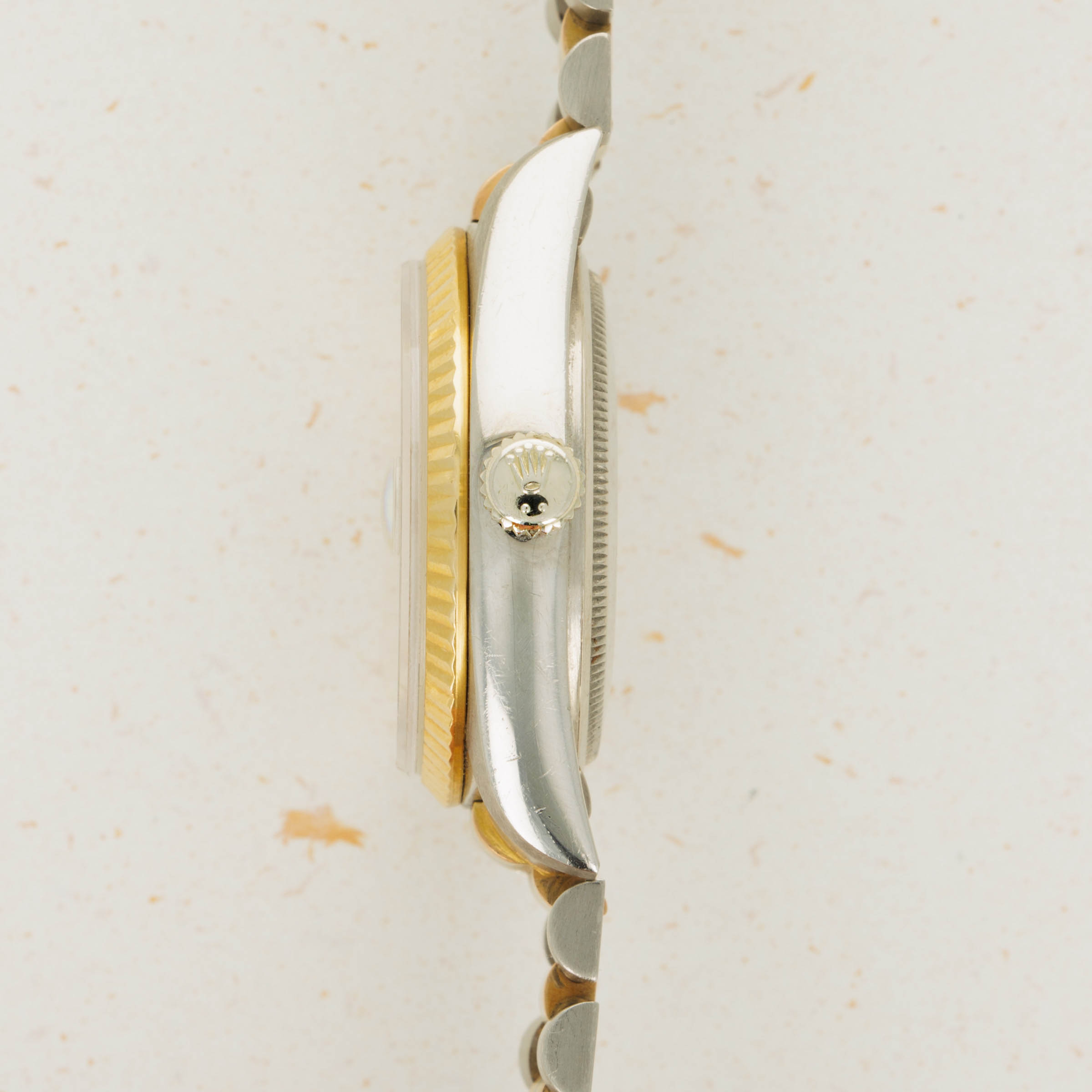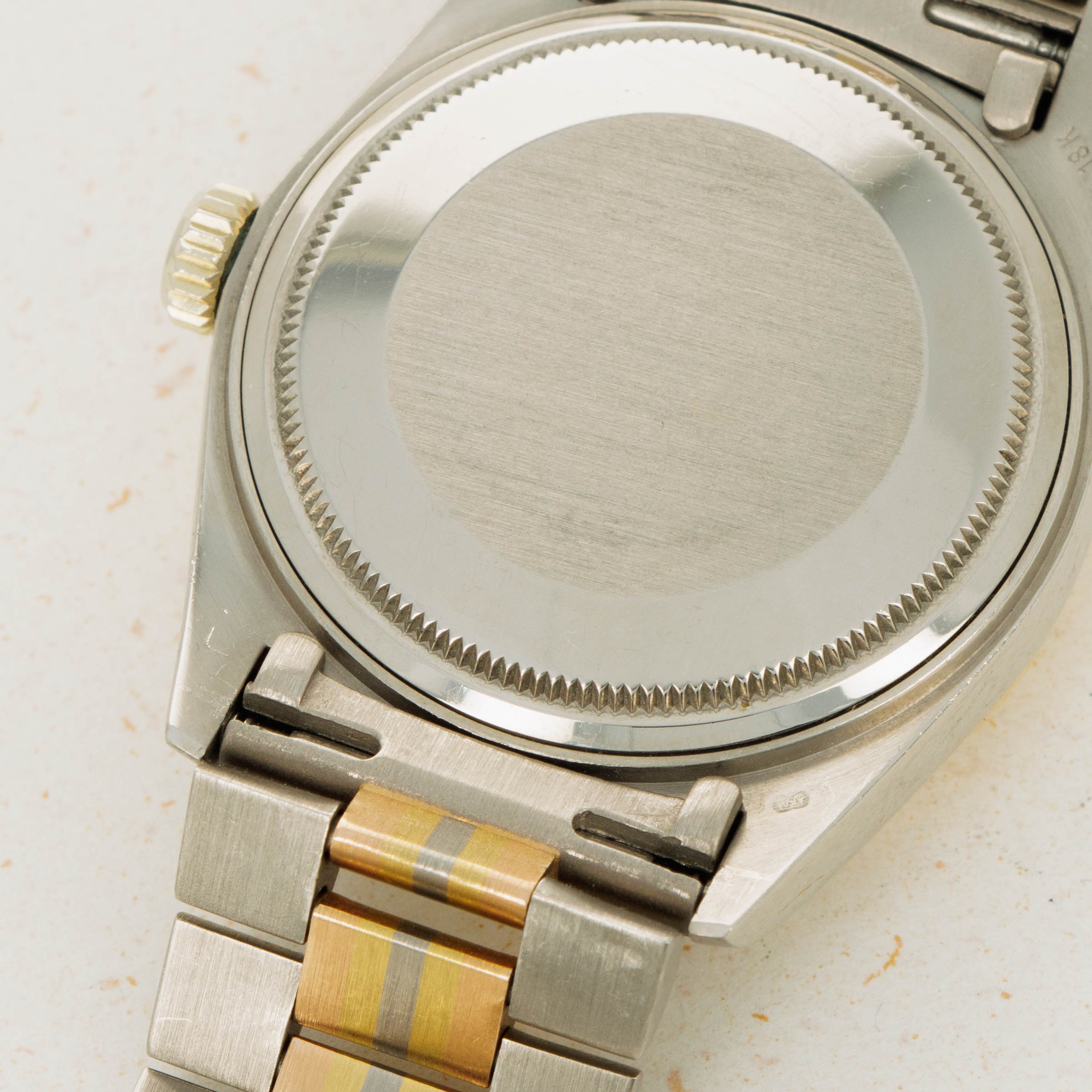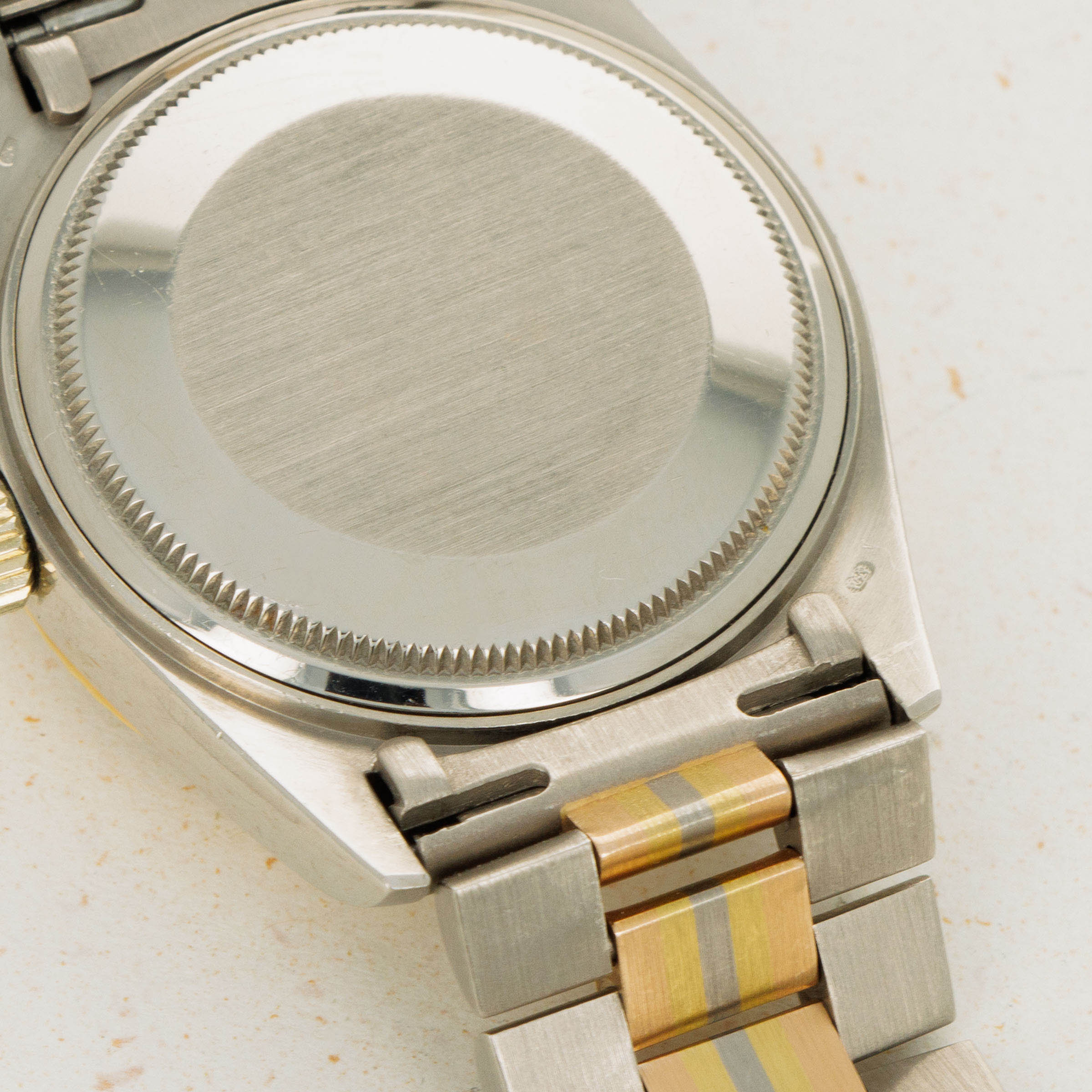 Released in the 1980s, the Rolex Day-Date Tridor is perhaps one of the most unique Day-Date variants to come out of the Genevan Giant’s hallowed halls. Remaining in production until the early 2000s, the Tridor was heavily influenced by 1980’s design as tri-gold jewelry like rings, necklaces, and bracelets made their way into the mainstream. Constructed from white gold and featuring a yellow gold bezel, the Tridor’s most striking element is the center link found on its bracelet. With two white gold peripheral links, the center links are made of rose, yellow and white gold, all meticulously fused together so that the line between each gold stripe is perfectly level and uniform. A relic of Rolex’s more diverse days of design, the Tridor is a wonderfully unique watch that takes the iconic Day-Date design and alters its aesthetic in a playful and carefully constructed way. Offered here, our example compounds upon its luxurious tri-gold construction with a diamond-set bezel and dial that elevate the Day-Date's stunning design to the next level, just as its multi-colored bracelet does over the collection’s usual mono-tone President bracelet.