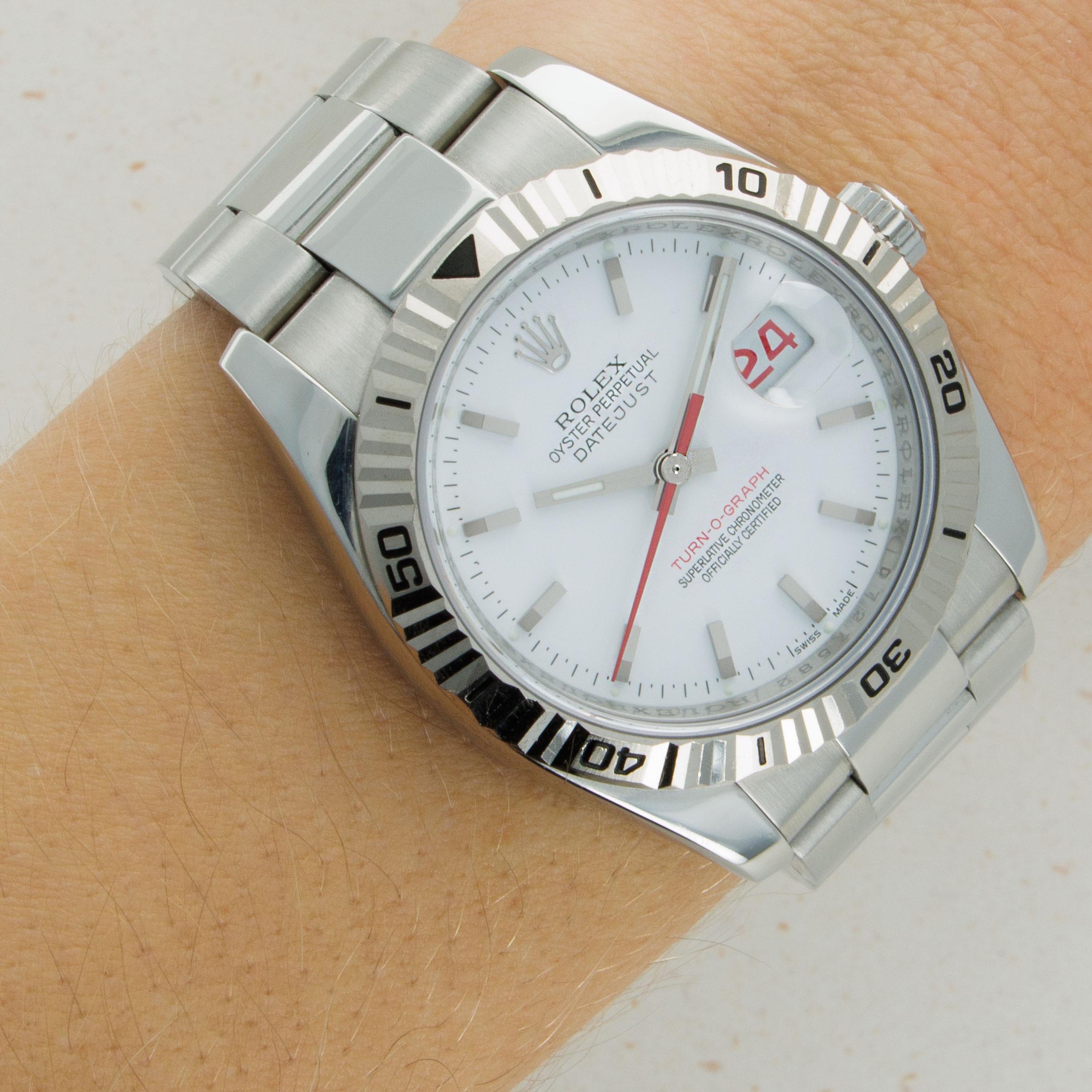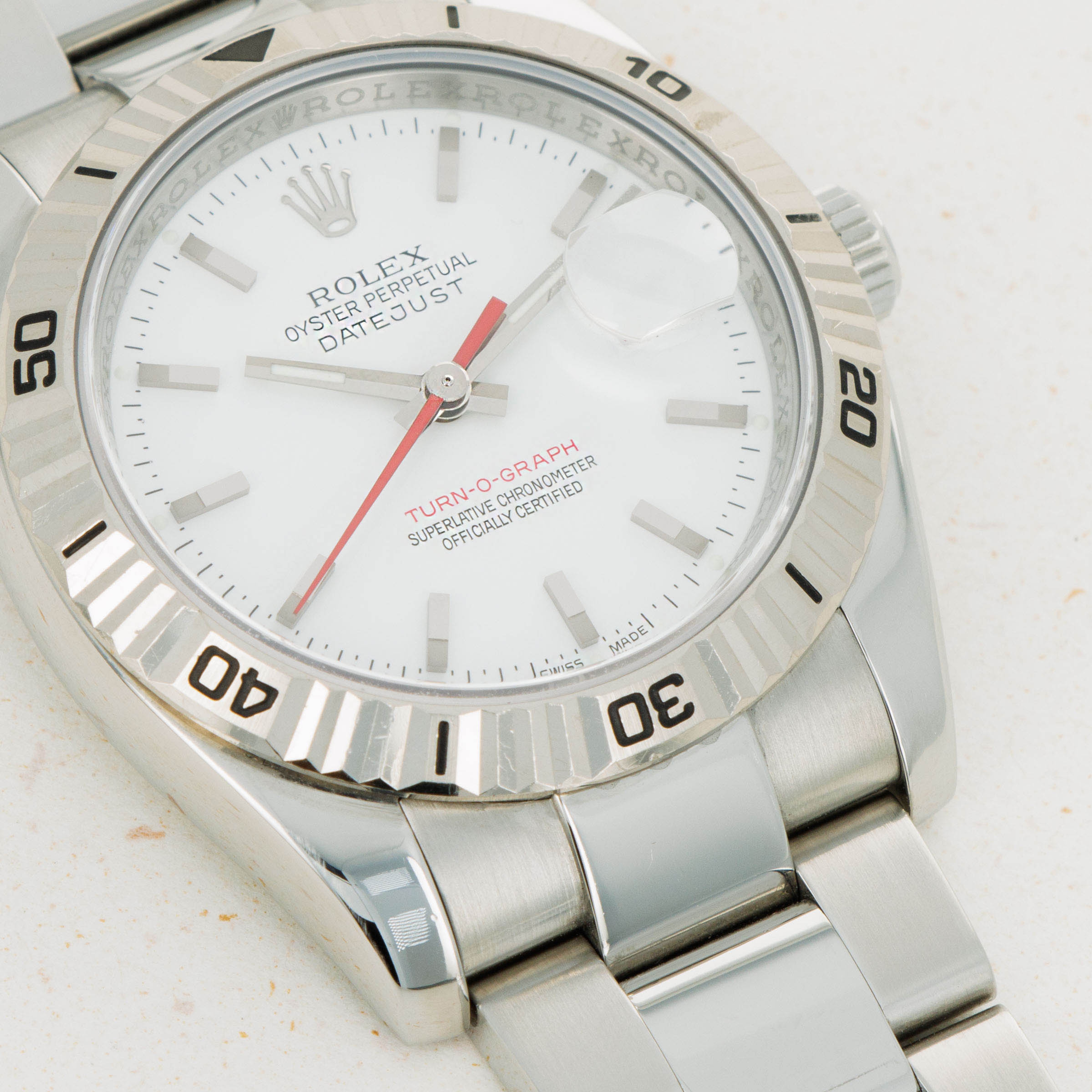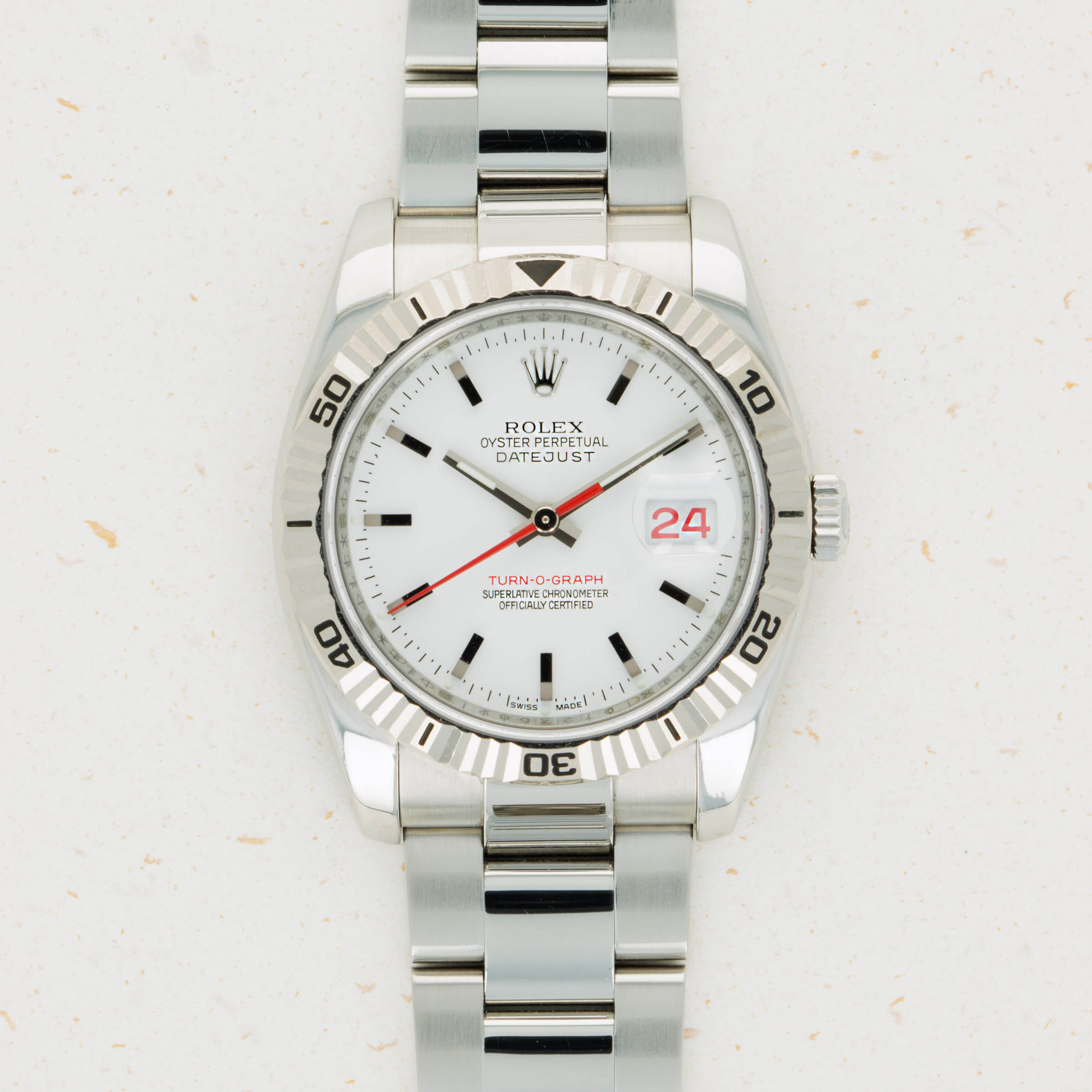 Featuring the Datejust's modern 36mm construction with its solid end links and center links and its modern clasp, the Turn-O-Graph ref. 116264 merges the appeal of a contemporary Rolex with the appeal of its long-lost vintage name.