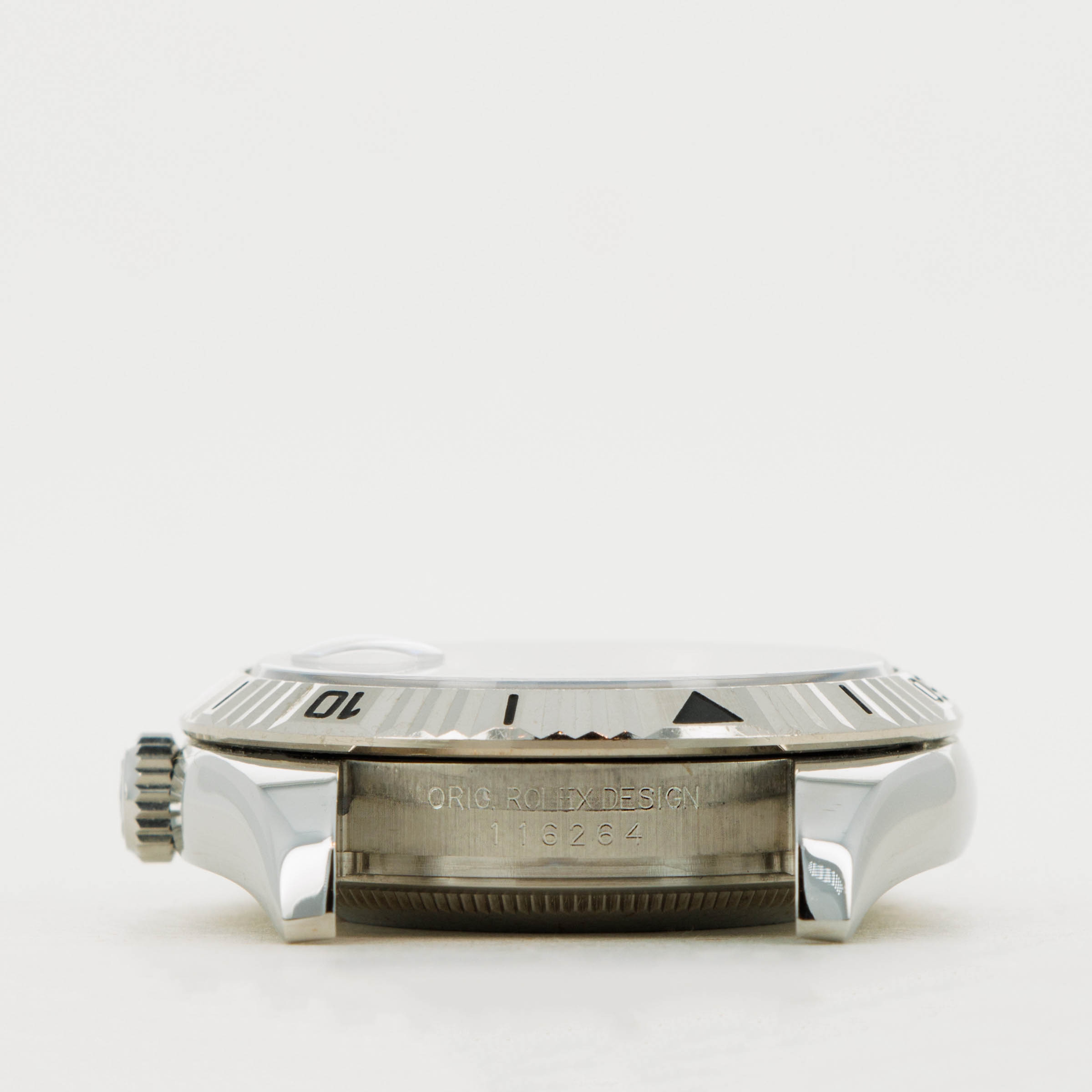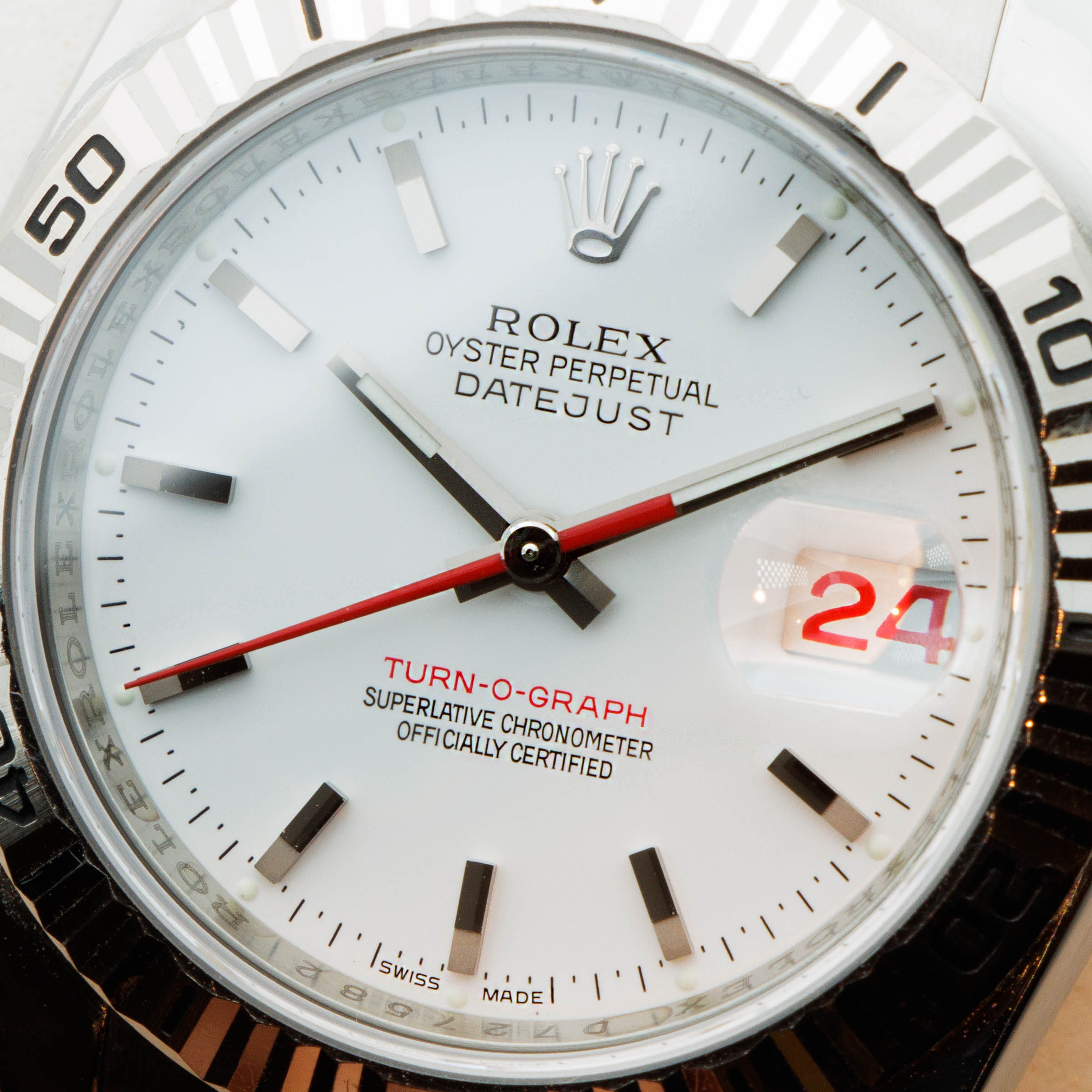 In 2004, to celebrate the Turn-O-Graph’s 50th anniversary (one year late in typical Rolex fashion), Rolex re-introduced the Turn-O-Graph and its offical name to their catalog by one again adding it to the Datejust collection. As a result, this now-modified Datejust featured an 18kt gold version of the Turn-O-Graph’s signature rotating bezel with its 60-minute inscriptions, a red seconds hand, red Arabic numerals in its date wheel, and matching red “TURN-O-GRAPH” lettering on its dial. Discontinued for the second time in 2011, the three Datejust Turn-O-Graph references, the 116261, 116263 and 116264, (which is what we have here) marry the world of vintage Rolex together with their modern efforts to create some of the best tool watches on the market, and the Turn-O-Graph, as their first serially produced tool watch, served as the perfect vessel for them to do exactly that with its luxurious Datejust construction and tastefully altered Turn-O-Graph design.