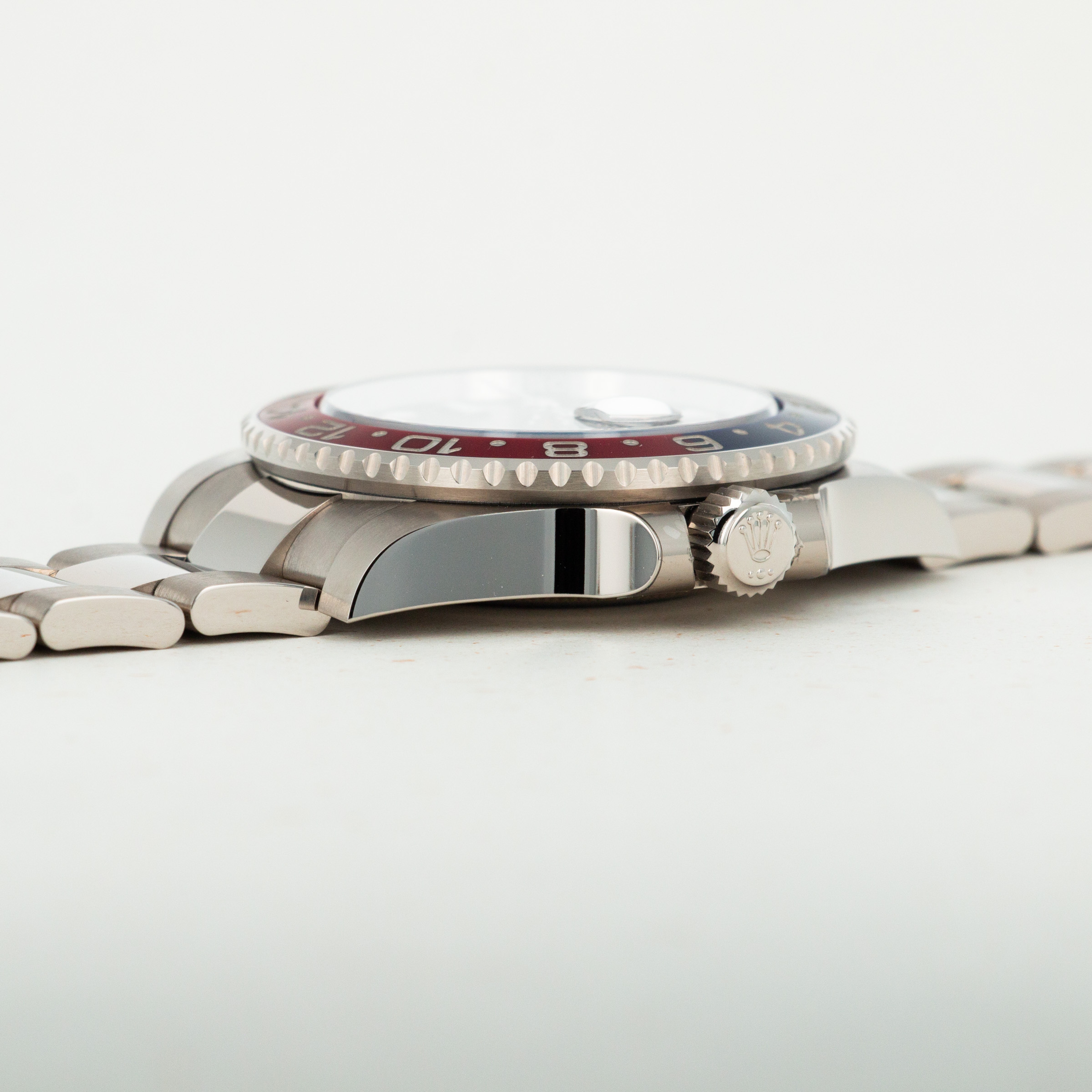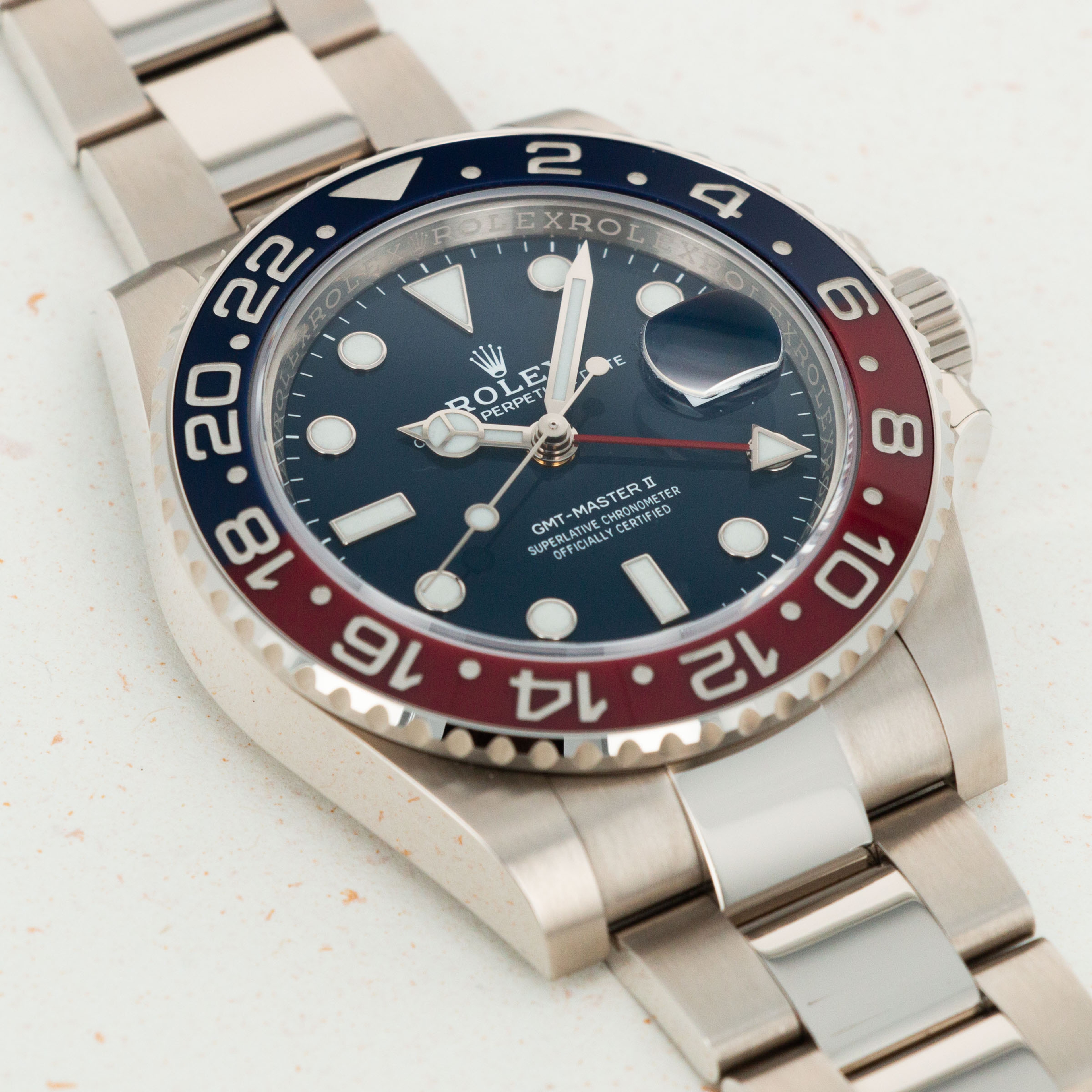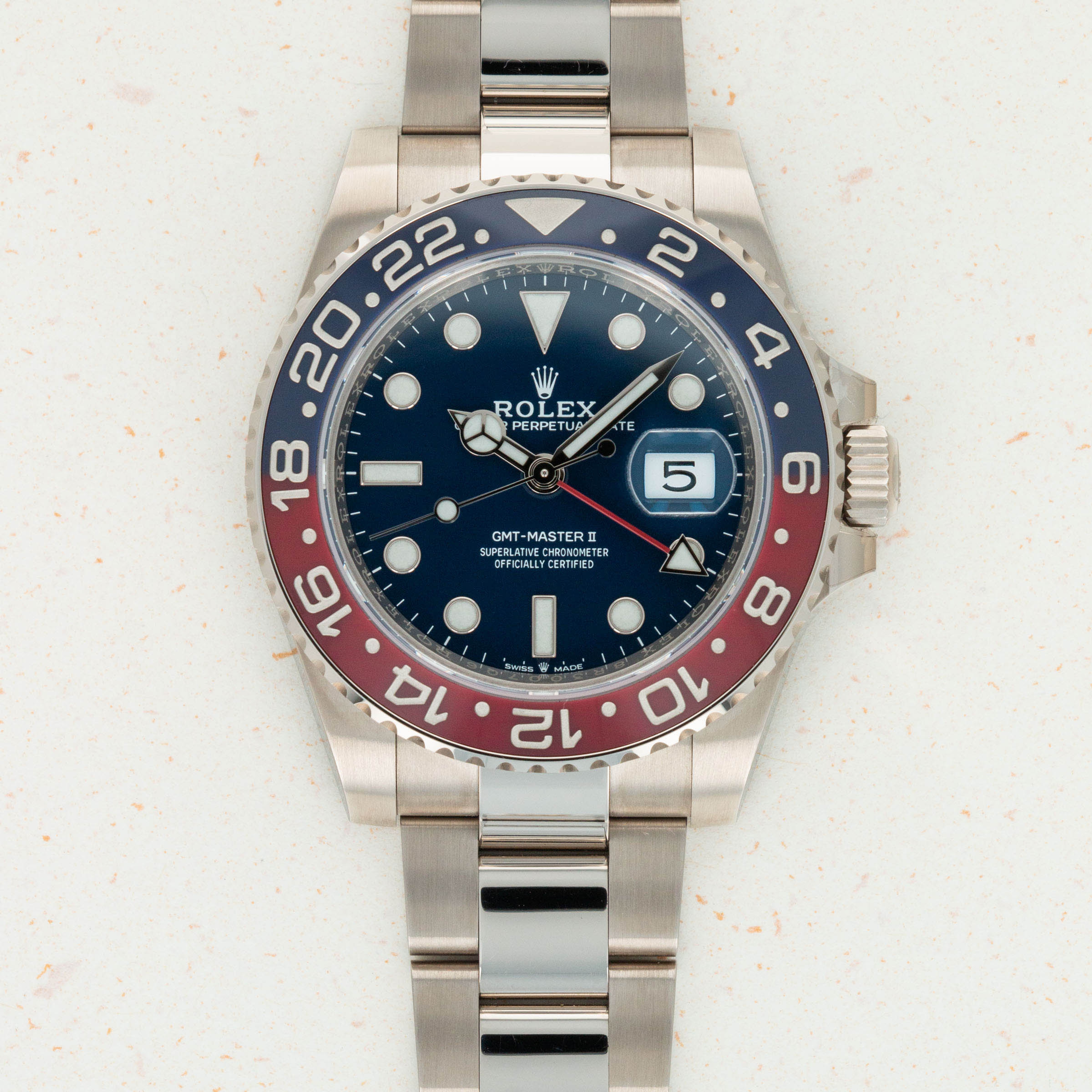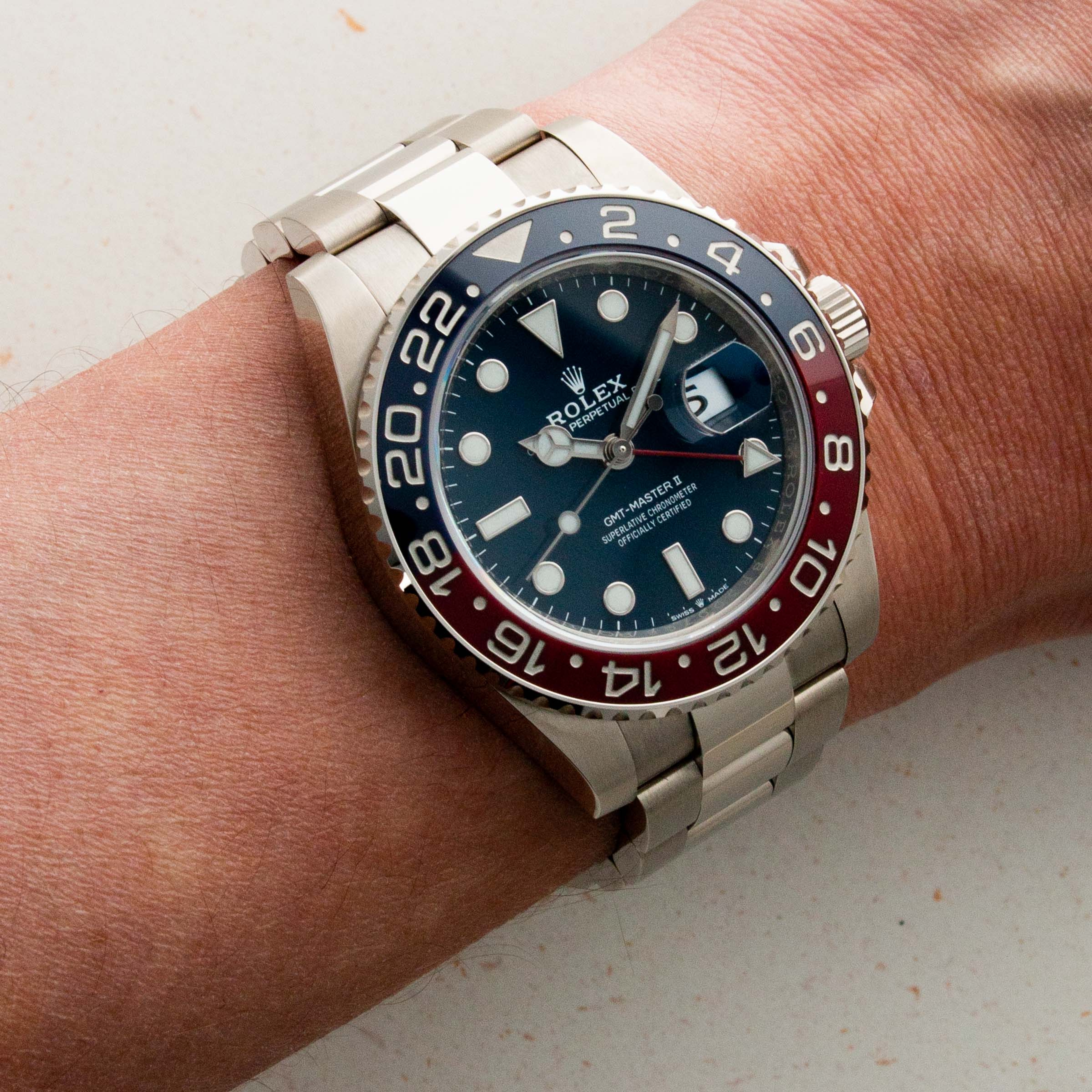 A view of the deep blue dial which is found exclusively on the latest white gold GMT-Master II.